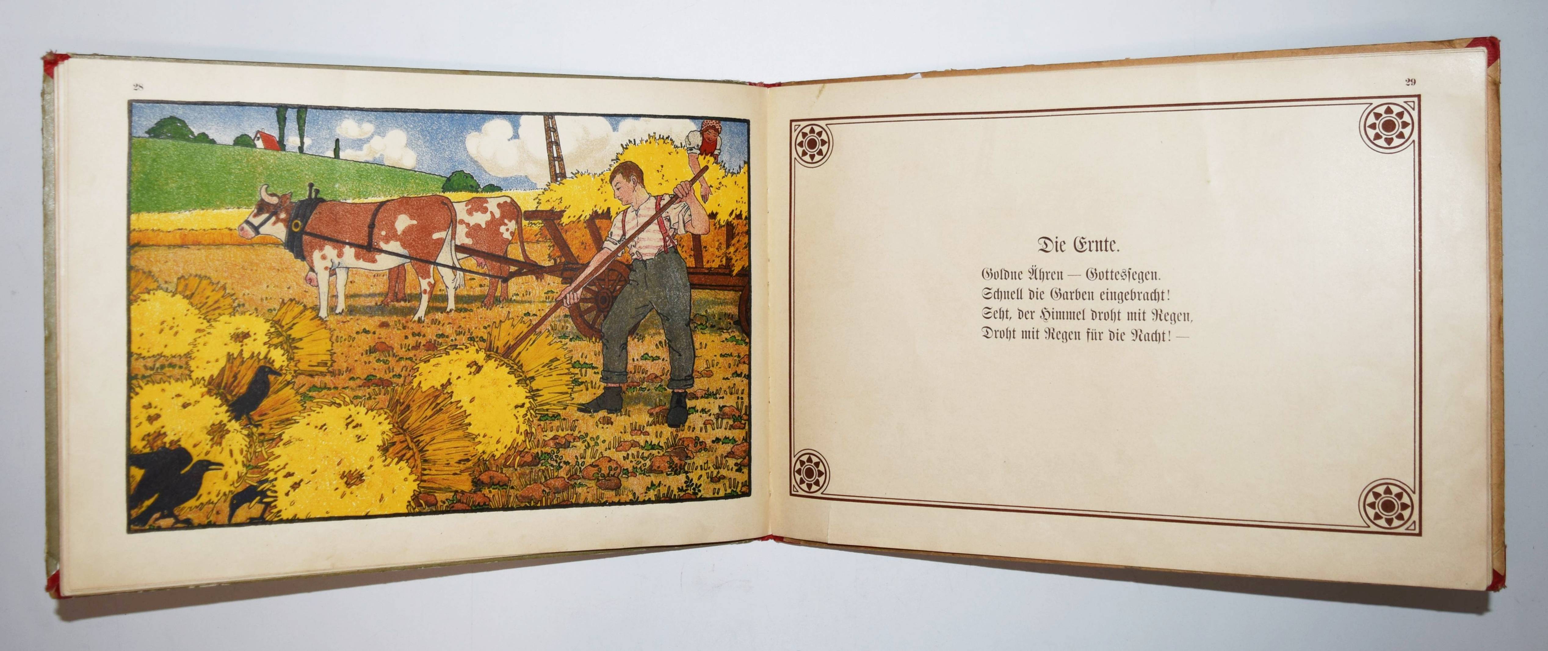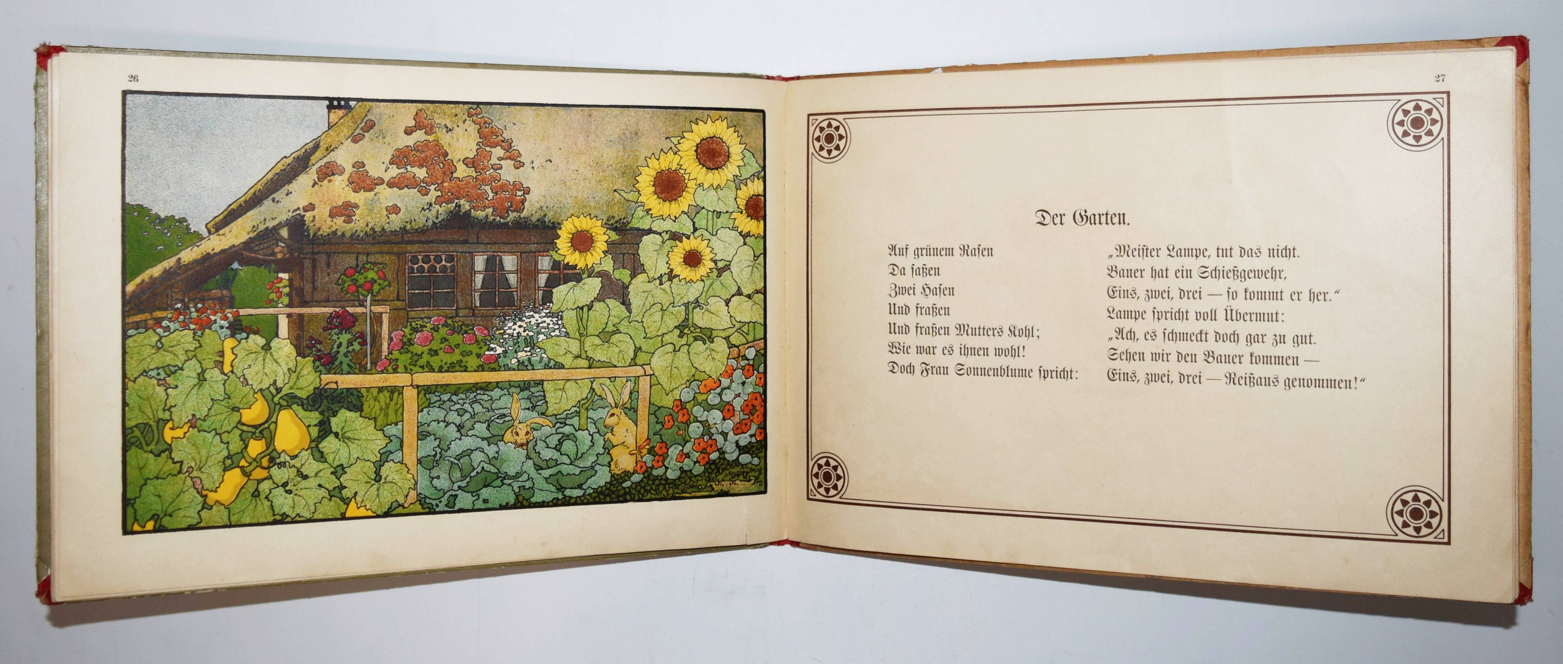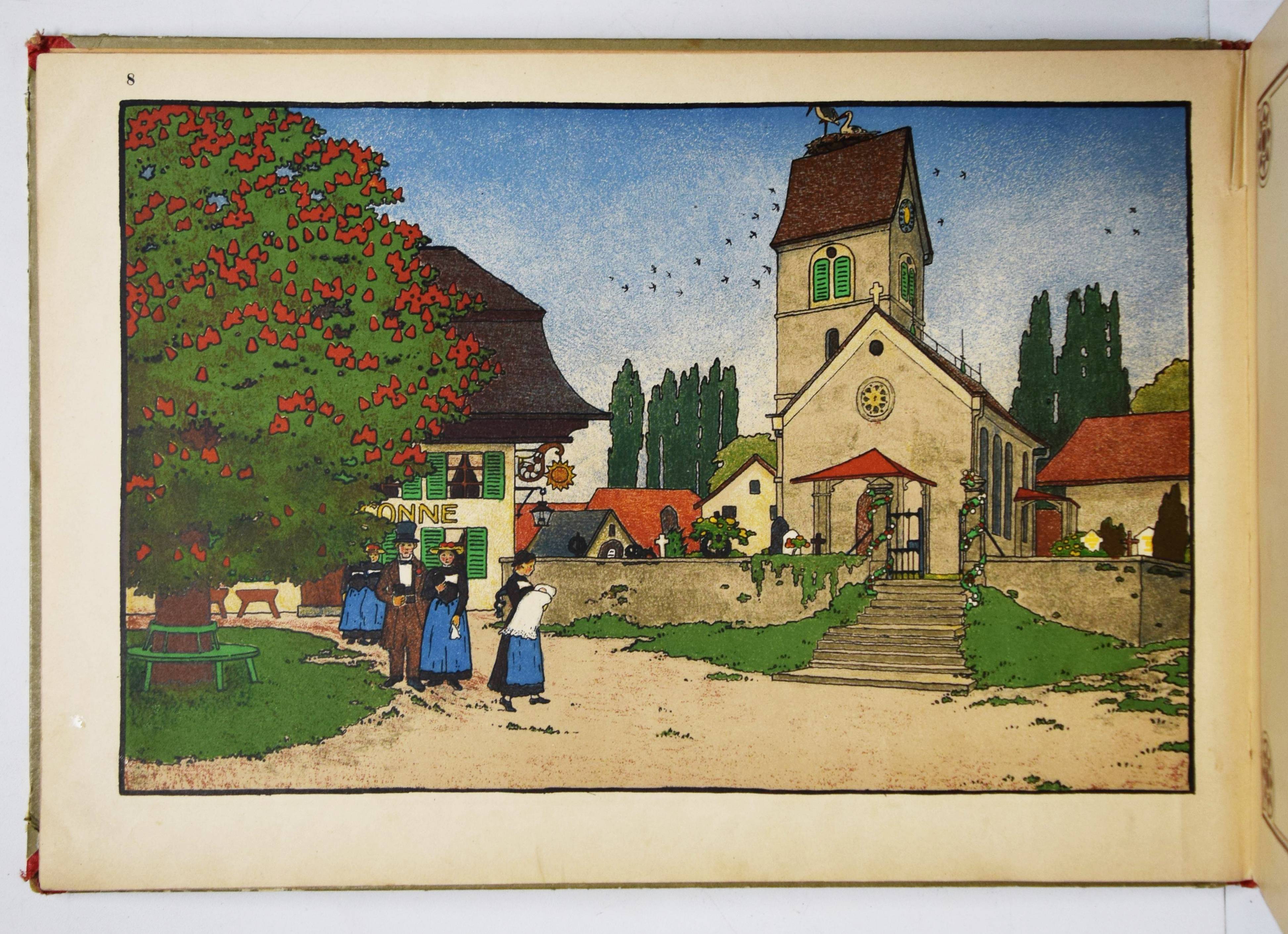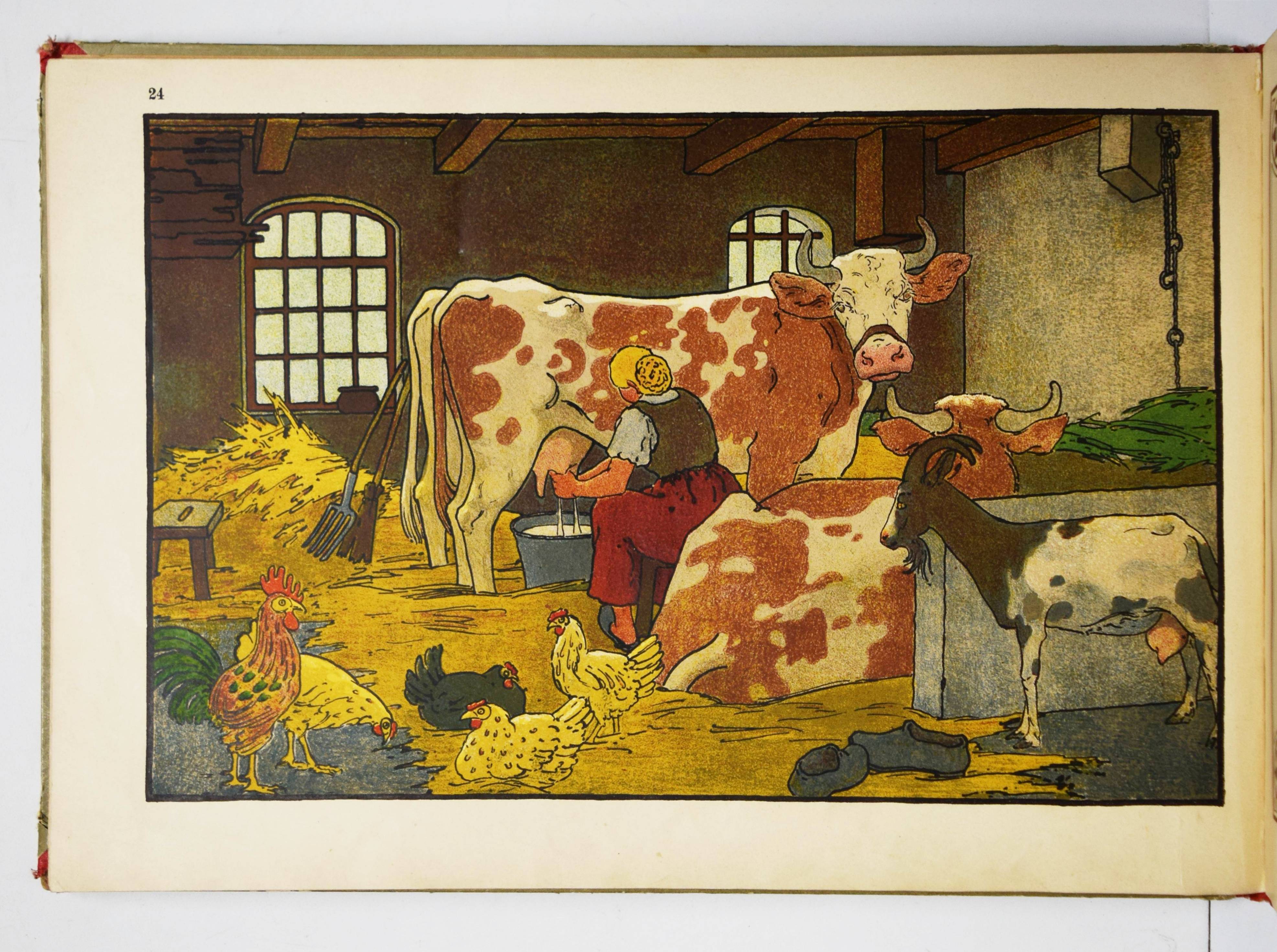 Rau, Olaf. Das Dorf in Bild und Wort. Nürnberg, Theo. Stroefer o. J. (1906). Quer-4° (24,5 x 36 cm.). 36 S. mit farbig illustr. Titel, 12 farblithogr. Tafeln und Vignetten von Marie Stiefel. Farbig illustr. Orig.-Halbleinenband. (Verlags-Nr. 1352). Bilderwelt 502. Ries 906, 1. SBI 199 und S. 75 (mit Abb. u. Farbabb. auf Tafel 11). Stuck-Villa I, 501 und II, 325 (mit Farbabb. S. 148). Nicht bei Rammensee. – Erste Ausgabe dieses seltenen Jugendstilbilderbuchs. – „Sachschilderung, jahreszeitliche Stimmung und Lokalkolorit gehen in diesem Buch der Schweizer Illustratorin Marie Stiefel (1879-1962) eine geglückte Verbindung ein. Es handelt sich wohl um das schönste Beispiel Schweizer Heimatkunst im Bilderbuch, das merkwürdigerweise in einem deutschen Verlag (zugleich auch in einer Ausgabe ohne Text auf Pappe) erschienen ist“ (H. Ries in Bilderwelt). – Die Züricher Künstlerin studierte nach einer Ausbildung an der Kunstgewerbeschule Zürich (1896-1900) und im Atelier E. Grasset in Paris (1900-1903) in München und Florenz. „In ihrem Bilderbuch „Das Dorf“ wechseln stimmungsvolle Landschaftsbilder mit informativen, sachbuchartigen Ansichten von verschiedenen Bereichen eines Bauernhofes. Die sorgfältige Ausstattung, vom schön gestalteten Vorsatzblatt über den Titel und die mit Ornamenten und Vignetten geschmückten Zwischenseiten bis hin zu den eindrucksvollen Farbtafeln, machen das Buch zu einem besonders schönen Beispiel des Künstlerbilderbuchs“ (V. Rutschmann). – Deckel leicht angestaubt, Kanten etwas berieben, gutes Exemplar.