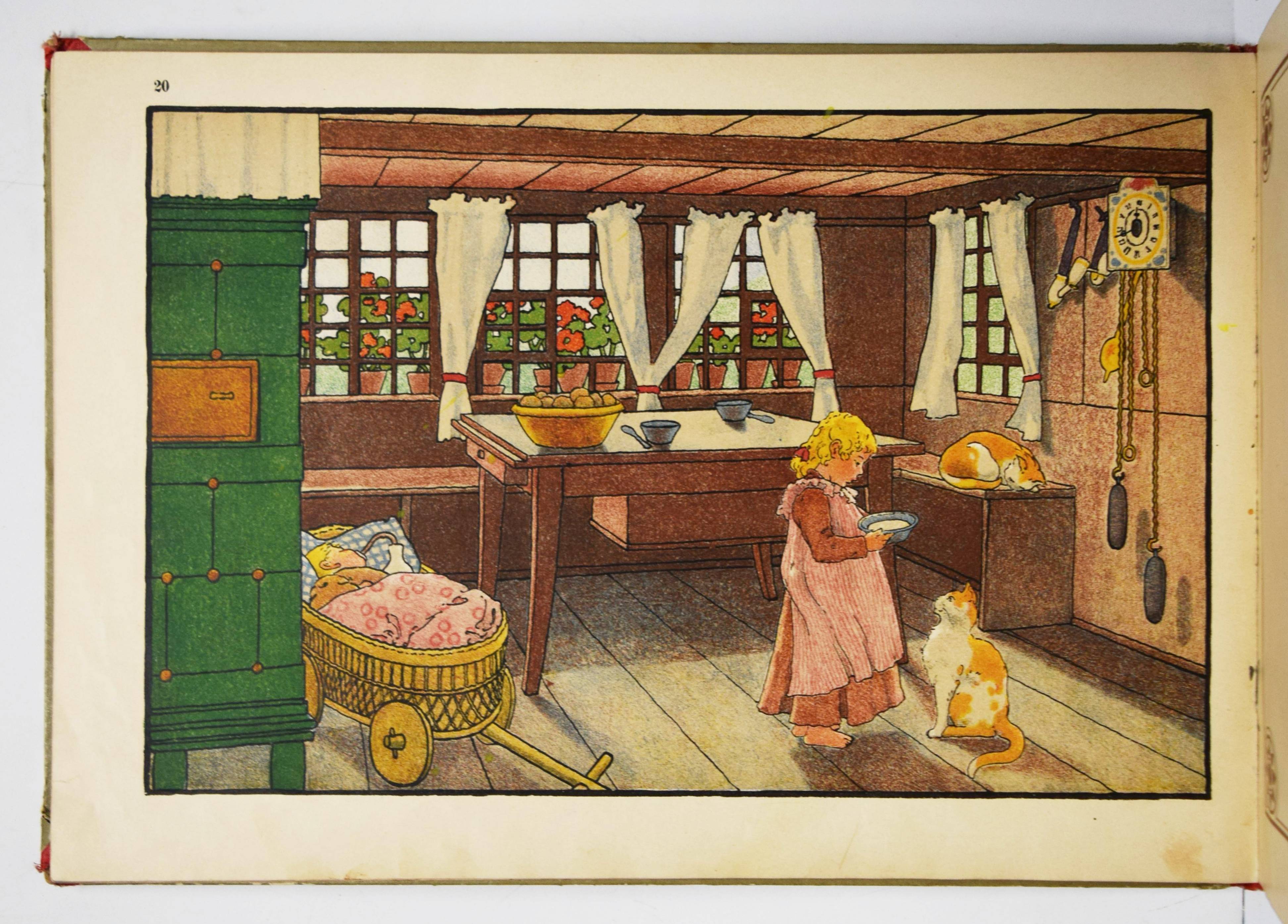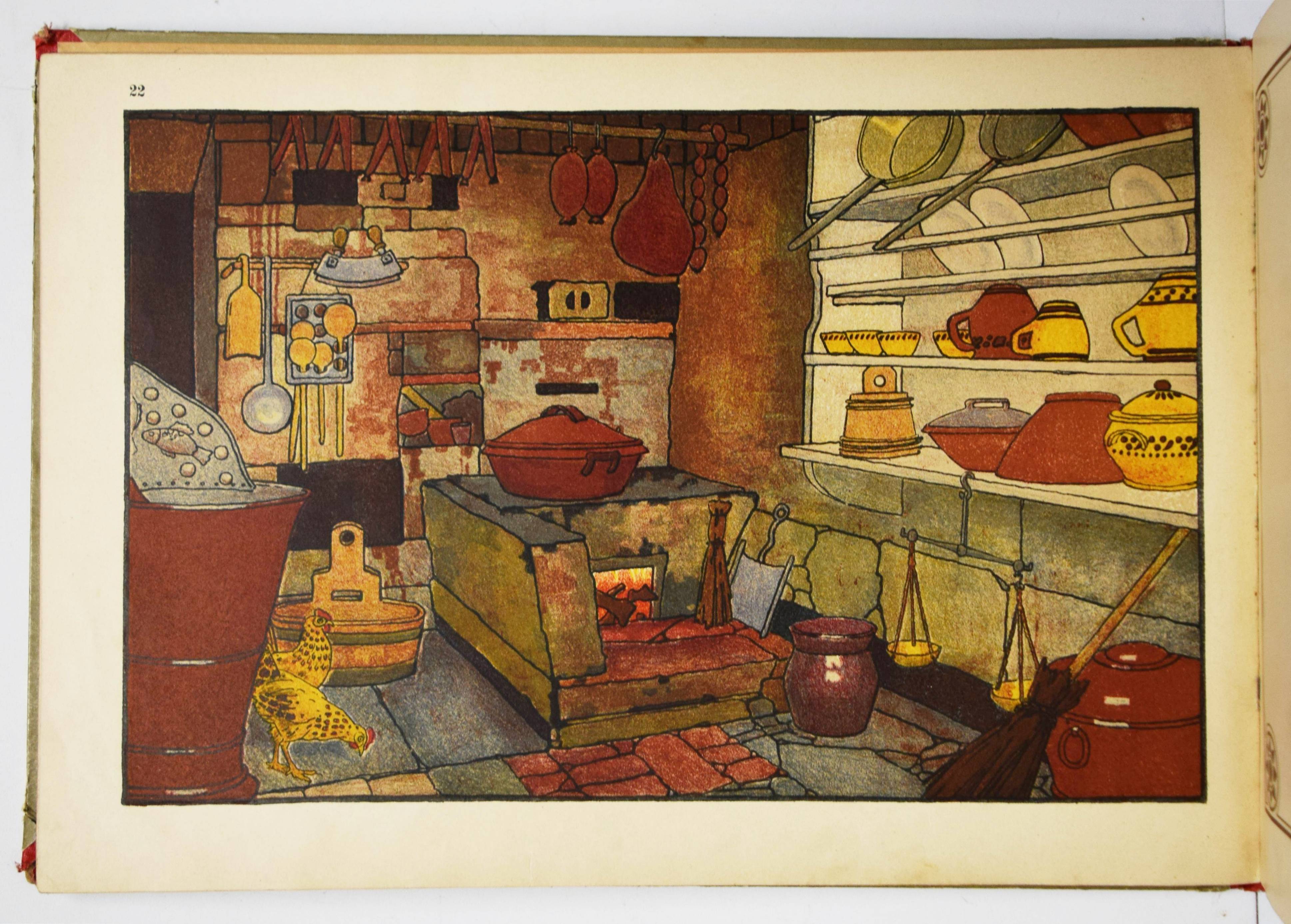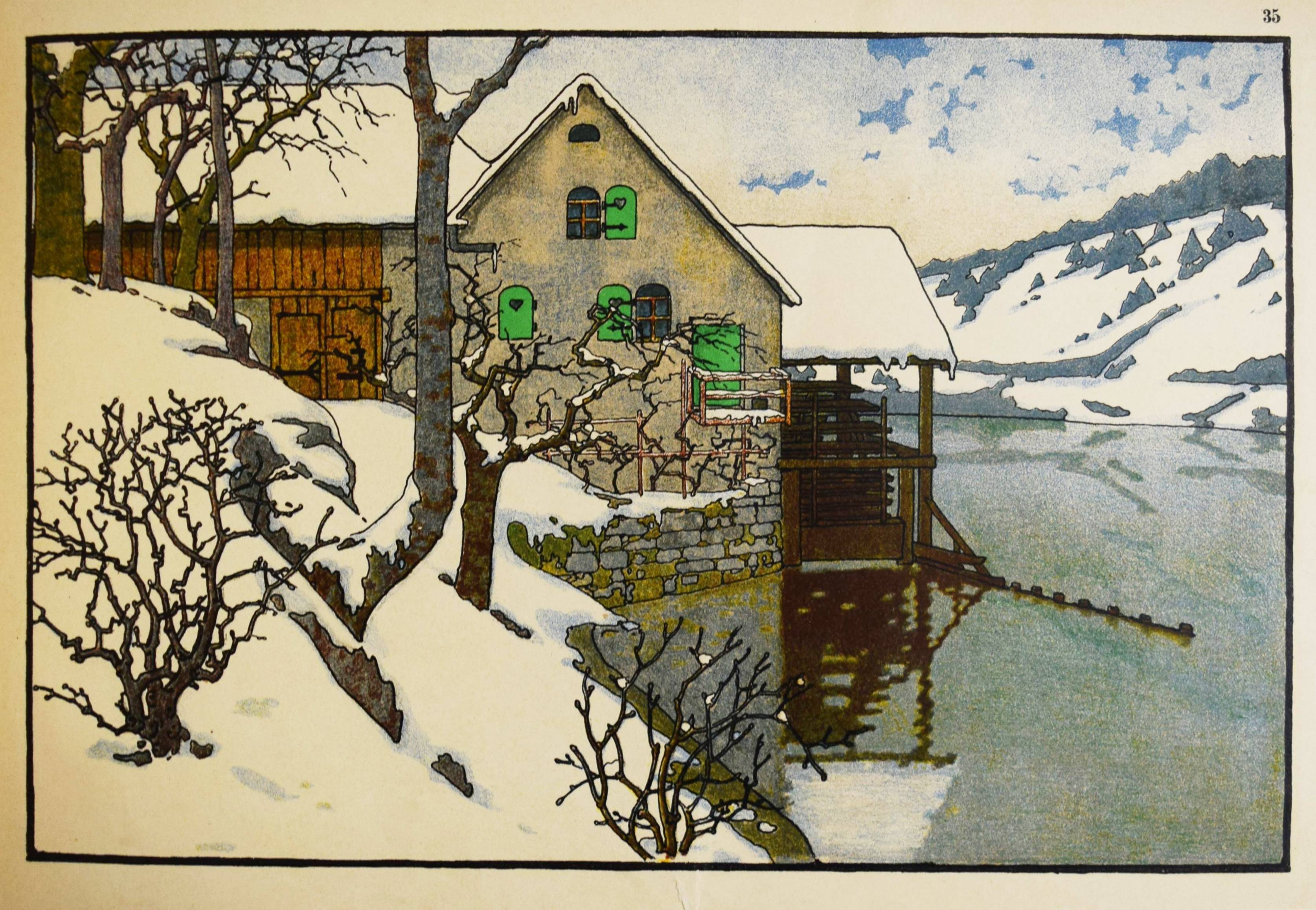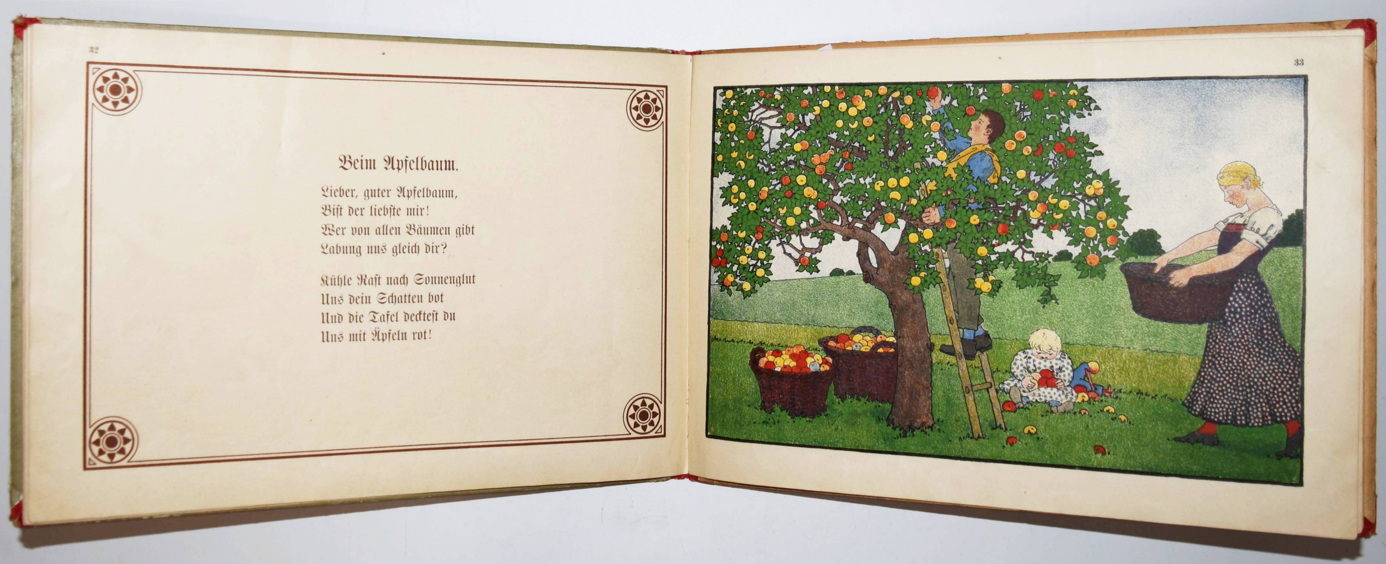 Rau, Olaf. Das Dorf in Bild und Wort. Nürnberg, Theo. Stroefer o. J. (1906). Quer-4° (24,5 x 36 cm.). 36 S. mit farbig illustr. Titel, 12 farblithogr. Tafeln und Vignetten von Marie Stiefel. Farbig illustr. Orig.-Halbleinenband. (Verlags-Nr. 1352). Bilderwelt 502. Ries 906, 1. SBI 199 und S. 75 (mit Abb. u. Farbabb. auf Tafel 11). Stuck-Villa I, 501 und II, 325 (mit Farbabb. S. 148). Nicht bei Rammensee. – Erste Ausgabe dieses seltenen Jugendstilbilderbuchs. – „Sachschilderung, jahreszeitliche Stimmung und Lokalkolorit gehen in diesem Buch der Schweizer Illustratorin Marie Stiefel (1879-1962) eine geglückte Verbindung ein. Es handelt sich wohl um das schönste Beispiel Schweizer Heimatkunst im Bilderbuch, das merkwürdigerweise in einem deutschen Verlag (zugleich auch in einer Ausgabe ohne Text auf Pappe) erschienen ist“ (H. Ries in Bilderwelt). – Die Züricher Künstlerin studierte nach einer Ausbildung an der Kunstgewerbeschule Zürich (1896-1900) und im Atelier E. Grasset in Paris (1900-1903) in München und Florenz. „In ihrem Bilderbuch „Das Dorf“ wechseln stimmungsvolle Landschaftsbilder mit informativen, sachbuchartigen Ansichten von verschiedenen Bereichen eines Bauernhofes. Die sorgfältige Ausstattung, vom schön gestalteten Vorsatzblatt über den Titel und die mit Ornamenten und Vignetten geschmückten Zwischenseiten bis hin zu den eindrucksvollen Farbtafeln, machen das Buch zu einem besonders schönen Beispiel des Künstlerbilderbuchs“ (V. Rutschmann). – Deckel leicht angestaubt, Kanten etwas berieben, gutes Exemplar.