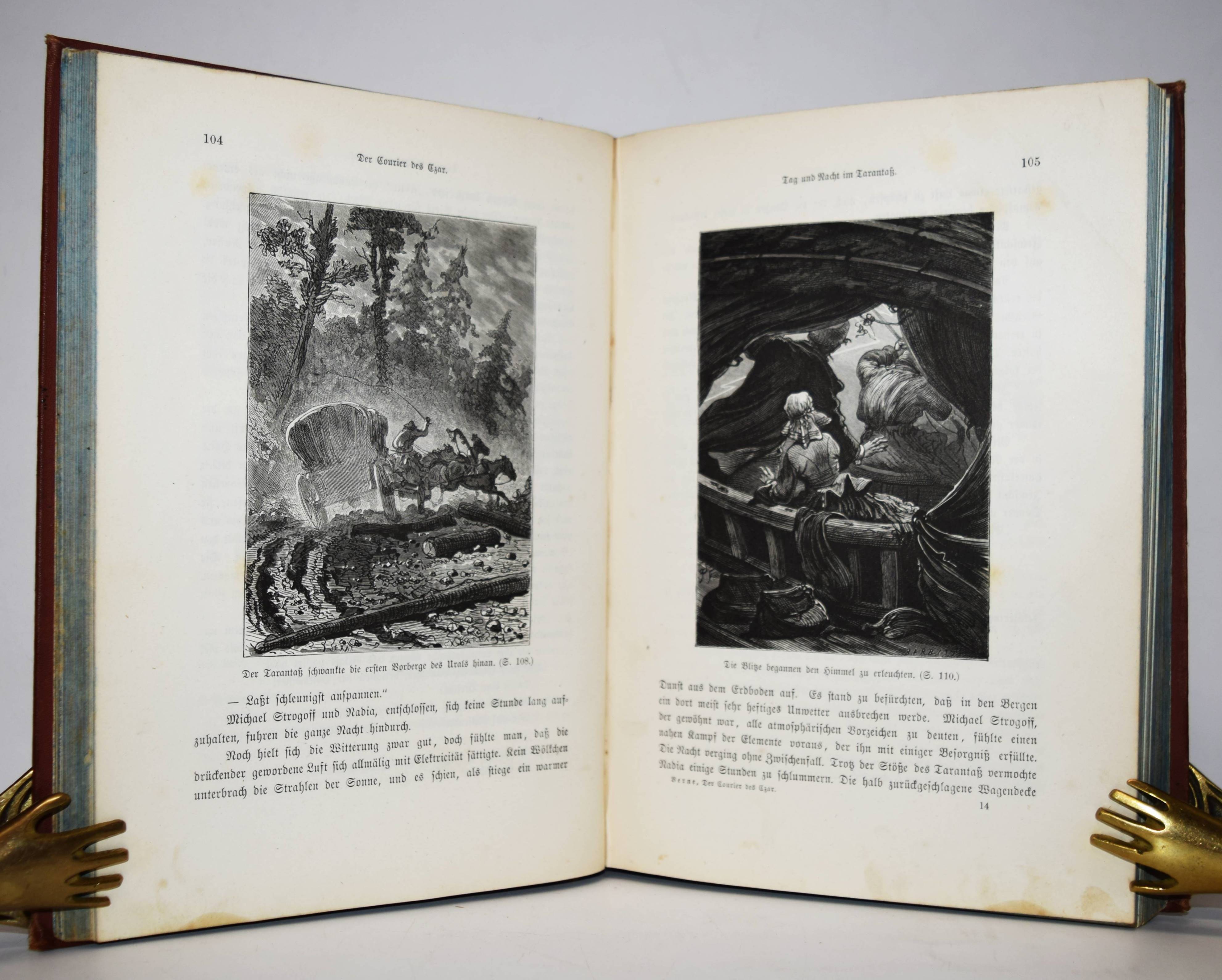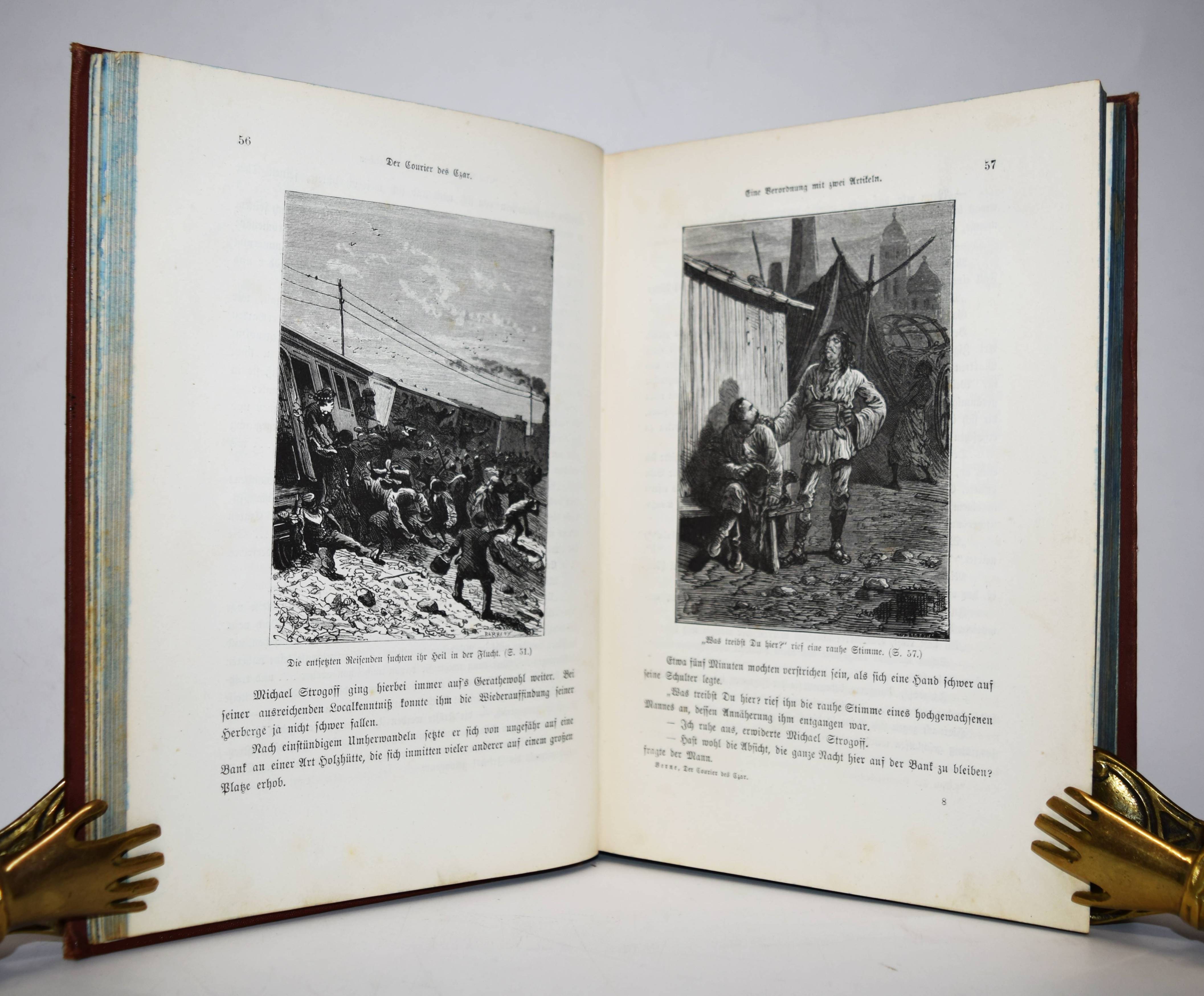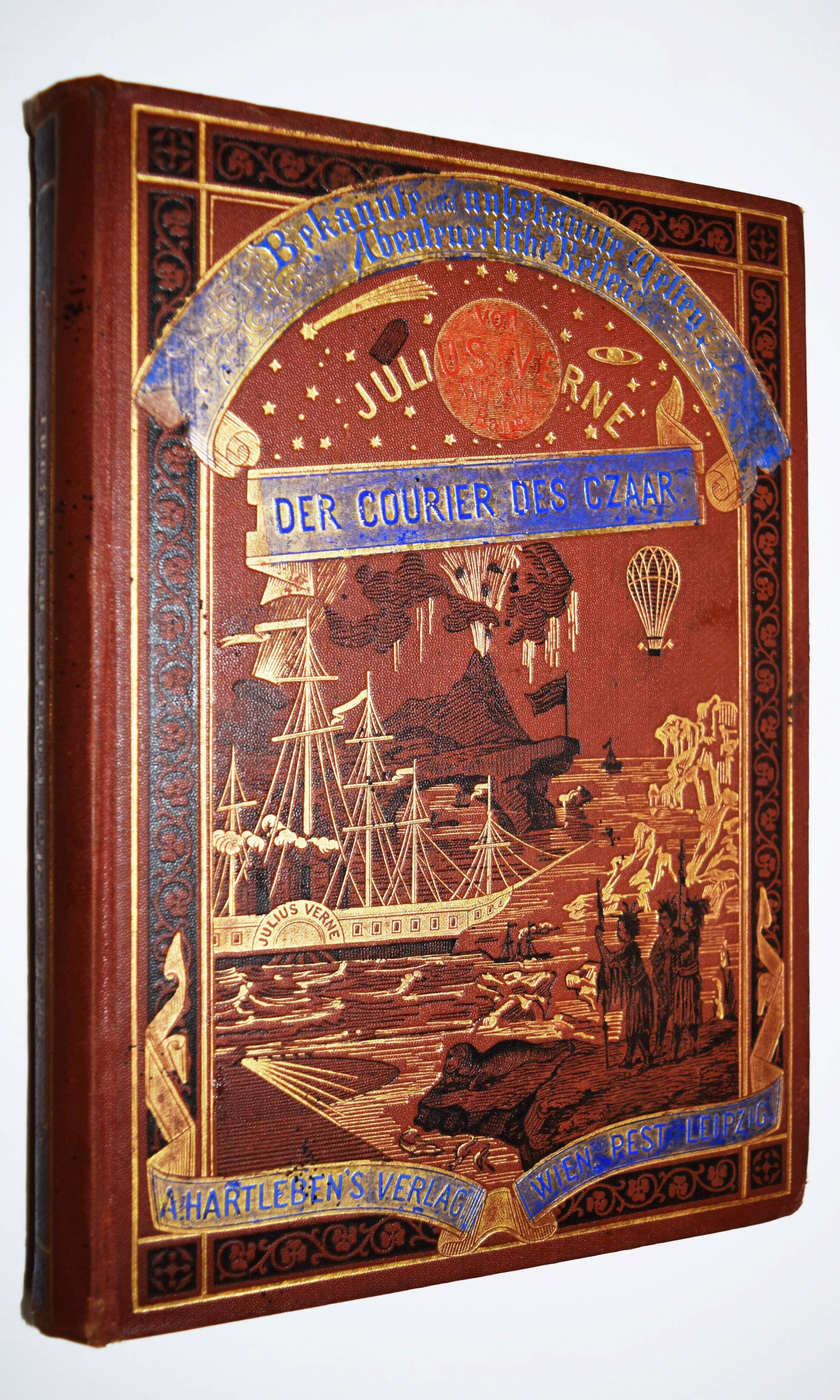 Verne, Jules. Der Courier des Czar (Michael Strogoff). Von Moskau nach Irkutsk. Als Anhang: Ein Drama in Mexico. Wien, Pest, Leipzig, Hartleben 1877. Gr.-8°. 437 S. mit 90 Holzstich-Illustrationen von (Charles) Barbant nach Jules Férat.. Brauner illustr. Orig.-Leinenband mit reicher Gold- und Schwarzprägung. (Bekannte und unbekannte Welten. Abenteuerliche Reisen. Illustrierte Prachtausgaben, 3. Serie, 22. und 23. Band). Jules-Verne-Handbuch S 139, 302, 306 und 320. Klotz 7696, 29. – Erste illustrierte deutsche Ausgabe. – Das Buch wird von Kritikern als eines der besten Werke von Jules Verne bezeichnet. Im Gegensatz zu den sonst sehr nüchternen techniklastigen Werken von Verne zeichnet es sich durch einen lebendigen Stil und einen reportagehaft nüchternen Ton sowie eine anschauliche Landschaftsschilderung aus. – „Das größte künstlerische Talent… ist jedoch J. Férat (1829-?). Er verfügt über die schwungvollste Handschrift… Ihm ist unter anderem die Bebilderung von „Der Kurier des Zaren“ zu verdanken, in der er sein Bestes gibt“ (Jules-Verne-Handbuch S. 257). – Einband etwas berieben, durchgehend im unteren Blattrand etwas fingerfleckig, gutes Exemplar.