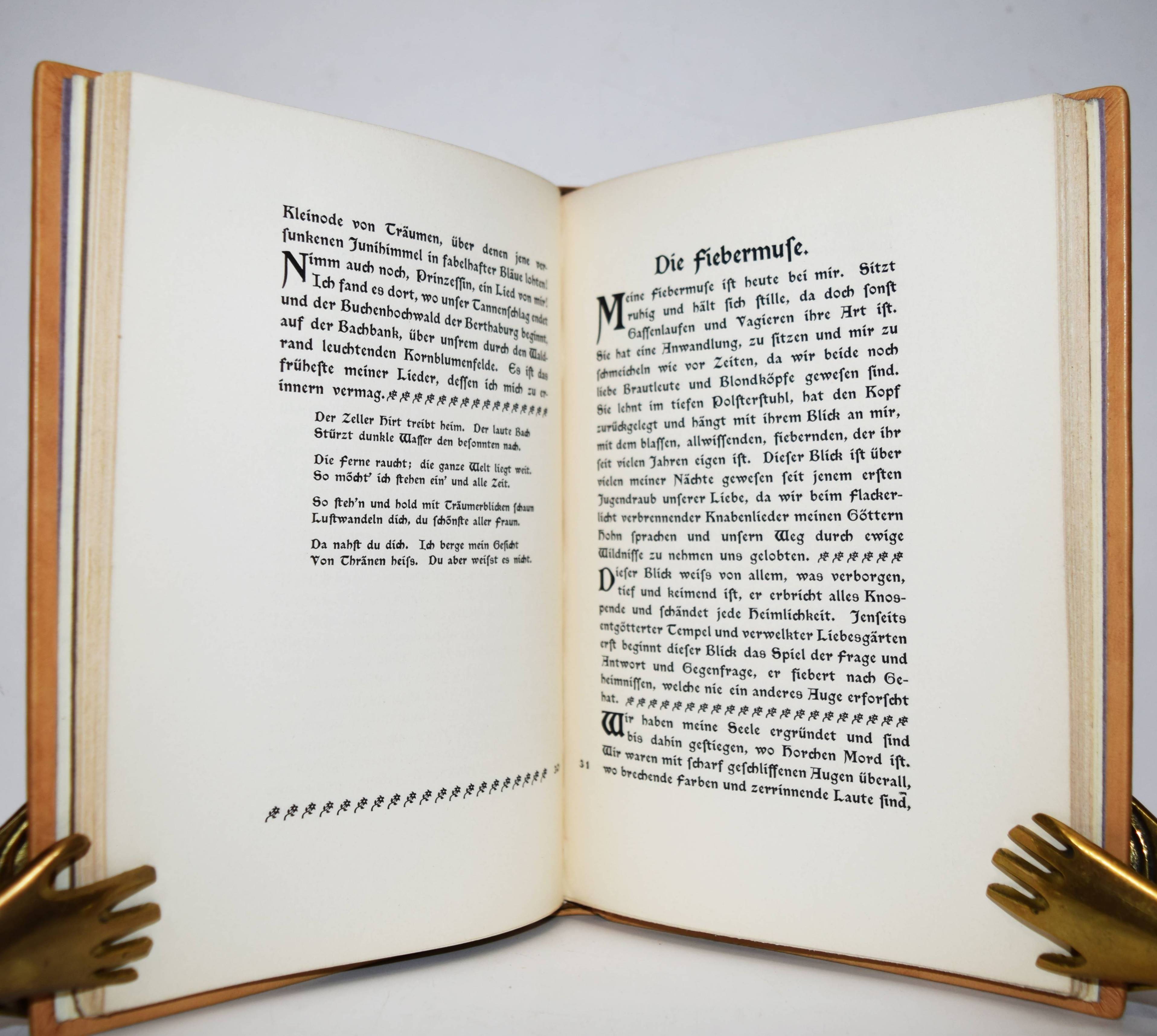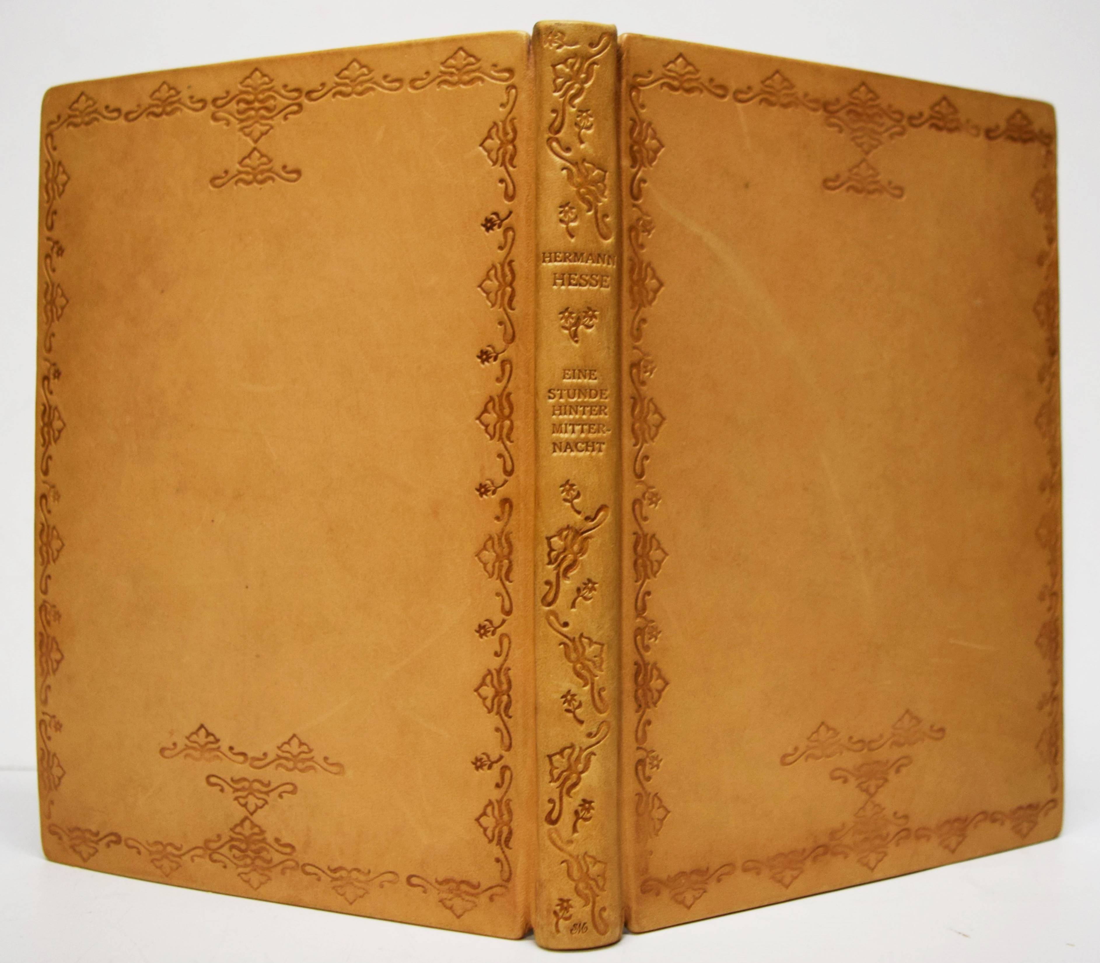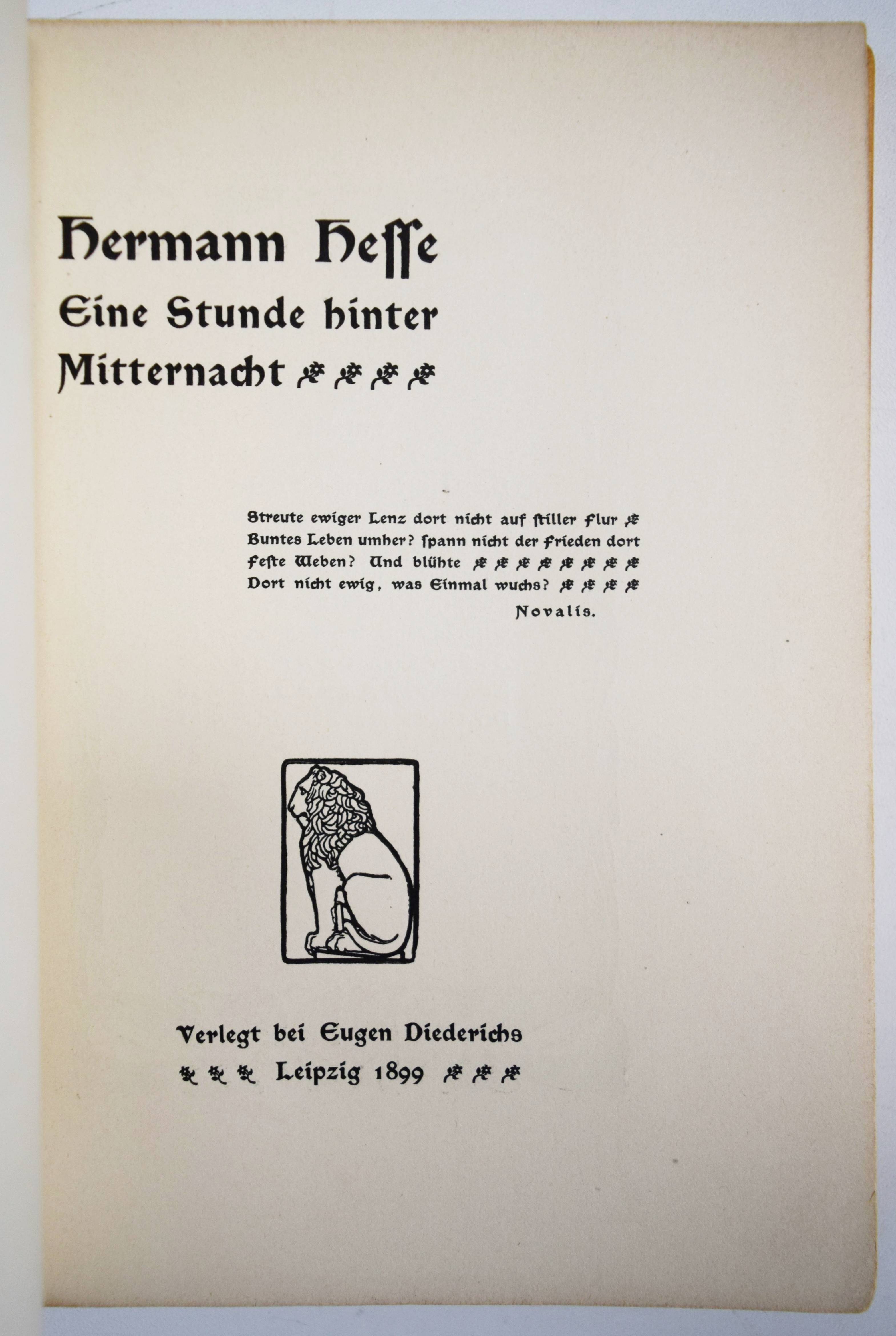 Hesse, Hermann. Eine Stunde hinter Mitternacht. (Neun Prosastudien). Leipzig, Eugen Diederichs 1899. 8°. [2] Bl., 84 S. mit Jugendstil-Buchschmuck. Blindgeprägter Kalbslederband (signiert „S.M.“; blaugrauer typogr. Orig.-Umschlag beigebunden). Slg. Borst 4345. Kliemann/Silomon 2. Mileck I, 2. Unseld, Werk und Wirkungsgeschichte 1987, S. 26 f. (mit Abb.). Waibler E 180. W.-G.² 2. – Erste Ausgabe der zweiten Buchveröffentlichung und gleichzeitig des ersten Prosawerks von Hermann Hesse, das ursprünglich „Eine Meile hinter Mitternacht“ heißen sollte. – Umschlag und Buchschmuck von Otto Eckmann. – Der Dichter war damals 22 Jahre alt. Die neun Prosastücke entstanden im Winter1898/99 in Tübingen und wurden durch Vermittlung der Dichterin Helene Voigt, der späteren Gattin des Verlegers Eugen Diederichs, von diesem in einer Auflage von 600 Exemplaren im Juli 1899, “ungemein sorgfältig gesetzt, gedruckt und geschmückt“ (Hesse), veröffentlicht. Das von Hesse in einem Brief an Diederichs 1904 als “mein Unglücksbuch” bezeichnete Frühwerk, fand nichtsdestotrotz freundliche Besprechungen durch Rilke und Wilhelm von Scholz. Im ersten Jahr setzte der Verlag nur 53 Exemplare ab und Diederichs zog es auf Bitten Hesses 1904 aus dem Buchhandel zurück. – Schönes, dekorativ gebundenes Exemplar.