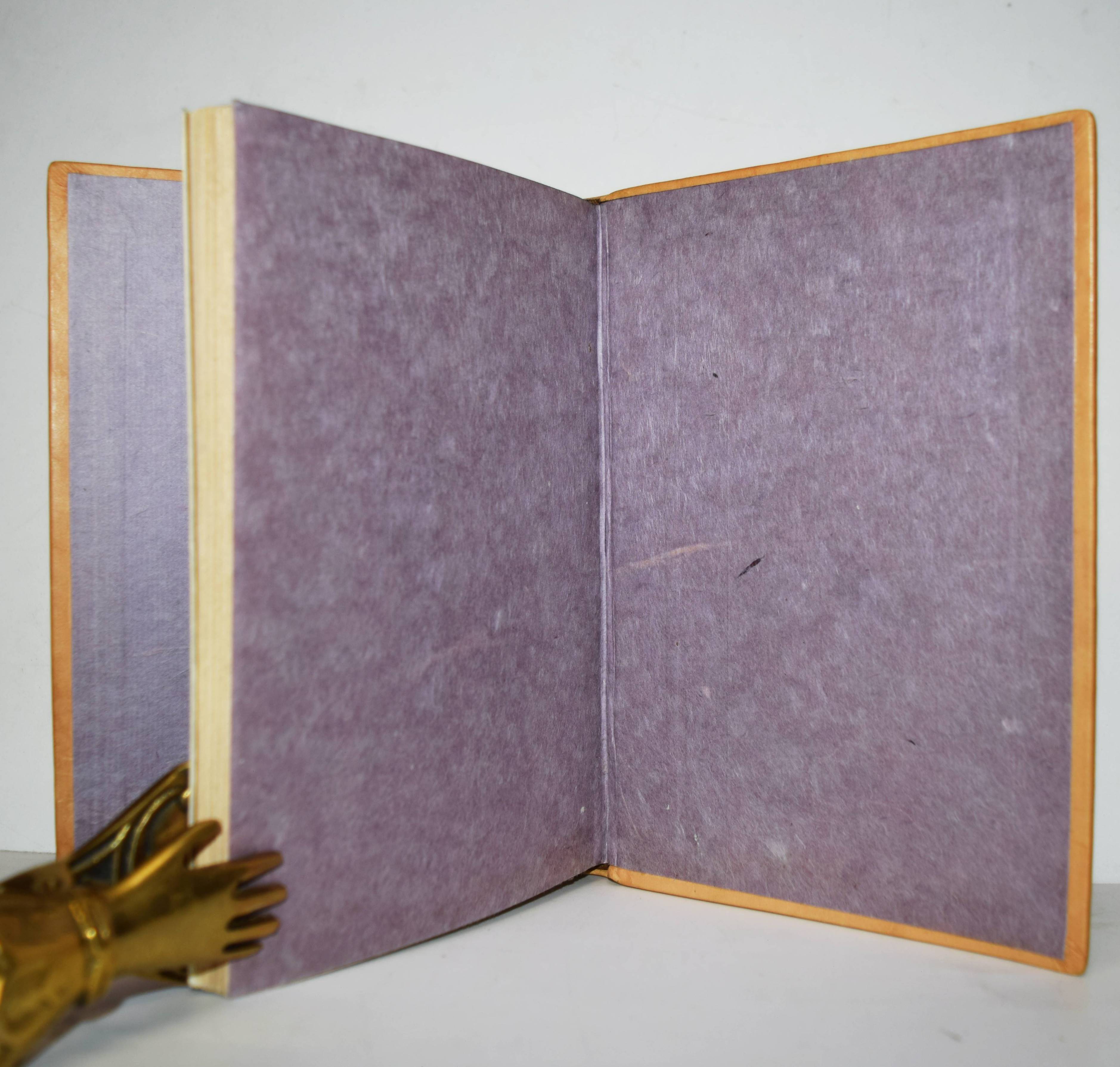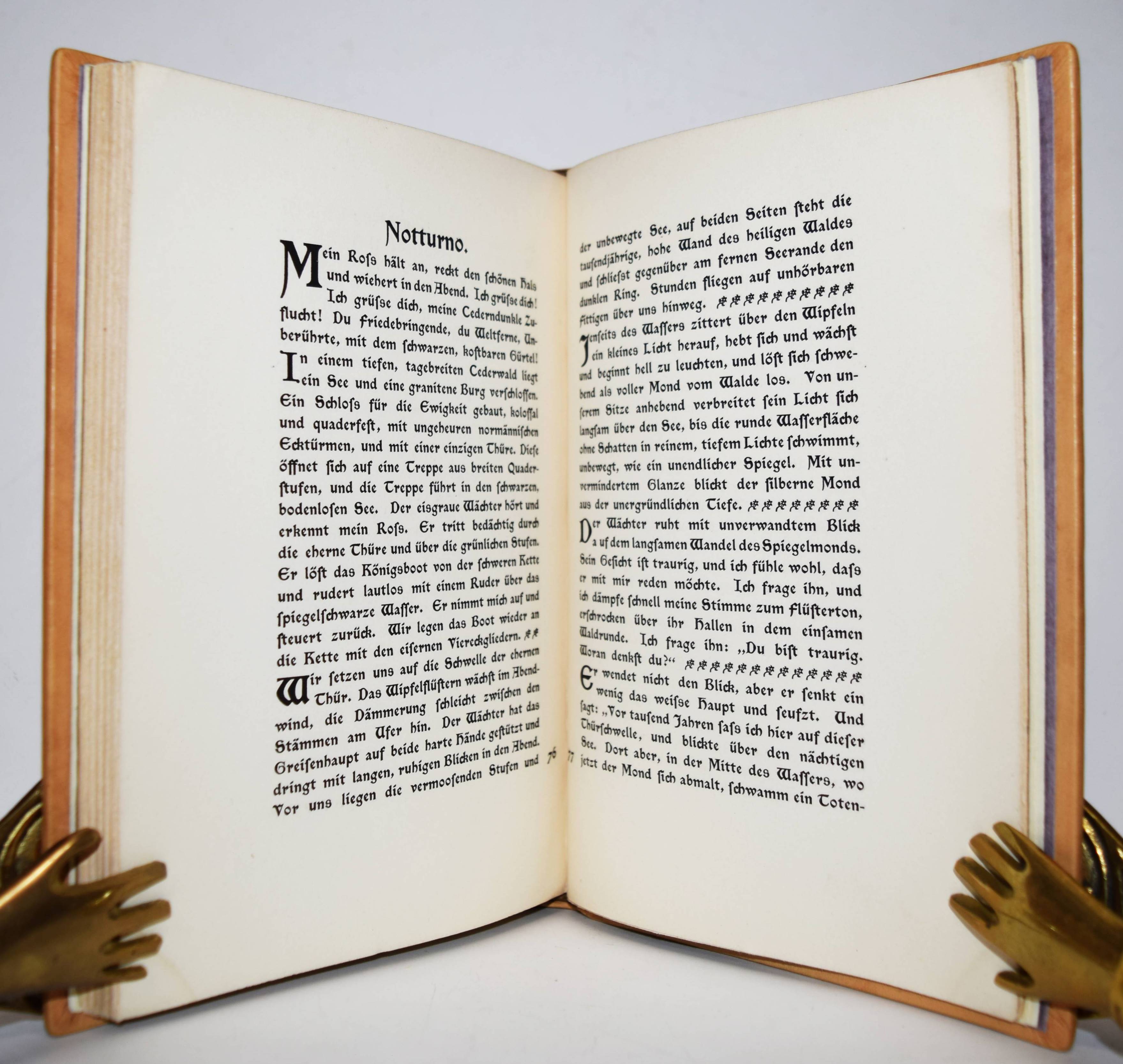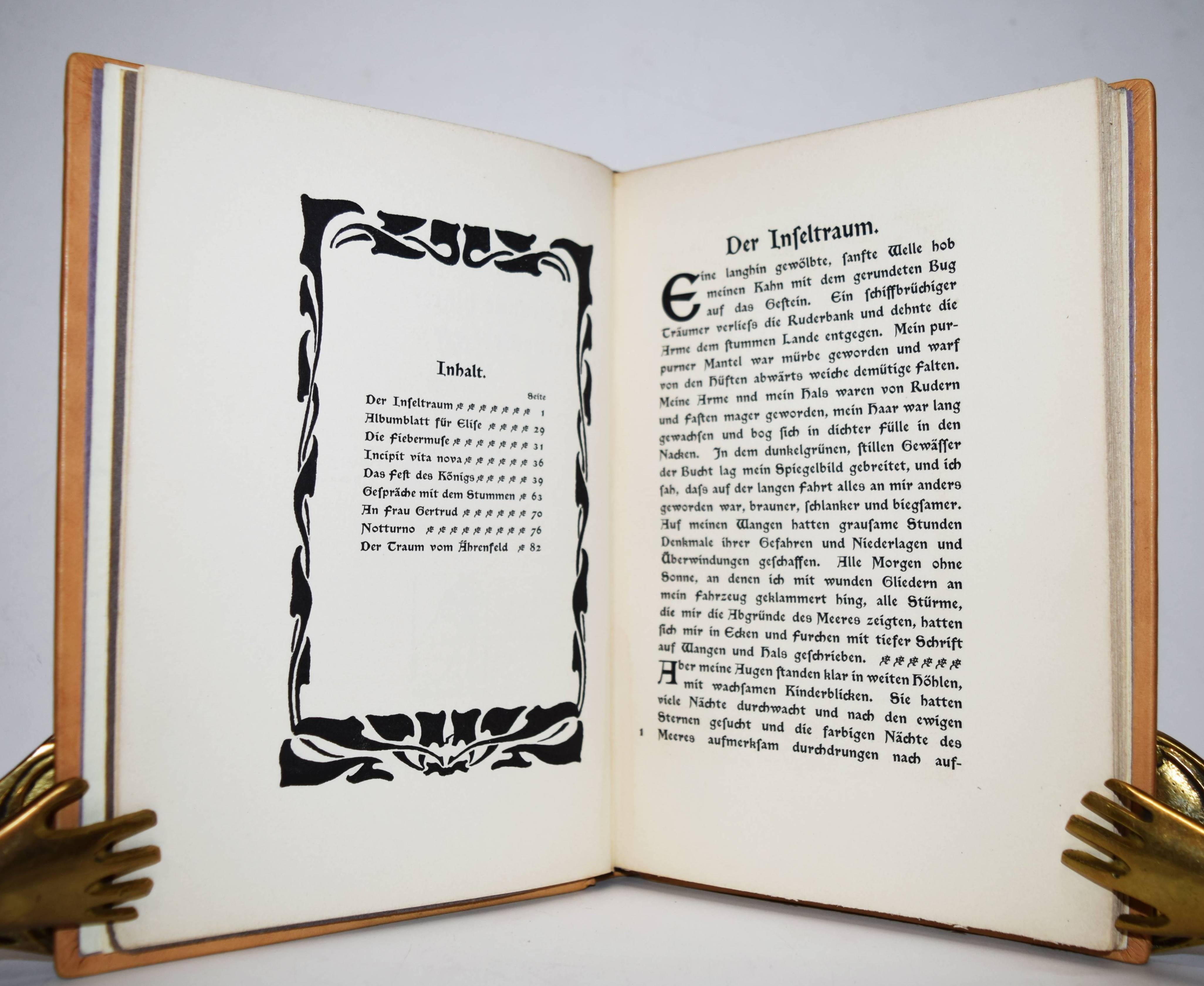 Hesse, Hermann. Eine Stunde hinter Mitternacht. (Neun Prosastudien). Leipzig, Eugen Diederichs 1899. 8°. [2] Bl., 84 S. mit Jugendstil-Buchschmuck. Blindgeprägter Kalbslederband (signiert „S.M.“; blaugrauer typogr. Orig.-Umschlag beigebunden). Slg. Borst 4345. Kliemann/Silomon 2. Mileck I, 2. Unseld, Werk und Wirkungsgeschichte 1987, S. 26 f. (mit Abb.). Waibler E 180. W.-G.² 2. – Erste Ausgabe der zweiten Buchveröffentlichung und gleichzeitig des ersten Prosawerks von Hermann Hesse, das ursprünglich „Eine Meile hinter Mitternacht“ heißen sollte. – Umschlag und Buchschmuck von Otto Eckmann. – Der Dichter war damals 22 Jahre alt. Die neun Prosastücke entstanden im Winter1898/99 in Tübingen und wurden durch Vermittlung der Dichterin Helene Voigt, der späteren Gattin des Verlegers Eugen Diederichs, von diesem in einer Auflage von 600 Exemplaren im Juli 1899, “ungemein sorgfältig gesetzt, gedruckt und geschmückt“ (Hesse), veröffentlicht. Das von Hesse in einem Brief an Diederichs 1904 als “mein Unglücksbuch” bezeichnete Frühwerk, fand nichtsdestotrotz freundliche Besprechungen durch Rilke und Wilhelm von Scholz. Im ersten Jahr setzte der Verlag nur 53 Exemplare ab und Diederichs zog es auf Bitten Hesses 1904 aus dem Buchhandel zurück. – Schönes, dekorativ gebundenes Exemplar.