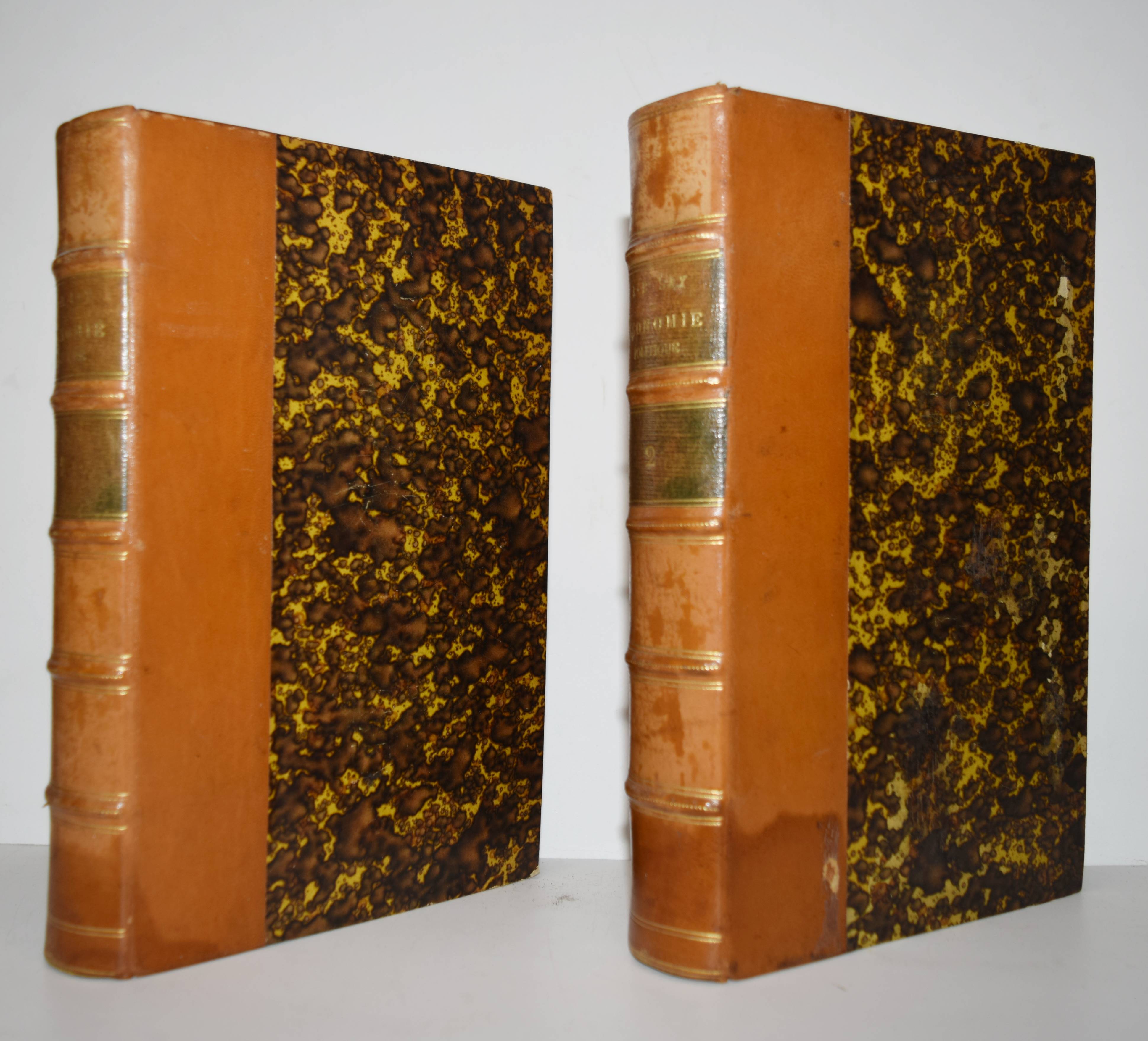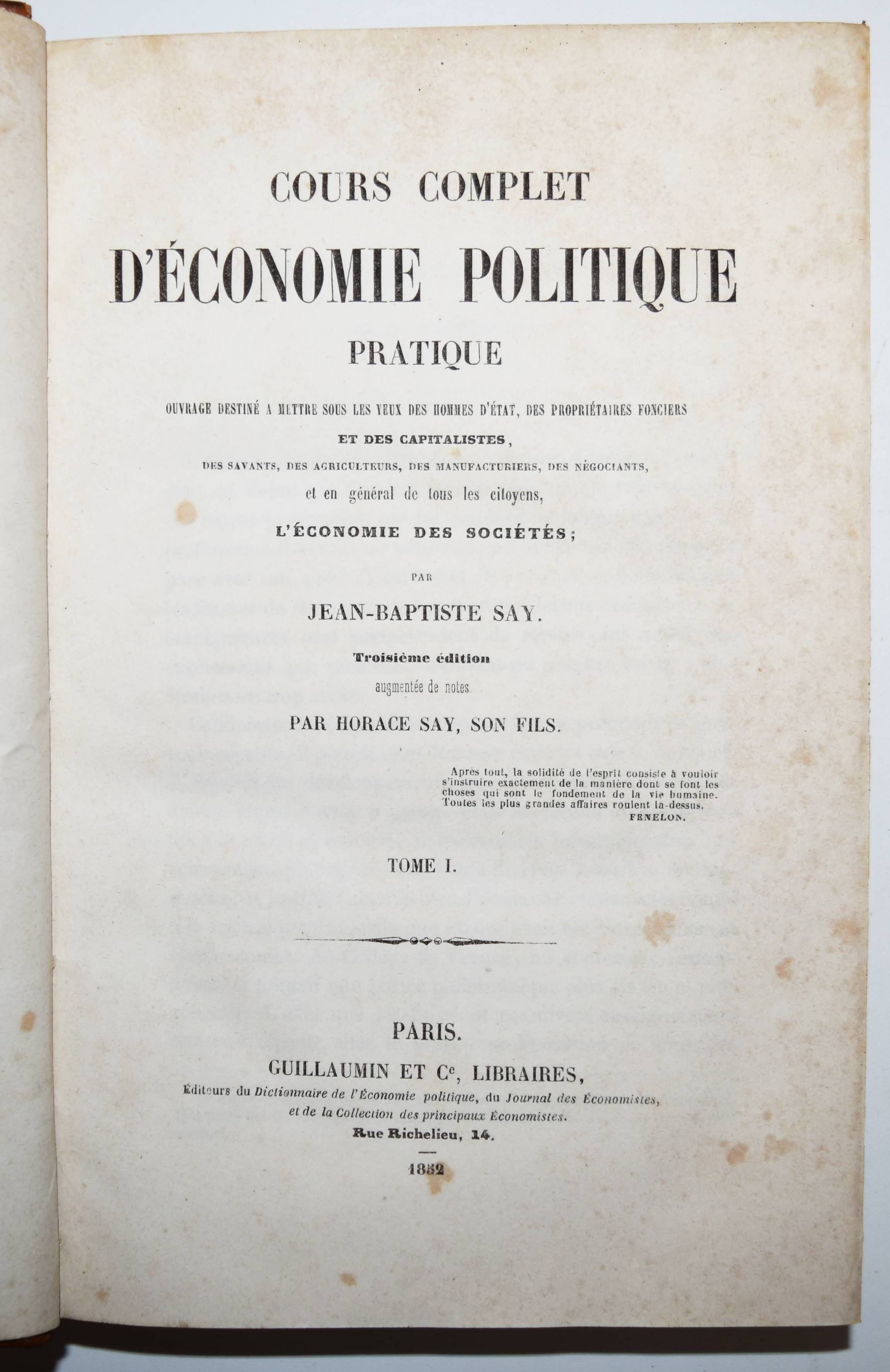 Say, Jean-Baptiste. Cours complet d’économie politique practique. Ouvrage destiné a mettre sous les yeux des hommes d’état, des propriétaires fonciers et des capitalistes, des savans, des agriculteurs, des manufacturiers, des négocians, et en général des tous les citoyens, l’économie des sociétés. Troisième édition augmentée de notes par Horace Say, son fils. 2 Bände. Paris, Guillaumin et Ce. 1852. Gr.-8° (24 x 15,5 cm.). VII, 672 S.; [2] Bl., 624 S. Halblederbände der Zeit mit goldgepr. Rückenschildern und Linienvergoldung. Einaudi 5113. Kress C. 5306. – Dritte Ausgabe, posthum von seinem Sohn herausgegeben. – J. B. Say (1767-1832), Mitglied der Akademie der Wissenschaften und Lehrer am College de France, gilt als führender Ökonom zur Zeit der französischen Restauration. Eines seiner Hauptwerke, der „Cours complet d’économie politique practique“ erschien zuerst 1828-29 in Paris. Eine deutsche Übersetzung erschien erst 1845. – „It is the reproduction of the course of lectures given at the ‚Conservatoire des Arts et Métiers‘. J. B. Say is usually ranked, with A. Smith and Ricardo, amongst the fathers of economic science. He was in the true sense of the world the leader of a school – of the liberal and optimistic school, the influence of which was so great in France, particularly during three quarters of a century“ (Palgrave III, 357). – Rücken leicht fleckig, stellenweise etwas braunfleckig, gutes Exemplar.