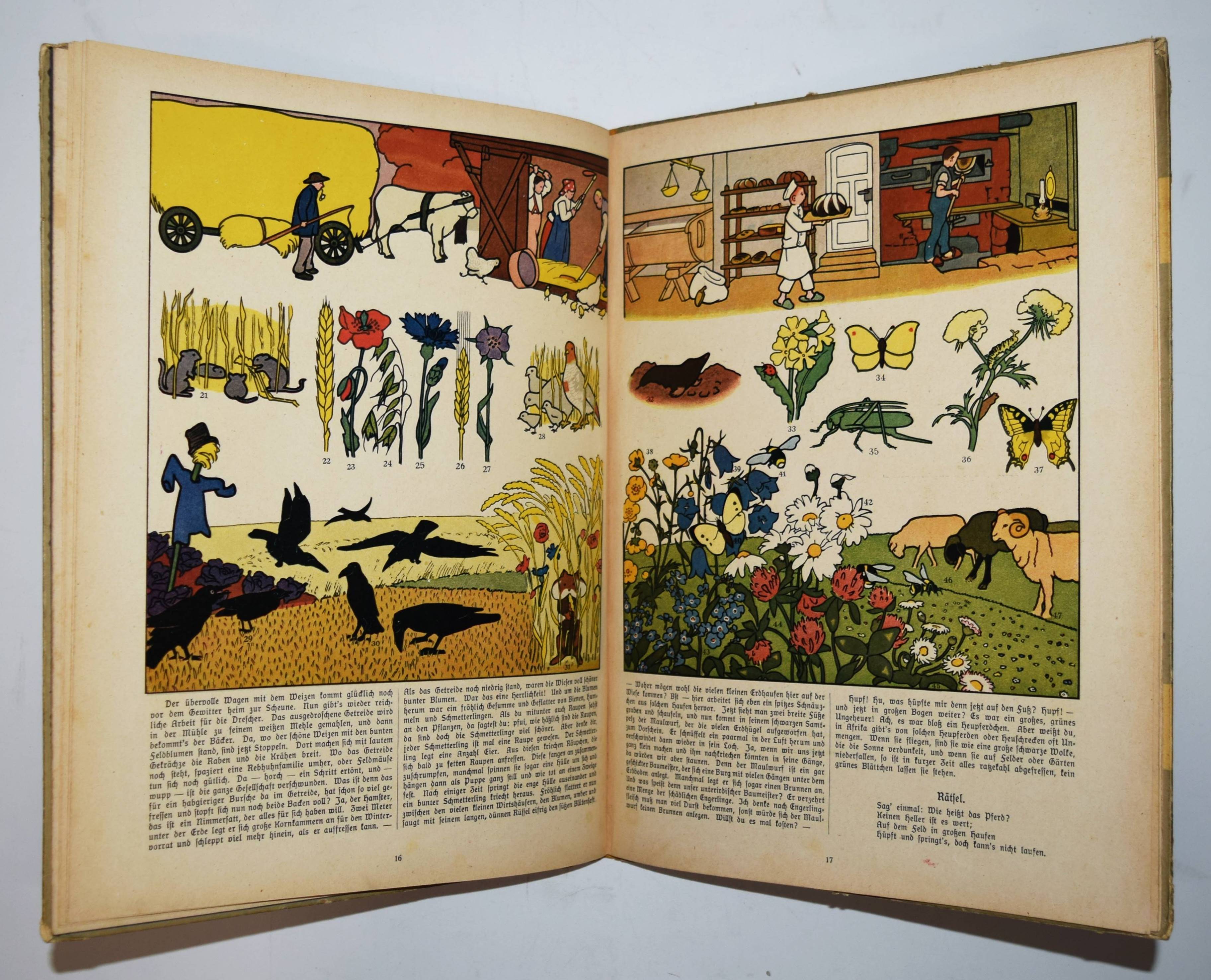 Caspari, Gertrud. Anschauungs- und Darstellungsbuch. Auf dem Lande. 4. Auflage. Leipzig, Alfred Hahn o. J. (ca. 1926). 4°. 32 S. mit farb. Illustrationen. Farbig illustr. Orig.-Halbleinenband. (Verlags-Nr. 5). Bilderwelt 508. Neubert, Caspari 11.4. Vgl. LKJ I, 247. Mergner-Häfner E-22. Ries 464, 11. Stuck-Villa II, 150 u. S. 34 (mit Farbabb. S. 35). – Identisch mit der 3. Auflage. Gegenüber den ersten beiden Auflagen mit anderer Einbandillustration, farbig illustrierten Überschriften und teils umgestellten Bildern, außerdem ohne die Bastelbeilagen. – Textbeiträge von G. Caspari, G. C. Dieffenbach, W. Hey, R. Reinick, H. Seidel, E. Weber u.a. – „In realistischer Sehweise finden sich auf dem Lande hier unter anderem auch Eisenbahn und Automobil.“ „Gertrud Caspari… demonstriert mustergültig, wieviel man mit einer plakativ reduzierten, in kräftigen Umrissen vorgetragenen Darstellung an lachender Formen- und Farbenwelt im Bilderbuch entfalten kann. Die spielzeughafte Vereinfachung der Form und ihre Abwicklung in sattfarbige Buntflächen charakterisiert die besten ihrer… Jugendstil-Bilderbücher. Gertrud Casparis… Bilderbuch erfüllt den besonderen Zweck eines Spielbuchs. Dazu gehört, daß die Bilder zum Ausschneiden und Kleben gedacht sind. Das aber verlangt einfache und möglichst geschlossene Umrisse, wenn das Kind damit hantieren und nicht mit der Schere an komplizierten Formen scheitern soll“ (H. Ries in Bilderwelt u. Stuck-Villa II). – Deckel etwas angestaubt, im Blattrand teils etwas fingerfleckig, gutes Exemplar.
