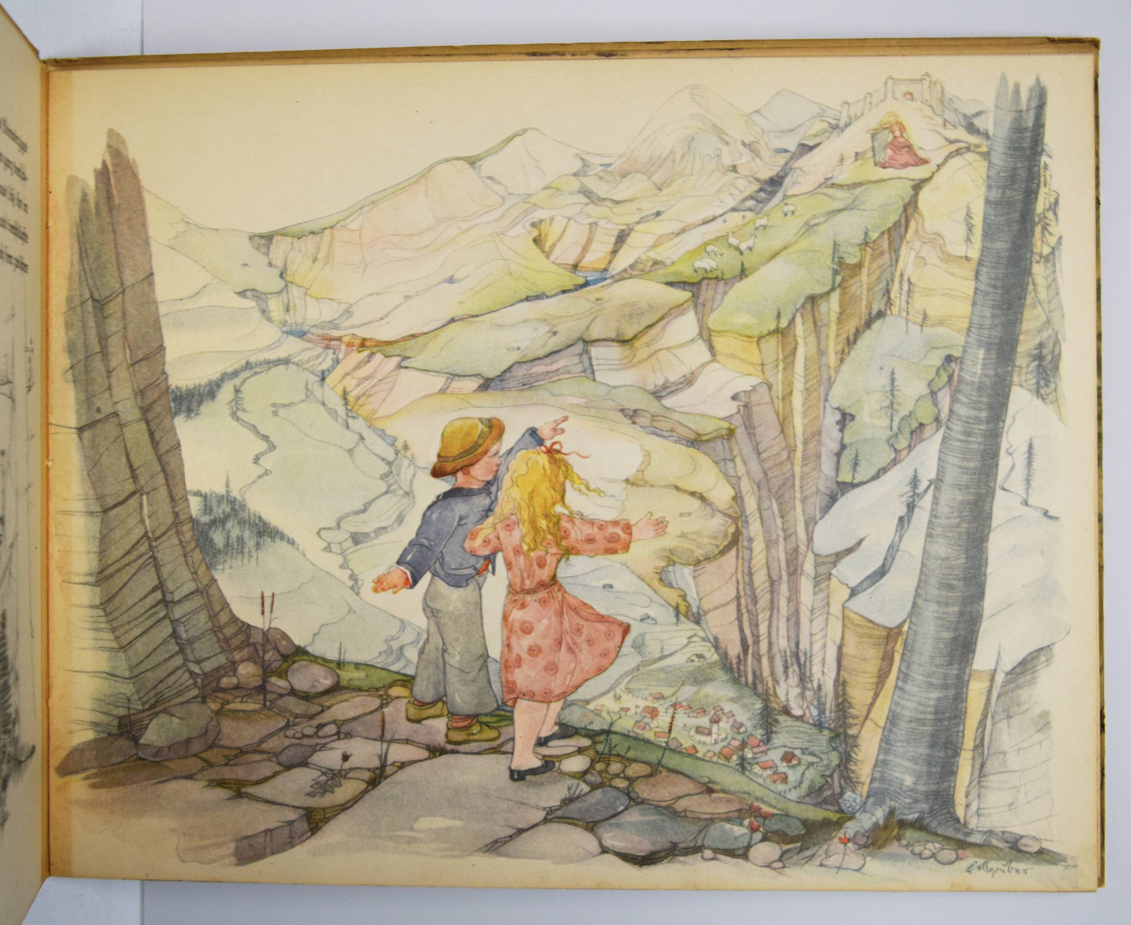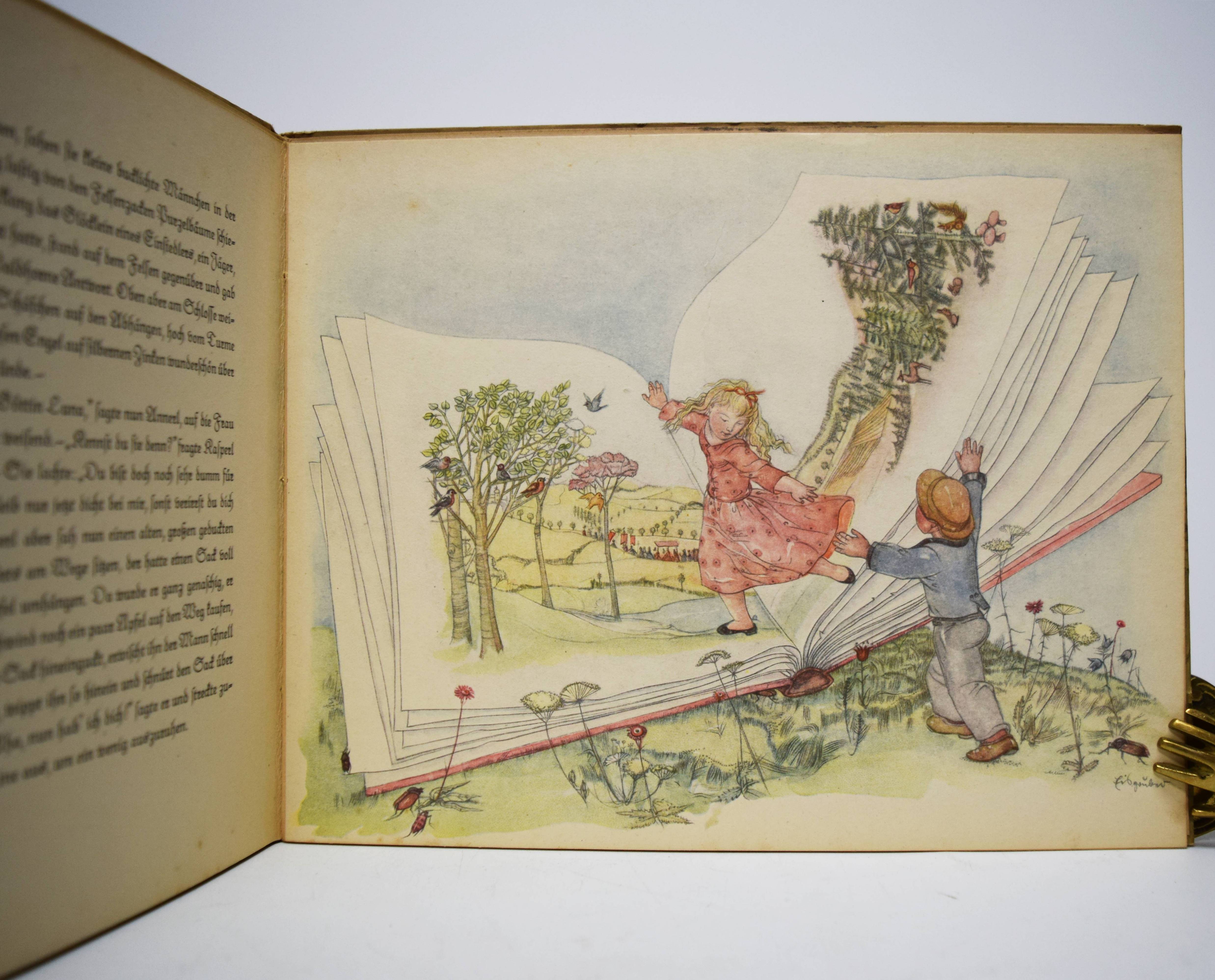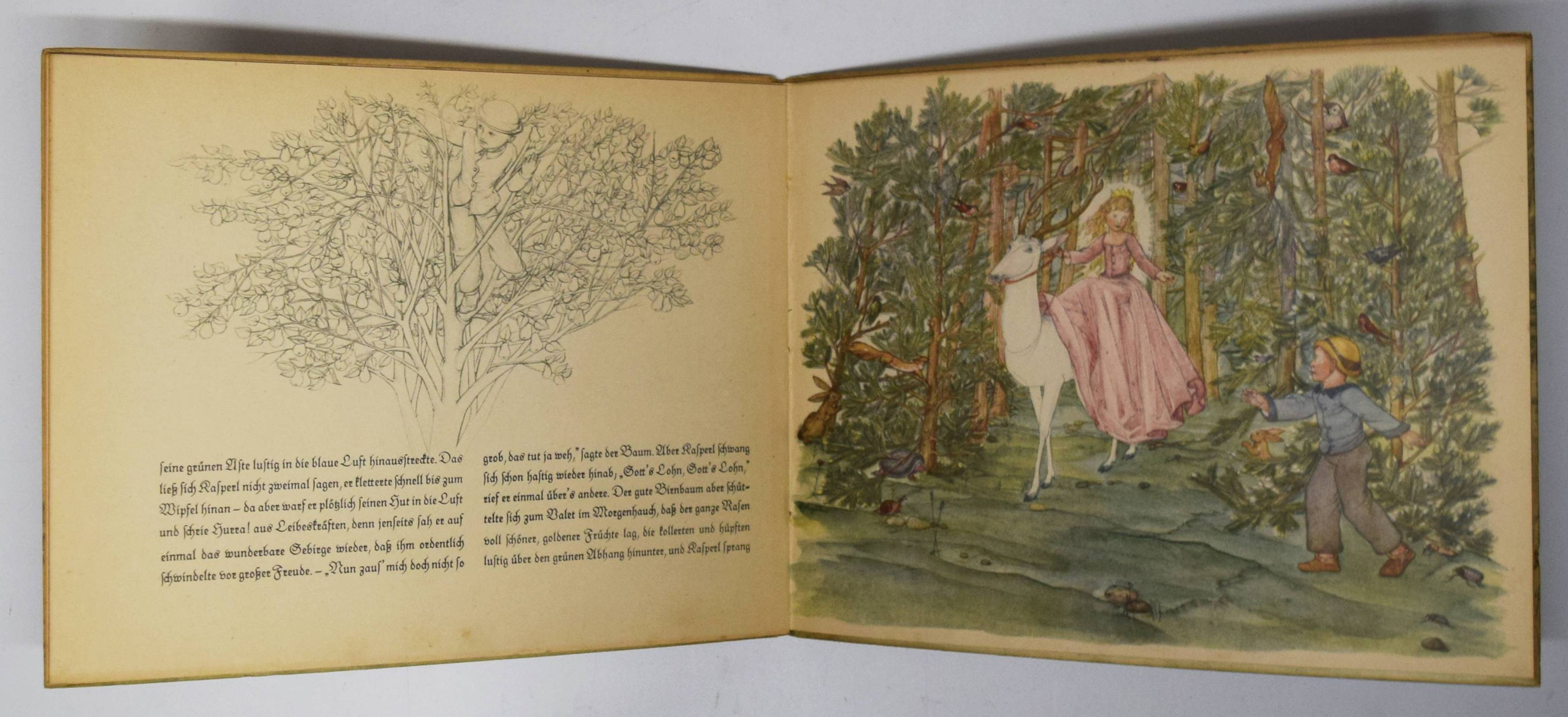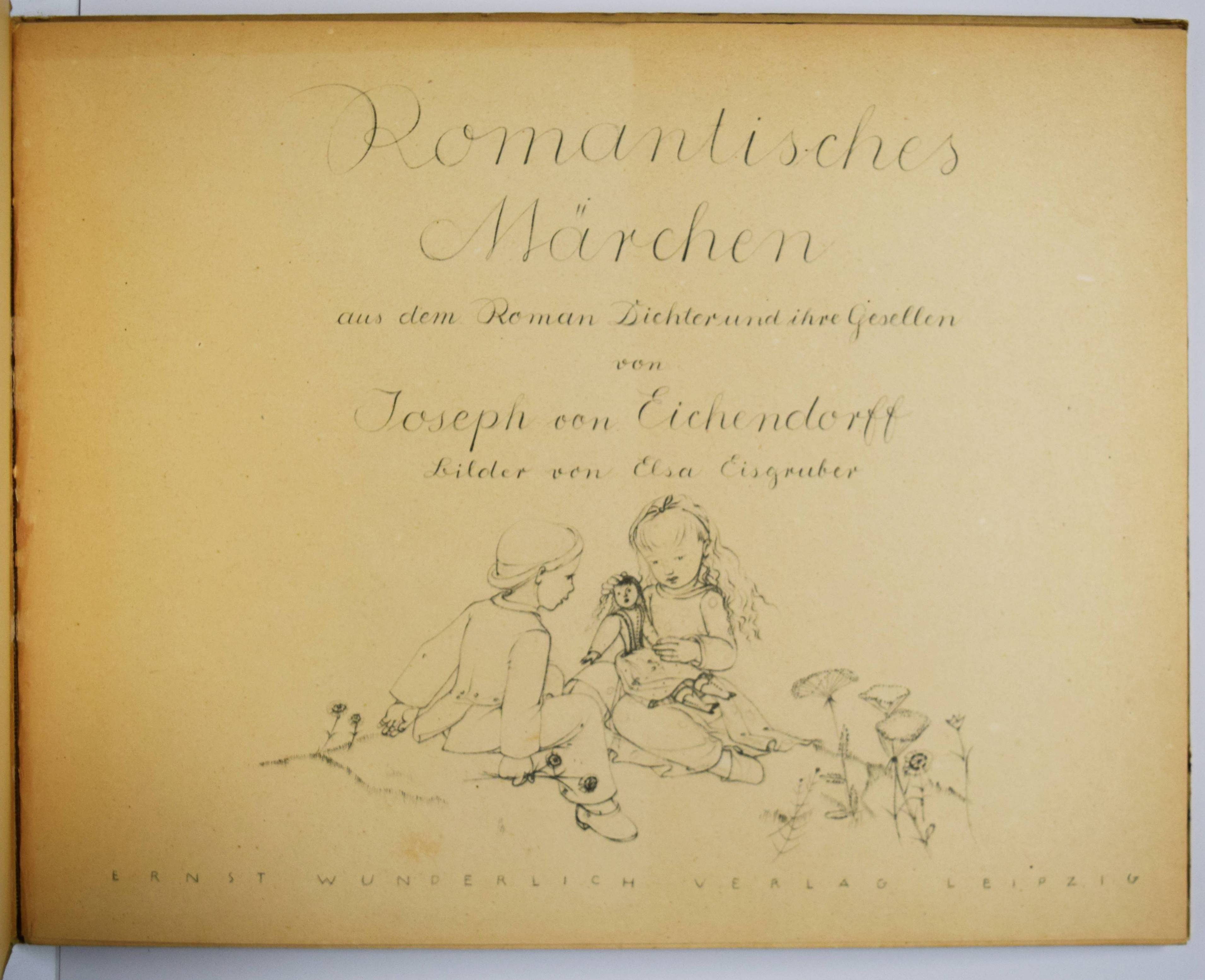 Eichendorff, Joseph v. Romantisches Märchen aus dem Roman Dichter und ihre Gesellen. Bilder von Elsa Eisgruber. Leipzig, Wunderlich o. J. (1949). Quer-Gr.-8°. [8] Bl. mit illustr. Titel u. 12 (6 ganzs.) Illustrationen, davon 5 farbig. Farbig illustr. Oriig.-Pappband. Bilderwelt 653. Doderer-Müller 1202. Hobrecker, Frankfurt 355. LKJ I, 342. Muck II, 5242. Murken, Eisgruber I.17. Weismann 206. – Erste Ausgabe. – Die Illustrationen in zarten Pastellfarben erinnern an japanische Malerei. – „Elsa Eisgruber hat ihre Spezialität in der Darstellung der Blume, richtiger müsste man sagen: des Wachstums, wie es sich in der Blume offenbart… Kein Wunder, daß diese Künderin des Lebens auch das Kind in einem neuen Sinne darzustellen vermag, im Wachsen und Werden einer Pflanze vergleichbar. Blumen und Gräser, Kinder und Heilige: das ist ihre Welt, die durch ihre Bilderbücher in vielen Herzen Einzug hielt“ (E. Redslob in Der Tagesspiegel, Berlin vom 5. 2. 1948). – Einband etwas angestaubt und leicht fleckig, sonst gutes Exemplar des schönen Märchen-Bilderbuchs.
