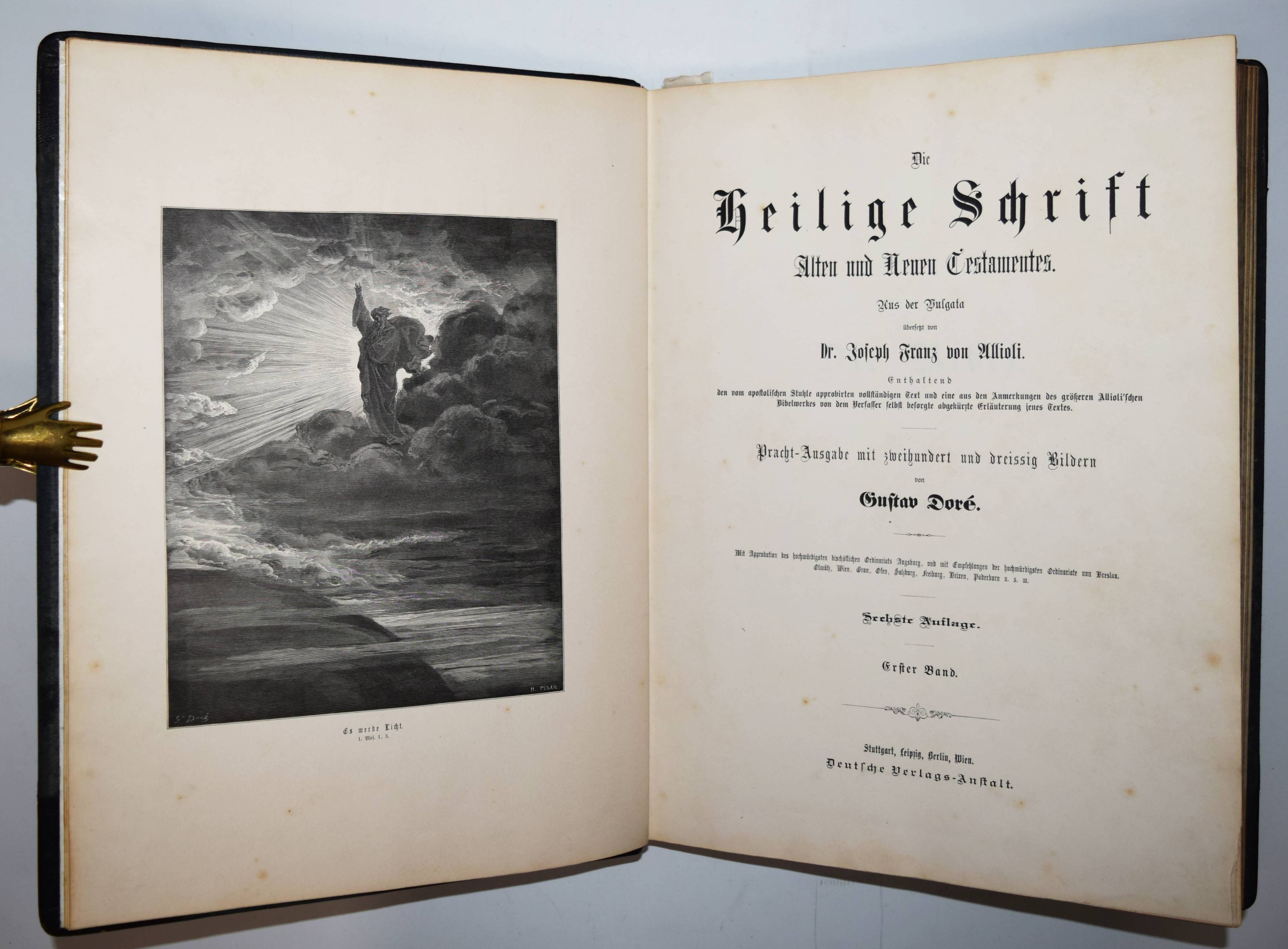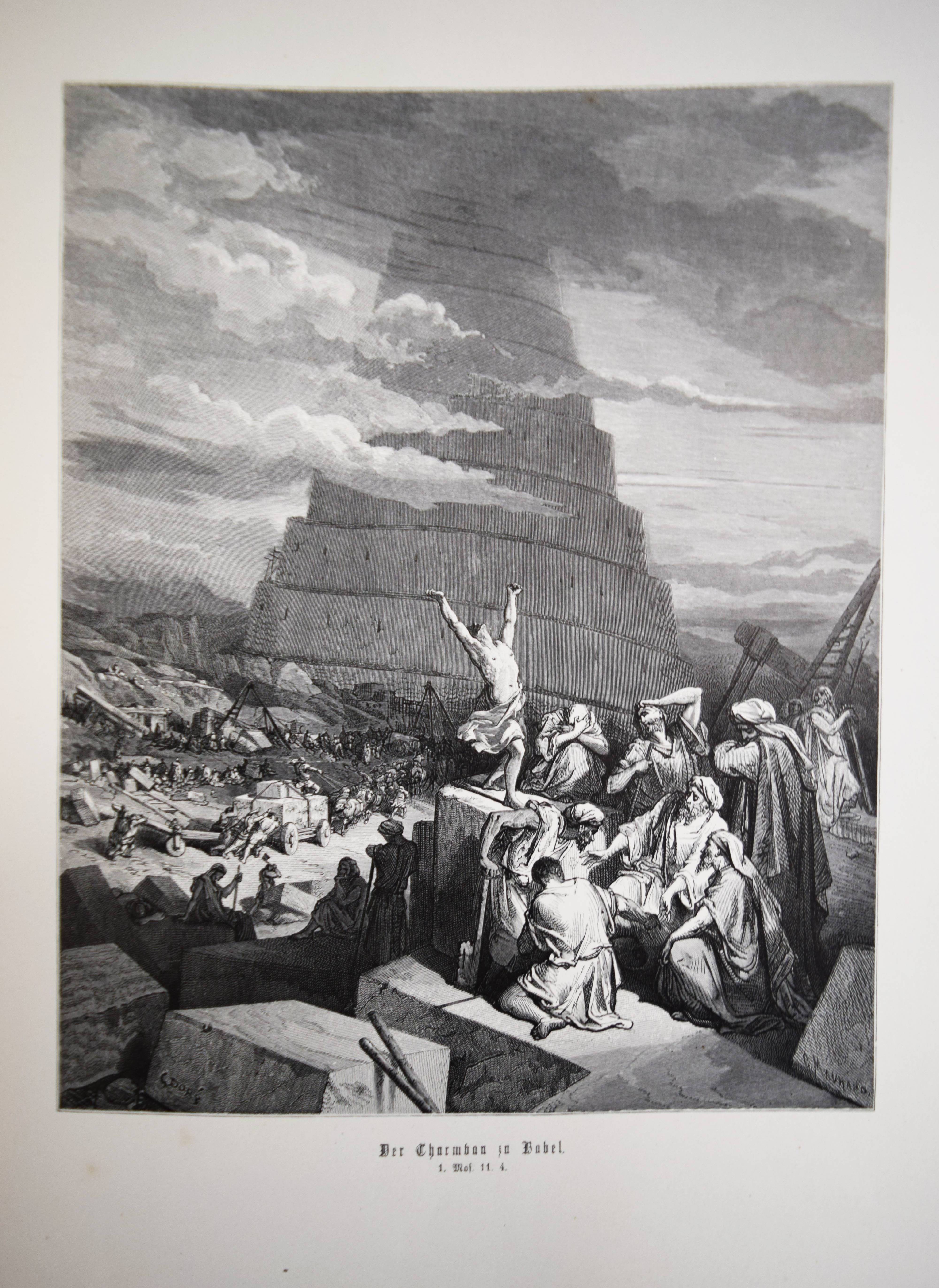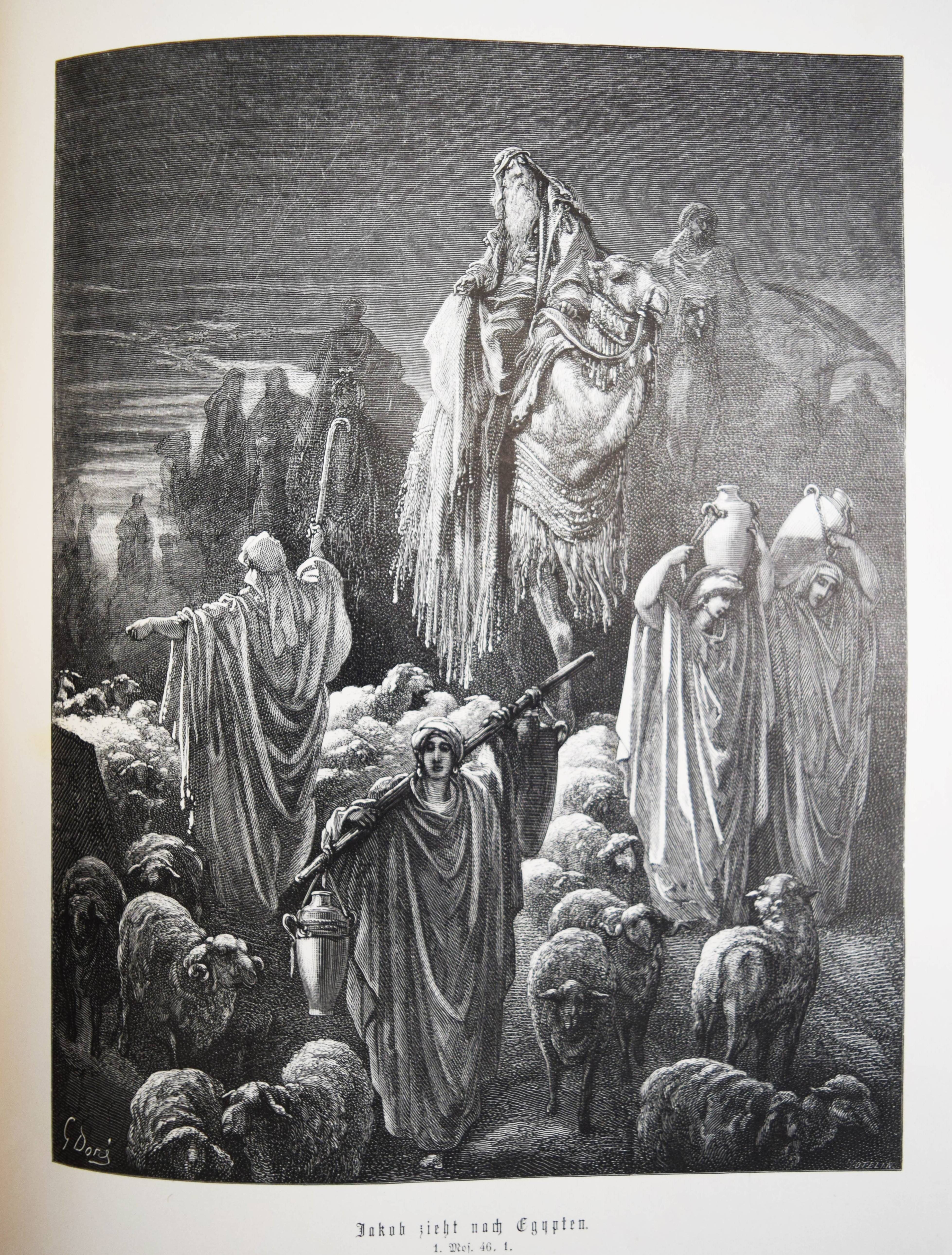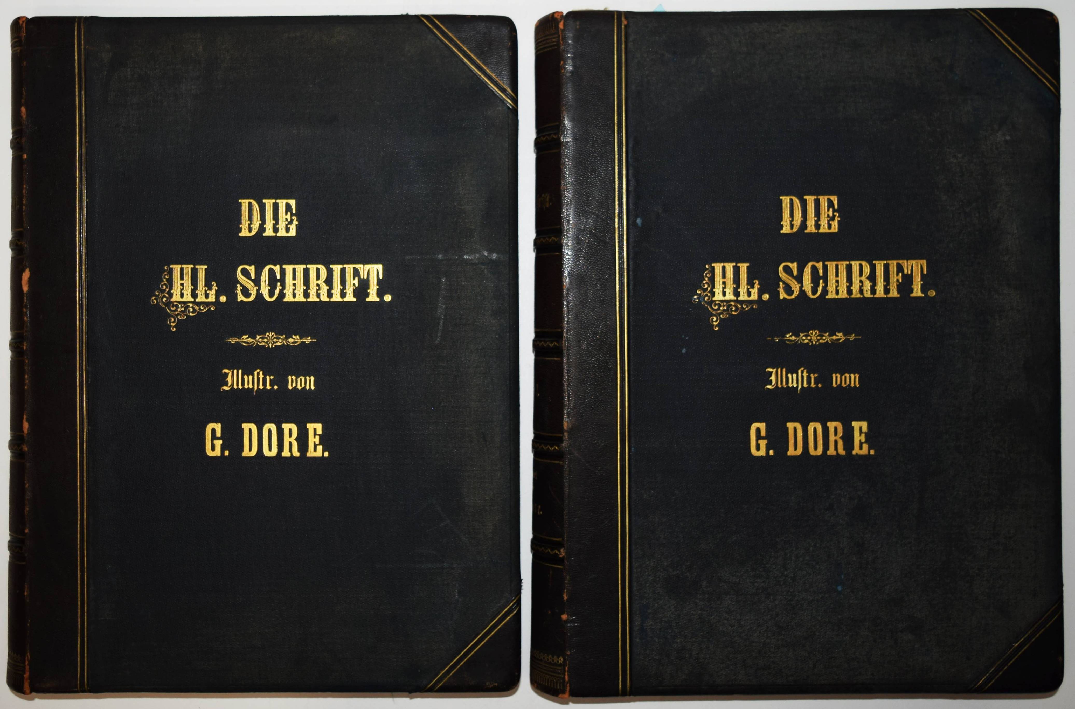 Biblia Germanica – Die Heilige Schrift. Alten und Neuen Testaments. Aus der Vulgata übersetzt von Dr. Joseph Franz von Allioli. Enthaltend den vom apostolischen Stuhle approbirten vollständigen Text und eine aus den Anmerkungen des größeren Allioli’schen Bibelwerks von dem Verfasser selbst besorgte abgekürzte Erläuterung jenes Textes. Pracht-Ausgabe mit zweihundert und dreissig Bildern. 6. Aufl. 2 Bände. Stuttgart, Leipzig, Berlin, Wien, Deutsche Verlags-Anstalt (1887). Folio (42,5 x 33 cm.). [13] Bl., XVI, 834 Sp.; [4] Bl., Sp. 835-1252, 356 Sp. mit 230 ganzs. Holzstich-Illustrationen und Buchschmuck von Gustave Dore. Orig.-Halblederbände mit Rückenvergoldung und goldgeprägtem Rücken- und Deckeltitel. „Die Bilderbibel von Gustave Doré (1832-1883) erschien mit 230 Illustrationen 1866 in französischer Erstausgabe und wurde zu einem durchschlagenden Erfolg. Trotz hoher Kosten war die erste Auflage innerhalb weniger Tage vergriffen. … Doré soll den Wunsch geäußert haben, die gesamte Weltliteratur zu illustrieren. … Die Illustrationen und vor allem die Motivwahl von Doré stellen etwas völlig Neues in der Geschichte der Bibel-Illustrationen dar. So bevorzugt Doré dramatische Geschichten. Häufig finden sich Massenszenen sowie Schlachtszenarien. Auch orientalisch anmutende Prunkarchitektur, u¨berladene Prachtgewänder und opulente Paläste sind deutlich häufiger anzutreffen als die karge Landschaft des Heiligen Landes. Generell sind die Bilder von Doré regelrecht bedrohlich und thematisieren häufig Tod, Leid und Bedrängnis. Ebenso wie die Bibel von Julius Schnorr von Carolsfeld beeinflusst die Bilderbibel von Gustave Doré durch die einprägsamen Illustrationen ganze Generationen und ihre Bildvorstellungen von den Geschichten der Heiligen Schrift. Im Gegensatz zu Schnorr von Carolsfeld steht bei Doré aber nicht die Vermittlung der biblischen Geschichten im Mittelpunkt, sondern vielmehr sollen seine atmosphärischen Geschichten ein Massenpublikum ansprechen“ (H. Strutwolf und J. Graefe, „Wohlauf lasst uns eine Stadt und einen Turm bauen“ Babel in der Bibel. Ausstellungskatalog zur Ausstellung im Bibelmuseum vom 25.8.2020 bis 15.11.2020). – Deckel etwas berieben, nur vereinzelt leicht braunfleckig, sehr gutes Exemplar.