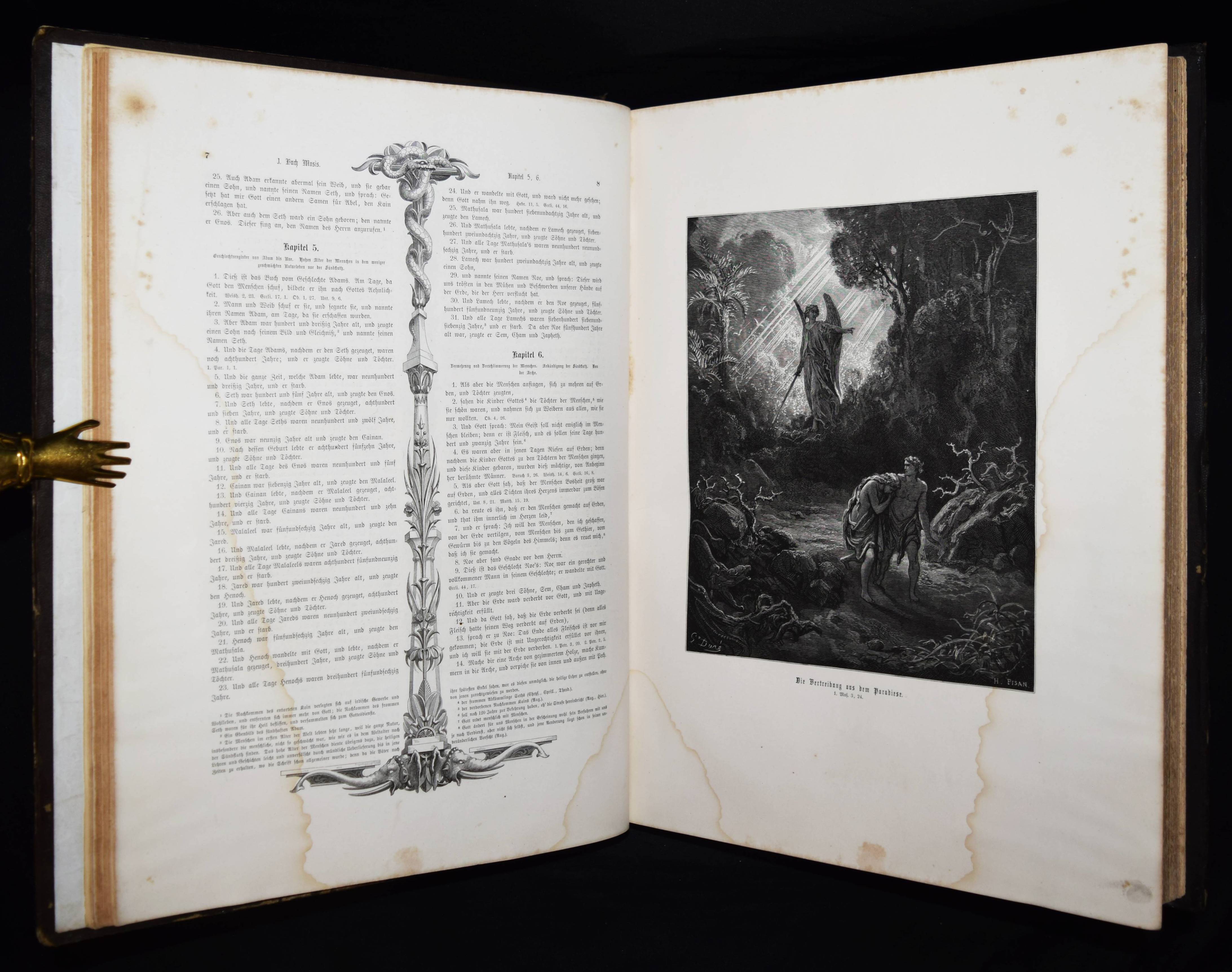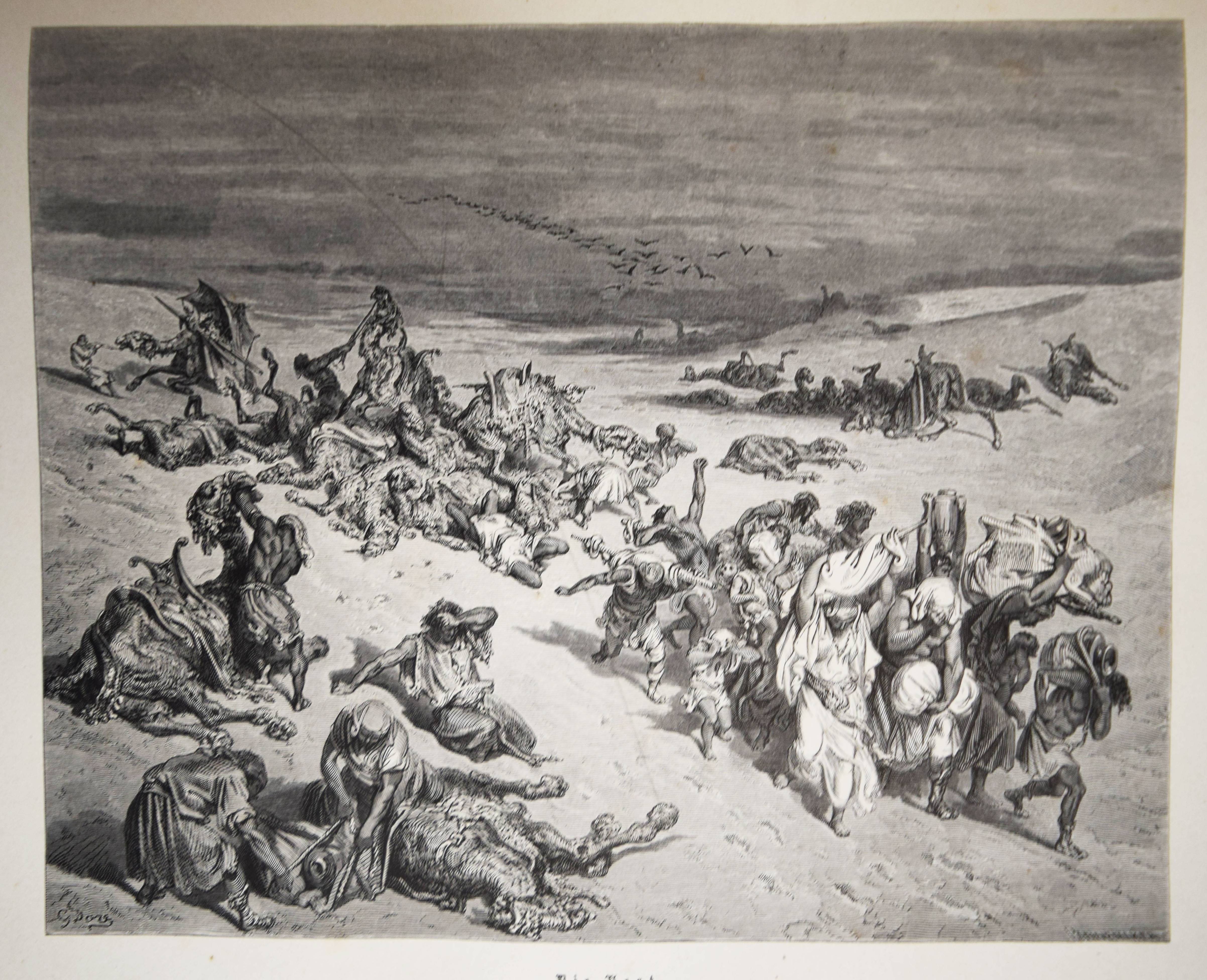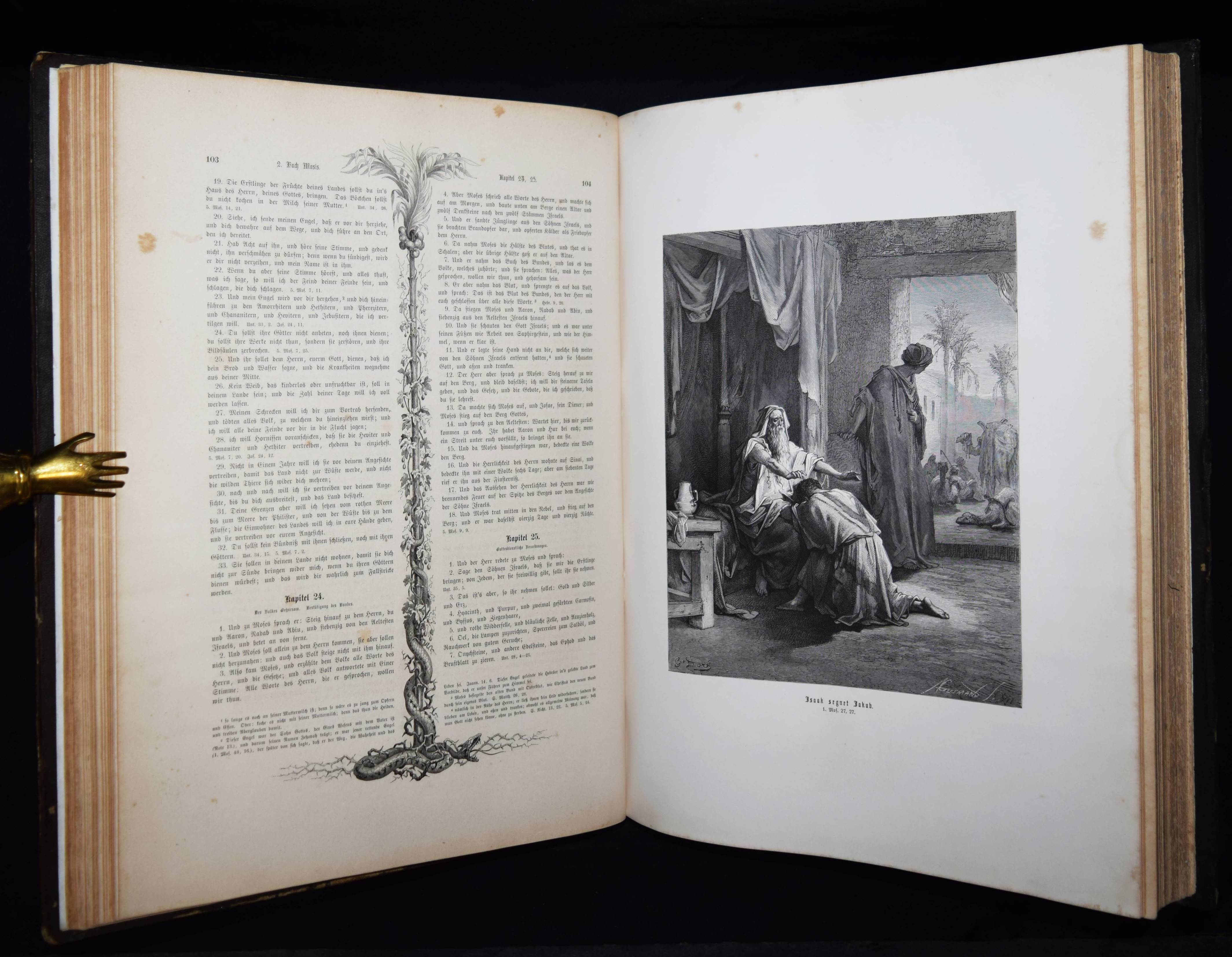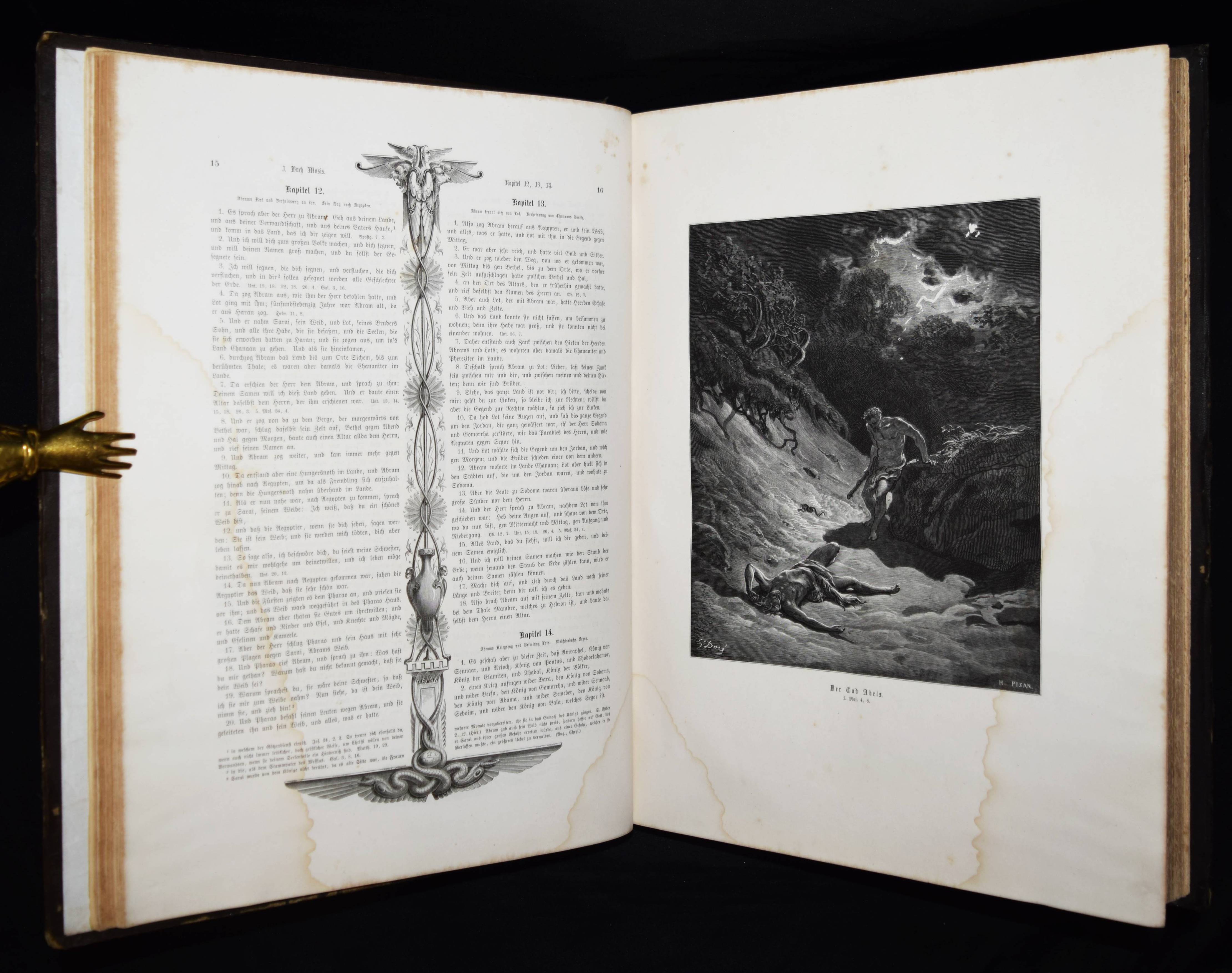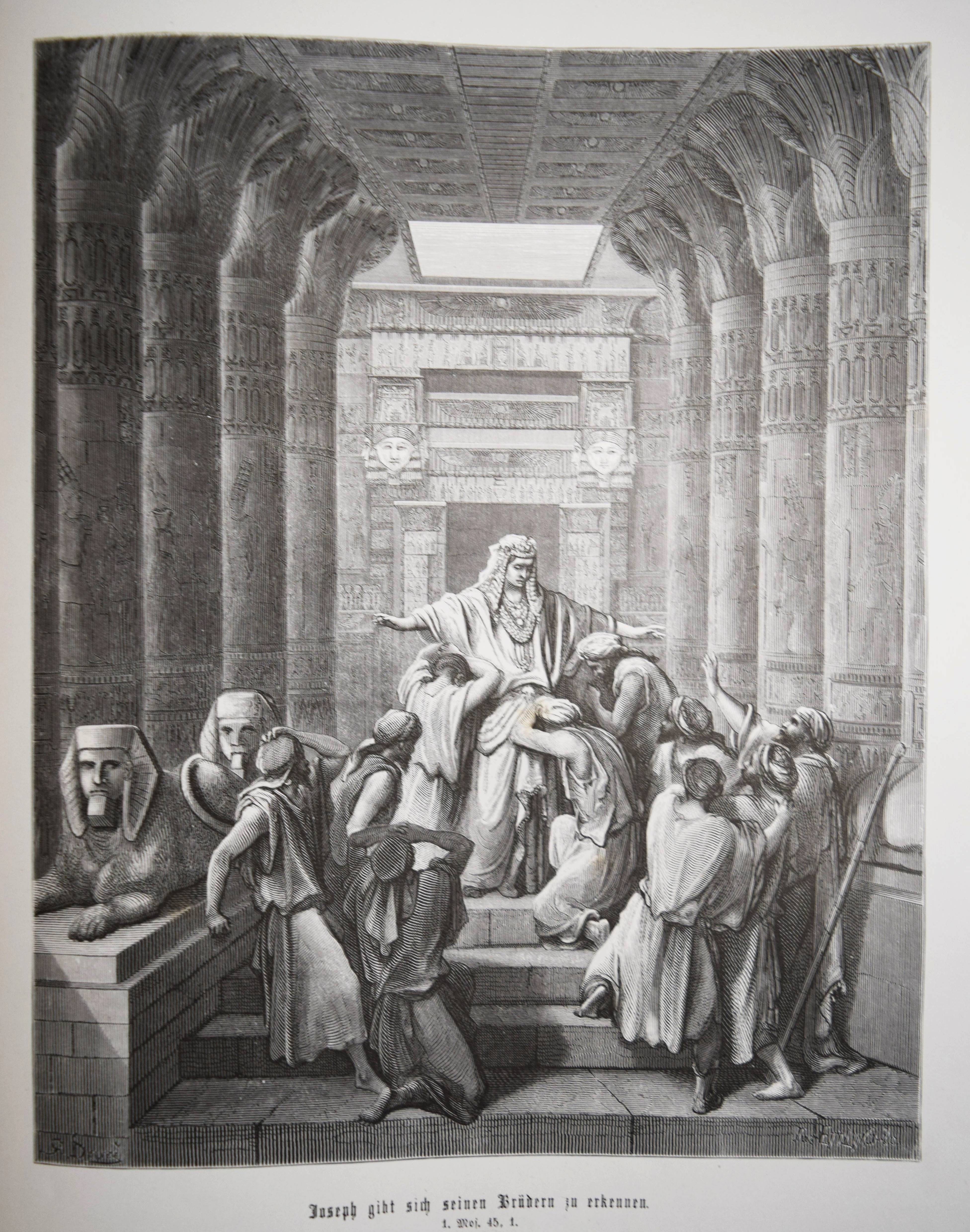Biblia Germanica – Die Heilige Schrift. Alten und Neuen Testaments. Aus der Vulgata übersetzt von Dr. Joseph Franz von Allioli. Enthaltend den vom apostolischen Stuhle approbirten vollständigen Text und eine aus den Anmerkungen des größeren Allioli’schen Bibelwerks von dem Verfasser selbst besorgte abgekürzte Erläuterung jenes Textes. Pracht-Ausgabe mit zweihundert und dreissig Bildern. 6. Aufl. 2 Bände. Stuttgart, Leipzig, Berlin, Wien, Deutsche Verlags-Anstalt (1887). Folio (42,5 x 33 cm.). [13] Bl., XVI, 834 Sp.; [4] Bl., Sp. 835-1252, 356 Sp. mit 230 ganzs. Holzstich-Illustrationen und Buchschmuck von Gustave Dore. Orig.-Halblederbände mit Rückenvergoldung und goldgeprägtem Rücken- und Deckeltitel. „Die Bilderbibel von Gustave Doré (1832-1883) erschien mit 230 Illustrationen 1866 in französischer Erstausgabe und wurde zu einem durchschlagenden Erfolg. Trotz hoher Kosten war die erste Auflage innerhalb weniger Tage vergriffen. … Doré soll den Wunsch geäußert haben, die gesamte Weltliteratur zu illustrieren. … Die Illustrationen und vor allem die Motivwahl von Doré stellen etwas völlig Neues in der Geschichte der Bibel-Illustrationen dar. So bevorzugt Doré dramatische Geschichten. Häufig finden sich Massenszenen sowie Schlachtszenarien. Auch orientalisch anmutende Prunkarchitektur, u¨berladene Prachtgewänder und opulente Paläste sind deutlich häufiger anzutreffen als die karge Landschaft des Heiligen Landes. Generell sind die Bilder von Doré regelrecht bedrohlich und thematisieren häufig Tod, Leid und Bedrängnis. Ebenso wie die Bibel von Julius Schnorr von Carolsfeld beeinflusst die Bilderbibel von Gustave Doré durch die einprägsamen Illustrationen ganze Generationen und ihre Bildvorstellungen von den Geschichten der Heiligen Schrift. Im Gegensatz zu Schnorr von Carolsfeld steht bei Doré aber nicht die Vermittlung der biblischen Geschichten im Mittelpunkt, sondern vielmehr sollen seine atmosphärischen Geschichten ein Massenpublikum ansprechen“ (H. Strutwolf und J. Graefe, „Wohlauf lasst uns eine Stadt und einen Turm bauen“ Babel in der Bibel. Ausstellungskatalog zur Ausstellung im Bibelmuseum vom 25.8.2020 bis 15.11.2020). – Deckel etwas berieben, nur vereinzelt leicht braunfleckig, sehr gutes Exemplar.
