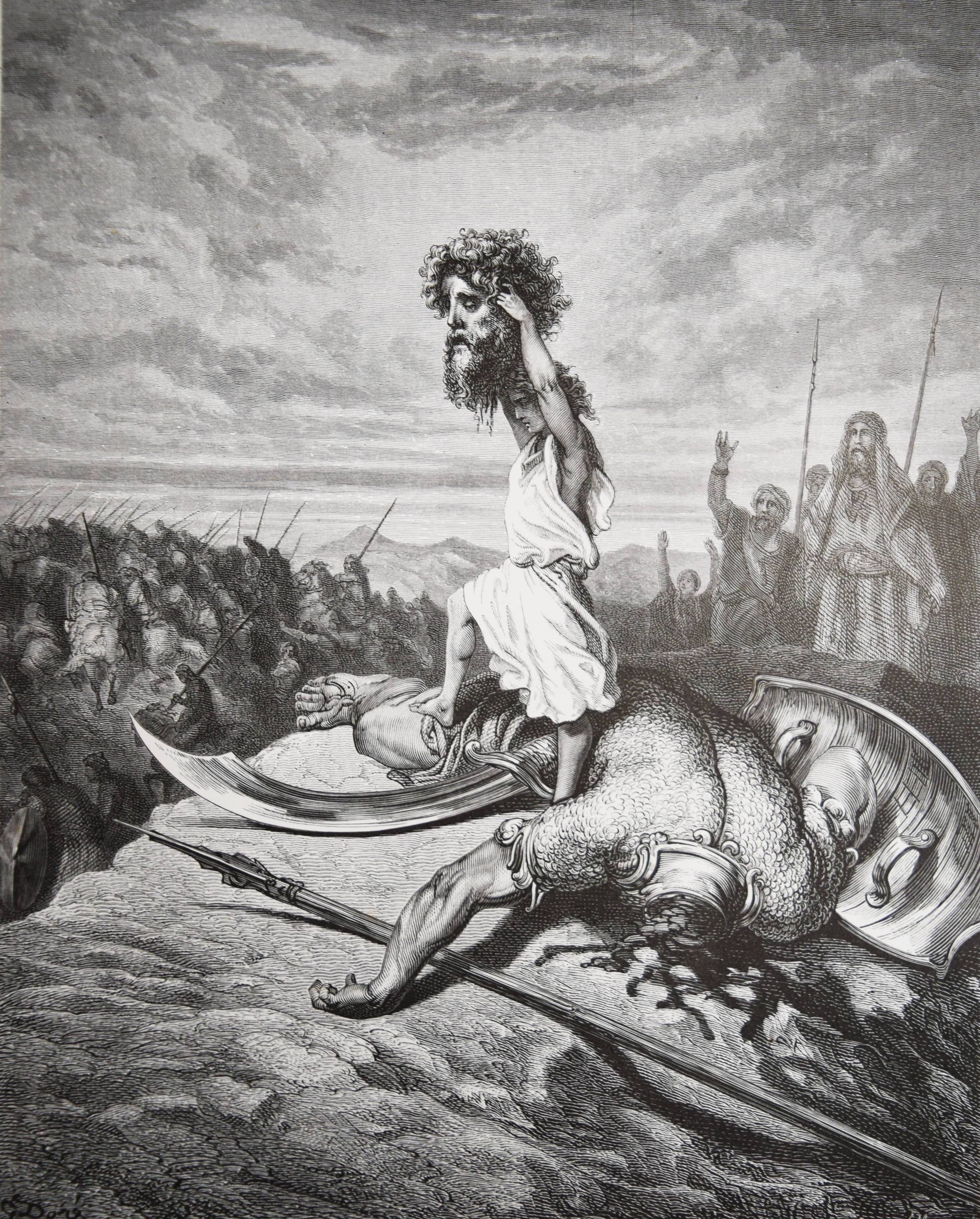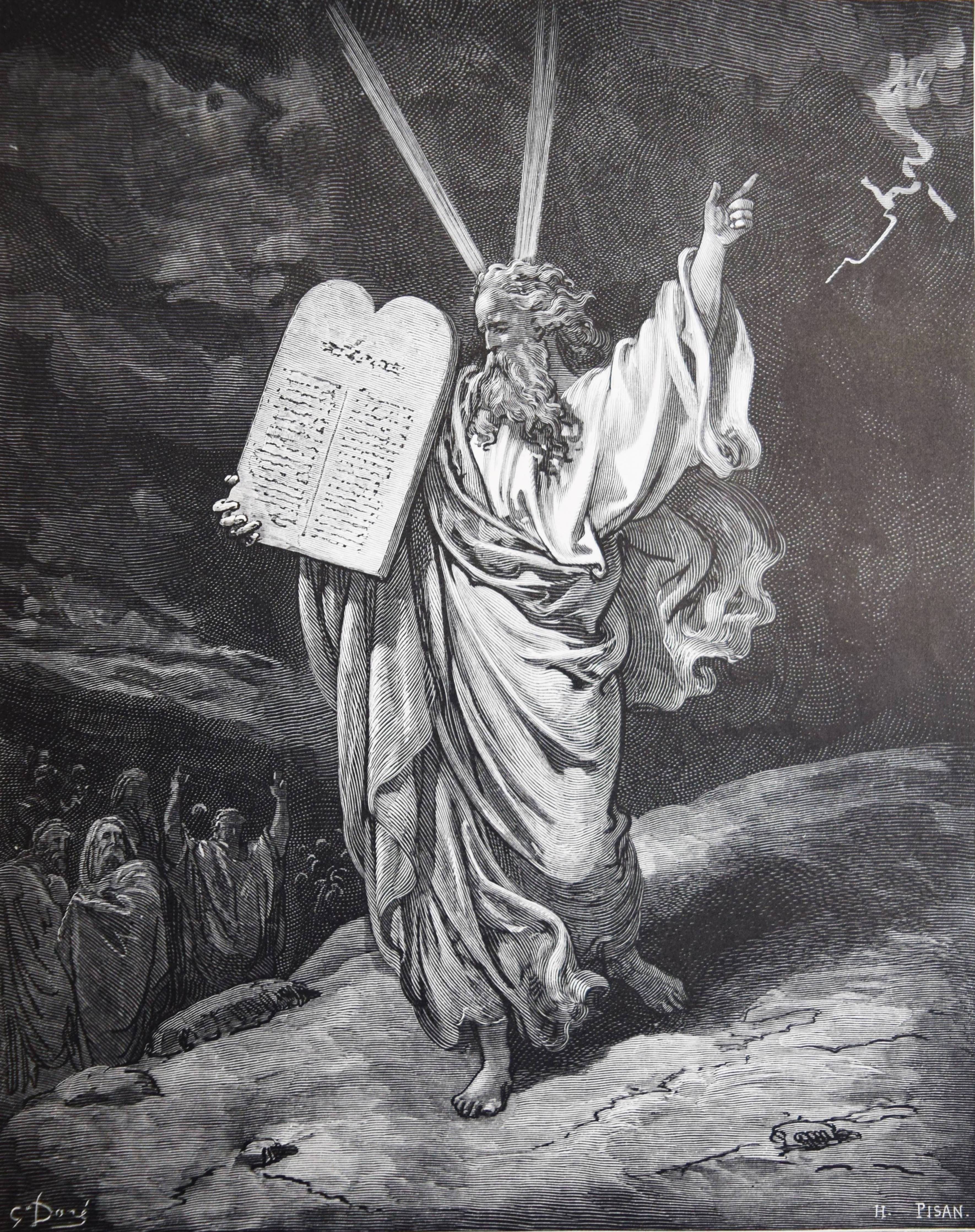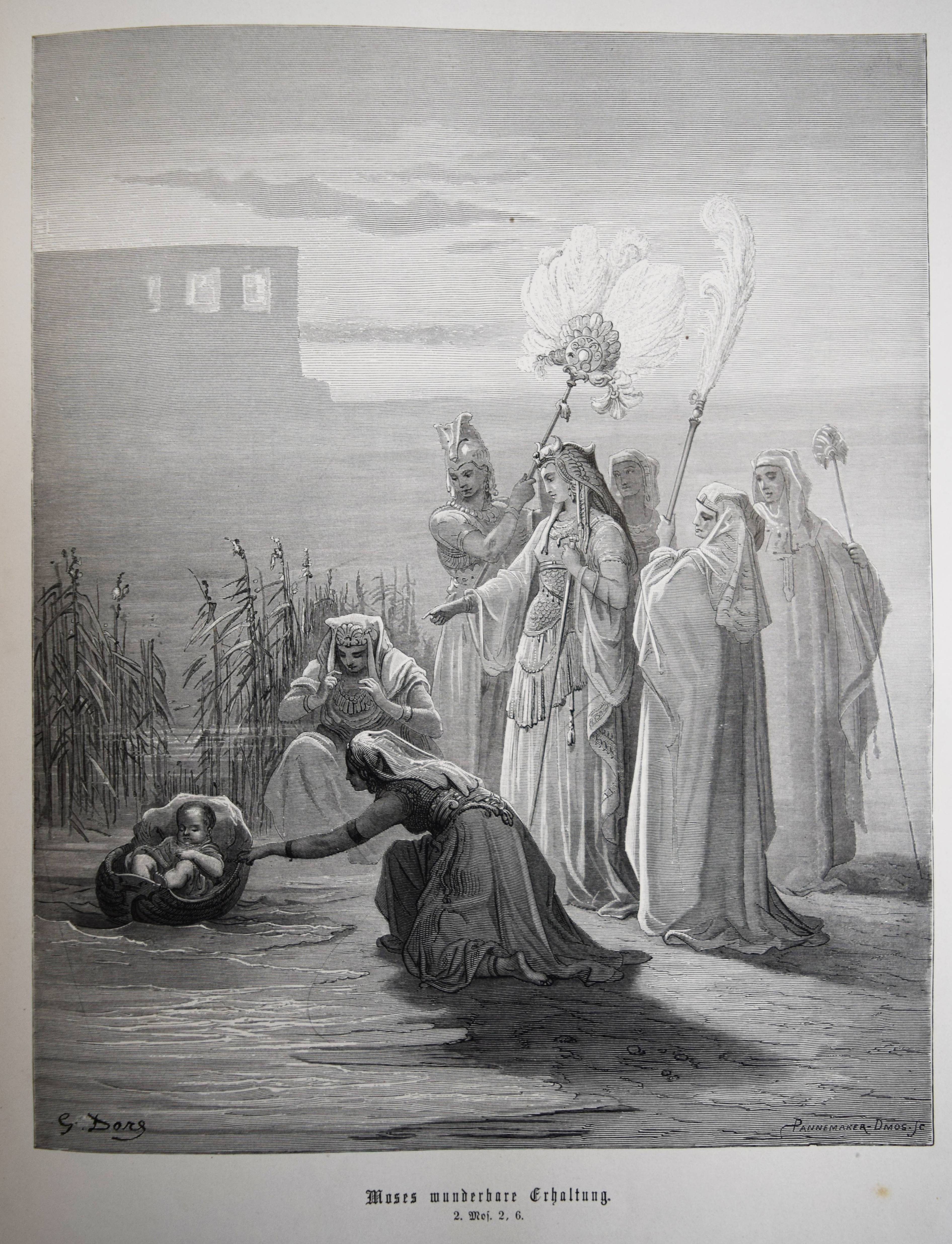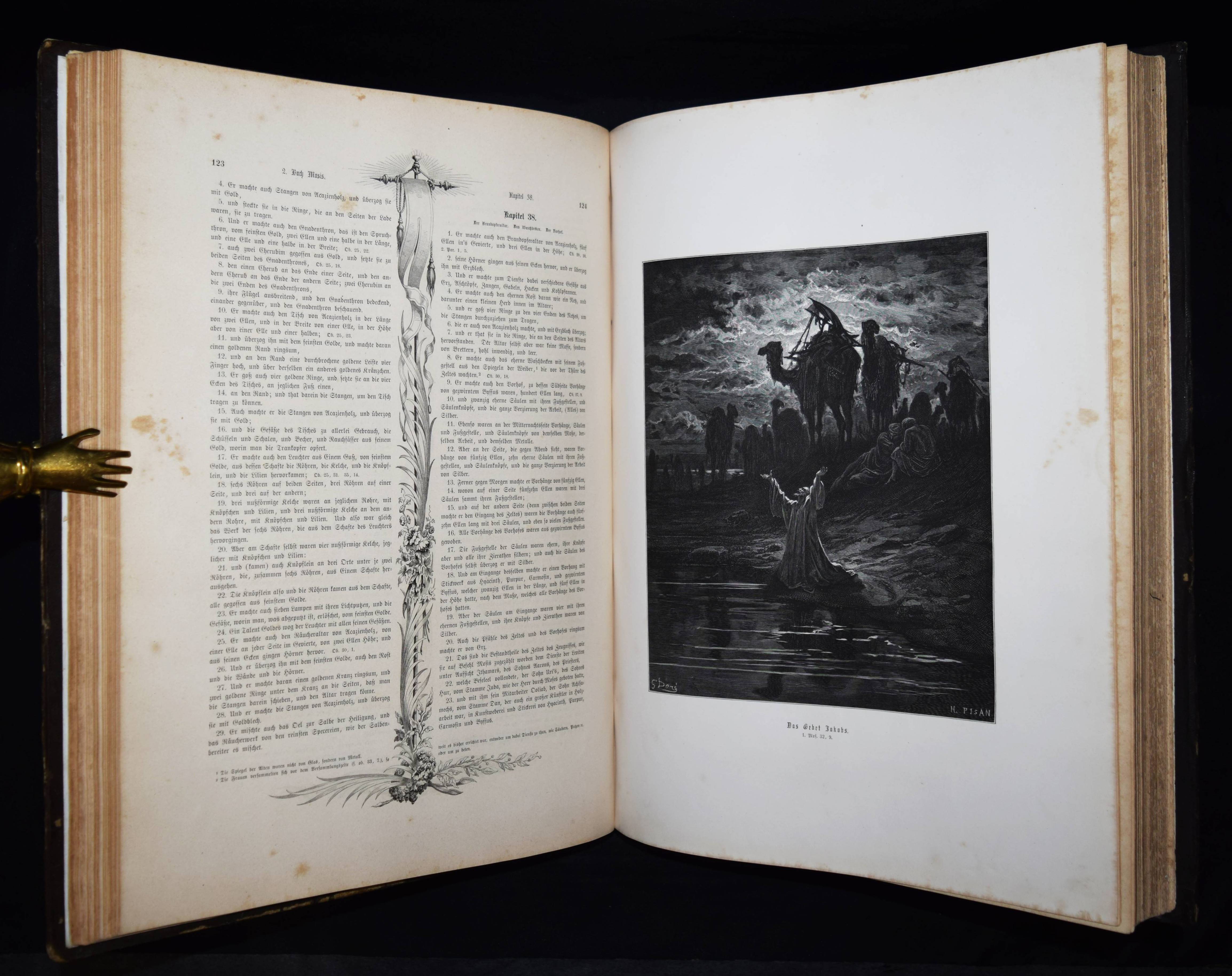 Biblia Germanica – Die Heilige Schrift. Alten und Neuen Testaments. Aus der Vulgata übersetzt von Dr. Joseph Franz von Allioli. Enthaltend den vom apostolischen Stuhle approbirten vollständigen Text und eine aus den Anmerkungen des größeren Allioli’schen Bibelwerks von dem Verfasser selbst besorgte abgekürzte Erläuterung jenes Textes. Pracht-Ausgabe mit zweihundert und dreissig Bildern. 6. Aufl. 2 Bände. Stuttgart, Leipzig, Berlin, Wien, Deutsche Verlags-Anstalt (1887). Folio (42,5 x 33 cm.). [13] Bl., XVI, 834 Sp.; [4] Bl., Sp. 835-1252, 356 Sp. mit 230 ganzs. Holzstich-Illustrationen und Buchschmuck von Gustave Dore. Orig.-Halblederbände mit Rückenvergoldung und goldgeprägtem Rücken- und Deckeltitel. „Die Bilderbibel von Gustave Doré (1832-1883) erschien mit 230 Illustrationen 1866 in französischer Erstausgabe und wurde zu einem durchschlagenden Erfolg. Trotz hoher Kosten war die erste Auflage innerhalb weniger Tage vergriffen. … Doré soll den Wunsch geäußert haben, die gesamte Weltliteratur zu illustrieren. … Die Illustrationen und vor allem die Motivwahl von Doré stellen etwas völlig Neues in der Geschichte der Bibel-Illustrationen dar. So bevorzugt Doré dramatische Geschichten. Häufig finden sich Massenszenen sowie Schlachtszenarien. Auch orientalisch anmutende Prunkarchitektur, u¨berladene Prachtgewänder und opulente Paläste sind deutlich häufiger anzutreffen als die karge Landschaft des Heiligen Landes. Generell sind die Bilder von Doré regelrecht bedrohlich und thematisieren häufig Tod, Leid und Bedrängnis. Ebenso wie die Bibel von Julius Schnorr von Carolsfeld beeinflusst die Bilderbibel von Gustave Doré durch die einprägsamen Illustrationen ganze Generationen und ihre Bildvorstellungen von den Geschichten der Heiligen Schrift. Im Gegensatz zu Schnorr von Carolsfeld steht bei Doré aber nicht die Vermittlung der biblischen Geschichten im Mittelpunkt, sondern vielmehr sollen seine atmosphärischen Geschichten ein Massenpublikum ansprechen“ (H. Strutwolf und J. Graefe, „Wohlauf lasst uns eine Stadt und einen Turm bauen“ Babel in der Bibel. Ausstellungskatalog zur Ausstellung im Bibelmuseum vom 25.8.2020 bis 15.11.2020). – Deckel etwas berieben, nur vereinzelt leicht braunfleckig, sehr gutes Exemplar.