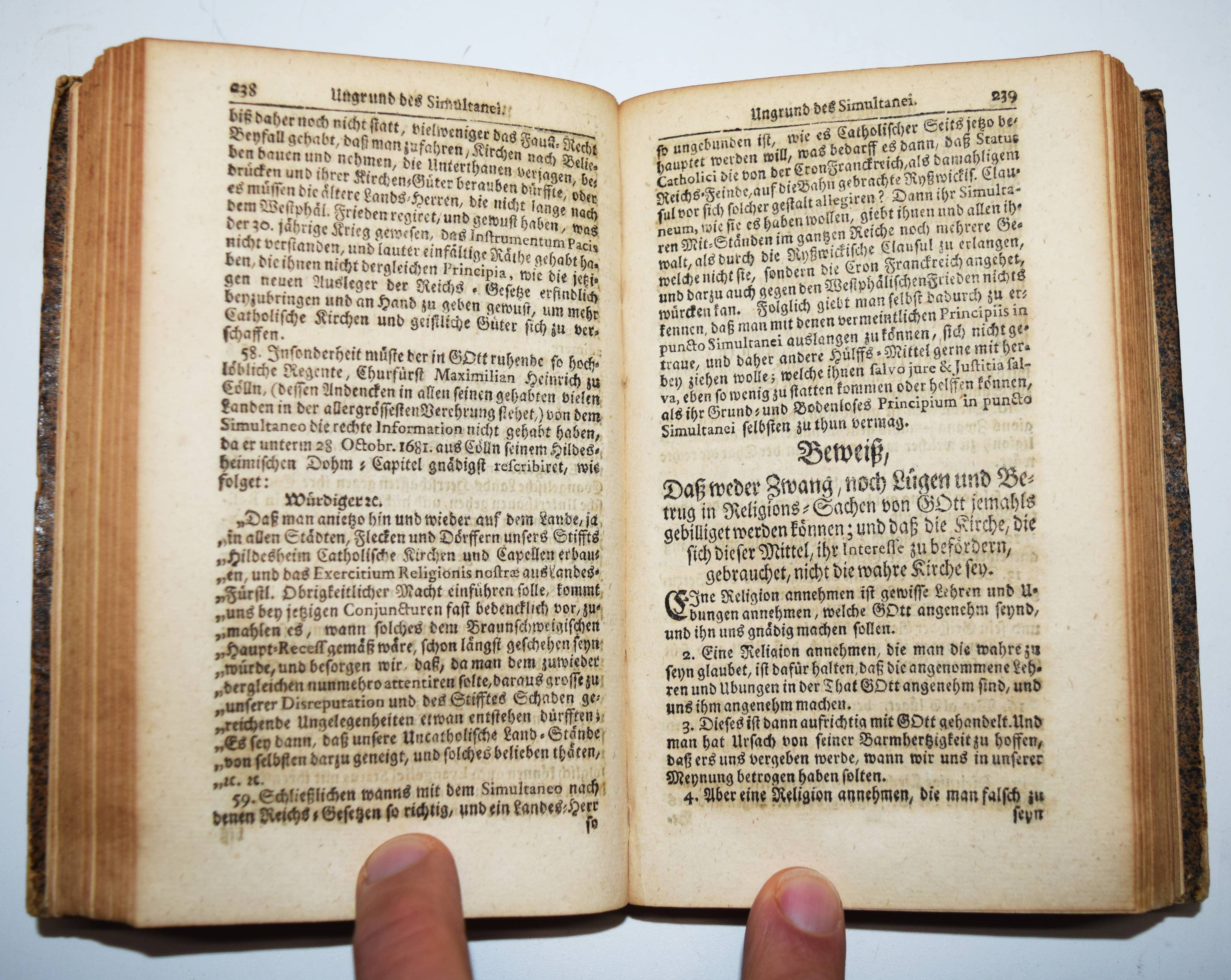 Hoffmann, Christian Gottfried. Gründliche Vorstellung Derer In dem Heil. Röm. Reiche Teutscher Nation Obschwebenden Religions-Beschwerden. In zwey Abtheilungen gefasset, Davon die Erste Nebst der Grund-Veste derer dreyen Religionen im Heiligen Römischen Reiche die vornehmsten principia derer streitigen Puncte … vorstellet: Die Andere Eine kurtze Erzehlung derer … erregten Gravaminum in sich hält … 2 Teile in 1 Band. Leipzig, Joh. Friedrich Gleditschens sel. Sohn 1722. 8°. [8] Bl., 553 S., [11] Bl. mit gestoch. Frontispiz. Pappband der Zeit mit handschr. Rückenschild. ADB XII, 574 f. VD18 10898824. – Erste Ausgabe. – Wichtige Arbeit des sächsischen Staatsrechtlers C. G. Hoffmann (1692-1735) der seit 1718 Professor für Natur- und Völkerrecht in Leipzig und später in Frankfurt an der Oder war. – Gelenke und Kanten berieben, durchgehend etwas gebräunt, sonst gut erhalten.