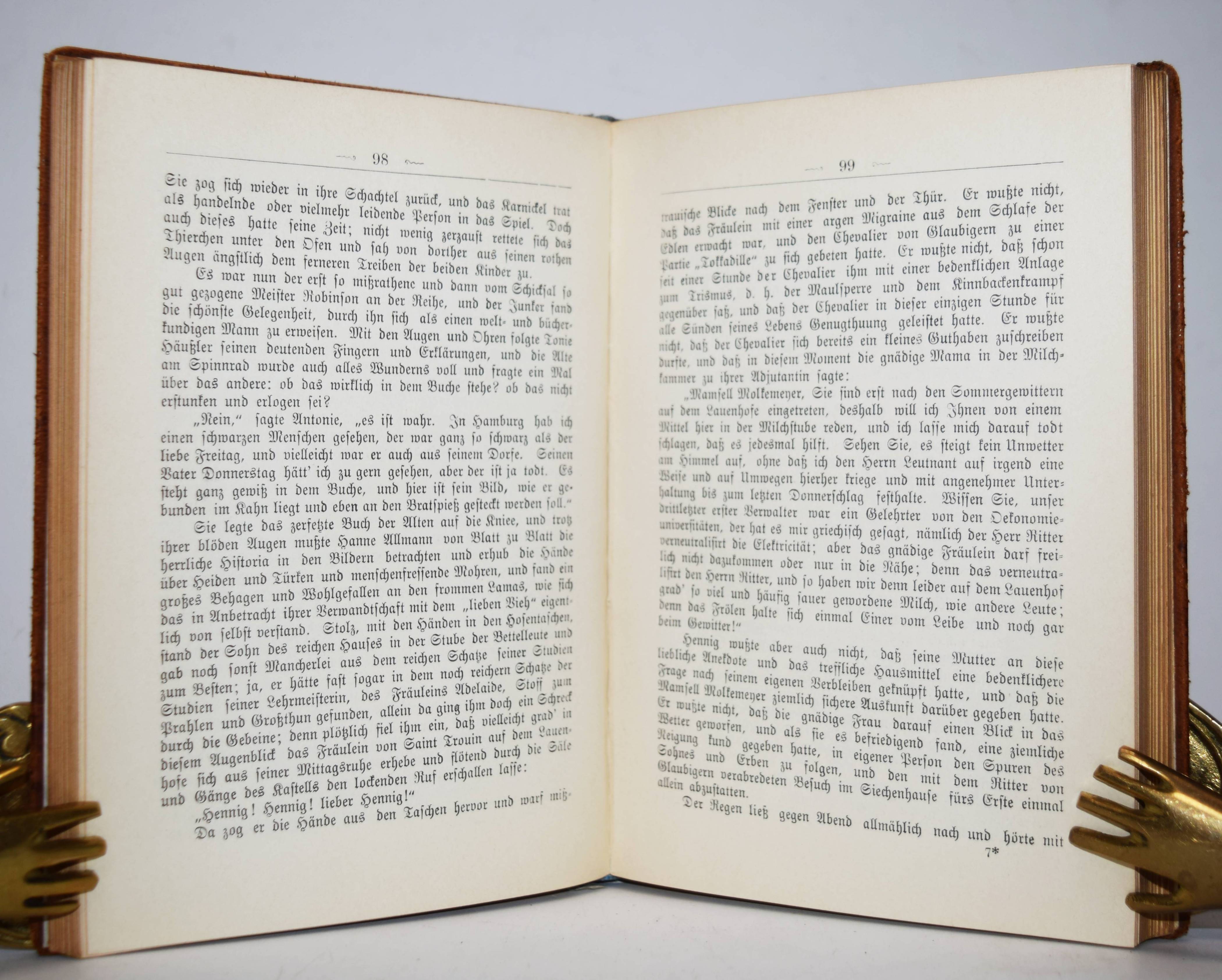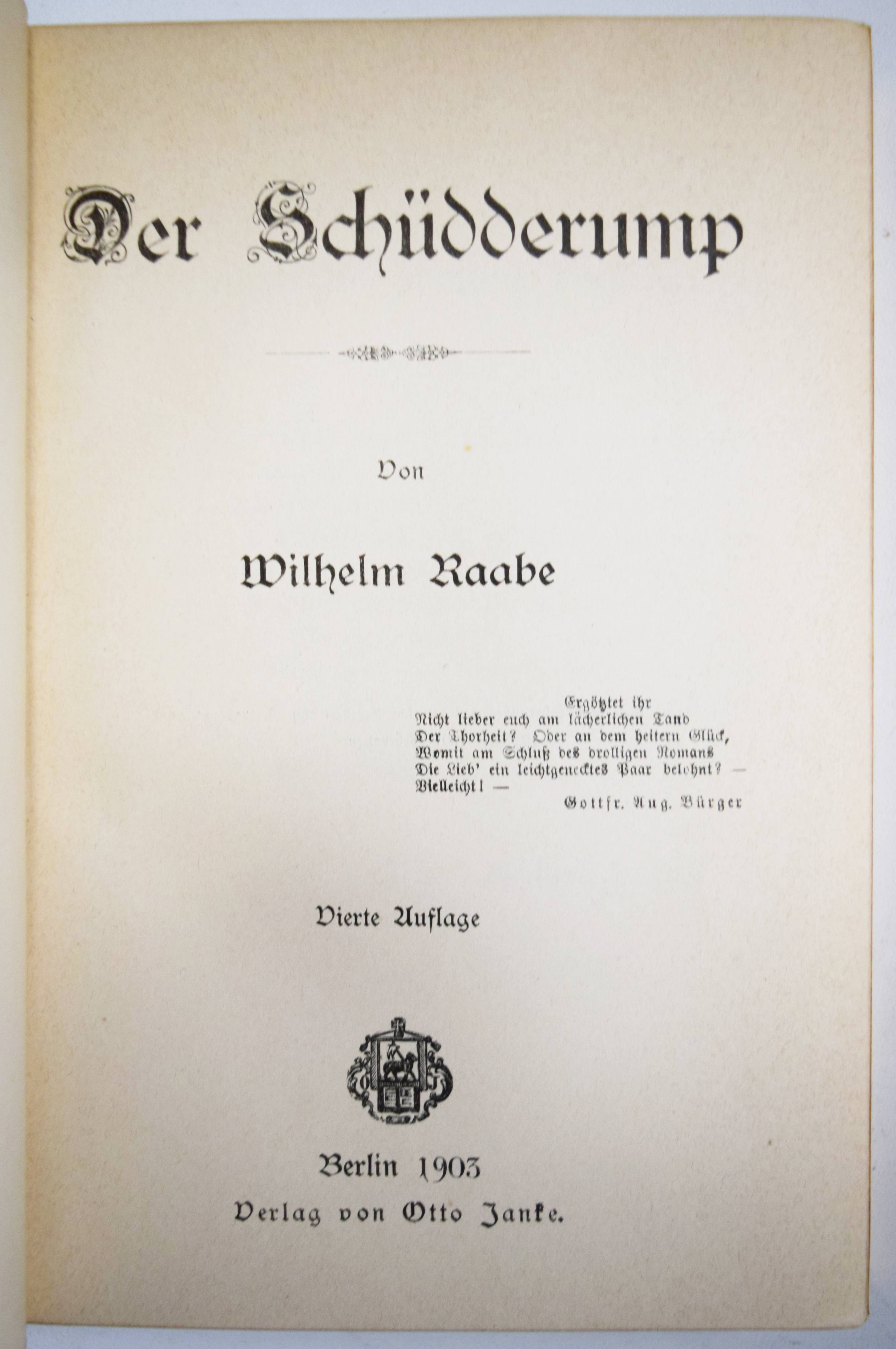 Raabe, Wilhelm. Der Schüdderump. 4. Aufl. Berlin, Otto Janke 1903. 8°. 334 S. Orig.-Kalbslederband mit goldgepr. Rückentitel, Jugendstil-Vergoldung und Goldschnitt. Der von 1867 bis 1869 entstandene Roman erschien zuerst Ende 1869 bei Westermann in Braunschweig. – Die schöne Antonie Häußler, Enkelin eines Dorfbarbiers, will unter keinen Umständen einen Adeligen heiraten. So verweigert sich das junge Mädchen beharrlich und stirbt lieber einen langsamen Tod. – Rücken etwas berieben, gutes Exemplar im dekorativen Jugendstil-Kalbslederband.