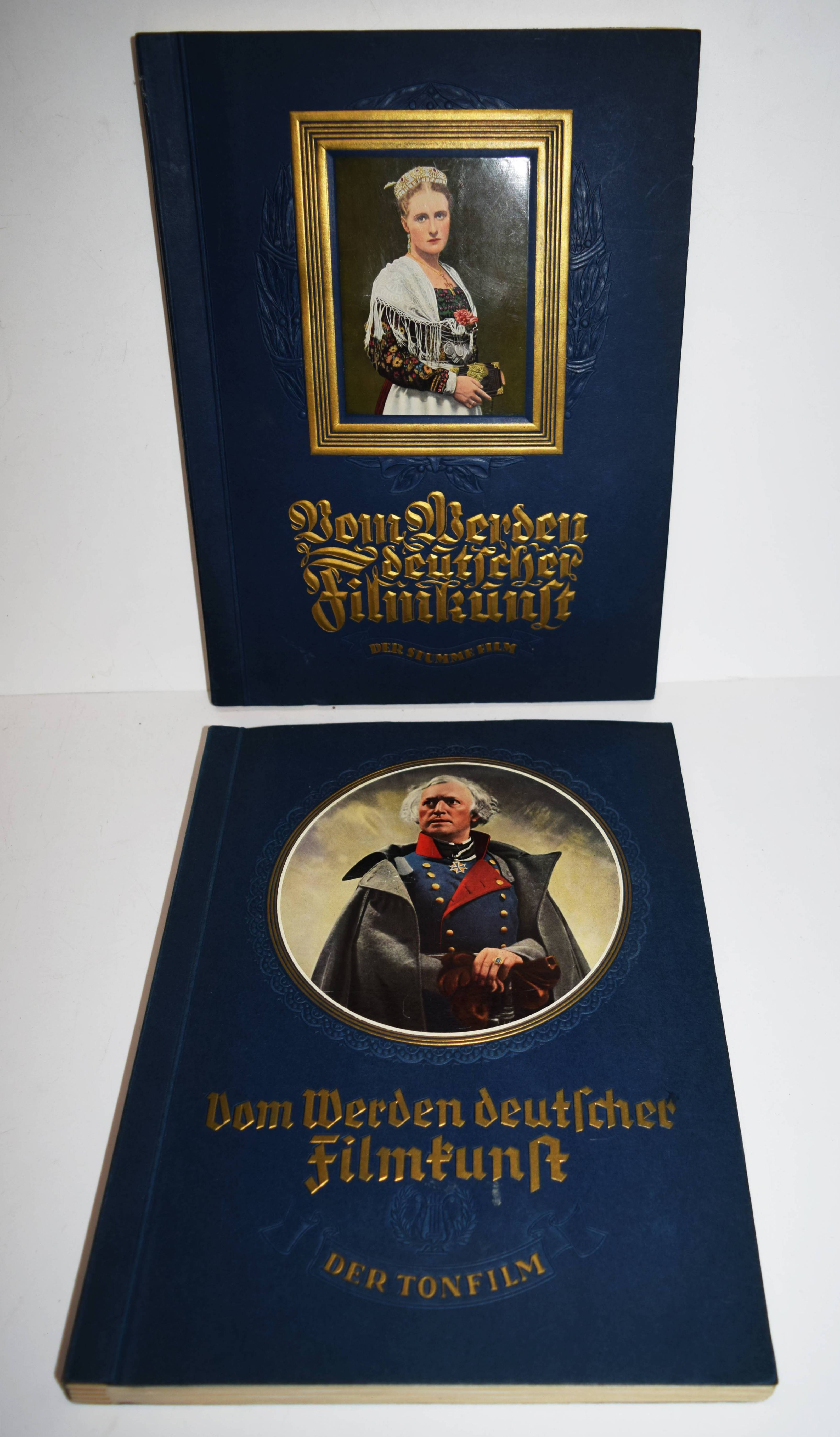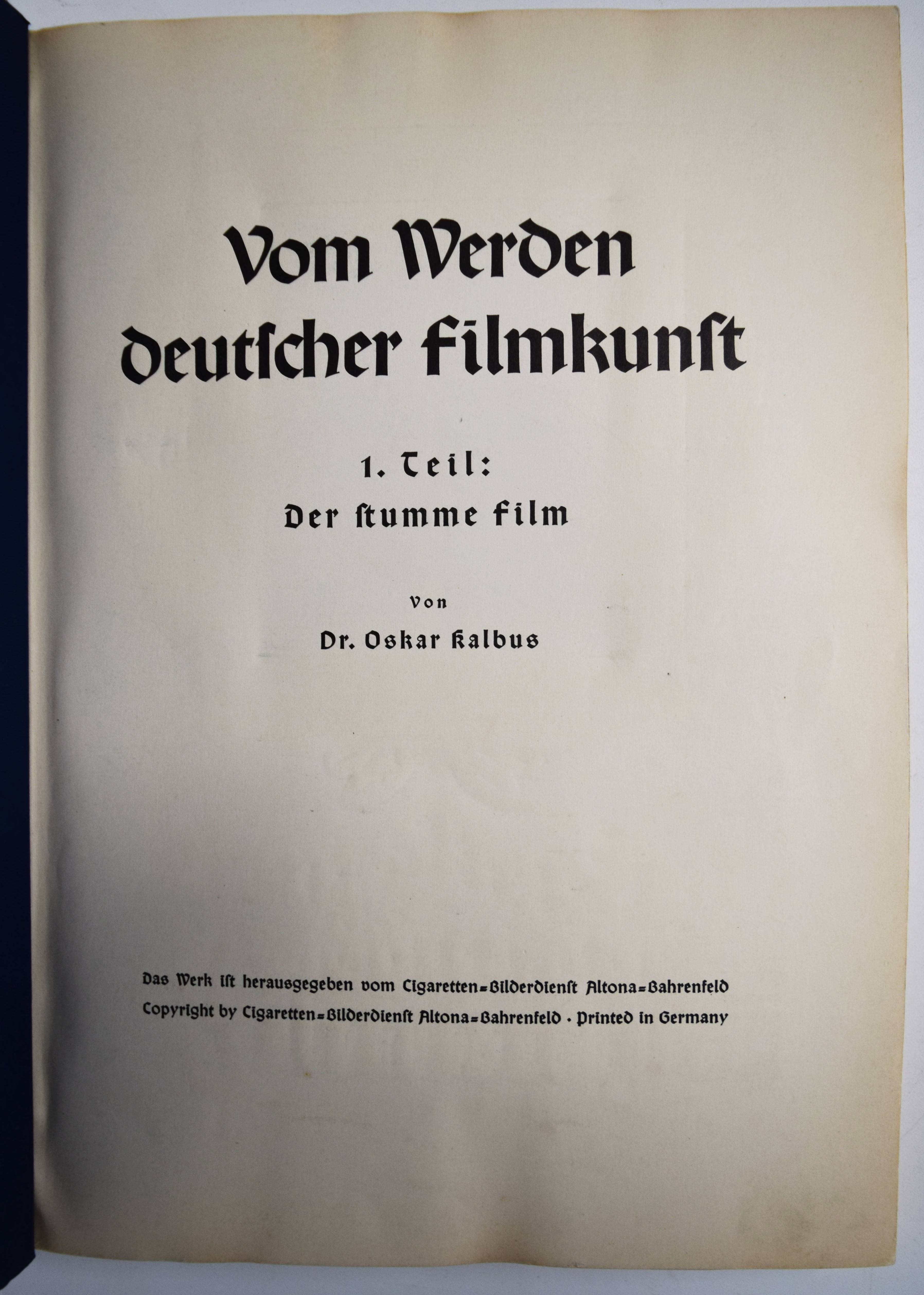 Kalbus, Oskar. Vom Werden deutscher Filmkunst. I. Der stumme Film. – II. Der Tonfilm. 2 Bände. Altona-Bahrenfeld, Cigaretten-Bilderdienst (1935). 4°. 136 S.; 136 S. mit 200 mont. Sammel-Bildern. Orig.-Pappbände mit goldgepr. Deckeltiteln und farbigen Deckelbildern. Sehr gutes vollständiges Exemplar.