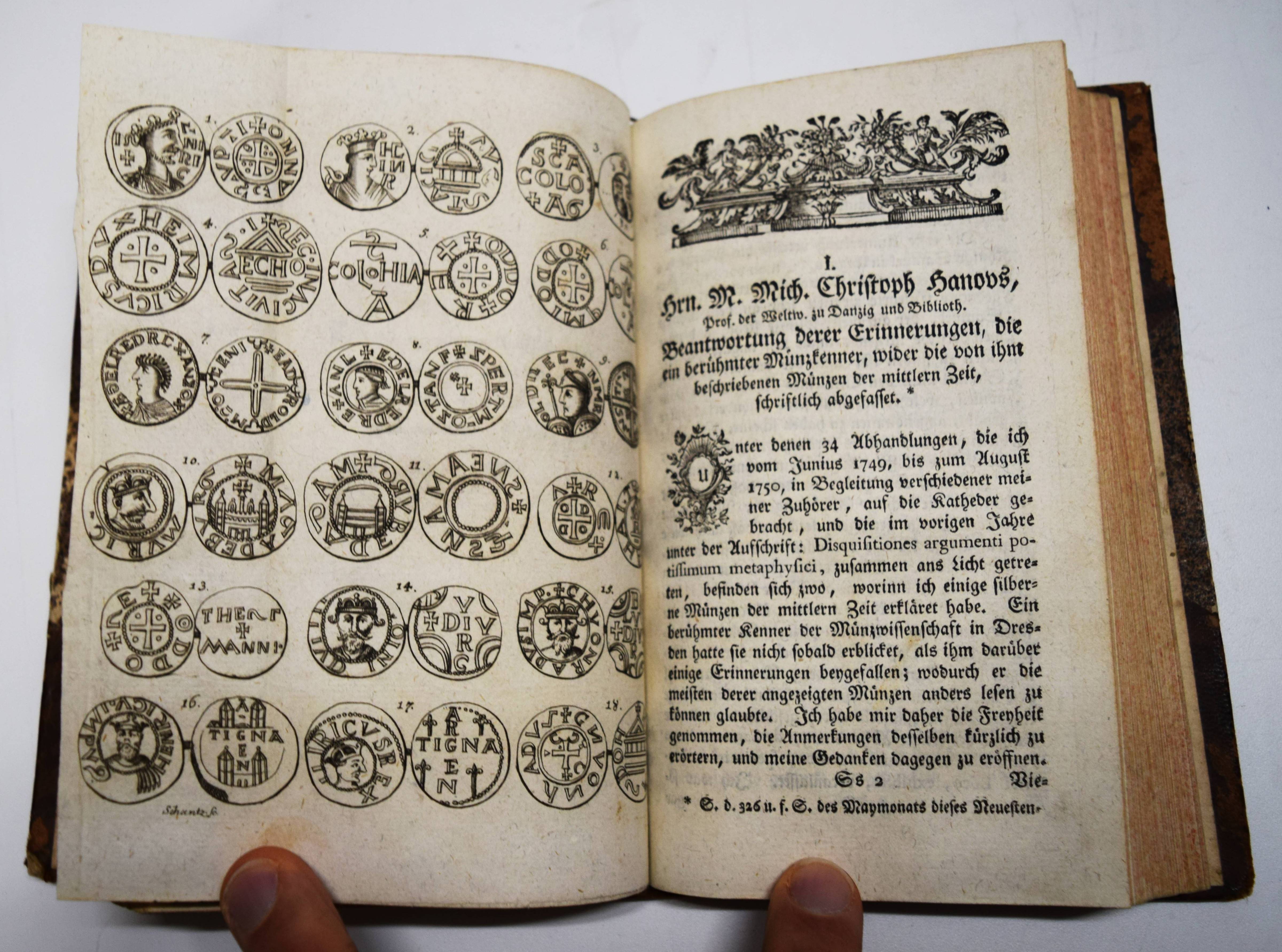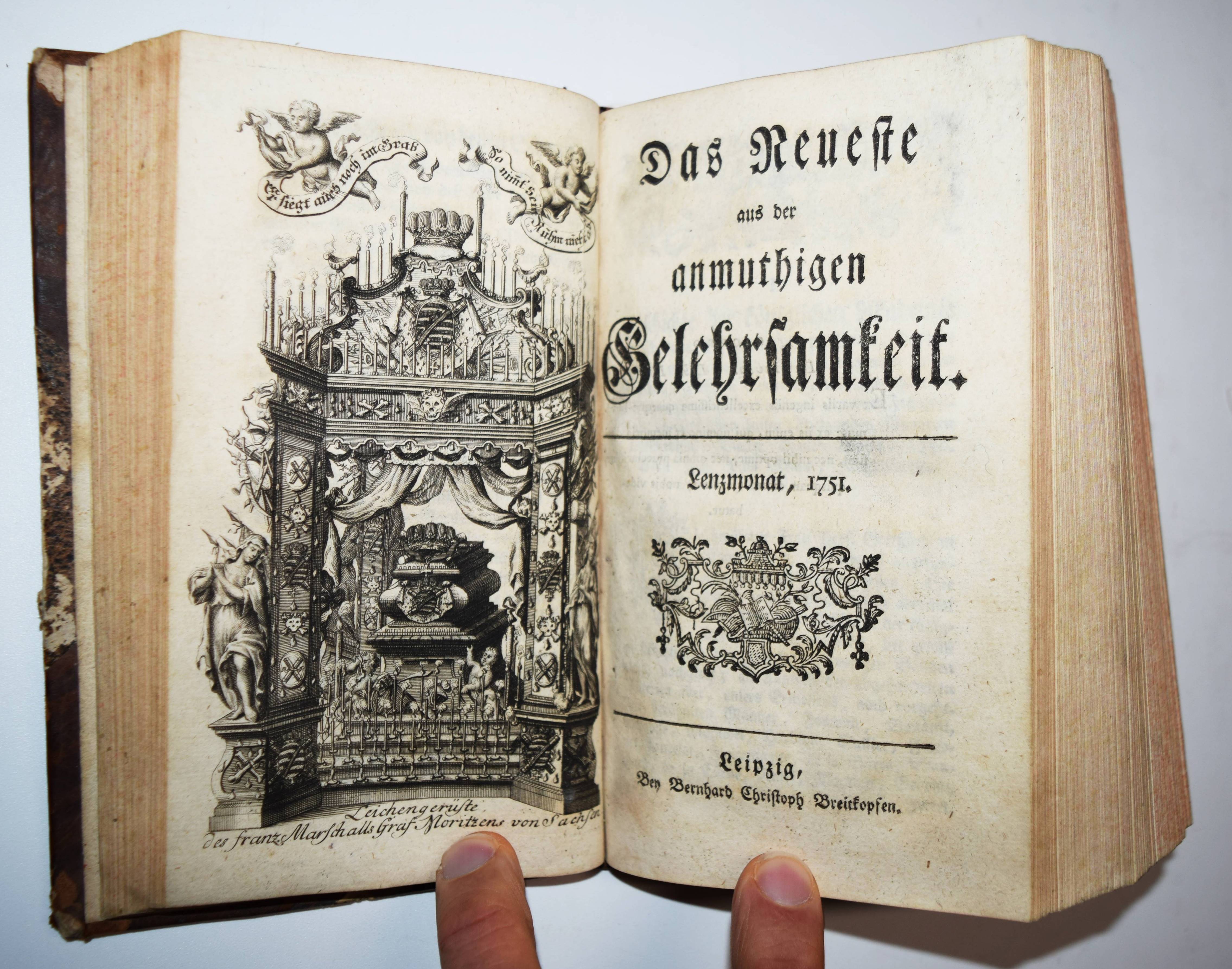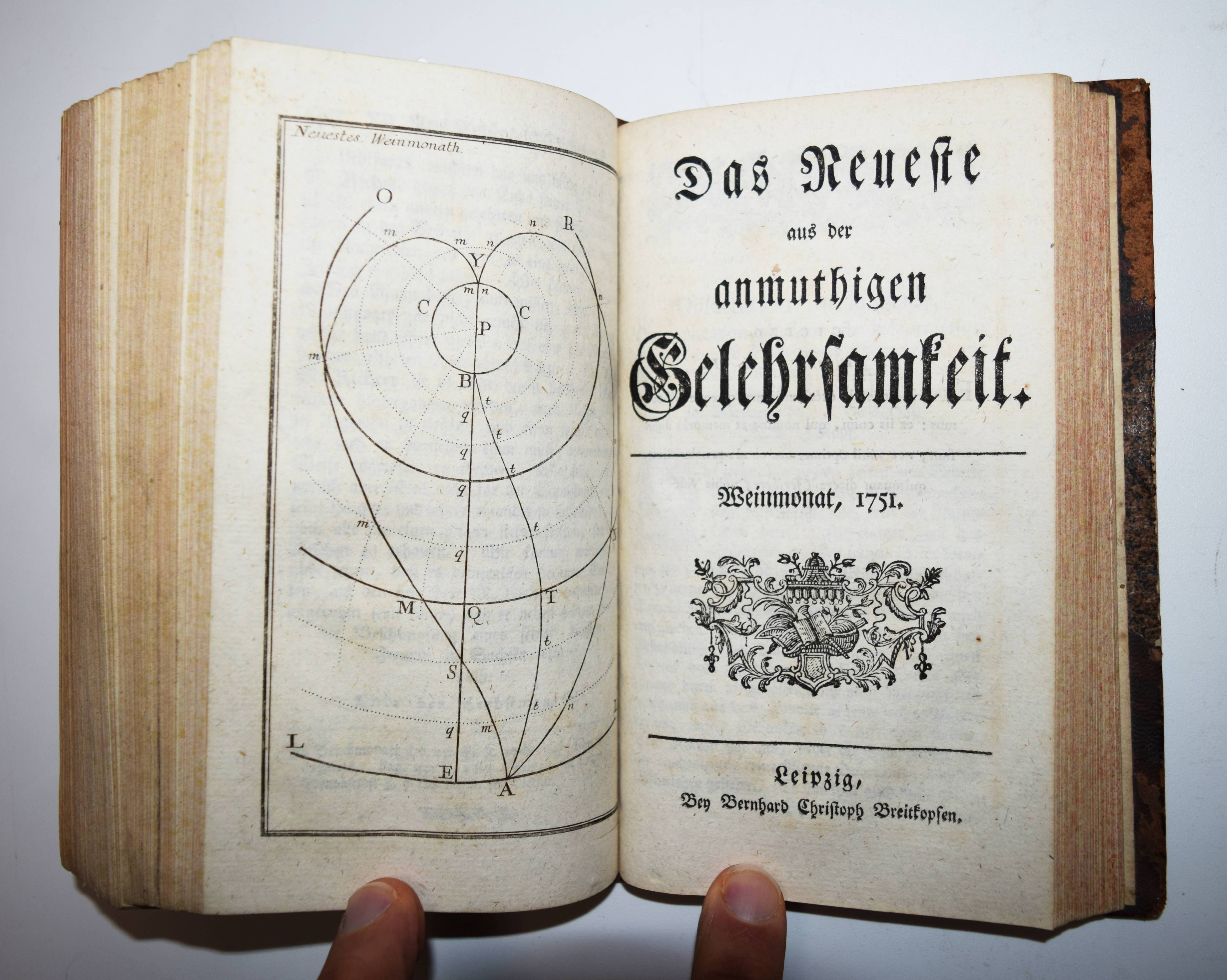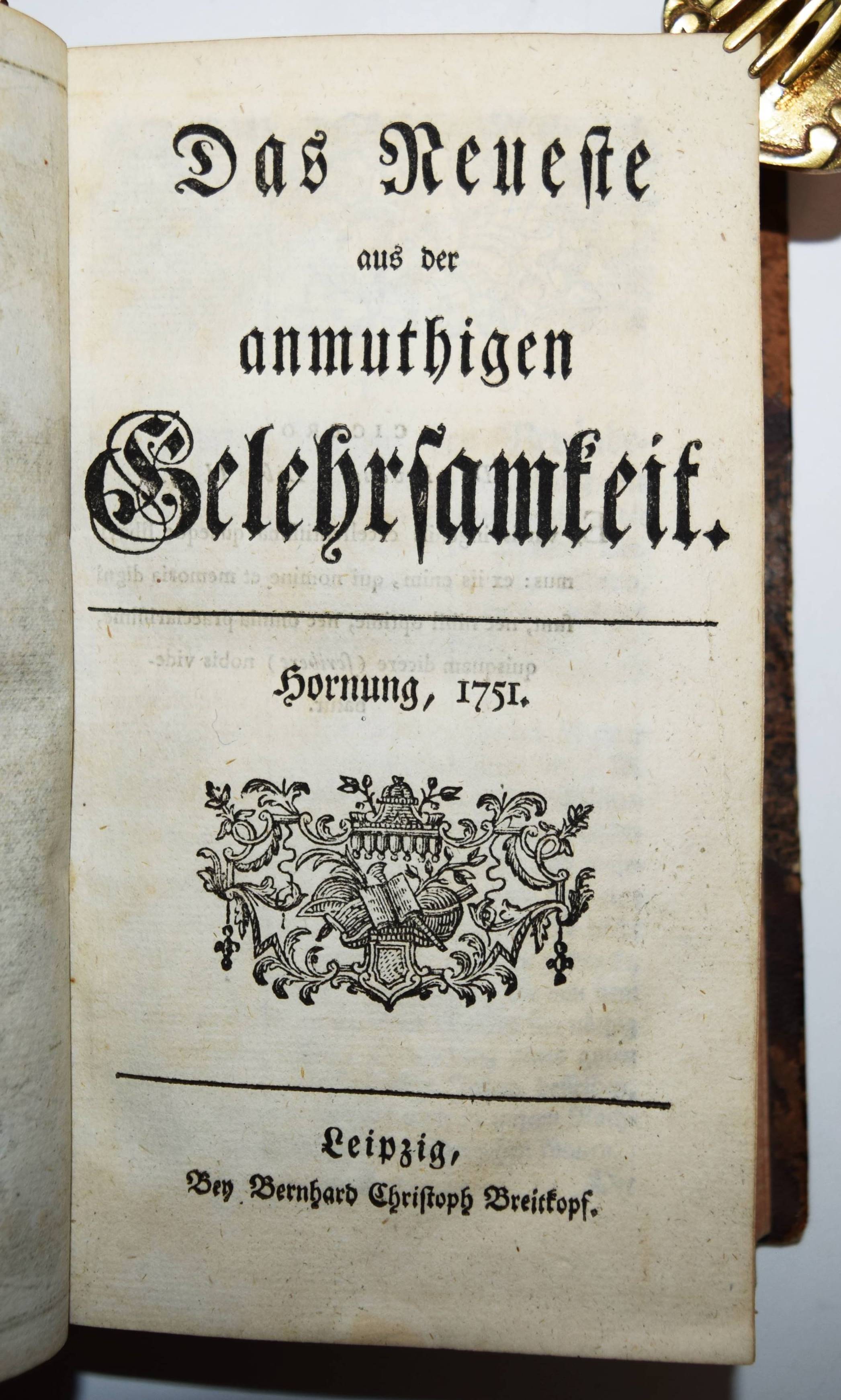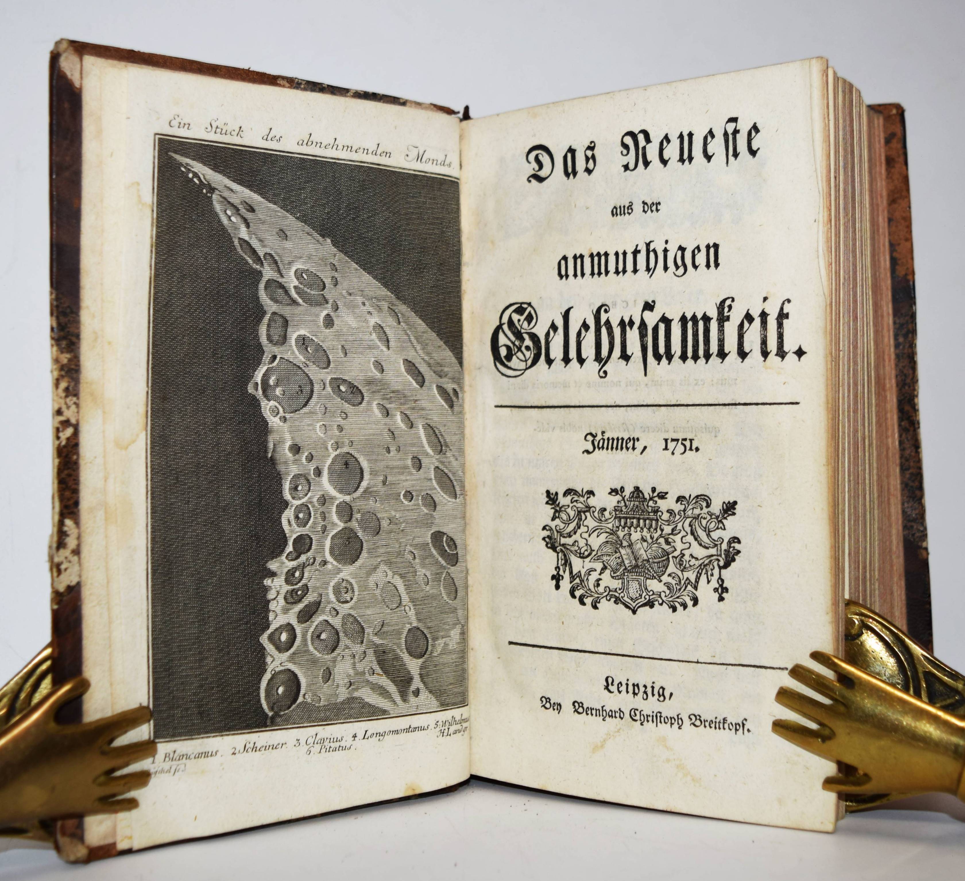 (Gottsched, Johann Christoph). Das Neueste aus der Anmuthigen Gelehrsamkeit. Jänner 1751 (bis) Christmonat 1751. 12 Hefte in 1 Band. Leipzig, Bernhard Christoph Breitkopf 1751. 8°. 912 S., [8] Bl. mit 12 (1 gefalt., 1 doppelblattgr.) Kupfertafeln. Halblederband der Zeit. Diesch 630. Kirchner, Grundlagen 1030. Seebaß/Edelmann I, 332. – Vollständiger erster Jahrgang der kritischen Barock-Zeitschrift; herausgeben von J. G. Gottsched (1700-1766), der auch die meisten Artikel selbst verfasste. Die Zeitschrift erschien bis 1762. – „Die in der Mitte des 18. Jhdts. erschienenen literarischen Journale spiegeln die großen Spannungen und den sich vorbereitenden politischen und kulturellen Umbruch wieder. Die Auseinandersetzungen zwischen Gottsched und den Schweizern Bodmer und Breitinger auf dem Gebiete der dichterischen Ästhetik waren mehr als ein Professorenstreit, hier standen sich zwei Welten gegenüber, und eine neue Epoche kündigt sich an“ (Kirchner, Das deutsche Zeitungswesen S. 149). – Die Kupfertafeln zeigen „Ein Stück des abnehmenden Monds“, das „Leichengerüste des franz. Marschalls Graf Moritzens von Sachsen“, „Abbildung eines silbernen Schildes Hanibals, so man in Dauphiné gefunden“, Münzen und anderes. – Rücken und Deckel stellenweise mit Abriebstellen, sonst sehr gut erhalten.