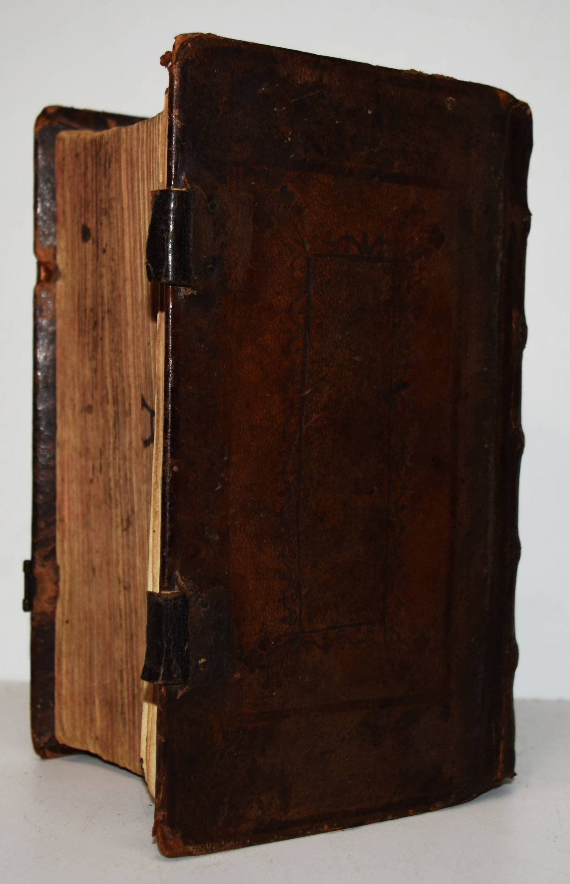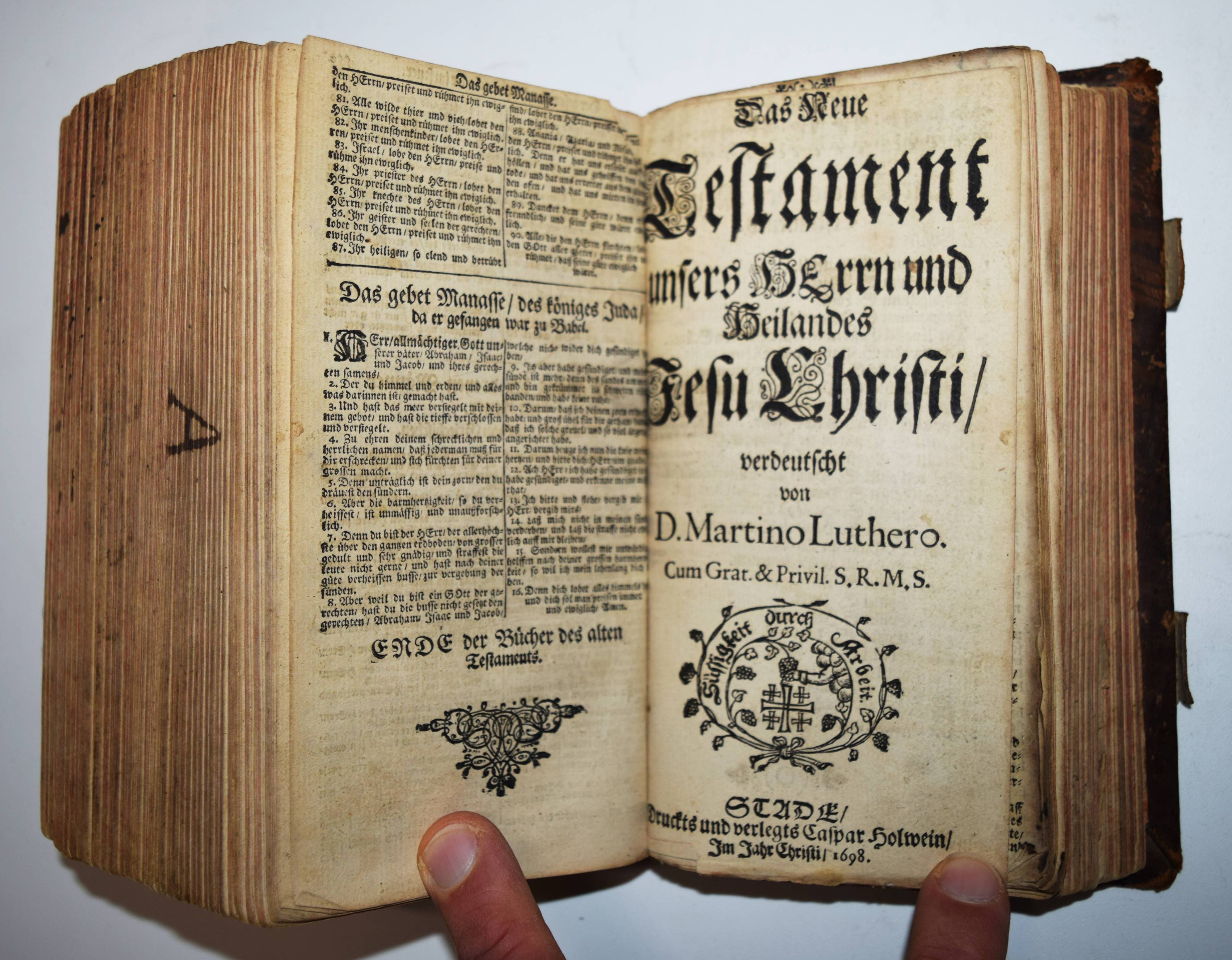 Biblia Germanica – Luther, Martin (Übersetzung). Biblia, Das ist: Die gantze Heil. Schrifft Altes und Neues Testaments. Und mit kurtzen Summarien und Concordantien, auch ordentlicher Anweisung zum Sonn- und Fest-tägigen Gebrauch nützlich zugerichtet … Nebst … Vorrede Johannis Dieckmanns. Und angehengtem kurtzen Gebet- und Gesang-Buche. Nunmehr auffs neue Und zwar zum andern mal … übersehen … und von … Fehlern gesaubert. 3 Teile in 1 Band. Stade, Caspar Holwein 1698. 8°. 48 (statt 51) S., 552, 163, [3] Bl., 72 S. Lederband der Zeit. Bibelslg. Württ. Landesbibl. E 1021. VD17 14:675510Y. Nicht bei Darlow-Moule. – „Taschenausgabe“ der seltenen norddeutschen Luther-Bibel. – Schließen fehlen, ohne das gestoch. Portrait Luthers und 2 Bl. (S. 49 ff.) der Vorrede, 3 Bl. (47 ff.) nach Bl. 59 eingebunden und mit Randläsuren (minimaler Textverlust), stellenweise im oberen und rechten Rand knapp beschnitten, sonst gut erhalten.