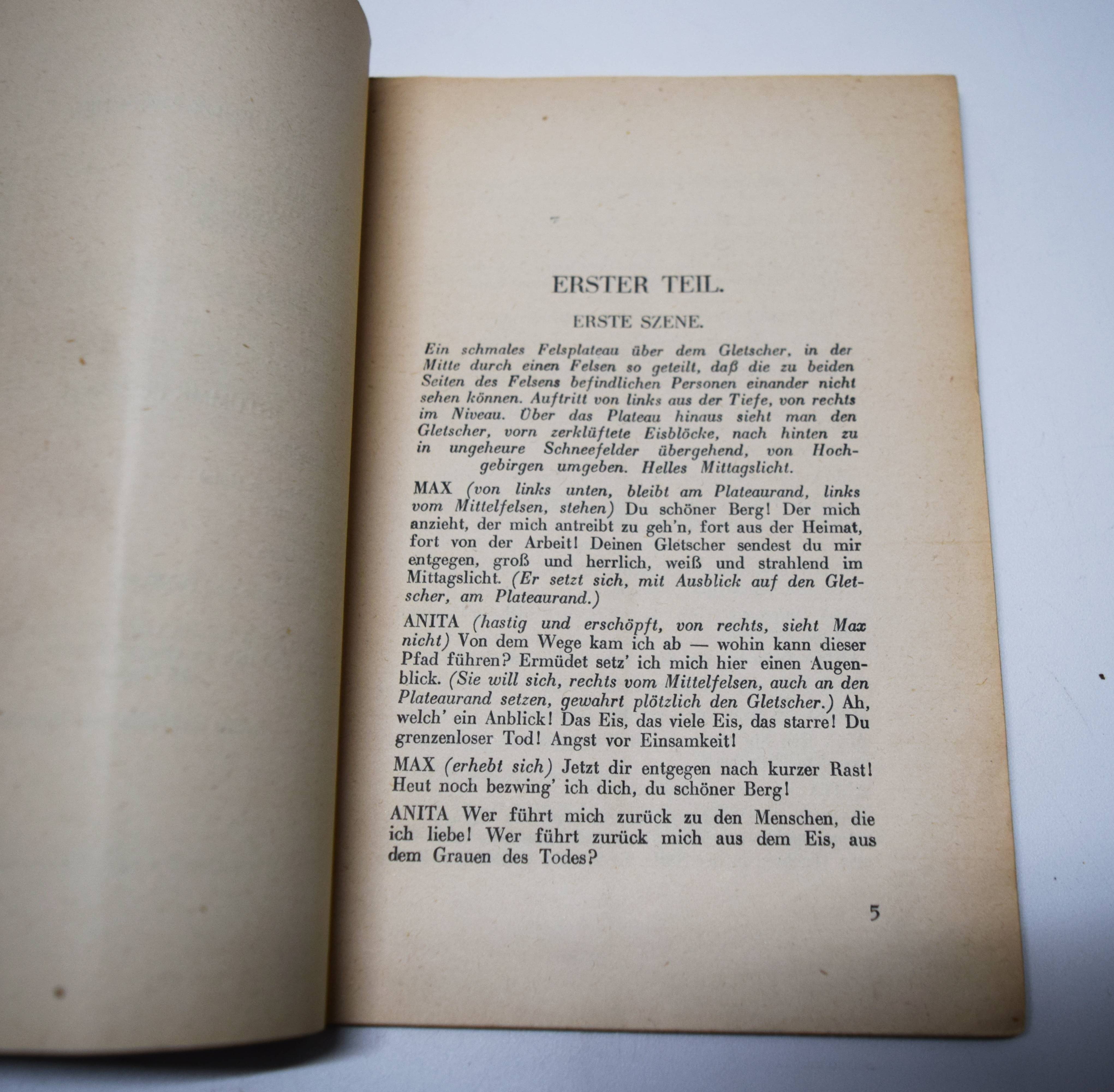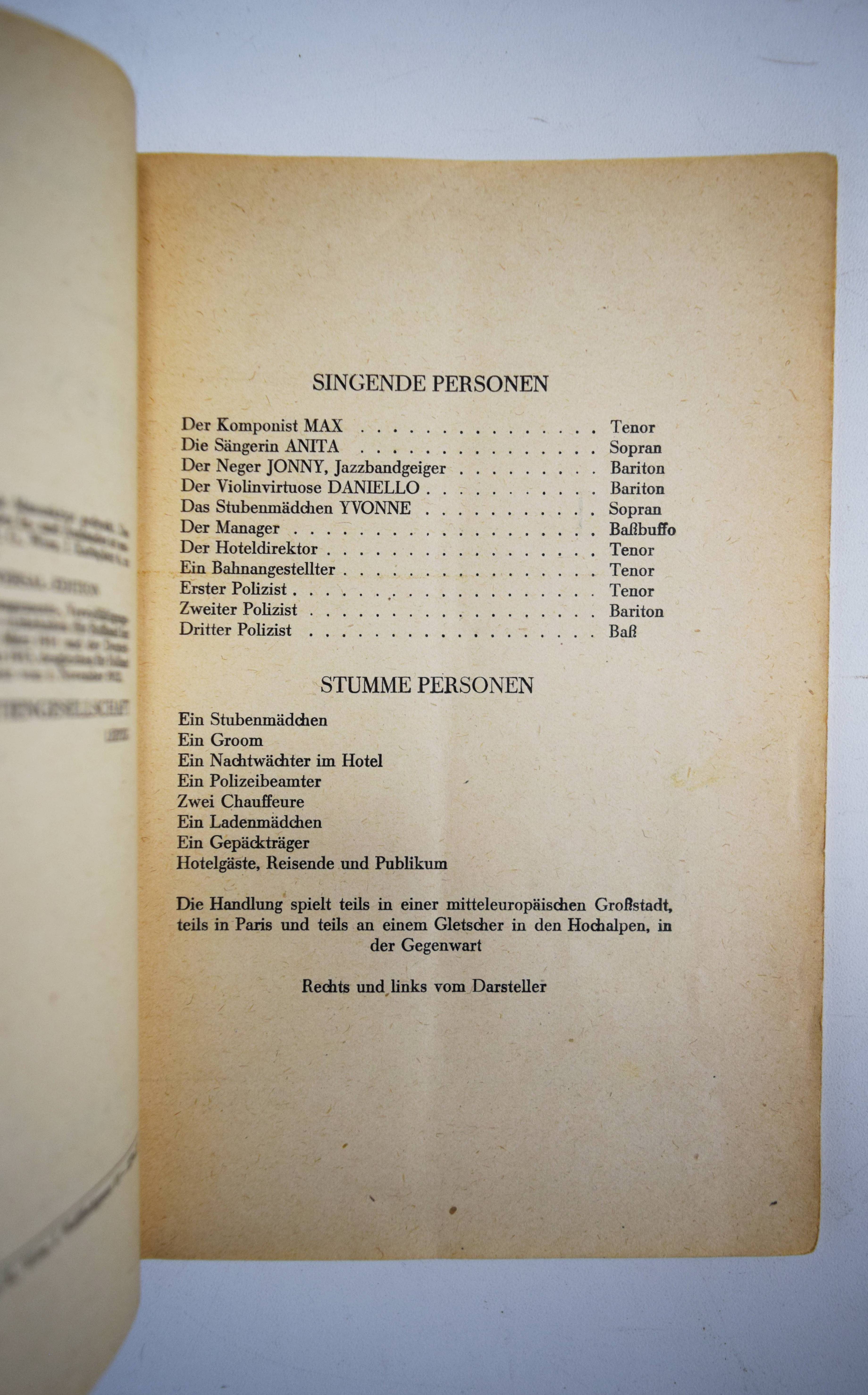 Krenek, Ernst. Jonny spielt auf. Oper in zwei Teilen. Op(us) 45. Wien, Leipzig, Universal-Edition 1926. 51, (1) S. Illustr. Orig.-Umschlag (Kammersänger Alfred Jerger als „Jonny“; Foto: (Georg) Fayer). (Verlags-Nr. 8622). Erste Ausgabe des seltenen Libretto, erschienen zur ersten Aufführung der Oper in Wien am 31. Dezember 1927. Die Uraufführung fand bereits am 10. Februar 1927 im Neuen Theater in Leipzig in der Inszenierung von Walther Brügmann statt. – Das Umschlag-Foto zeigt den Kammersänger Alfred Jerger (1889-1976) als Jonny mit Saxophon. Die ikonische Aufnahme diente als Vorlage einer Karikatur für den antisemitischen Katalog „Entartete Musik“ (Düsseldorf 1938). – Der Wiener Fotograf G. Fayer (1892-1950) „entstammte einer Fotografen-Dynastie, sein Großvater war Freund und Mitarbeiter von Louis Daguerre und eröffnete auf dessen Anraten (und mit dessen Unterstützung) ein erstes eigenes Fotostudio. … Über New York und London kam Georg Fayer in den 1920er Jahren nach Wien, wo er sich mit dem ehemaligen k. u. k. Hoffotografen Carl Pietzner junior zusammentat“ (Wikipedia). – Rücken mit Japanpapier überklebt, Umschlag etwas angestaubt, gutes Exemplar.