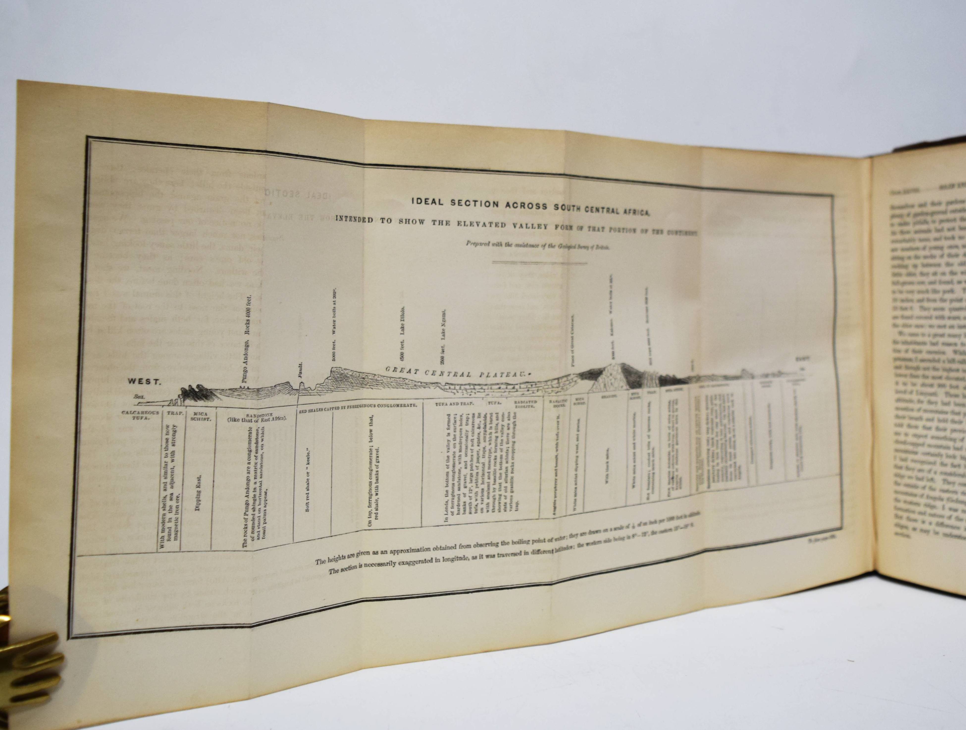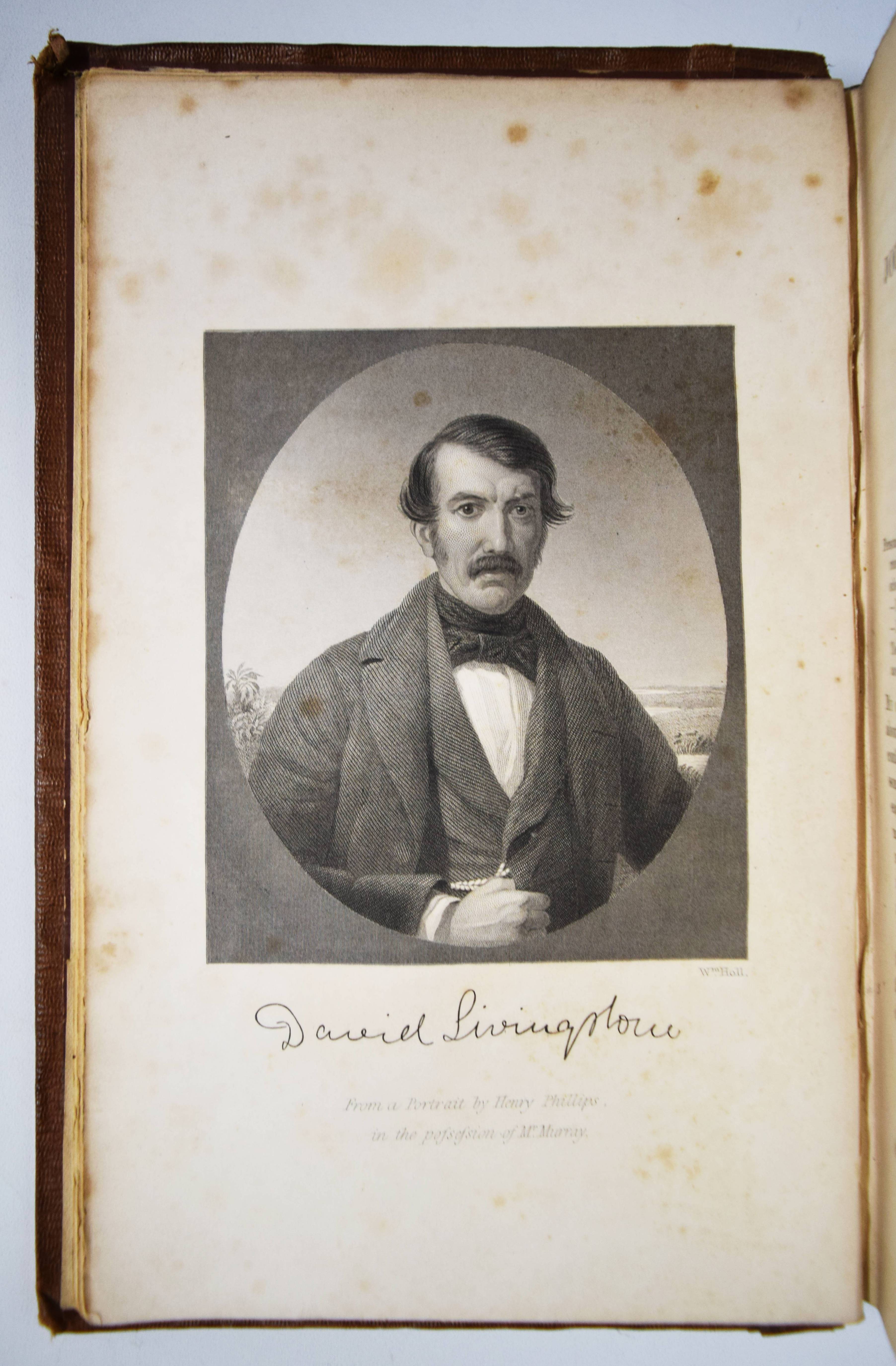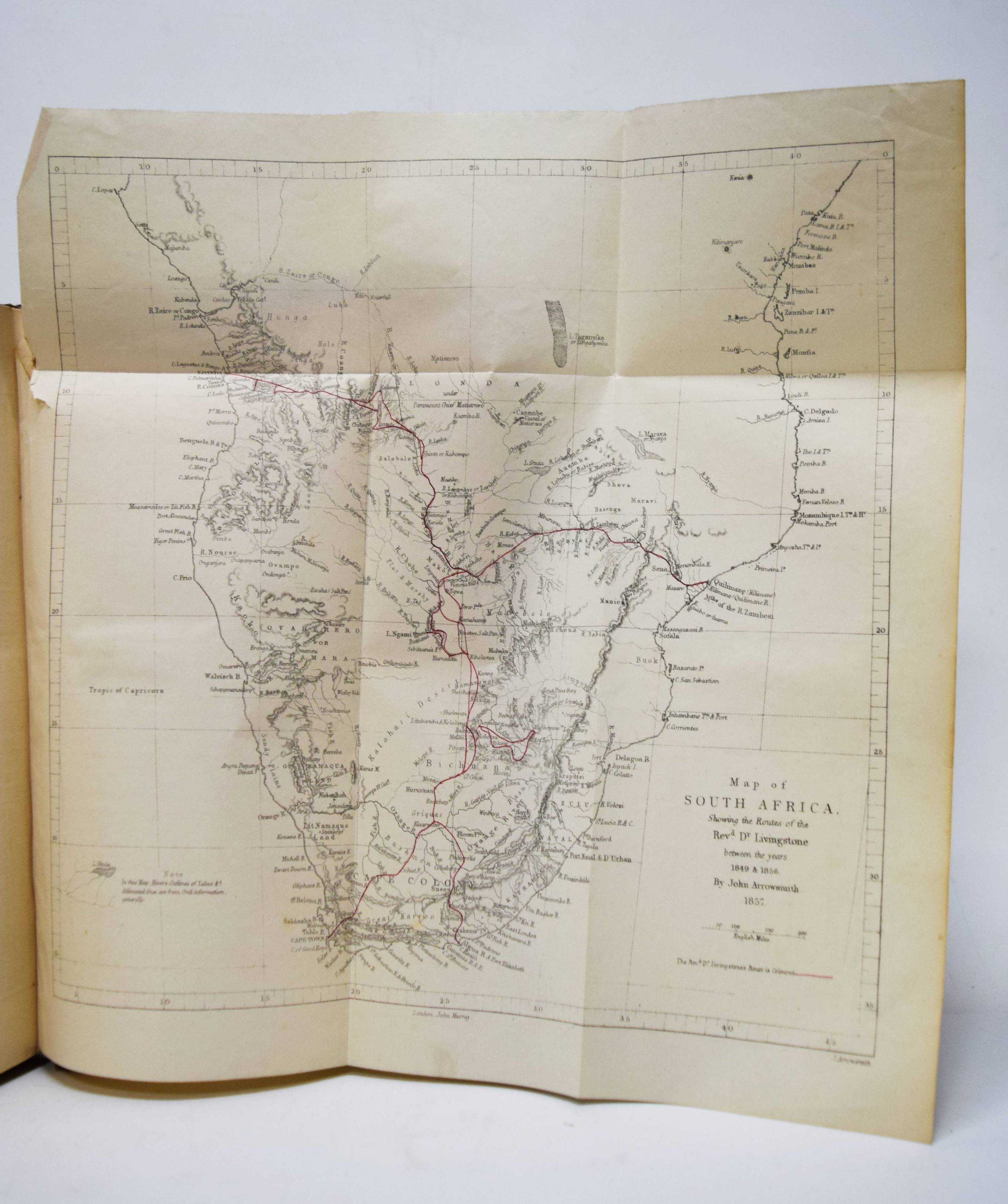 Livingstone, David. Missionary travels and researches in South Africa. Including a sketch of sixteen years’ residence in the interior of Africa, and a journey from the Cape of Good Hope to Loanda on the West Coast; thence across the continent, down the river Zambesi, to the Eastern Ocean. London, John Murray 1857. Gr.-8° (23 x 15,5 cm.). IX, 687, (1), 8 S. (Verlagswerbung dat. 1. Nov. 1857) mit gefalt. Holzstich-Frontispiz, gestoch. Portrait, zahlreichen Holzstichen im Text und auf (1 gefalt.) Tafeln, 2 gefalt. lithogr. Karten (davon 1 in Rückentasche) und 1 gefalt. lithogr. Plan (Höhenprofil). Bindgepr. Orig.-Leinenband mit goldgepr. Rückentitel. Abbey, Travel 347. Bradlow, Africana books and pictures 123. Embacher 190. Gay 3034. Henze III, 270. Mendelssohn III, 136. PMM 341 a. Vgl. Kainbacher 247 (deutsche Übersetzung). – Dritter Druck der ersten Ausgabe, bei der die beiden lithographierten Tafeln durch Holzstiche ersetzt wurden. 1857 erschienen mindestens acht Varianten. – Die wohl bedeutendste und berühmteste Reisebeschreibung über den afrikanischen Kontinent. – Livingstones erster großer zusammenfassender Bericht über seine Missionstätigkeit seit 1840 und die Durchquerung Südafrikas 1853-1856, die u. a. zur Entdeckung des Nigami-Sees, des Sambesi und der Viktoriafälle führte. – David Livingstone (1813-1873) „became a missionary and was sent to South Africa by the London Missionary Society in 1840. From then onwards his life was devoted to the exploration of central Africa. Although a missionaryhe regarded himself more as a pioneer explorer opening up the country for others. Livingstone’s services to African geography during thirty years are almost unequalled; he covered about a third of the continent from the Cape to the Equator and from the Atlantic to the Indian Ocean. He made three great expeditions; in 1853-6 (described in this book), 1858-64 and 1865-73, of which the first and third are the most important. During these years he explored vast regions of central Africa, many of which had never been seen by white men before. Hie first discovered the Zambesi River at Secheke and followed it northwards, eventually reaching the west coast of Africa at Luanda, Angola, and the east coast at Quelimane, Mozambique. In 1855 he discovered the great falls of the Zambesi and named them the Victoria Falls. He explored the Zambesi, Shire and Ruyuma rivers and found the salt lake Chilwa and Lake NyasaThe geographical results of his journeys were of supreme importance, and made it possible to fill in great stretches of the maps of Central Africa which hitherto had been blank“ (Carter/Muir, Printing and the Mind of Man). – Einband leicht berieben, sehr gutes sauberes Exemplar im seltenen Verlagseinband. – Third printing of the first edition, in which the two lithographed plates were replaced by wood engravings. – Binding slightly rubbed, very good clean copy in rare publisher’s binding.