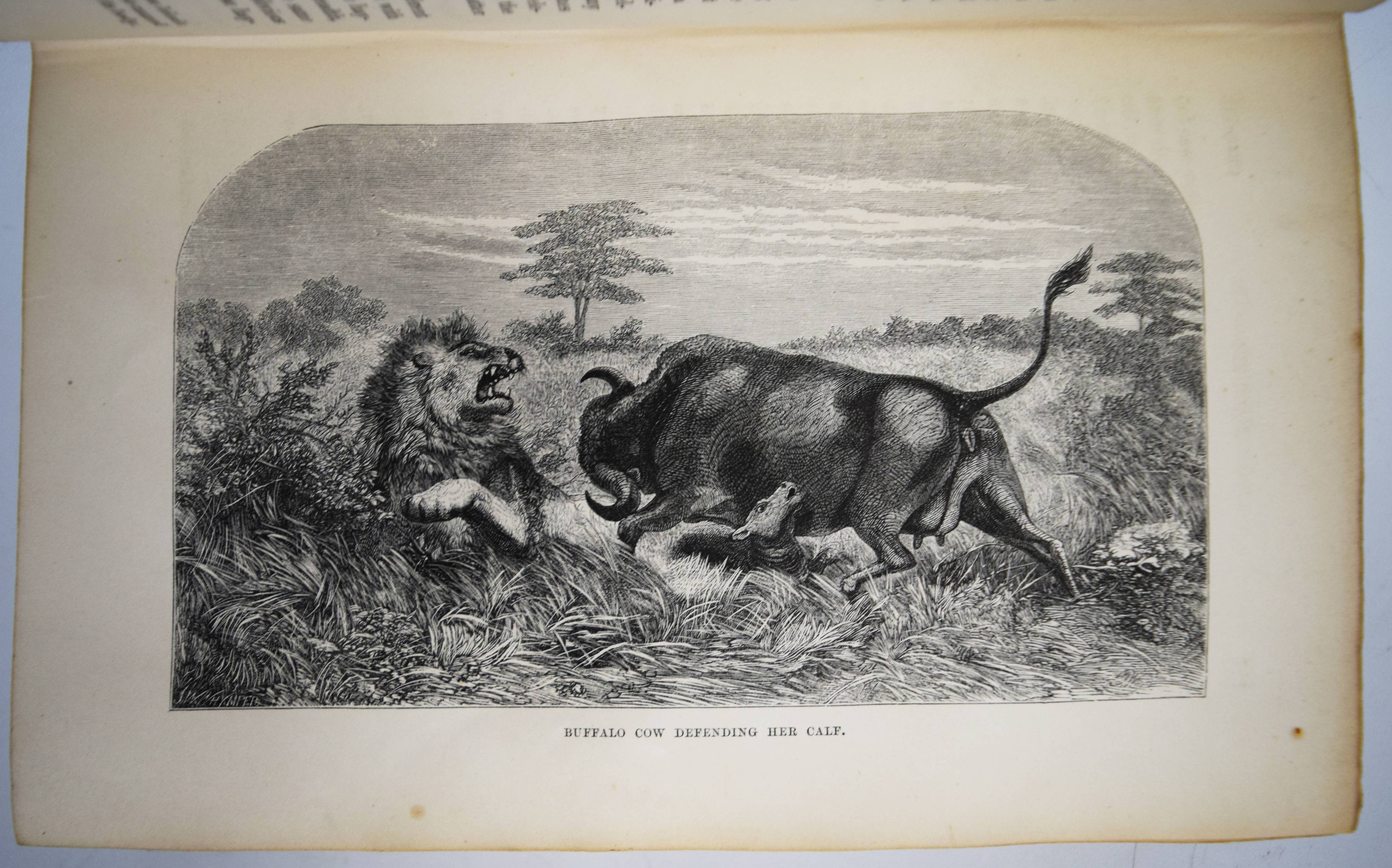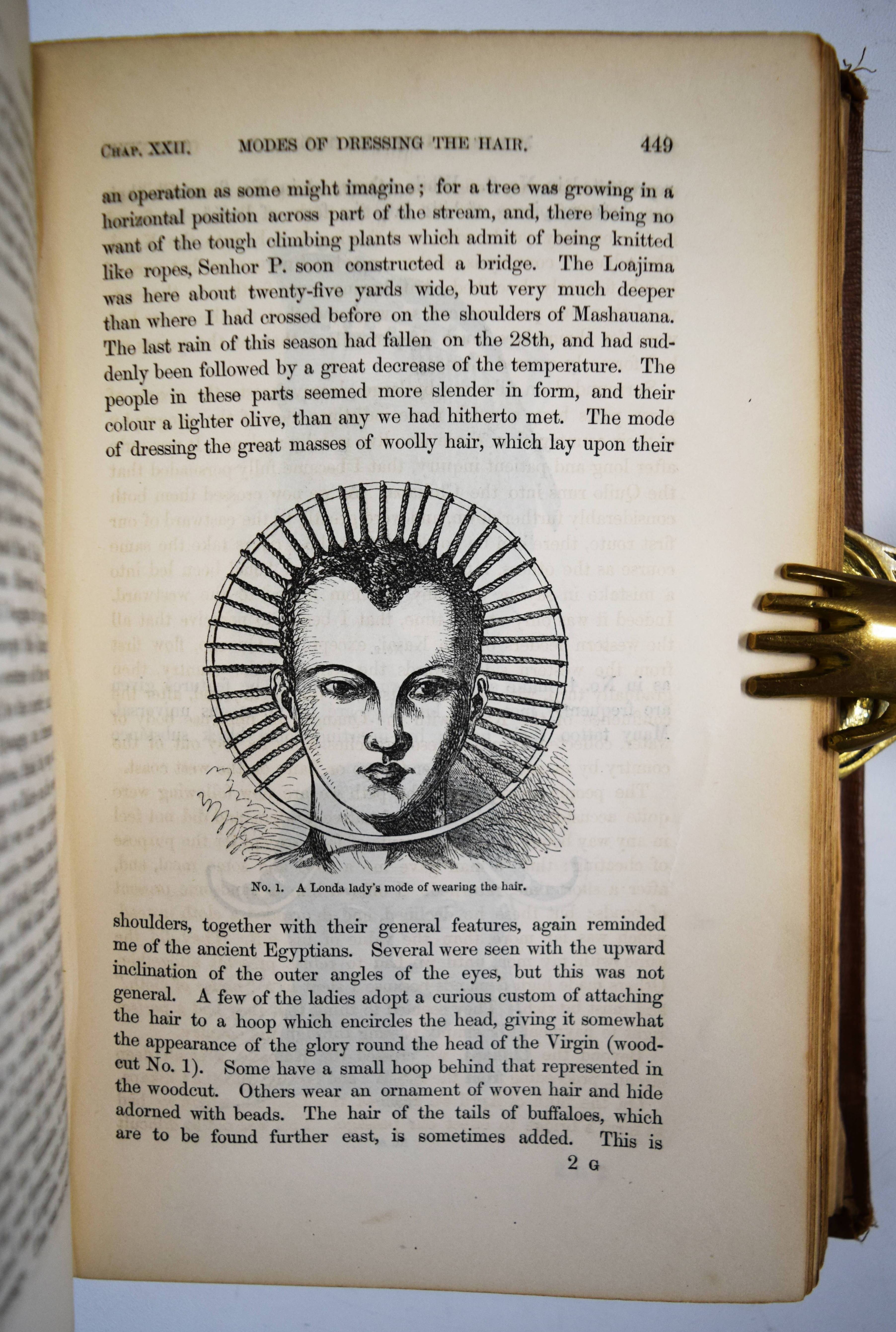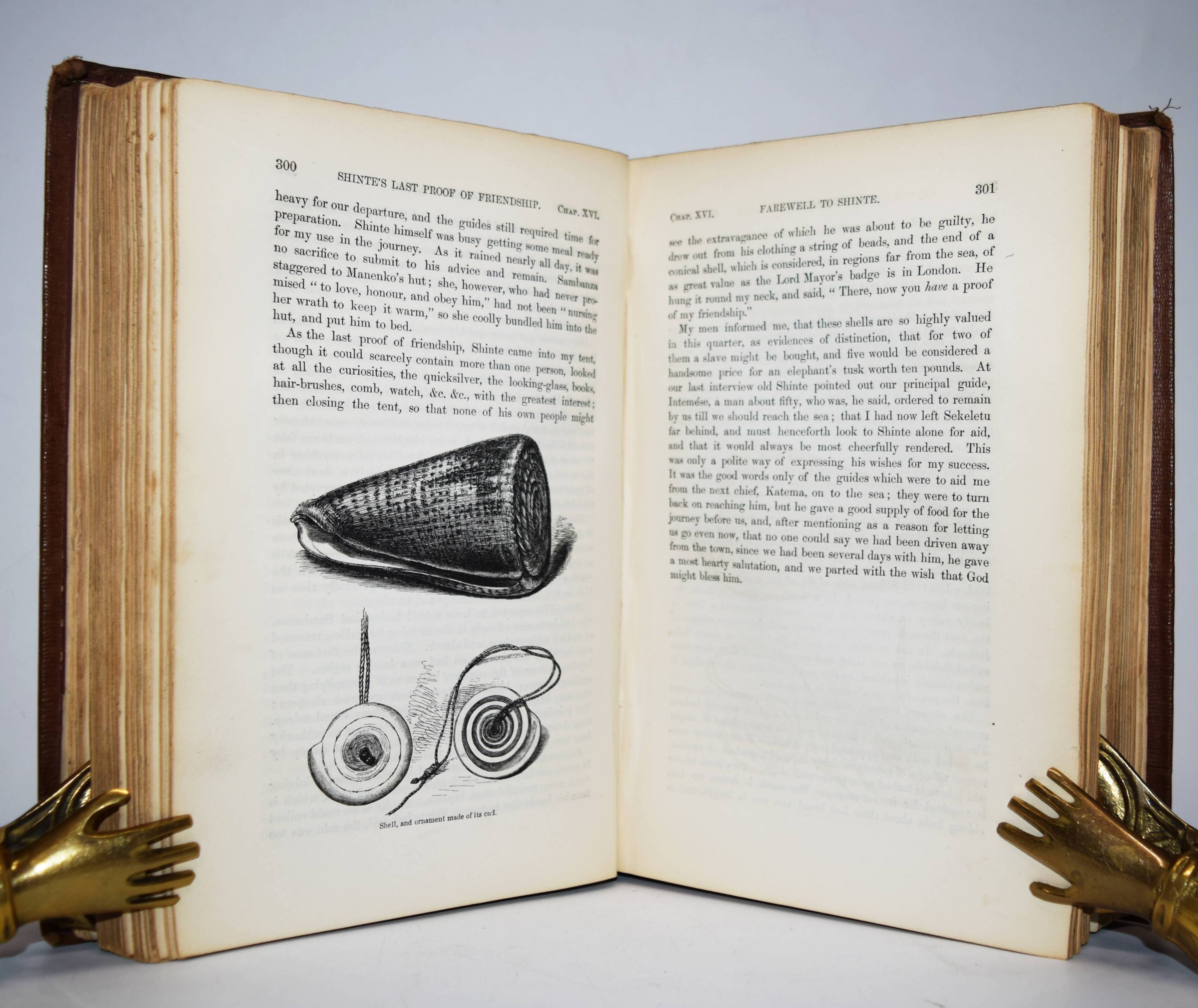 Livingstone, David. Missionary travels and researches in South Africa. Including a sketch of sixteen years’ residence in the interior of Africa, and a journey from the Cape of Good Hope to Loanda on the West Coast; thence across the continent, down the river Zambesi, to the Eastern Ocean. London, John Murray 1857. Gr.-8° (23 x 15,5 cm.). IX, 687, (1), 8 S. (Verlagswerbung dat. 1. Nov. 1857) mit gefalt. Holzstich-Frontispiz, gestoch. Portrait, zahlreichen Holzstichen im Text und auf (1 gefalt.) Tafeln, 2 gefalt. lithogr. Karten (davon 1 in Rückentasche) und 1 gefalt. lithogr. Plan (Höhenprofil). Bindgepr. Orig.-Leinenband mit goldgepr. Rückentitel. Abbey, Travel 347. Bradlow, Africana books and pictures 123. Embacher 190. Gay 3034. Henze III, 270. Mendelssohn III, 136. PMM 341 a. Vgl. Kainbacher 247 (deutsche Übersetzung). – Dritter Druck der ersten Ausgabe, bei der die beiden lithographierten Tafeln durch Holzstiche ersetzt wurden. 1857 erschienen mindestens acht Varianten. – Die wohl bedeutendste und berühmteste Reisebeschreibung über den afrikanischen Kontinent. – Livingstones erster großer zusammenfassender Bericht über seine Missionstätigkeit seit 1840 und die Durchquerung Südafrikas 1853-1856, die u. a. zur Entdeckung des Nigami-Sees, des Sambesi und der Viktoriafälle führte. – David Livingstone (1813-1873) „became a missionary and was sent to South Africa by the London Missionary Society in 1840. From then onwards his life was devoted to the exploration of central Africa. Although a missionaryhe regarded himself more as a pioneer explorer opening up the country for others. Livingstone’s services to African geography during thirty years are almost unequalled; he covered about a third of the continent from the Cape to the Equator and from the Atlantic to the Indian Ocean. He made three great expeditions; in 1853-6 (described in this book), 1858-64 and 1865-73, of which the first and third are the most important. During these years he explored vast regions of central Africa, many of which had never been seen by white men before. Hie first discovered the Zambesi River at Secheke and followed it northwards, eventually reaching the west coast of Africa at Luanda, Angola, and the east coast at Quelimane, Mozambique. In 1855 he discovered the great falls of the Zambesi and named them the Victoria Falls. He explored the Zambesi, Shire and Ruyuma rivers and found the salt lake Chilwa and Lake NyasaThe geographical results of his journeys were of supreme importance, and made it possible to fill in great stretches of the maps of Central Africa which hitherto had been blank“ (Carter/Muir, Printing and the Mind of Man). – Einband leicht berieben, sehr gutes sauberes Exemplar im seltenen Verlagseinband. – Third printing of the first edition, in which the two lithographed plates were replaced by wood engravings. – Binding slightly rubbed, very good clean copy in rare publisher’s binding.