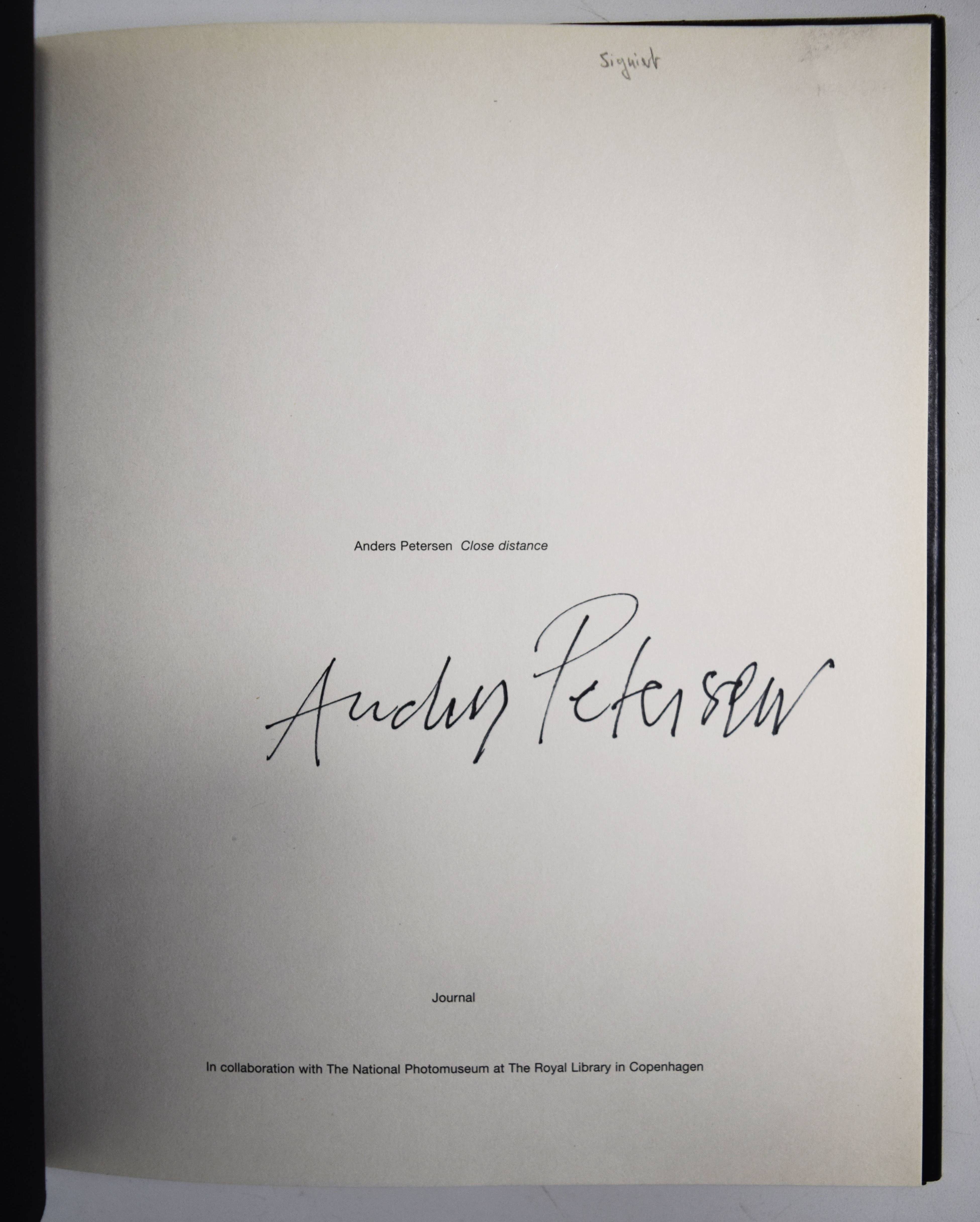 Petersen, Anders. Close distance. In collaboration with The National Photomuseum at The Royal Library in Copenhagen. (Preface Ingrid Fischer Jonge). Stockholm, Journal Förlag (2002). 4°. [60] p. with 41 duotone-plates. Original cloth binding with illustrated dust jacket. Koetzle, Fotografen A-Z 314. – First edition; signed by Anders Petersen. – Text by Danish photo historian and writer, Birna Marianne Kleivan, consists of an interview with Anders Petersen and a summary of his works. About the photos, she says: „Instinct and dreams are conjured up in a series of animalistic photographs, in part providing fascination through their simultaneously transgressive and chaste representation of the primitive and the darker sides of the individual. A world full of danger and darkness, full of siren songs and sores that will never heal. Where demons are kept at distance through substitutes, while the momentary raptures of ecstasy are captured, before an abyss of human lonliness once again opens itself under the spectator.“ – Very good copy.