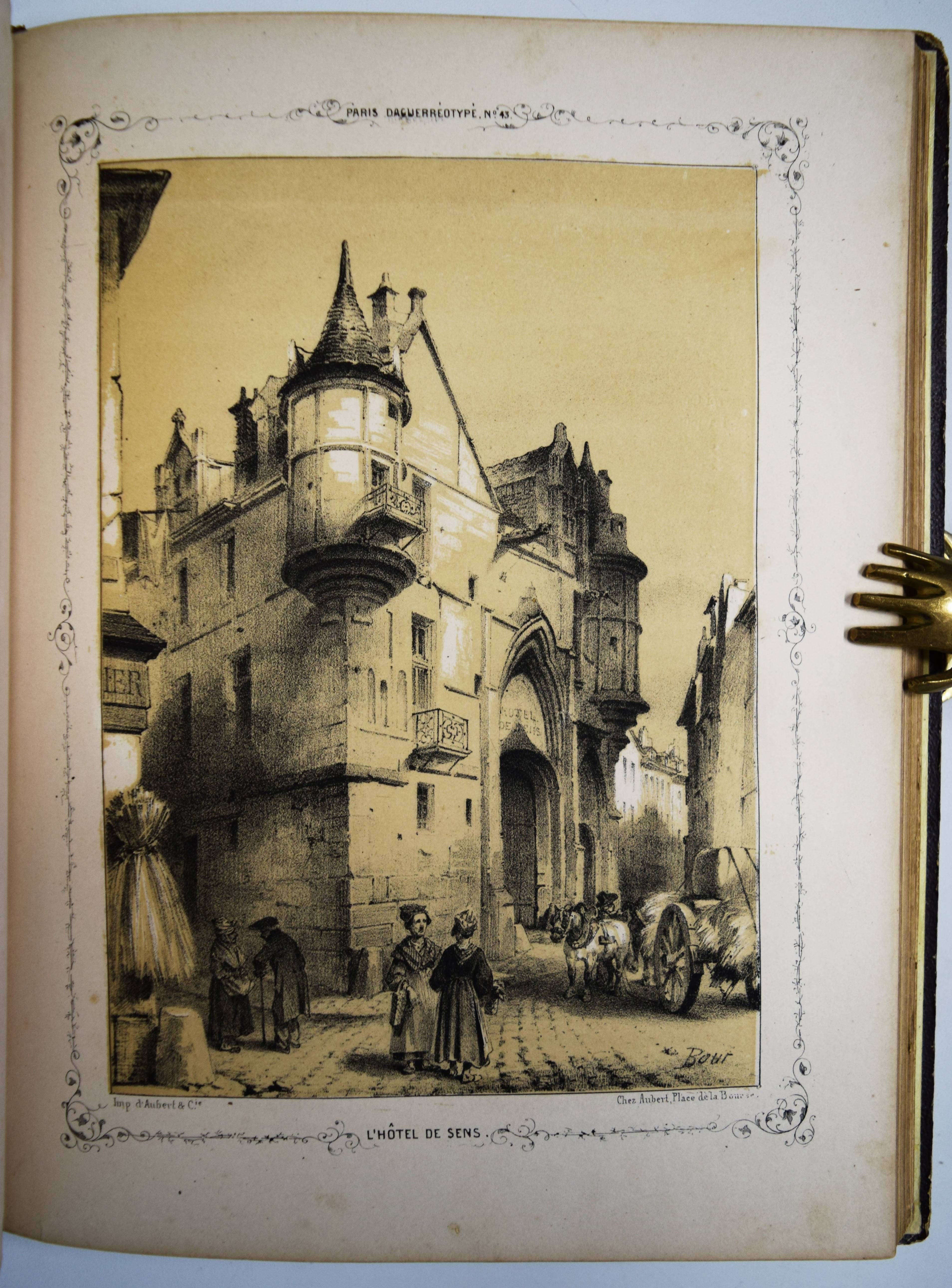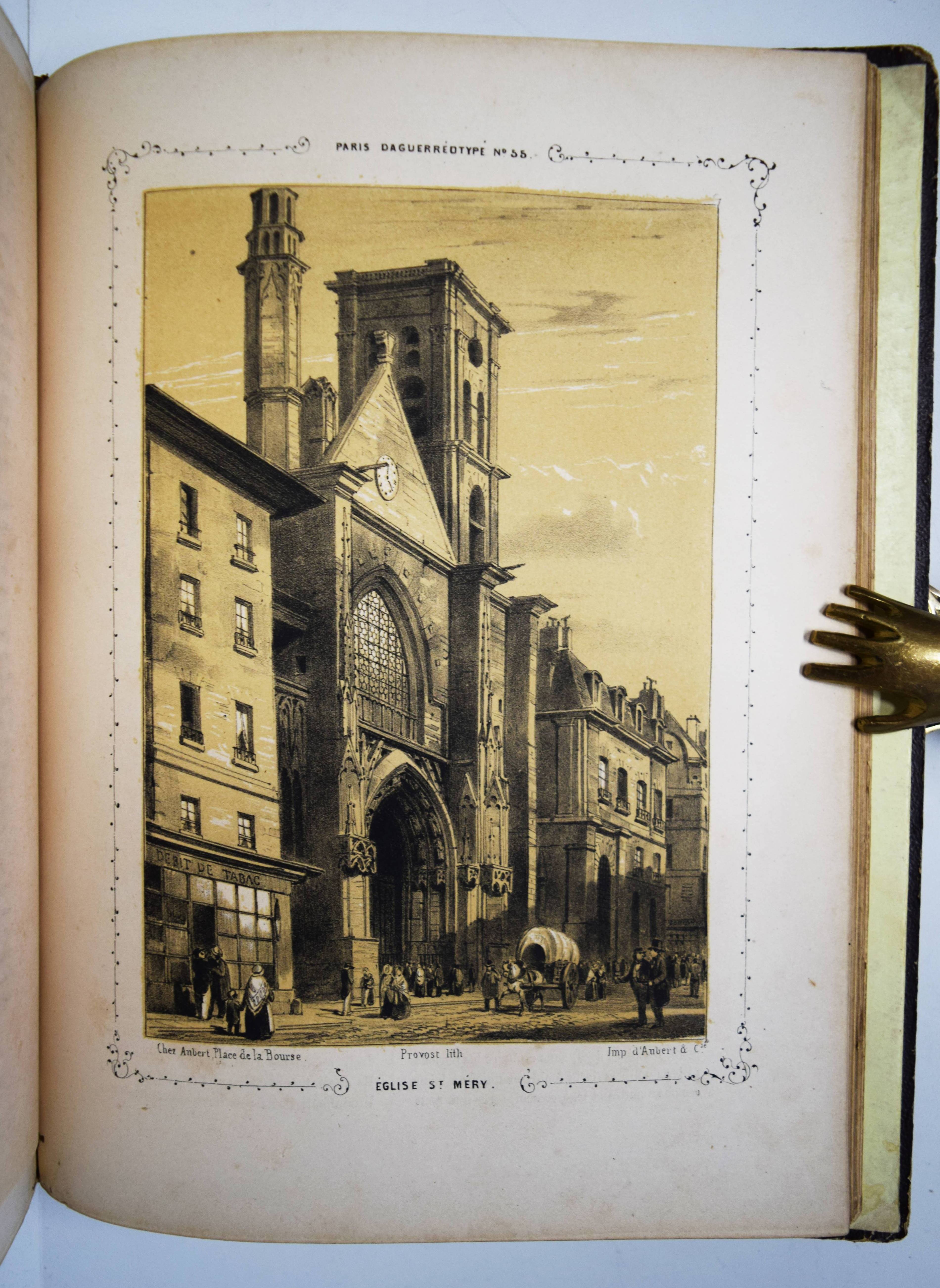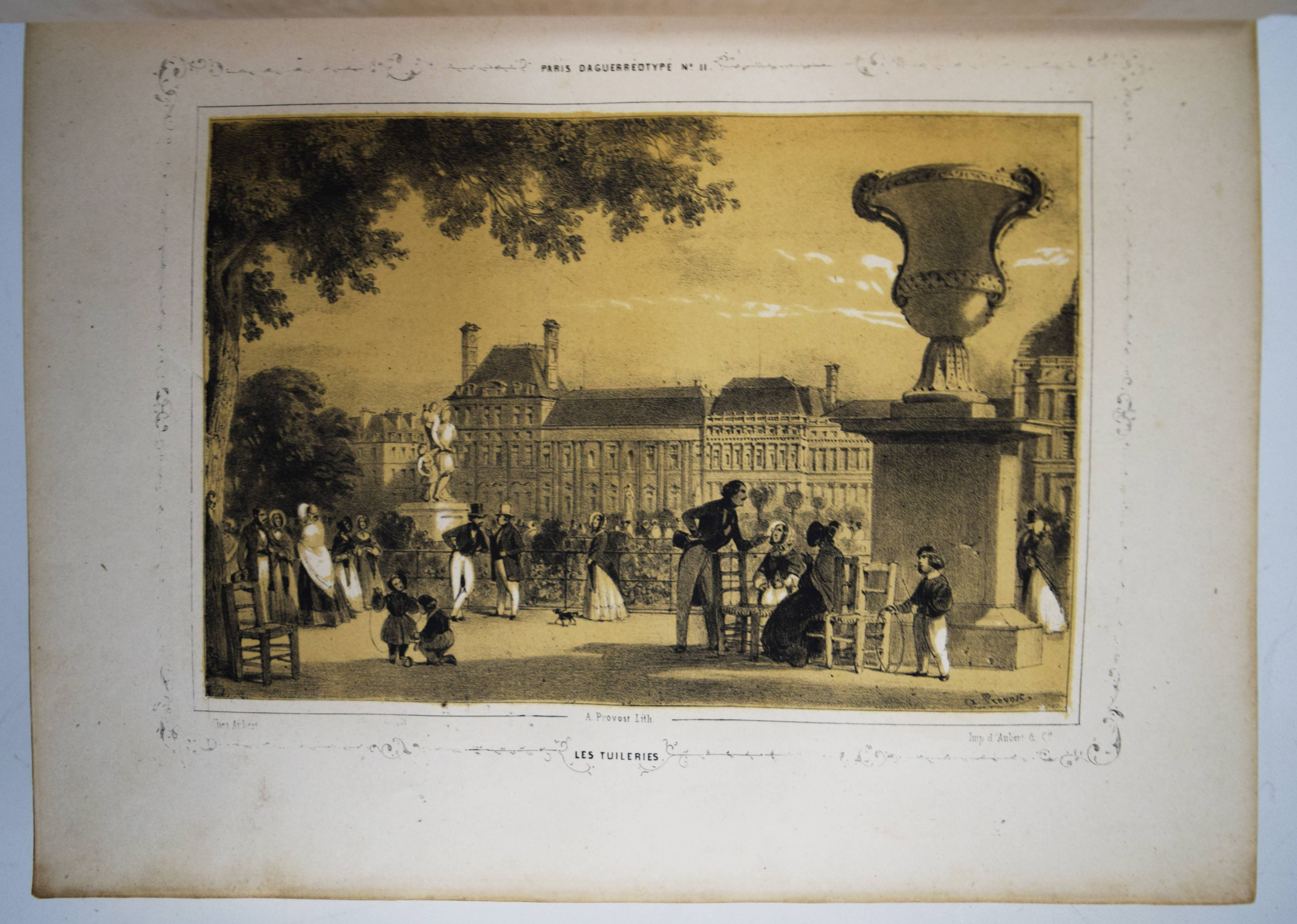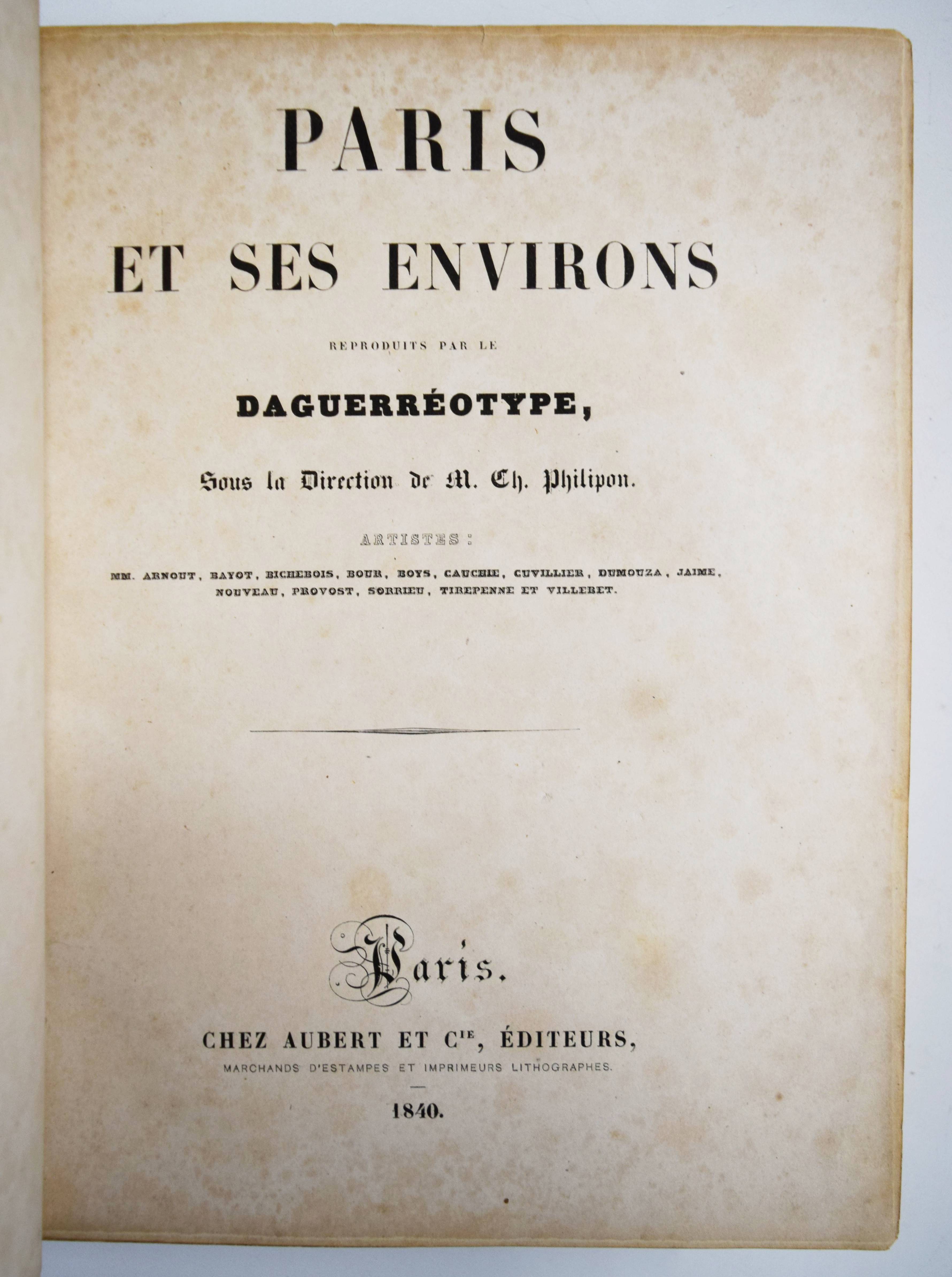 Daguerréotypie – Philipon, Charles (Èditeur). Paris et ses environs. Reproduits par le daguerréotype. Sous la Direction de M. Ch. Philipon. Artistes: Arnout, Bayot, Bichebois, Bour, Boys, Cauchie, Cuvillier, Dumouza, Jaime, Nouveau, Provost, Sorrieu, Tirepenne et Villebert. Paris, Aubert et Cie. 1840. 4° (28 x 21 cm.). [238] S. mit 60 lithogr. Tafeln mit Tonplatte nach Daguerreotypien. Orig.-Leinenband mit goldgepr. Rückentitel, dekorativer Romantikervergoldung und Goldschnitt. Rossens/Salu 5126. – Einzige Ausgabe des ersten Ansichtenwerks bei dem Daguerreotypien als Vorlage für die Ansichten dienten. – „Paris gilt als Wiege der Fotografie, als glanzvoller Ausgangspunkt des neuen Mediums. Hier wurde das Lichtbild in Gestalt der Daguerreotypie Mitte August 1839 bekannt gemacht und patentfrei: einer staunenden Weltöffentlichkeit übergeben. Ein Datum, das nicht weniger als den Beginn des fotografischen Zeitalters markiert. Nicht zufällig spricht der Fotograf und Historiker Jean Claude Gautrand von einer „Liebesgeschichte zwischen Paris und der Fotografie“, was sich auf die Vielzahl von Chemikern, Optikern, Künstlern beziehen dürfte, die sich sogleich forschend oder praktizierend des neuen Mediums annahmen, wie auf die Tatsache, dass Paris selbst zügig und privilegiert zum Bildgegenstand avancierte“ (H.-M. Koetzle, Eyes on Paris S. 9). – „Wir haben die großen Denkmäler von Paris auf diese Weise reproduziert gesehen. … Von Paris, das nun wirklich die Ewige Stadt werden wird. Wir haben den Louvre gesehen, das Institut, die Tuilerien, den Pont Neuf, Notre-Dame; wir haben das Pflaster des Grève-Platzes, die Wasser der Seine, den Himmel über Sainte Geneviève gesehen, und jedes dieser Meisterwerke zeichnete die gleiche Perfektion aus“ (Jules Janin 1839 zit. nach W. Kemp, Theorie der Fotografie, München 1980, S. 48). – Der französische Karikaturist und Journalist C. Philipon (1800-1862) war unter anderem auch Herausgeber der satirischen Zeitschriften La Caricature und Le Charivari. Er wurde 1854 von Nadar portraitiert. – Rücken etwas berieben, im Blattrand teils etwas angestaubt und braunfleckig, sehr gutes Exemplar im dekorativen Verlagseinband.