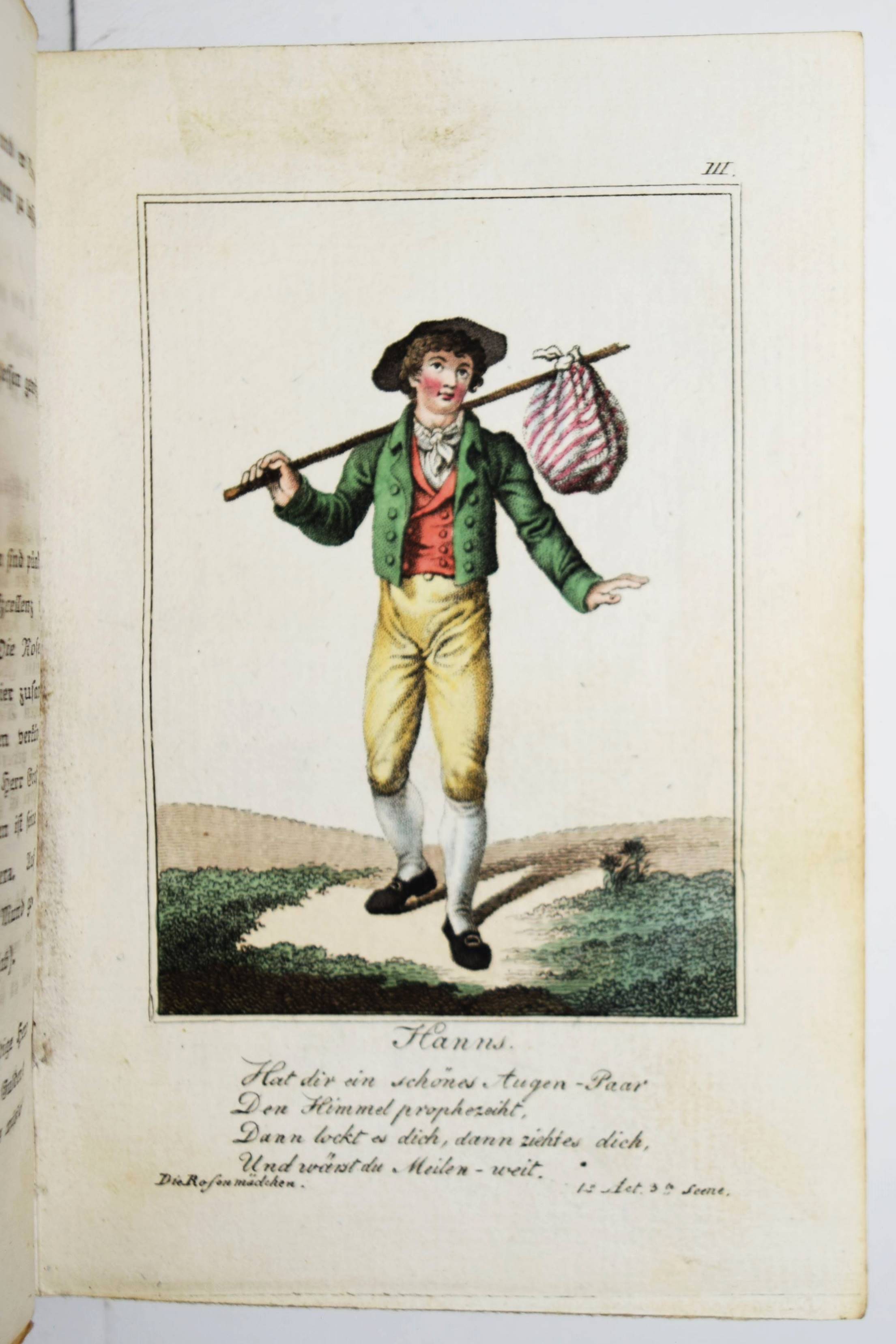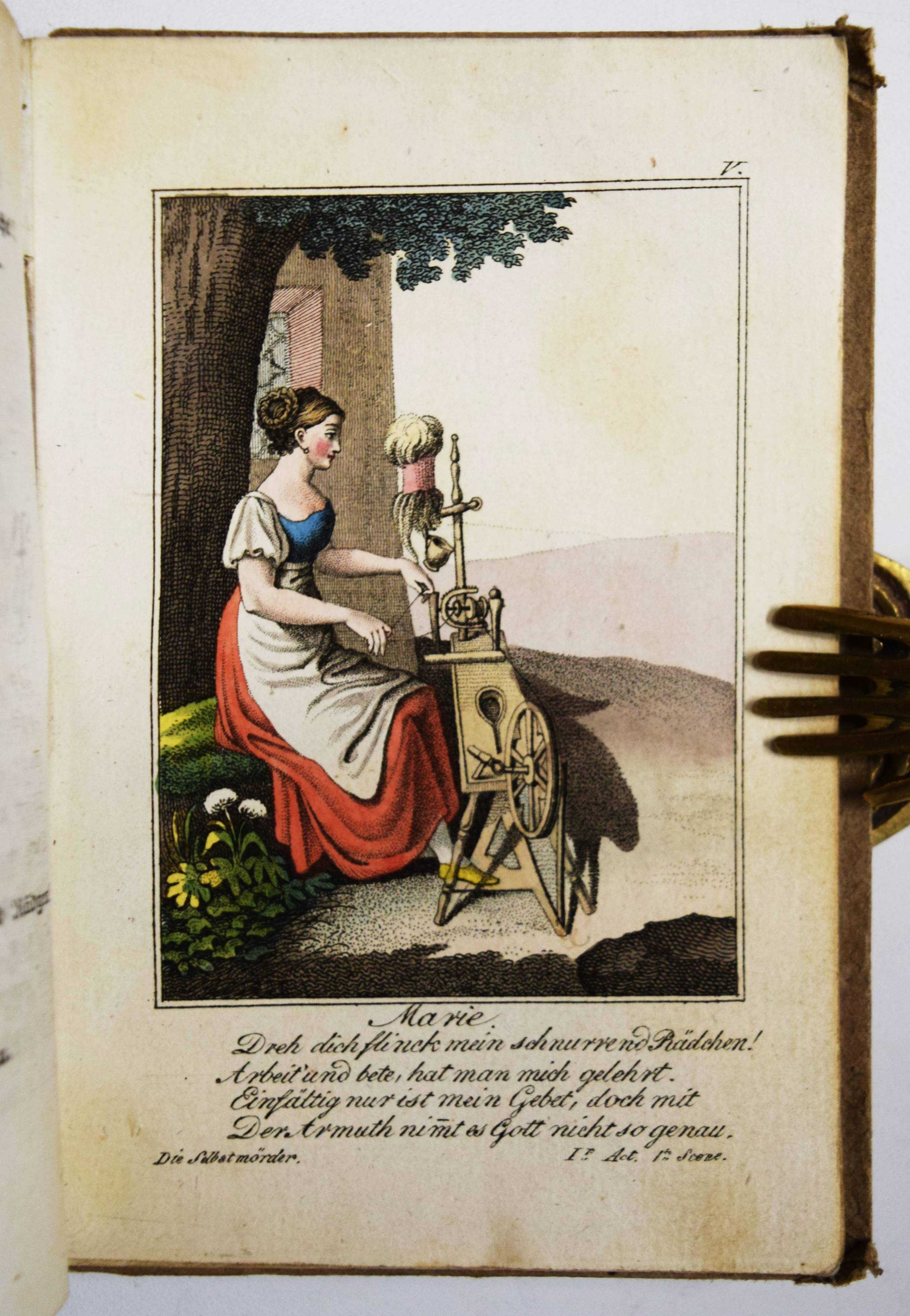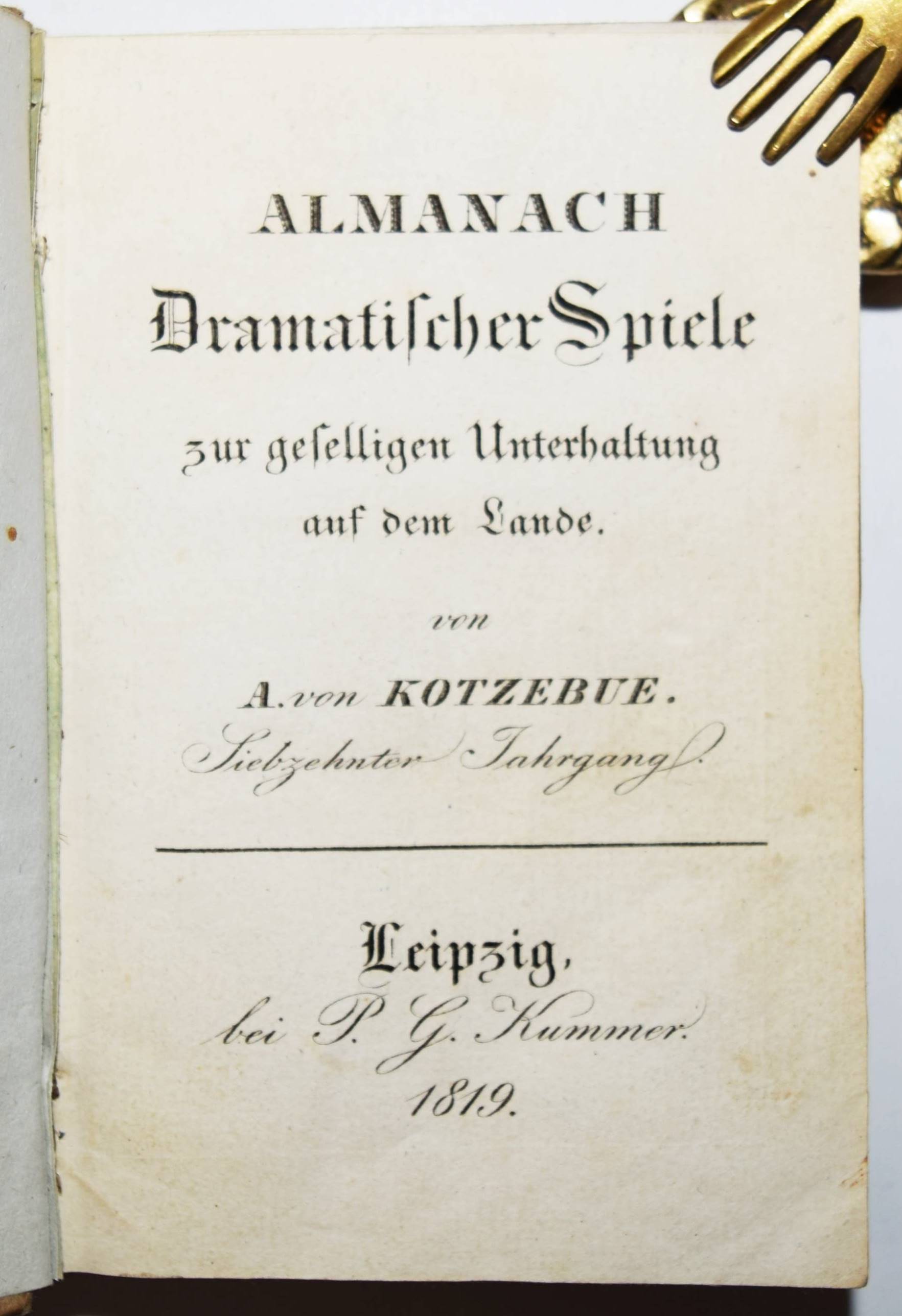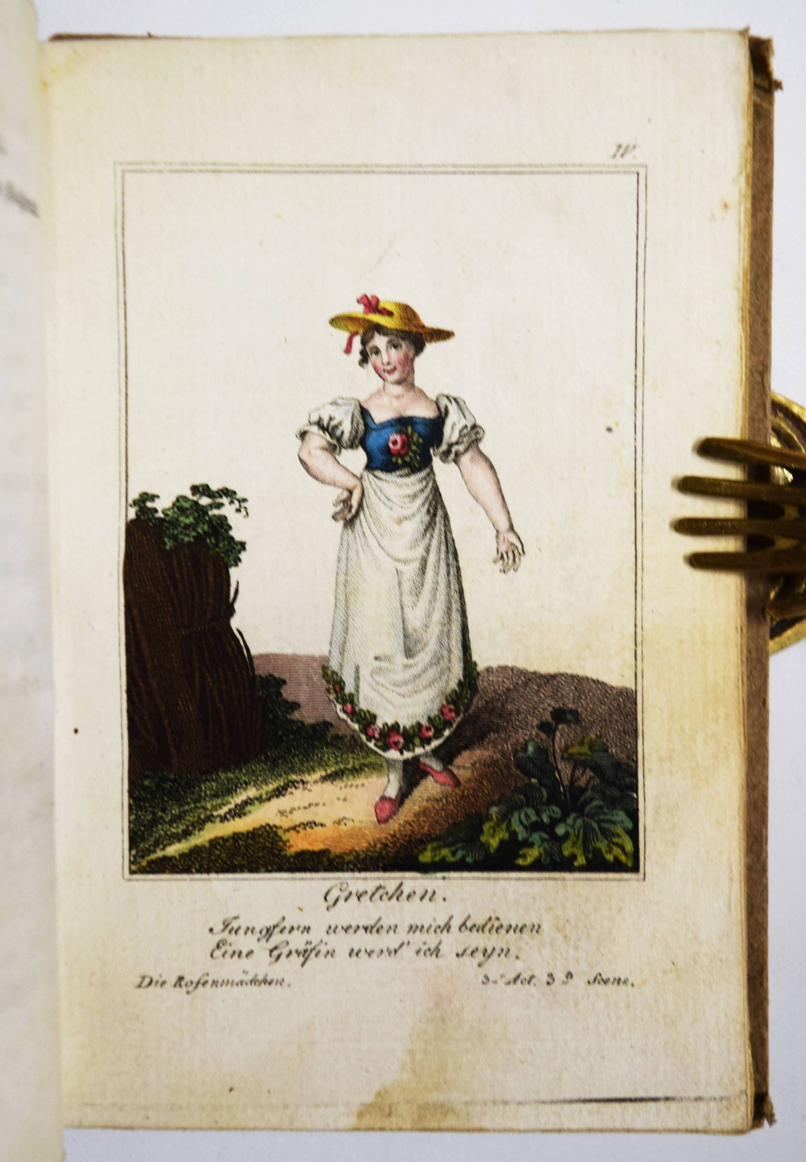 Almanach – Kotzebue, August v. Almanach dramatischer Spiele zur geselligen Unterhaltung auf dem Lande. Siebzehnter Jahrgang. Leipzig, P. G. Kummer 1819. 12° (12 x 8 cm.). Gestoch. Titel, 376 S. mit 4 (statt 5) handkol. Kupfertafeln. Pappband der Zeit mit handschr. Rücken- und Deckelschild. Köhring S. 18. Musenalm 1281. Lanckoronska/Rümann 121 ff. Lipperheide Za 31. – Beliebter Theater-Almanach mit hübsch kolorierten Rollendarstellungen, der bis 1834 in 32 Jahrgängen erschien. – „Die handkolorierten Kupfer, die bei Kraus noch klassizistisch sind, erhalten nun einen romantisch-biedermeierschen Einschlag. … Der noch von Kotzebue besorgte, doch nach seiner Ermordung erschienene Jahrgang 1820 erhielt ein Bildnis des Dichters zum Titelkupfer, und der Verleger Paul Gotthelf Kummer schrieb eine Vorrede, in welcher er den Charakter des Poeten aufzeigt als den eines Liebe und Ehrfurcht verdienenden braven Gatten, edlen Vaters, treuen Freundes und wirksamen Wohltäters der Armen“ (Lanck./R., S. 122). – Der vorliegende Jahrgang enthält die vier Theaterstücke „Die Verkleidungen“, „Der fürstliche Wildfang“, „Die Rosenmädgen“ und „Die Selbstmörder“. – Einband angestaubt und etwas berieben, das Frontispiz fehlt, im Blattrand teils etwas fingerfleckig, sonst gut erhalten.