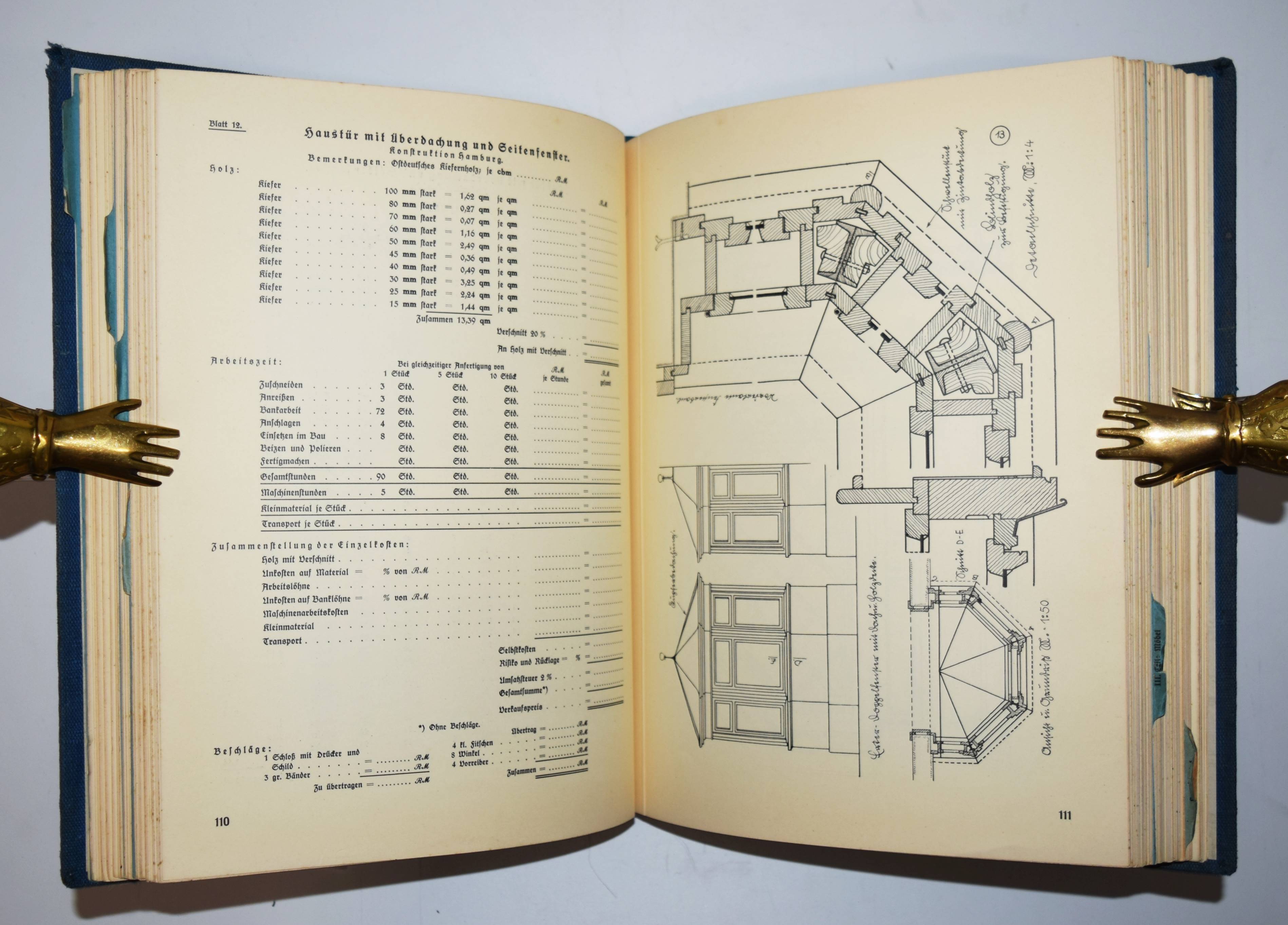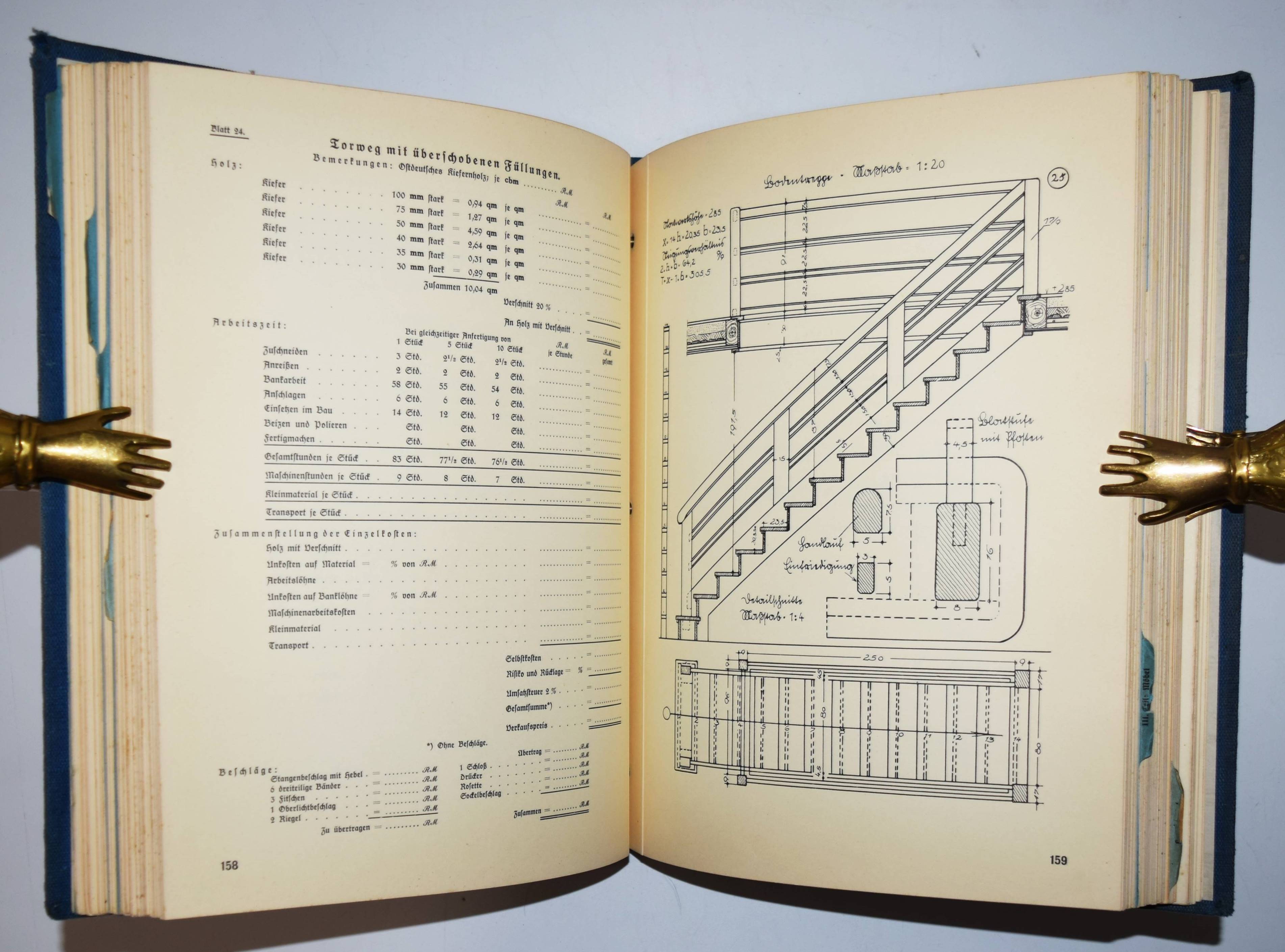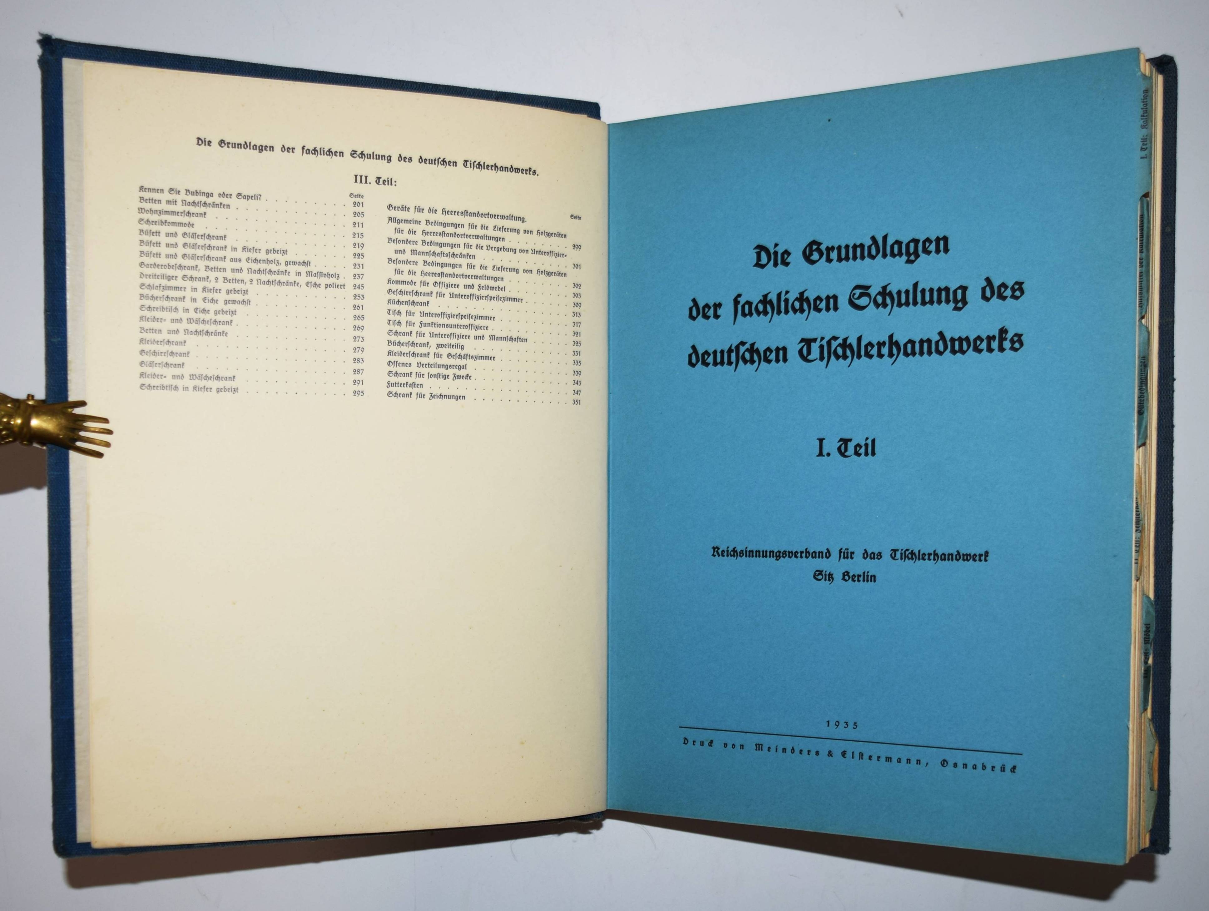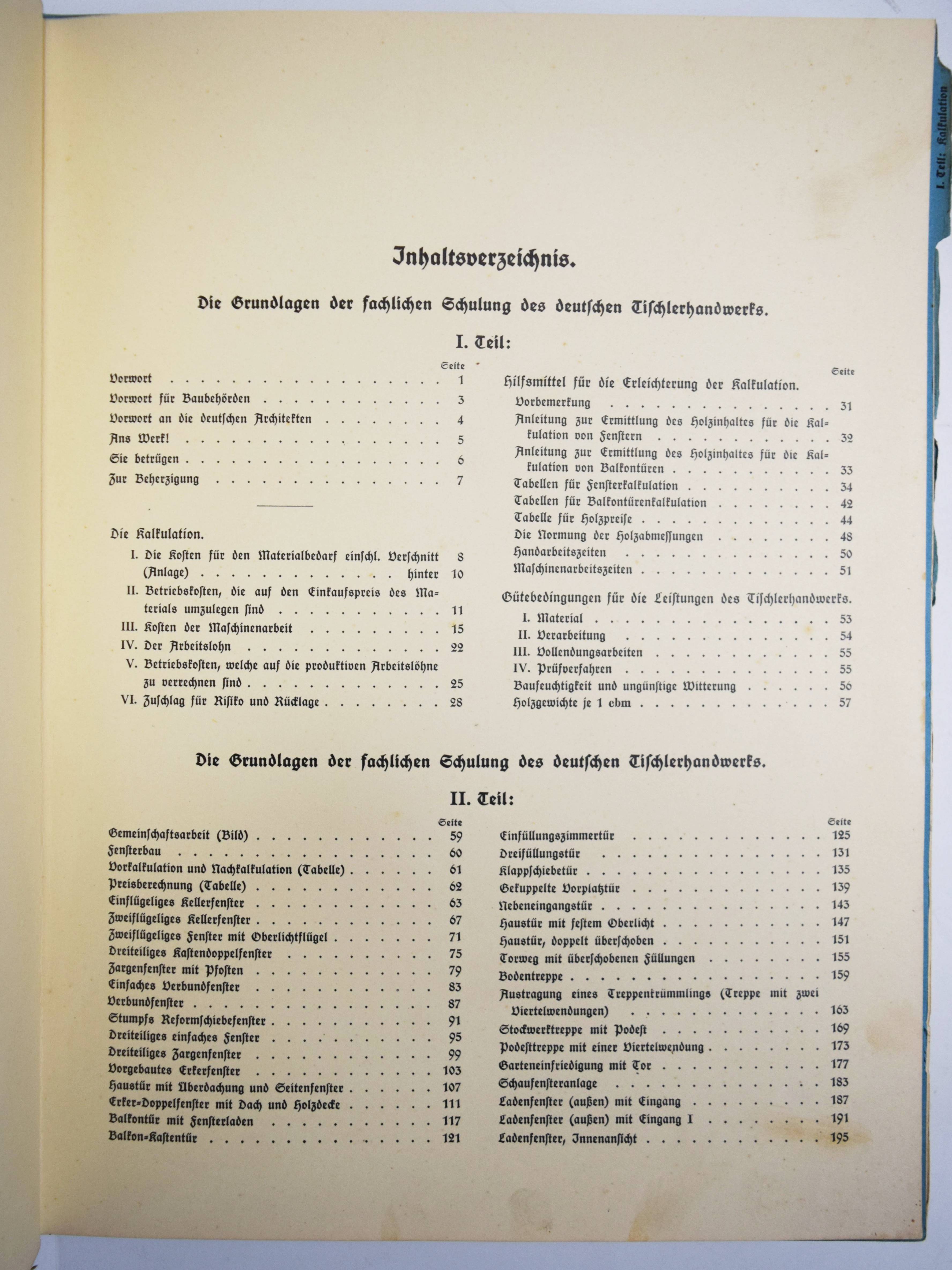 Grau, Georg (Vorwort). Die Grundlagen der fachlichen Schulung des deutschen Tischlerhandwerks. Herausgegeben vom Reichsinnungsverband für das Tischlerhandwerk in Berlin. 2 Teile in 1 Band. Berlin, Osnabrück, Meinders & Elstermann 1935. 4°. 355 S. mit zahlr. Abbildungen nach Zeichnungen. Illustr. Orig.-Leinenband mit Metallschrauben-Heftung. Als Lieferungswerk erschienenes Fachbuch für das Schreinerhandwerk. – Der erste Teil über Kalkulation der Betriebs- und Materialkosten. Der zweite Teil mit Anleitungen zum Fenster- und Möbelbau. – Einband etwas berieben, sonst gut erhalten.