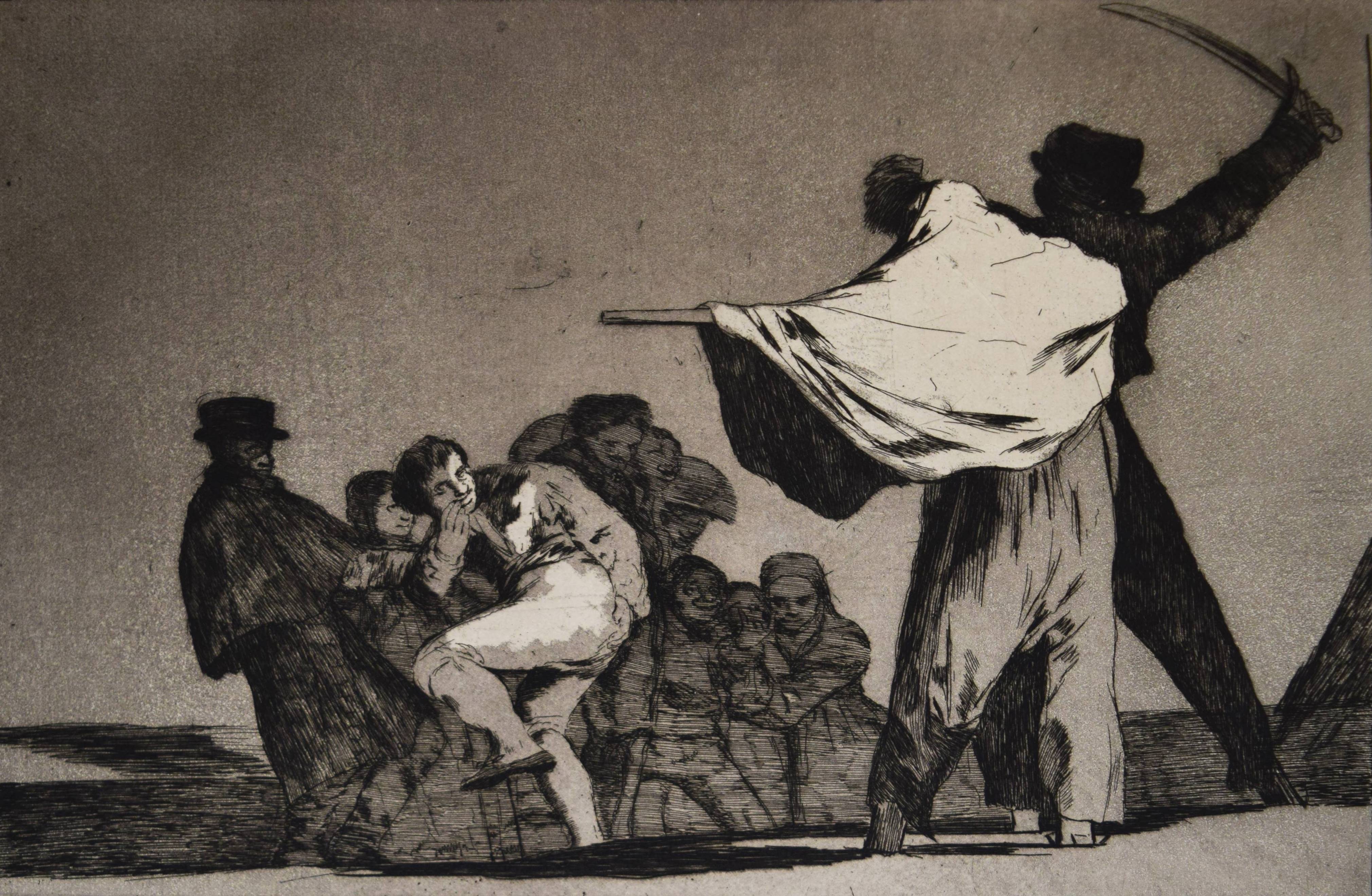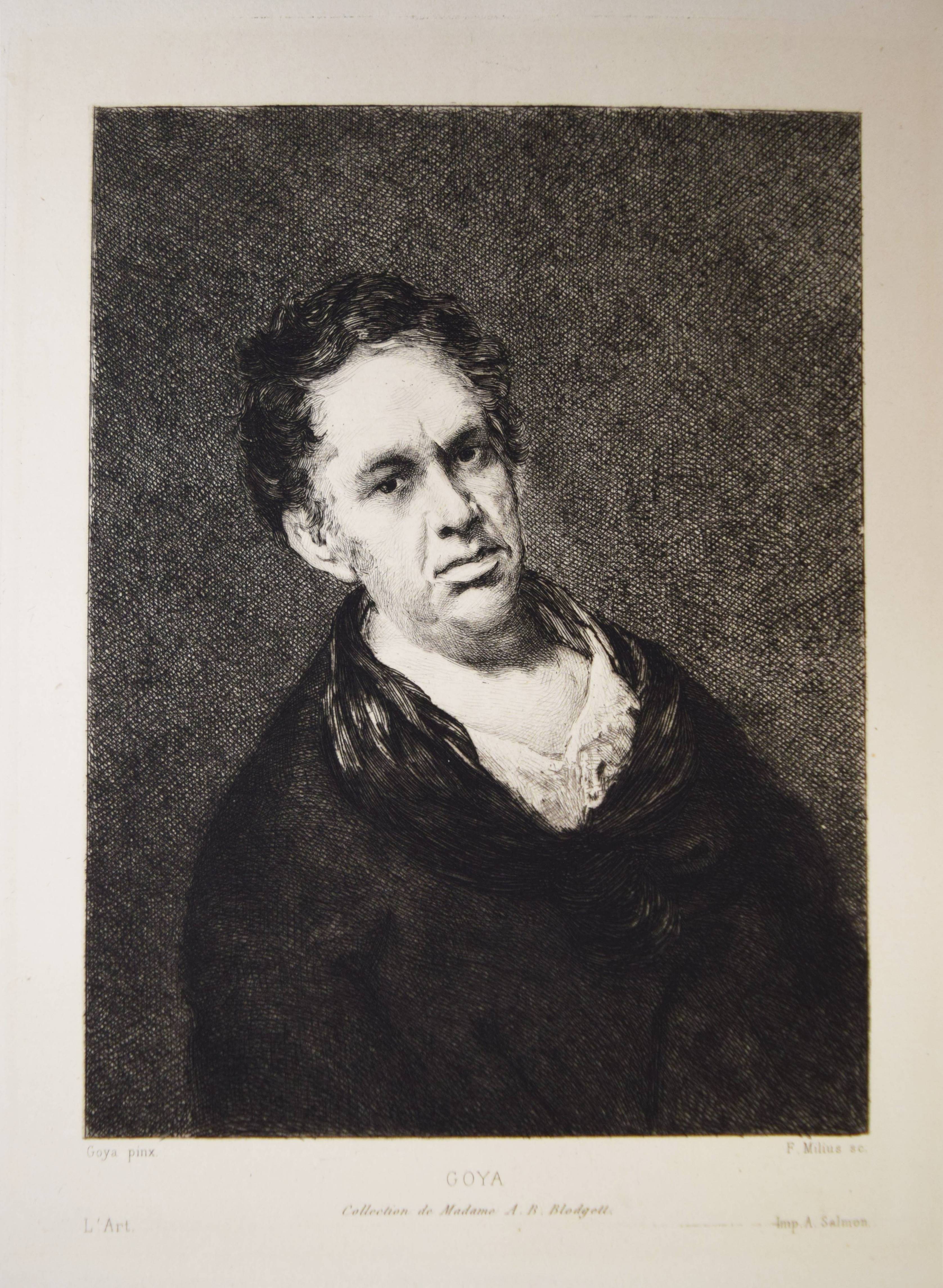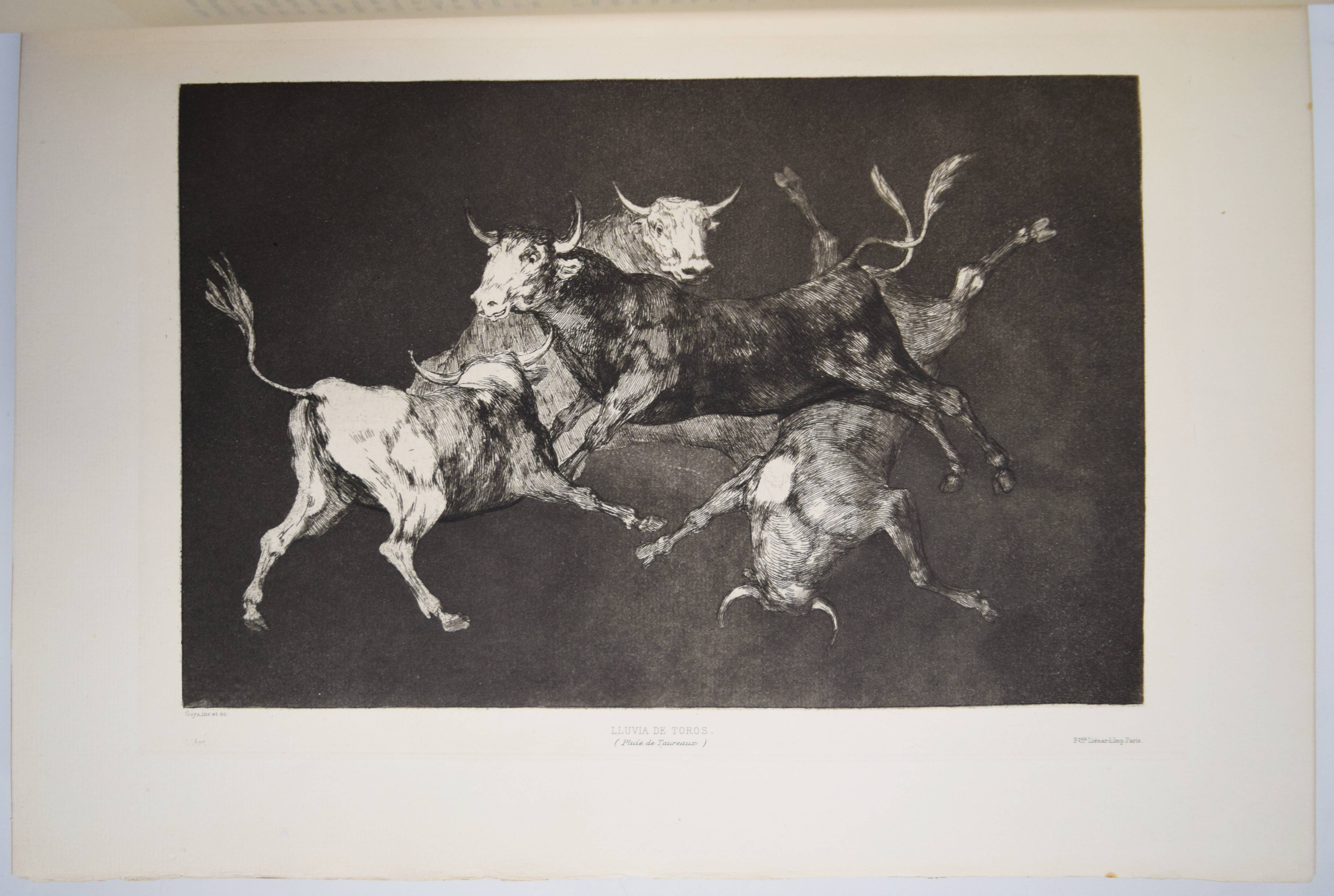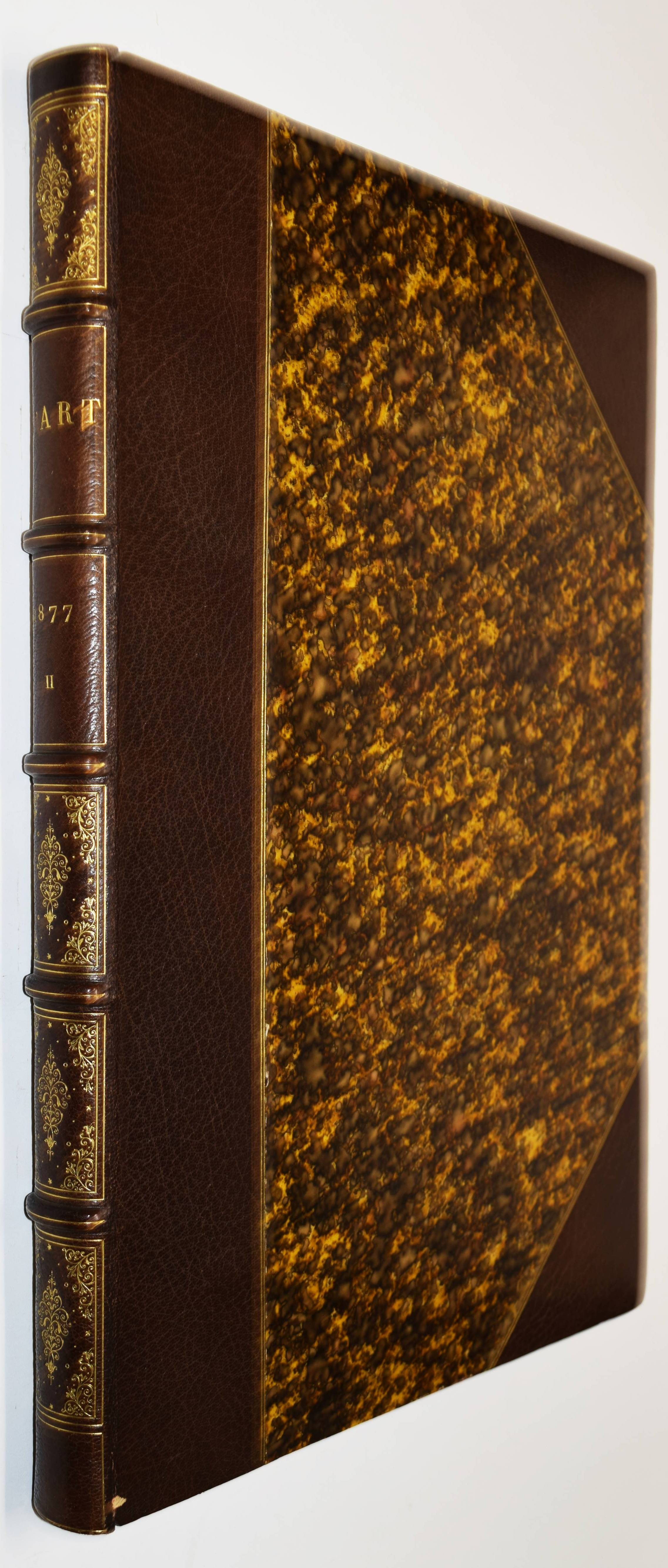 Goya, Francisco y Lucientes (1746-1828). Four original etchings from Los Proverbios (first impressions) and one etching after Goya (Self-Portrait). In: L’Art. Revue hebdomaire illustrée. Troisième année 1877, tome II, (Tome IX de la Collection). Paris, London, A. Ballue Éditeur 1877. Folio (45 x 32 cm.). [3] Bl., 324 S. mit 17 Radierungen, darunter 4 von F. Goya und 3 Heliogravuren und zahlr. Holzstichen im Text. Halblederband der Zeit mit goldgepr. Rückenschild, Rückenvergoldung, Deckelfiletten und Kopfgoldschnitt (signiert: (Georges) Canape-Belz). Harris 266-269 III. – Der wichtigste Jahrgang der bedeutenden französischen Kunstzeitschrift mit den 5 Original-Aquatintaradierungen von Francisco de Goya y Lucientes: „Goya“, „Lluvia de toros“, „Ortas leyes por el pueblo“, „Que guerrero“ und „Una reina del circo“. Die Graphiken aus der Serie „Los Proverbios“ wurden hier zuerst veröffentlicht. – Die Radierungen sind besonders gratig und sauber, sehr schönes sauberes Exemplar in einem prachtvollen signierten Handeinband.