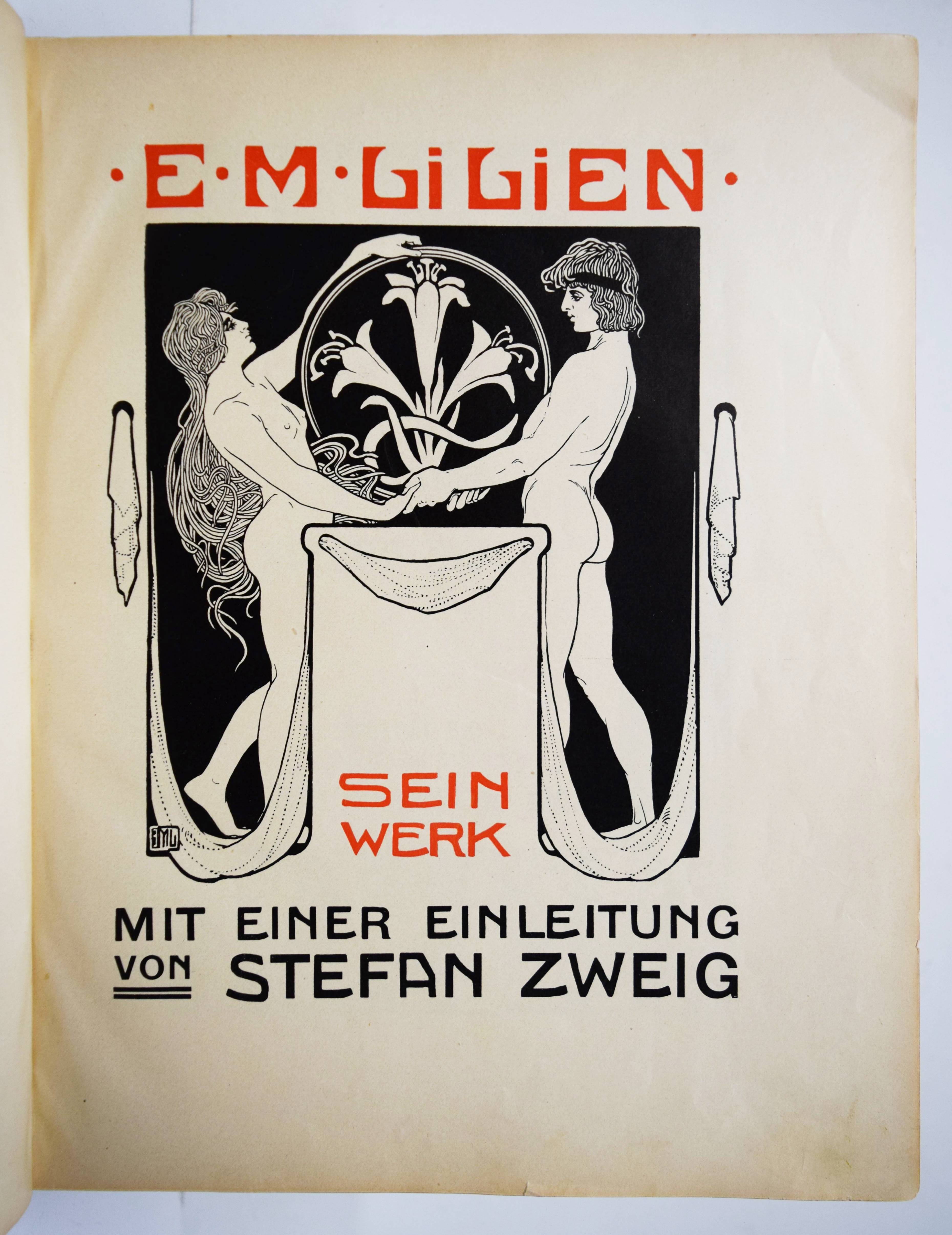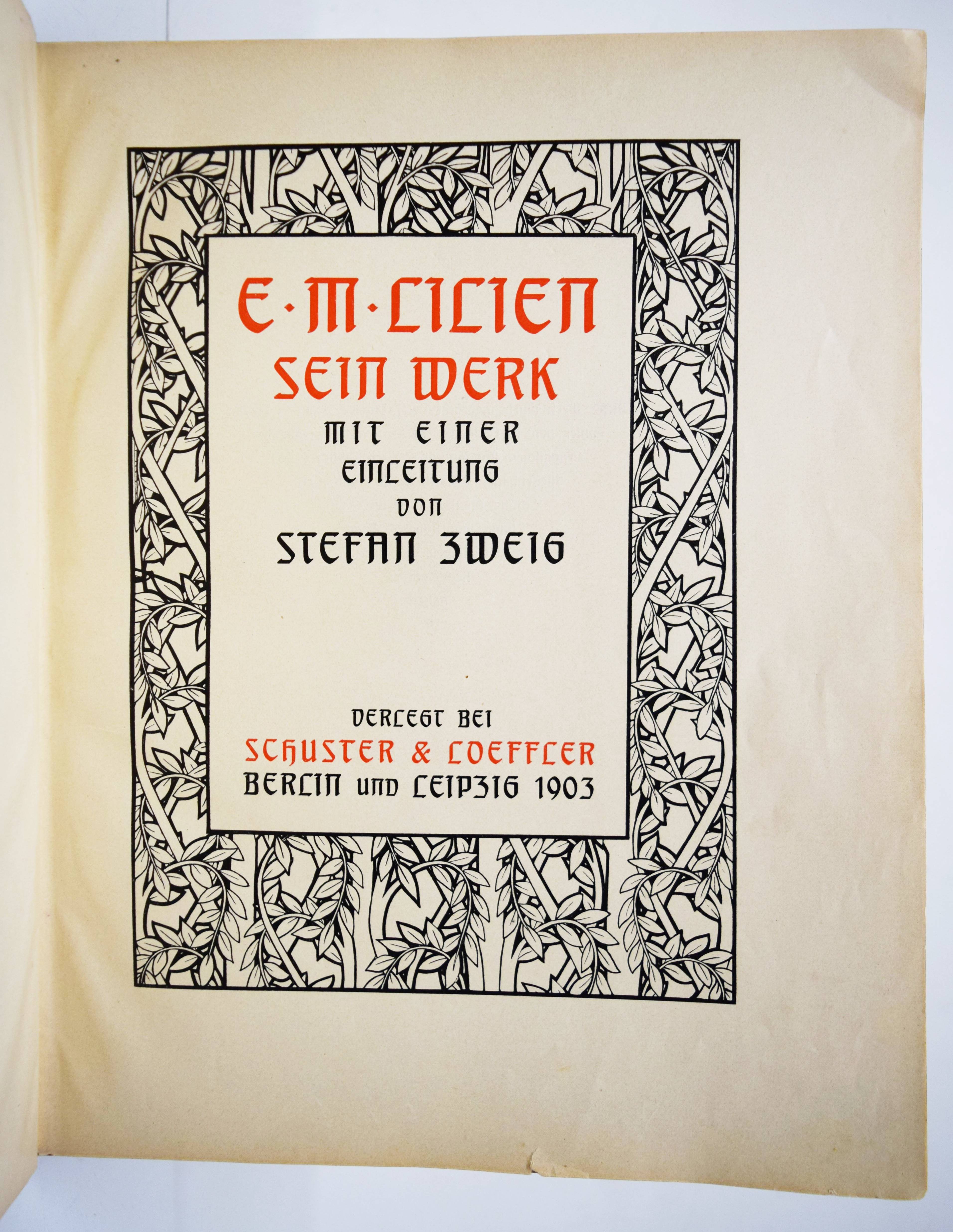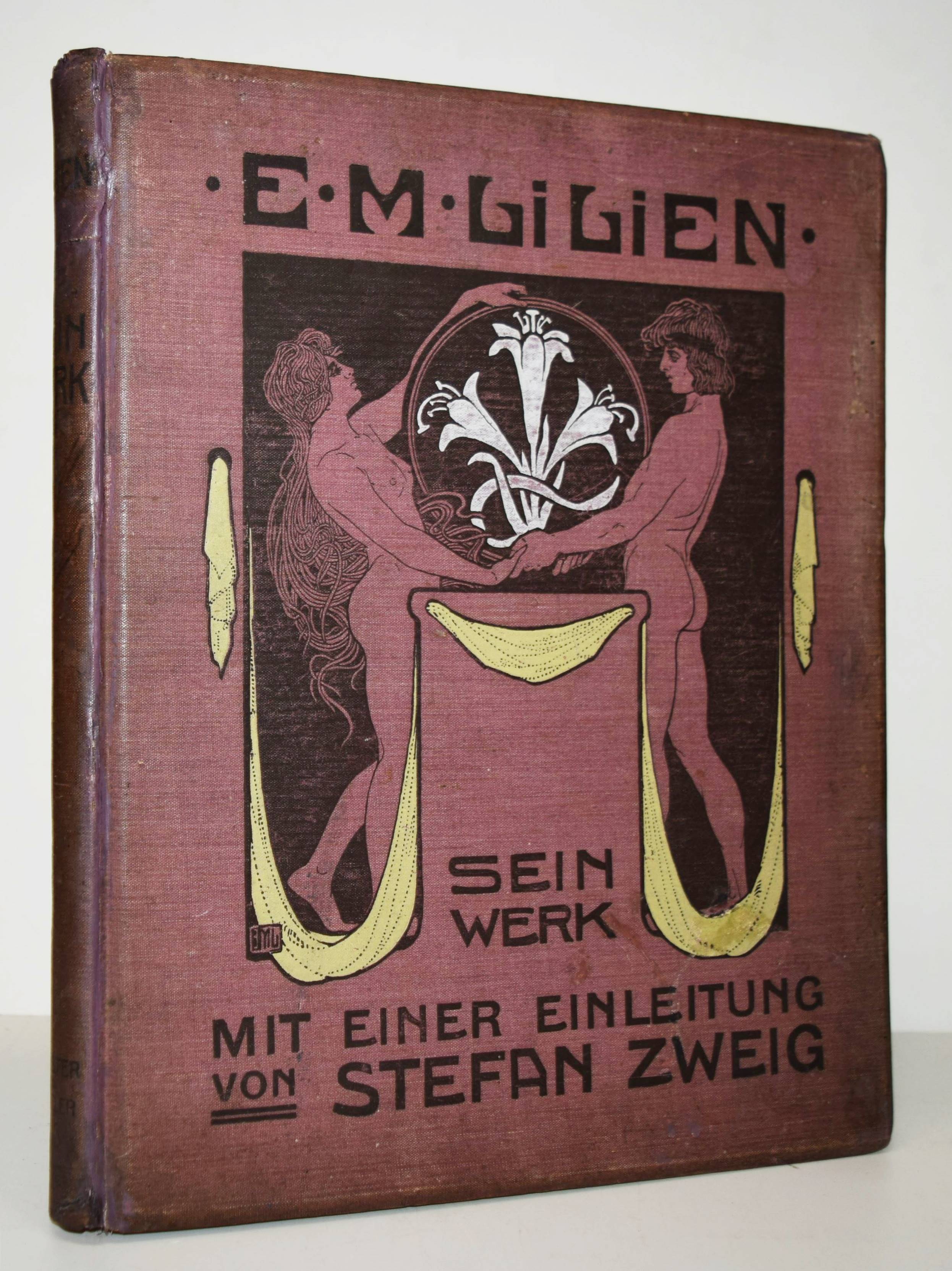 Lilien – Zweig, Stefan (Einleitung). E(phraim) M(ose) Lilien. Sein Werk. Berlin und Leipzig, Schuster & Loeffler 1903. 4° (29,5 x 24 cm.). 347 S., [4] Bl. mit Portrait und zahlr. meist ganzs. Abbildungen. Illustrierter Orig.-Leinenband. NDB XIV, 550 f. und XXVIII, 794 ff. W.-G.² 5 (S. Zweig). – Erste und einzige Ausgabe der in kleiner Auflage erschienenen Monographie über den Jugendstilgraphiker und Illustrator Ephraim Moses Lilien (1874-1925), der mit seinen Arbeiten nachhaltig das Erscheinungsbild der jungen zionistischen Bewegung prägte. – „Stefan Zweig propagierte ihn in einer 1903 erschienenen reich illustrierten Monographie „E. M. Lilien, sein Werk“. L. zählte in Berlin zu den Vertretern der „Jüd. Renaissance“, einer Gruppe um Martin Buber, Berthold Feiwel und Chaim Weizmann, die 1901 den Jüd. Verlag gründete und seit 1902 mit dem Jüd. Almanach hervortrat, dessen künstlerische Leitung L. übernahm. … Mit äußerster Konsequenz verwendet L. in seinem Werk die von Aubrey Beardsley vor der Jahrhundertwende entwickelten Prinzipien einer kontrastreichen Schwarz-Weiß-Zeichenkunst, die auf der Wechselwirkung von geschlossenen Flächen und sensitiver Linienführung beruhen. Dabei findet L. vor allem im Motivischen durch die Konzentration auf jüdische Themen zu einer persönlichen Ausprägung. Er wird damit zum Vertreter des Jugendstils in der jüd. Kunst“ (Hans Ries in NDB). – Einband etwas berieben, Gelenke unauffällig restauriert, stellenweise im Blattrand etwas braunfleckig, gutes Exemplar.