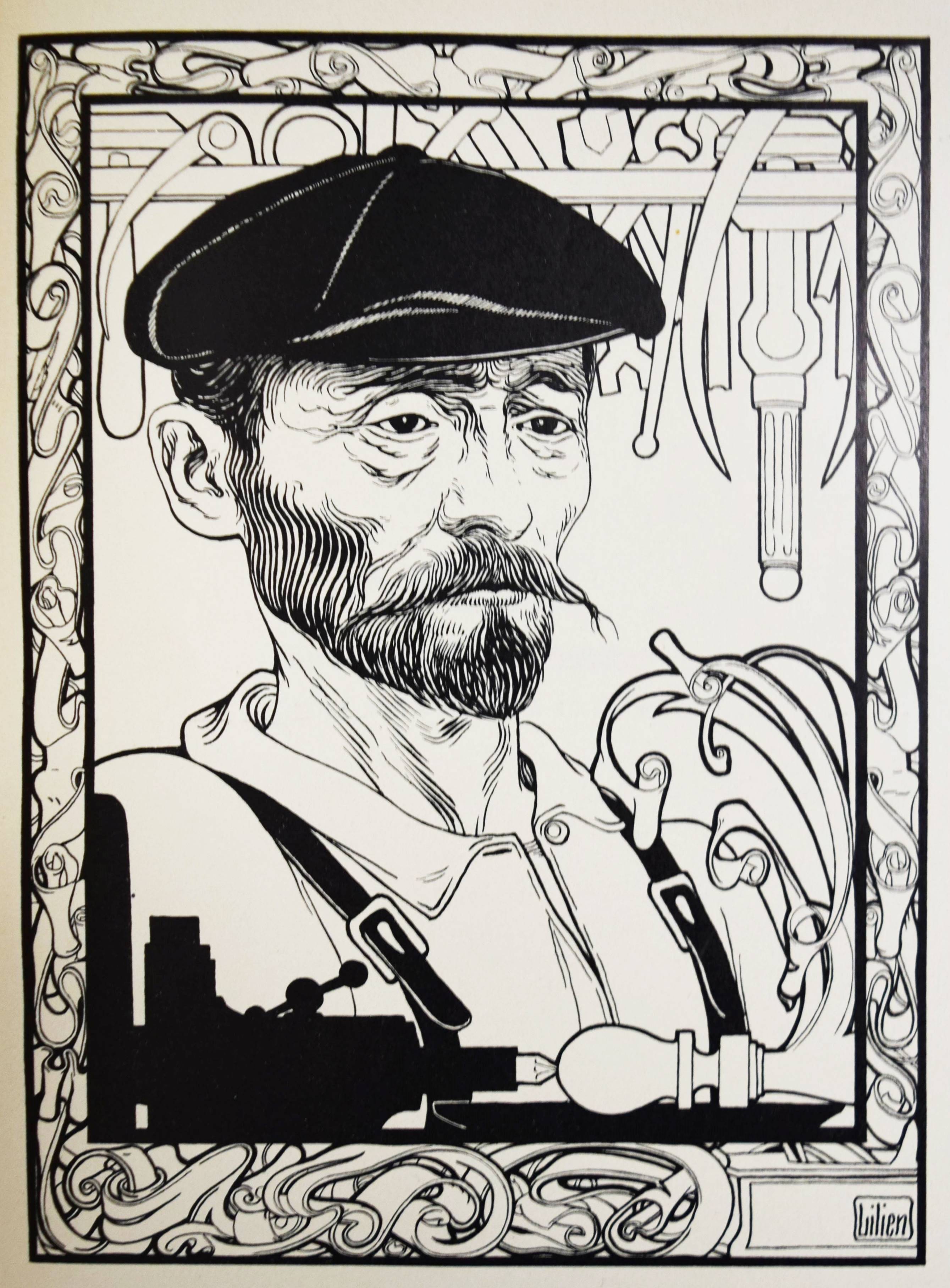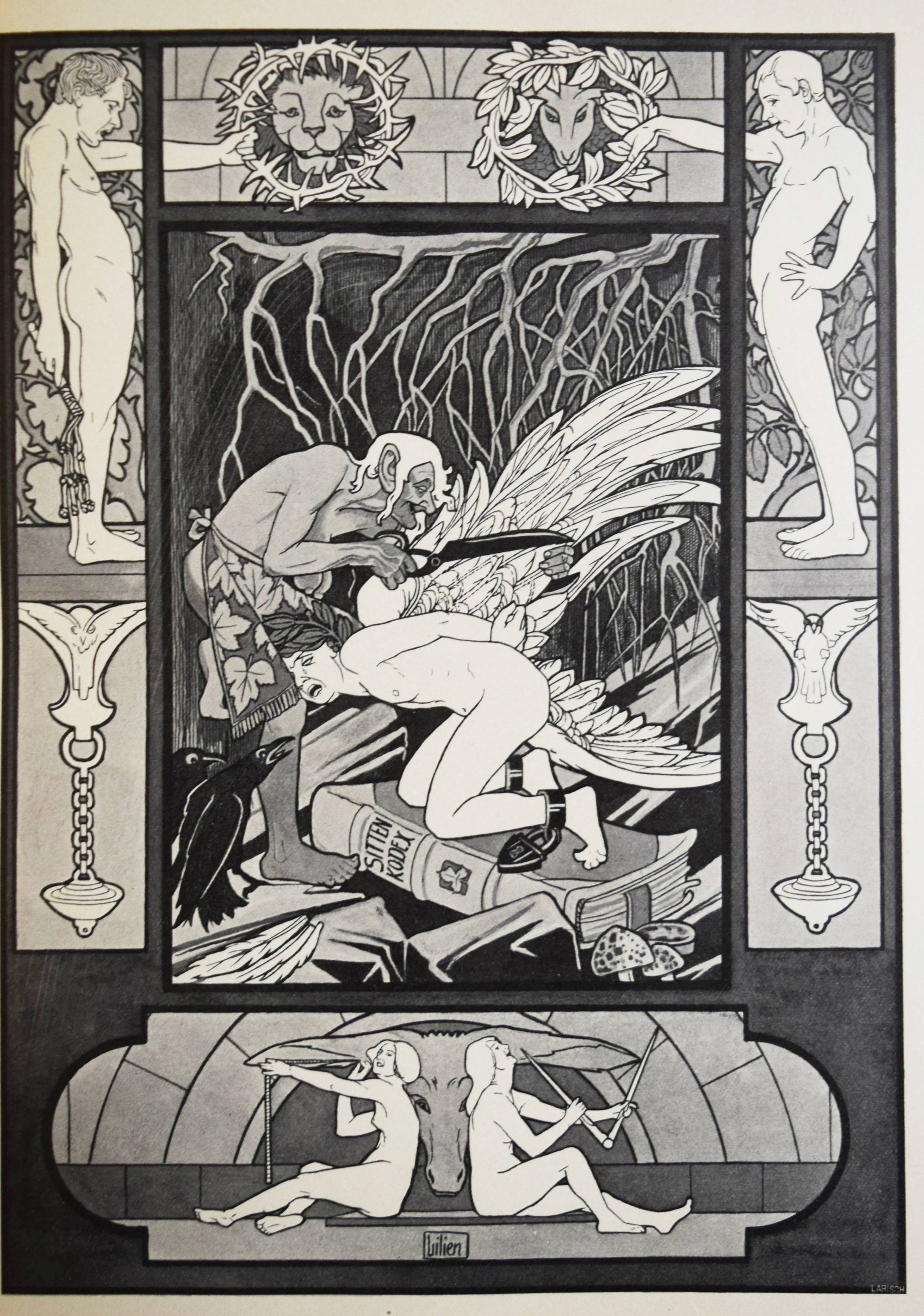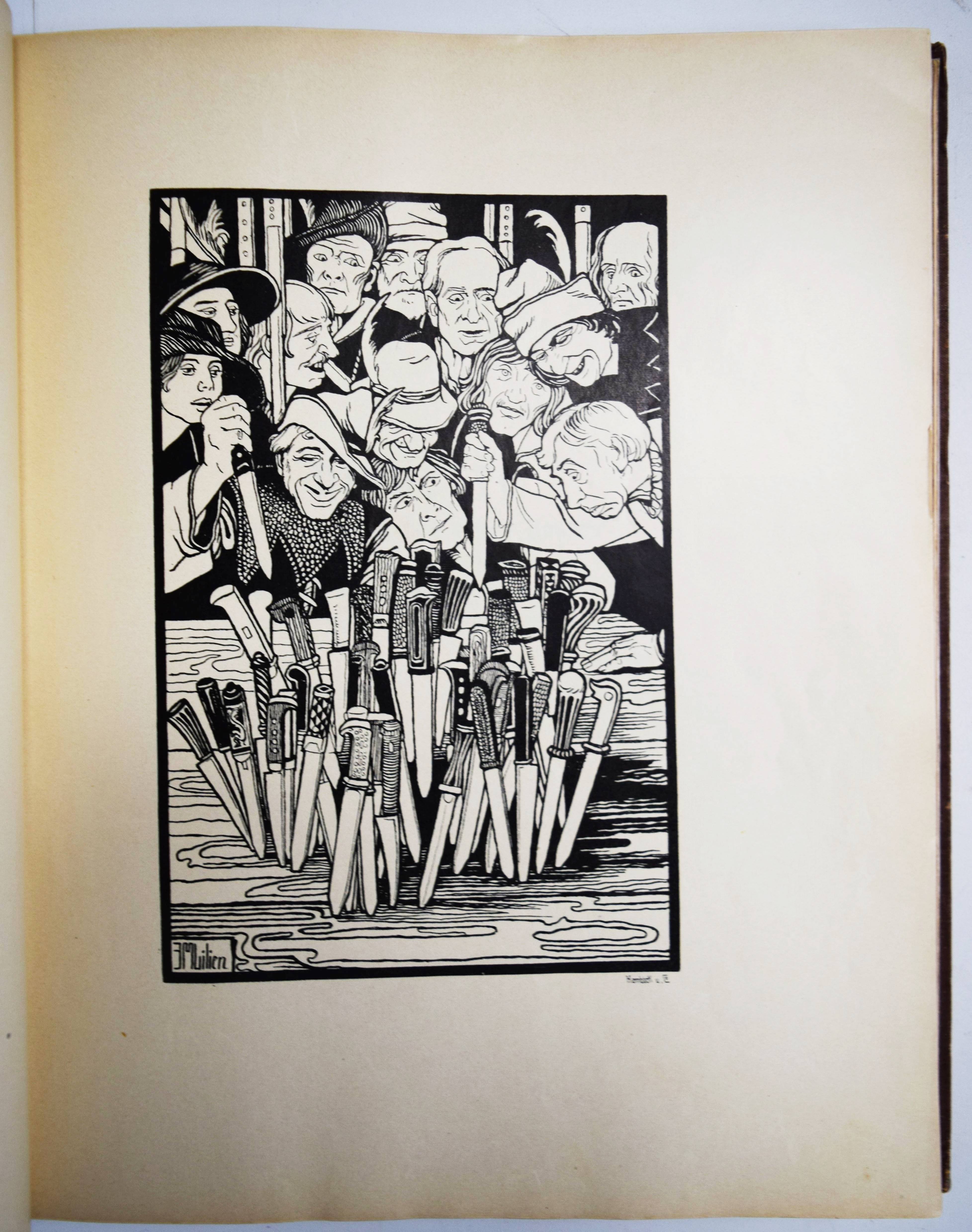 Lilien – Zweig, Stefan (Einleitung). E(phraim) M(ose) Lilien. Sein Werk. Berlin und Leipzig, Schuster & Loeffler 1903. 4° (29,5 x 24 cm.). 347 S., [4] Bl. mit Portrait und zahlr. meist ganzs. Abbildungen. Illustrierter Orig.-Leinenband. NDB XIV, 550 f. und XXVIII, 794 ff. W.-G.² 5 (S. Zweig). – Erste und einzige Ausgabe der in kleiner Auflage erschienenen Monographie über den Jugendstilgraphiker und Illustrator Ephraim Moses Lilien (1874-1925), der mit seinen Arbeiten nachhaltig das Erscheinungsbild der jungen zionistischen Bewegung prägte. – „Stefan Zweig propagierte ihn in einer 1903 erschienenen reich illustrierten Monographie „E. M. Lilien, sein Werk“. L. zählte in Berlin zu den Vertretern der „Jüd. Renaissance“, einer Gruppe um Martin Buber, Berthold Feiwel und Chaim Weizmann, die 1901 den Jüd. Verlag gründete und seit 1902 mit dem Jüd. Almanach hervortrat, dessen künstlerische Leitung L. übernahm. … Mit äußerster Konsequenz verwendet L. in seinem Werk die von Aubrey Beardsley vor der Jahrhundertwende entwickelten Prinzipien einer kontrastreichen Schwarz-Weiß-Zeichenkunst, die auf der Wechselwirkung von geschlossenen Flächen und sensitiver Linienführung beruhen. Dabei findet L. vor allem im Motivischen durch die Konzentration auf jüdische Themen zu einer persönlichen Ausprägung. Er wird damit zum Vertreter des Jugendstils in der jüd. Kunst“ (Hans Ries in NDB). – Einband etwas berieben, Gelenke unauffällig restauriert, stellenweise im Blattrand etwas braunfleckig, gutes Exemplar.
