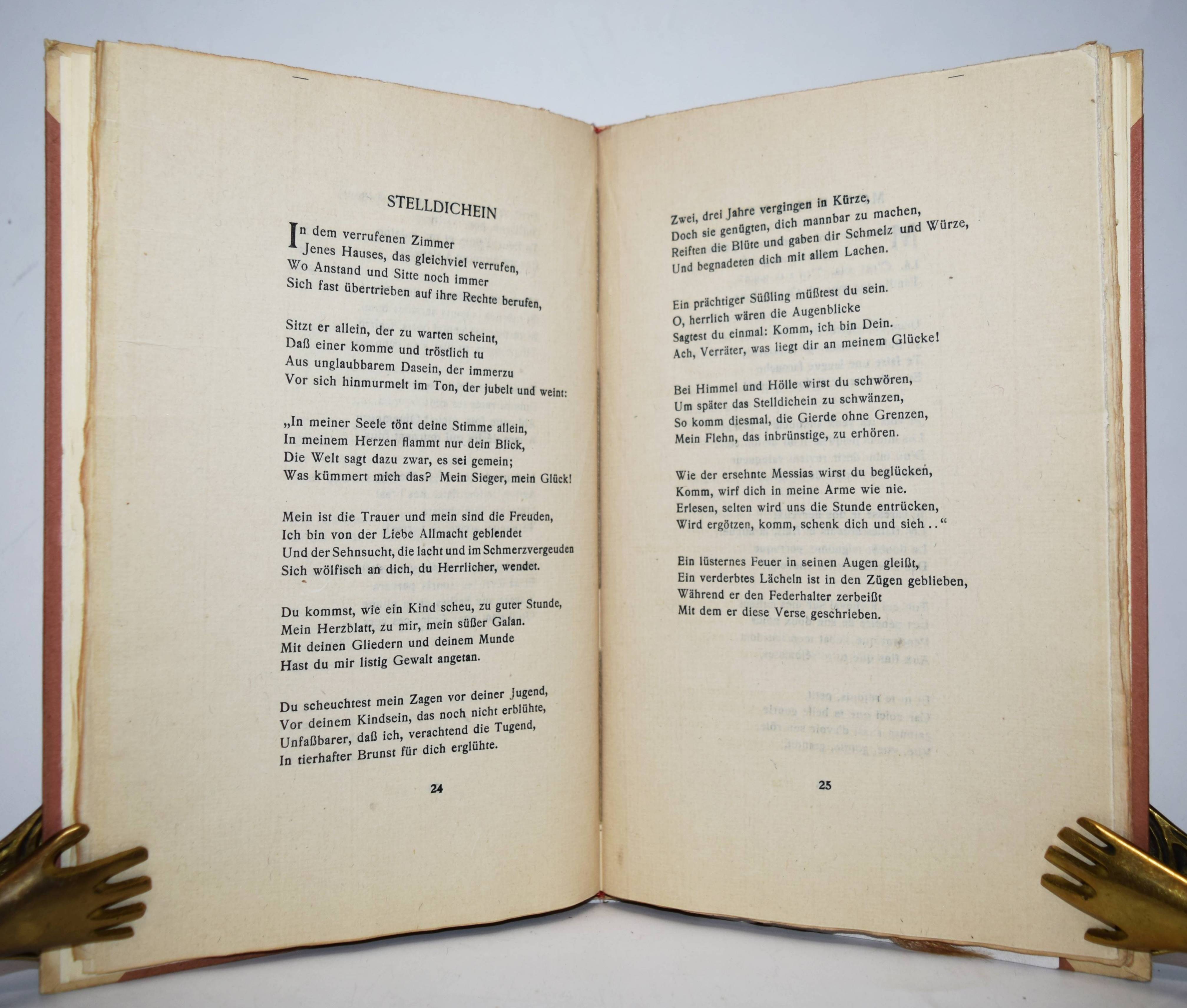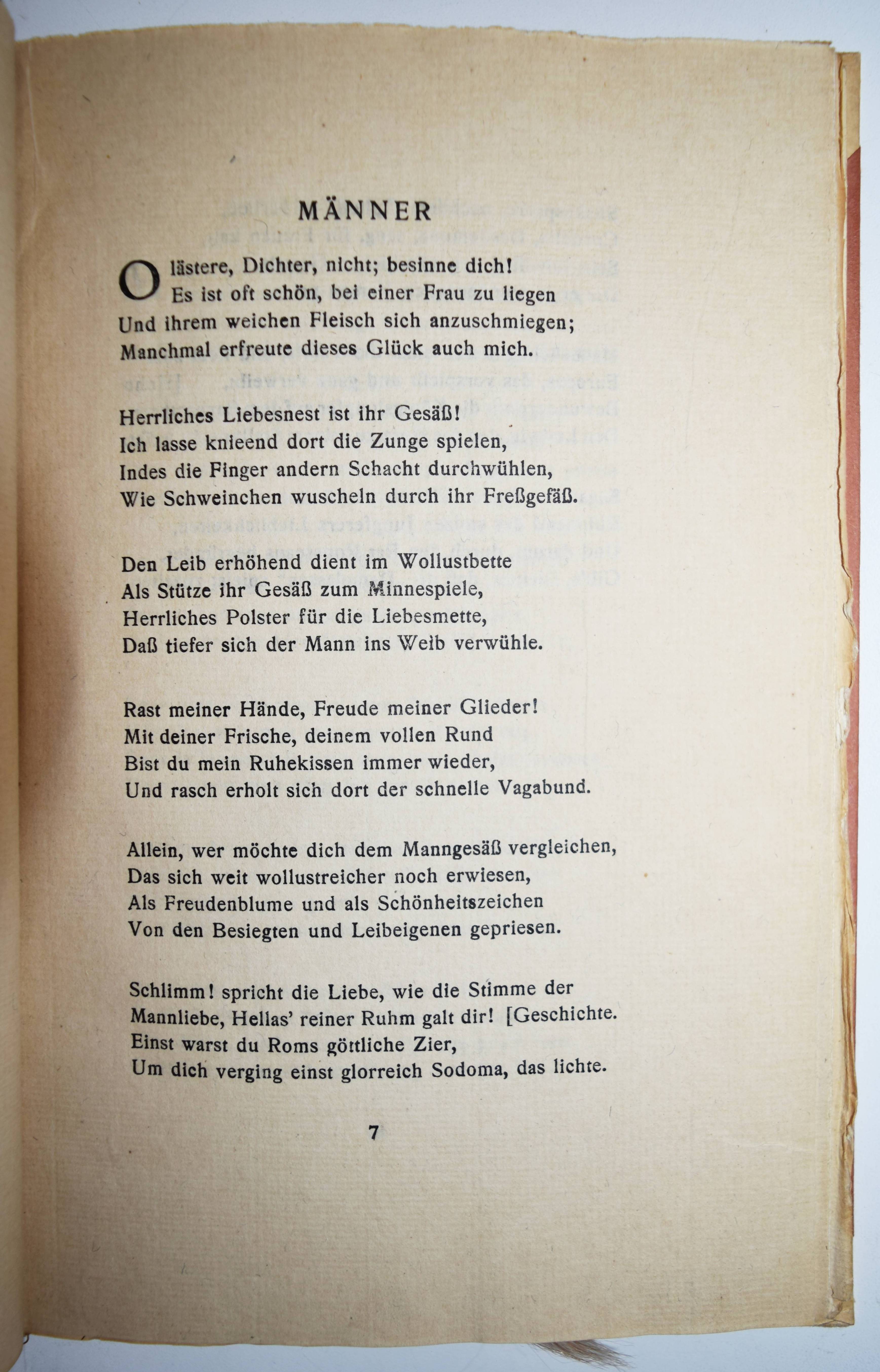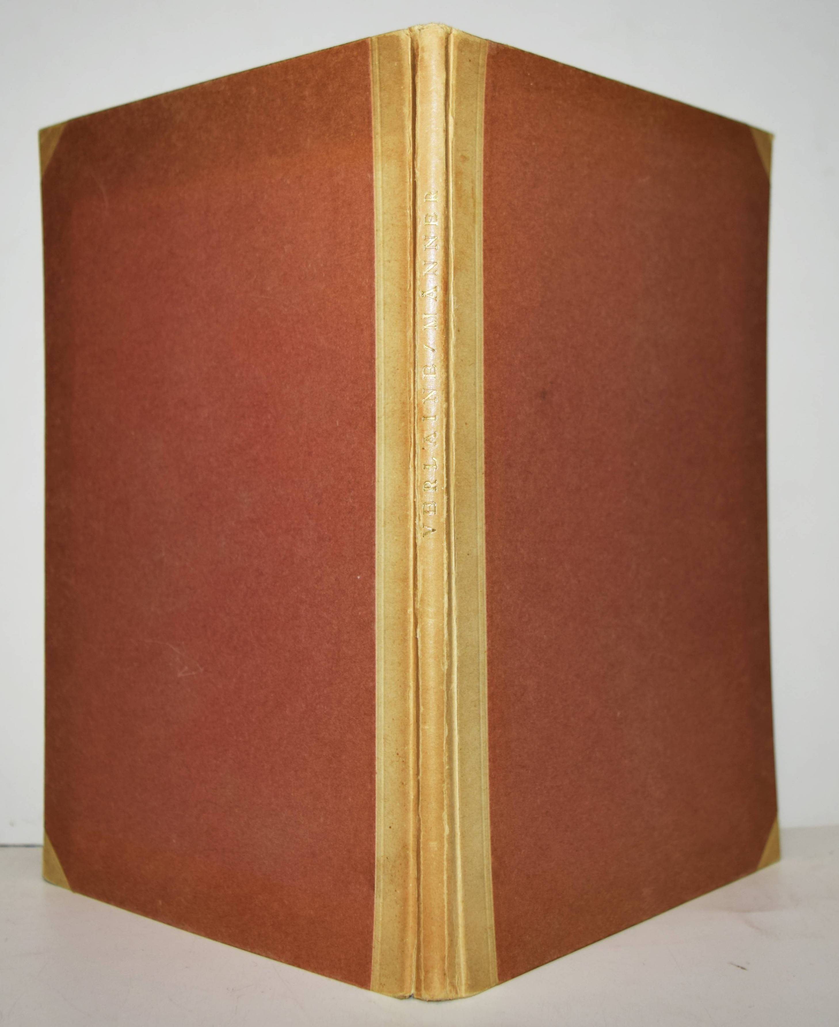 Verlaine, Paul. Männer. Deutsche und Französische Ausgabe des Buches Hombres. (Übersetzt von Curt Moreck und Hans Schiebelhuth). (Zürich, Offizin I. H. François i. e. Hannover, Paul Steegemann 1920). Gr.-8°. 54 S., [1] Bl. Orig.-Halbpergamentband mit goldgepr. Rückentitel. Hayn-Gotendorf IX, 605. Pia 652. Raabe 210.76. – Privatdruck, Nr. 772 von 1100 Exemplaren auf handgeschöpftes Büttenpapier. Eine der ersten deutschen Ausgaben der Sammlung homoerotischer Gedichte, die Verlaine für seinen Liebhaber Arthur Rimbaud verfasste. Die französische Original-Ausgabe erschien posthum 1903 als der letzte von drei erotischen Gedichtbänden des Autors nach „Les Amies“ (1867) und „Femmes“ (1891), die weibliche Homosexualität bzw. Heterosexualität behandeln. – Mit beiligendem Subskriptions-Prospekt, gutes Exemplar.