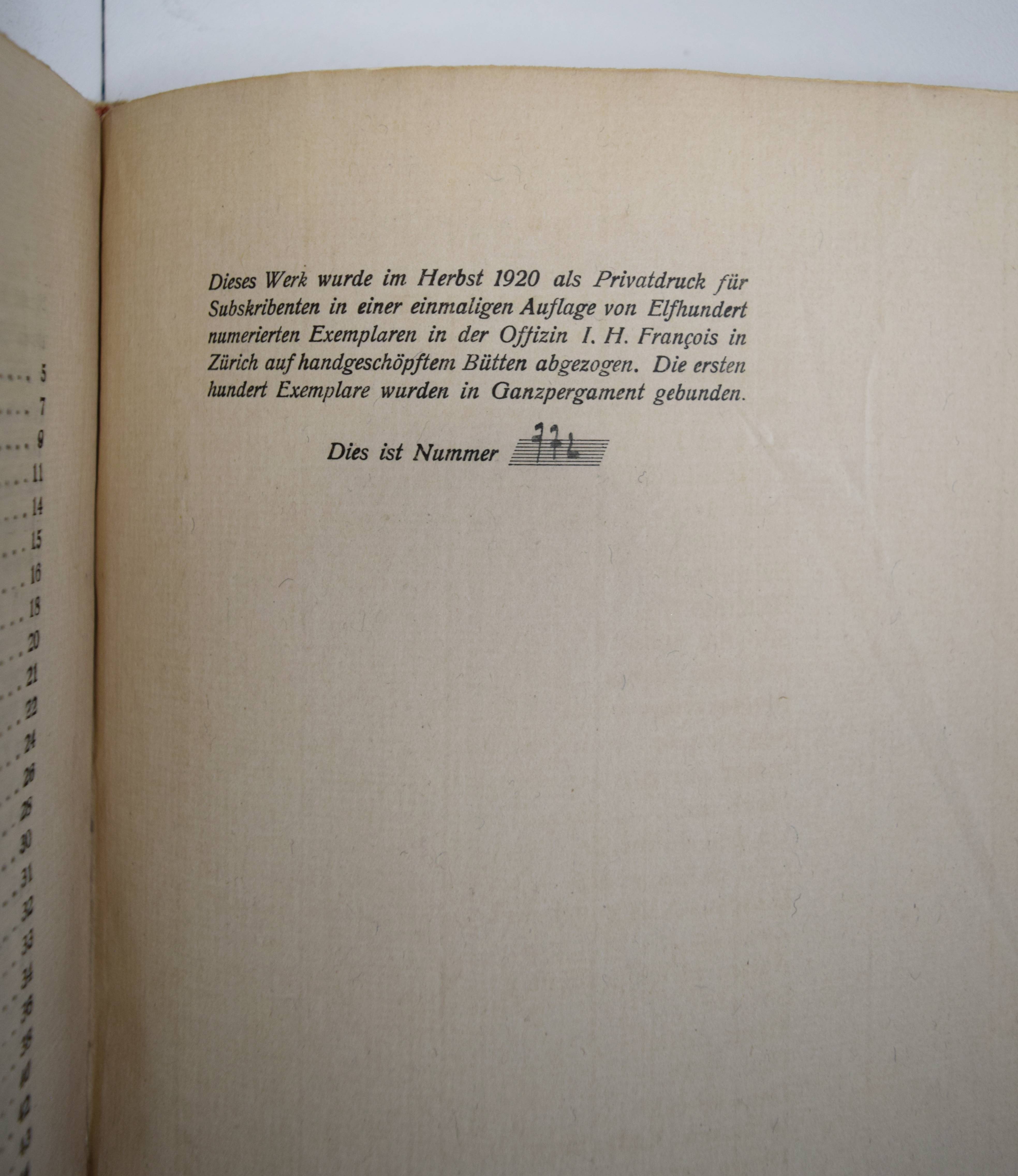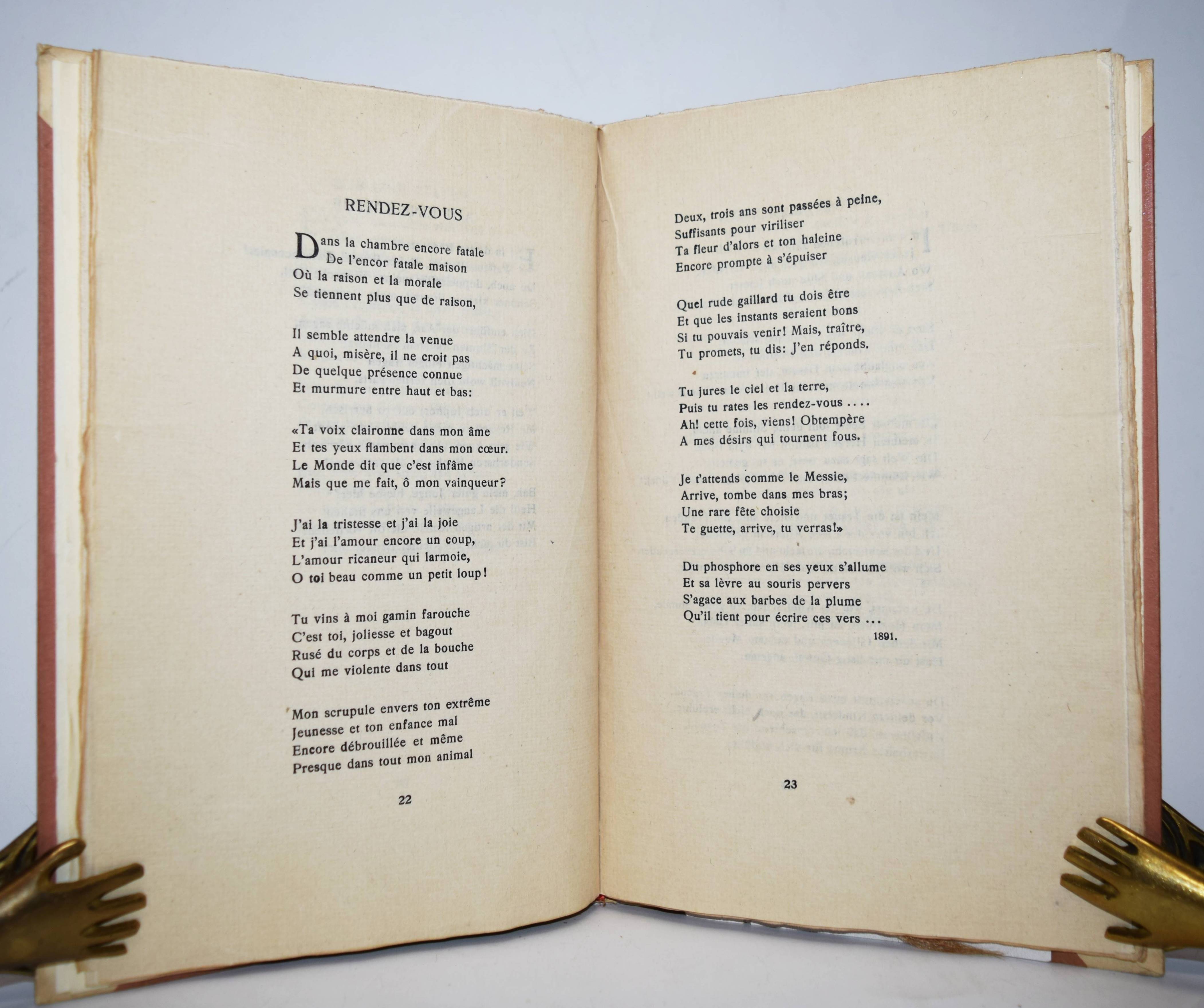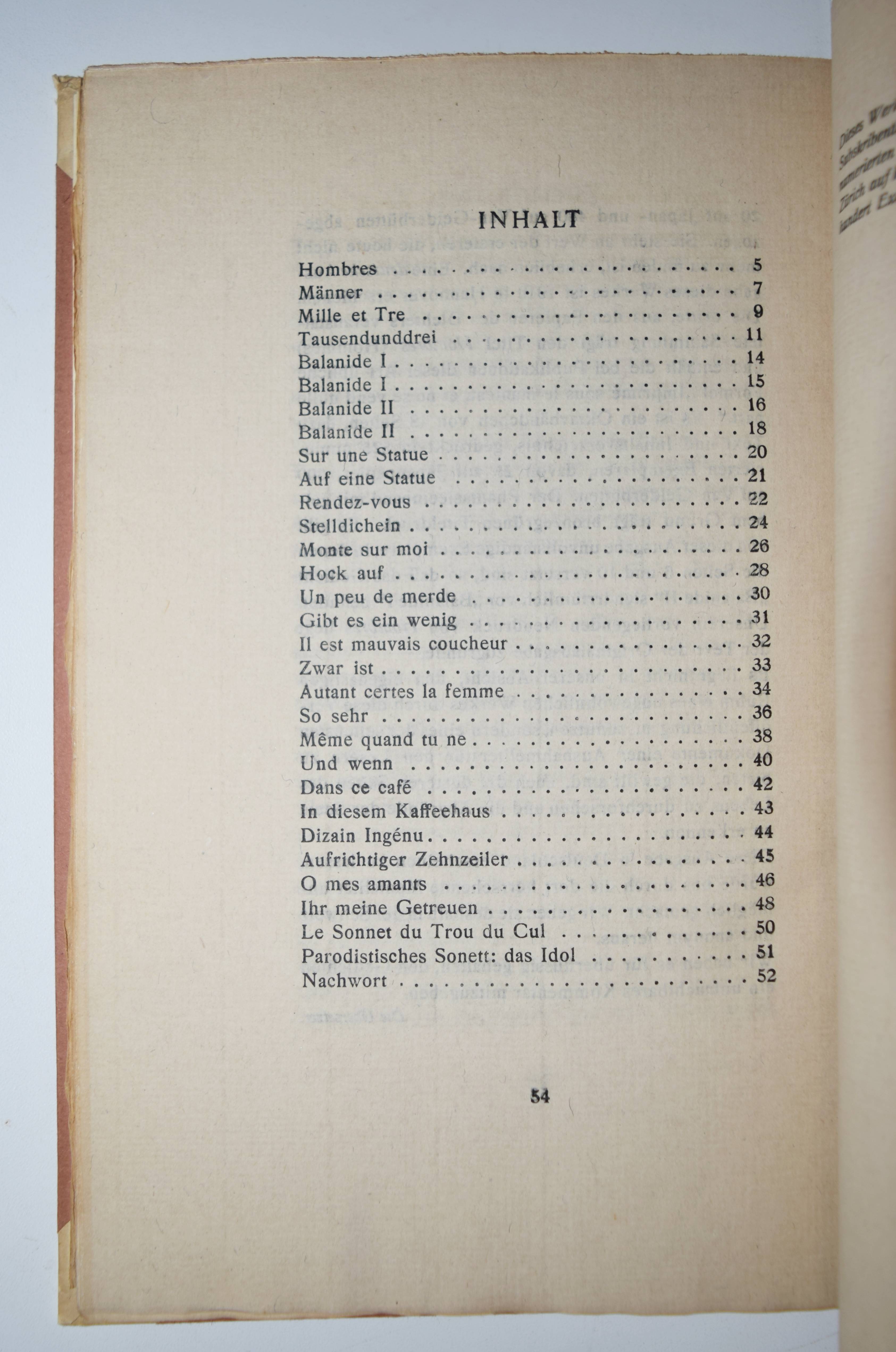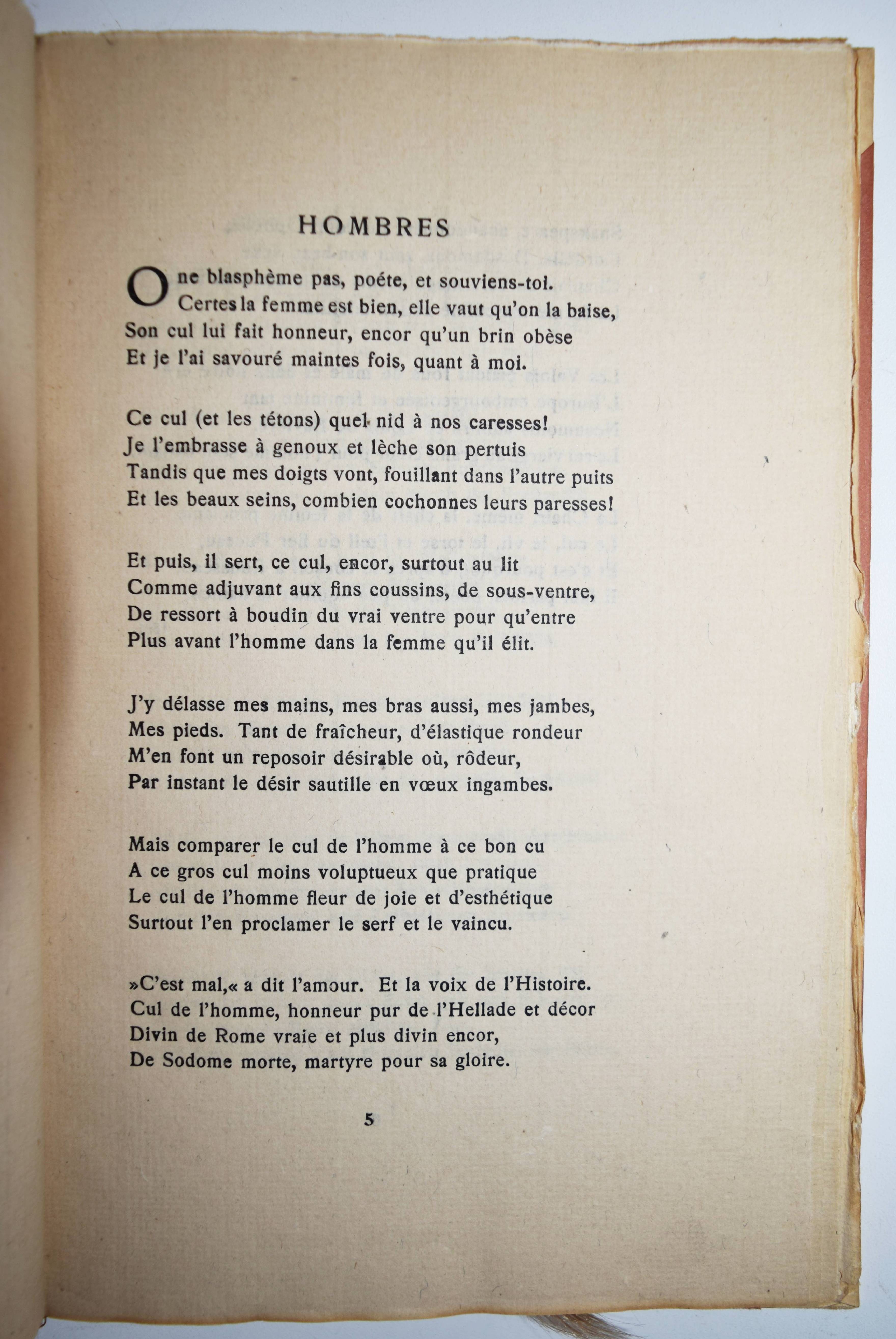 Verlaine, Paul. Männer. Deutsche und Französische Ausgabe des Buches Hombres. (Übersetzt von Curt Moreck und Hans Schiebelhuth). (Zürich, Offizin I. H. François i. e. Hannover, Paul Steegemann 1920). Gr.-8°. 54 S., [1] Bl. Orig.-Halbpergamentband mit goldgepr. Rückentitel. Hayn-Gotendorf IX, 605. Pia 652. Raabe 210.76. – Privatdruck, Nr. 772 von 1100 Exemplaren auf handgeschöpftes Büttenpapier. Eine der ersten deutschen Ausgaben der Sammlung homoerotischer Gedichte, die Verlaine für seinen Liebhaber Arthur Rimbaud verfasste. Die französische Original-Ausgabe erschien posthum 1903 als der letzte von drei erotischen Gedichtbänden des Autors nach „Les Amies“ (1867) und „Femmes“ (1891), die weibliche Homosexualität bzw. Heterosexualität behandeln. – Mit beiligendem Subskriptions-Prospekt, gutes Exemplar.