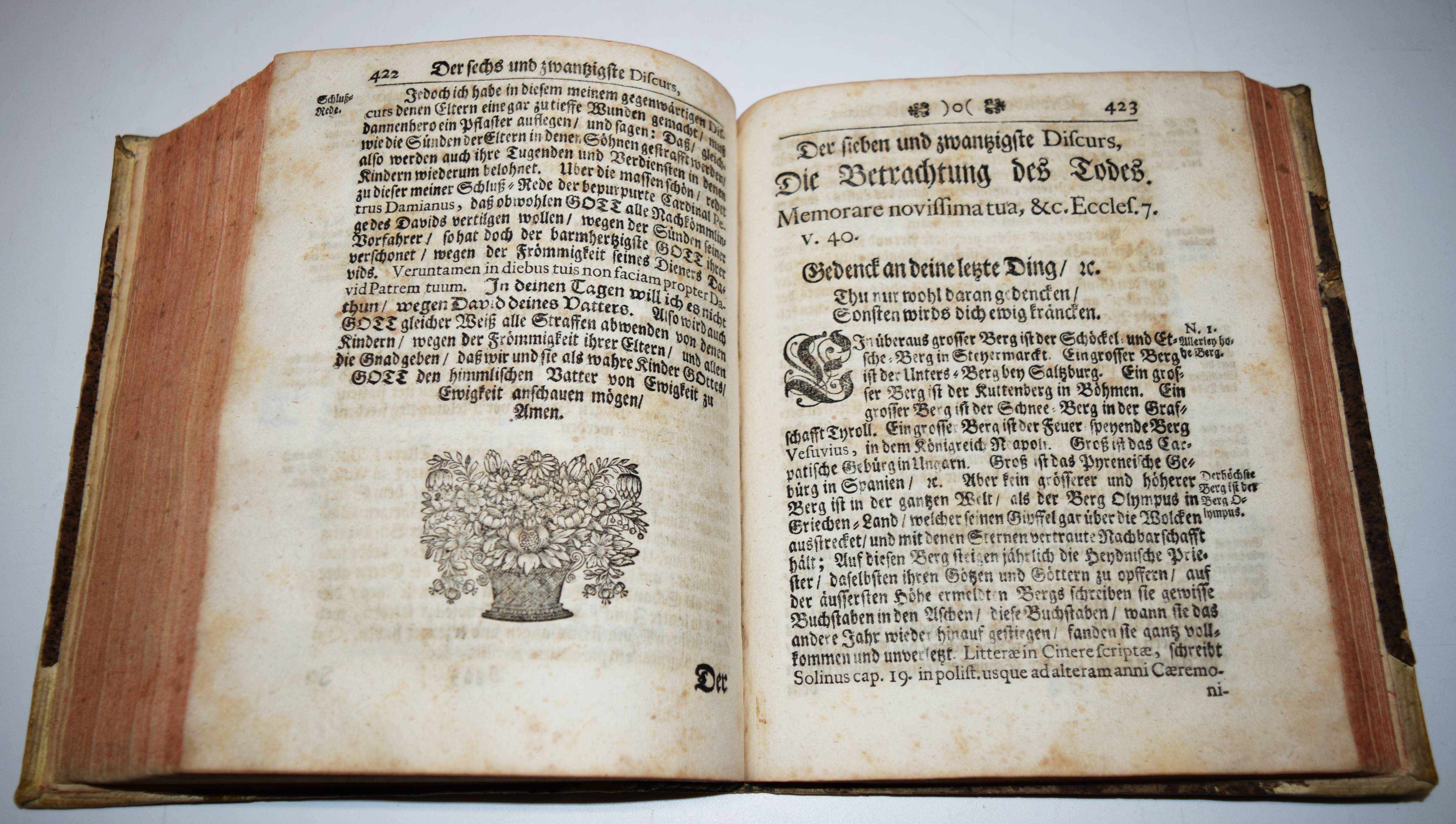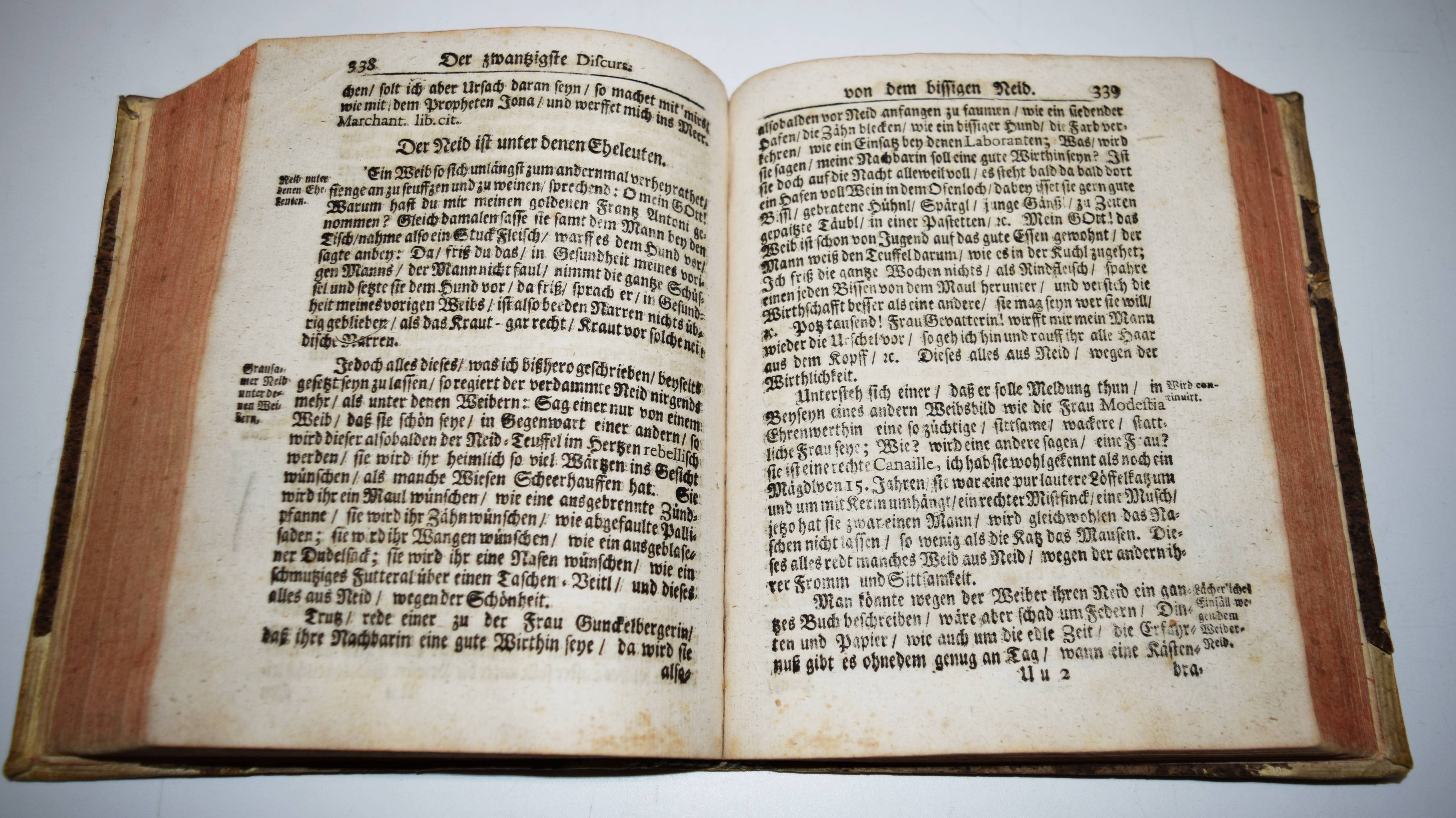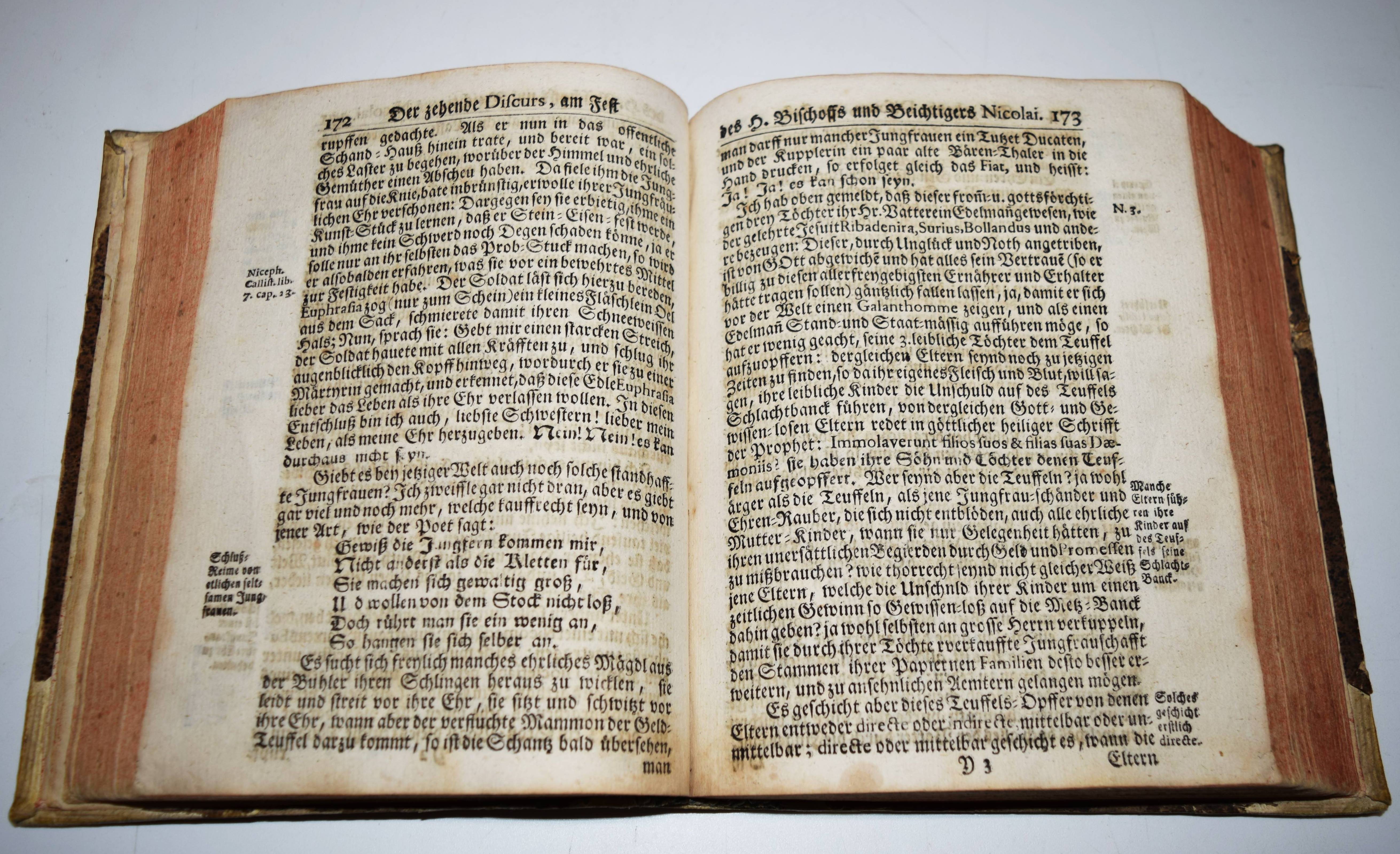 Abraham a Santa Clara (d. i. Ulrich Megerle). Abrahamisches Gehab dich wohl! oder Urlaube / In diesem End-Wercke seiner Schrifften / Schaue hinein / und lise das / Und mach dir ein Knopf auf die Nas… Wien und Nürnberg, Johann Paul Krauß 1738. Gr.-8° (20,5 x 16 cm.). Titel in Rot und Schwarz, [8] Bl., 505 (1) S., [18] Bl. mit gestoch. Frontispiz. Halb-Schweinslederband der Zeit mit handschr. Rückentitel Dünnhaupt 56.1. Goedeke III, 241, 32. – Erschien zuerst posthum 1729 bei Lehmann in Wien. – „Der sprachgewaltigste der christlichen Prediger im deutschen Sprachraum des 17. Jahrhunderts“ (Wikipedia) behandelt in dem Werk in 32 zeit- und kulturgeschichtlich interessanten „Discursen“ Faulheit, Falschheit, Neid, Fasten, die „Entheiligung derer Sonn-und Feyertägen“, Teufel, Priestertum, Geld, „der Weiber Boßheit“, Ehe, Beruf, Tod u.a. – Besonders interessant ist der 10. „Disurs“: „Am Fest des H. Bischoffs und Beichtigers Nicolai… Förchtet euch nicht dann ich bin da / Und stell heunt vor den Nicola“ darin beschreibt Megerle Teufelsgestalten als Begleiter des Heiligen Nikolaus (280/286-351). Der Text gilt als eine der frühen christlichen Quellen für die Nikolaus-Legende. – Vorderdeckel mit Abriebstelle, Stempel verso Frontispiz, stellenweise etwas braun- und fingerfleckig, insgesamt gutes Exemplar dieses seltenen Barock-Werkes.