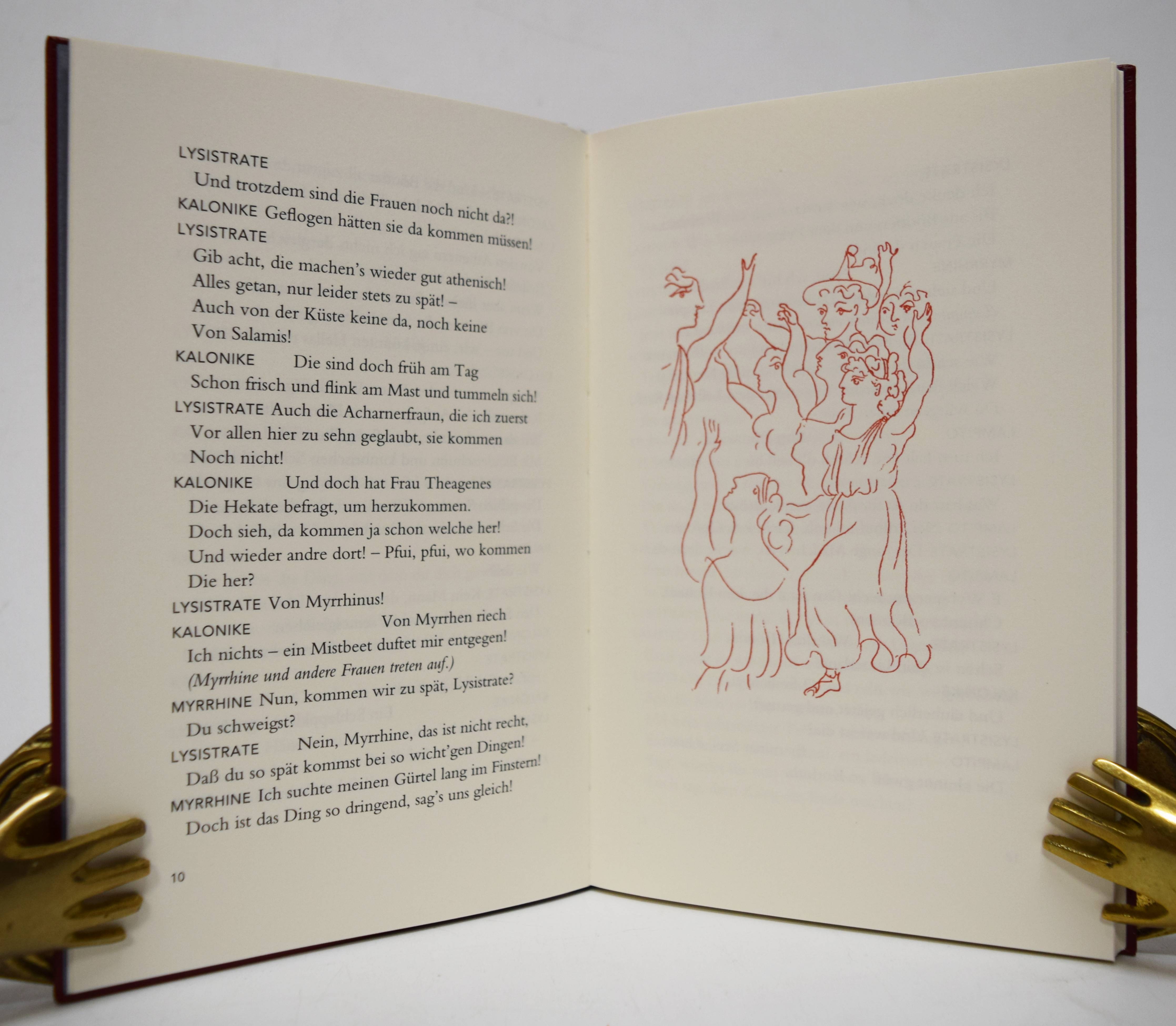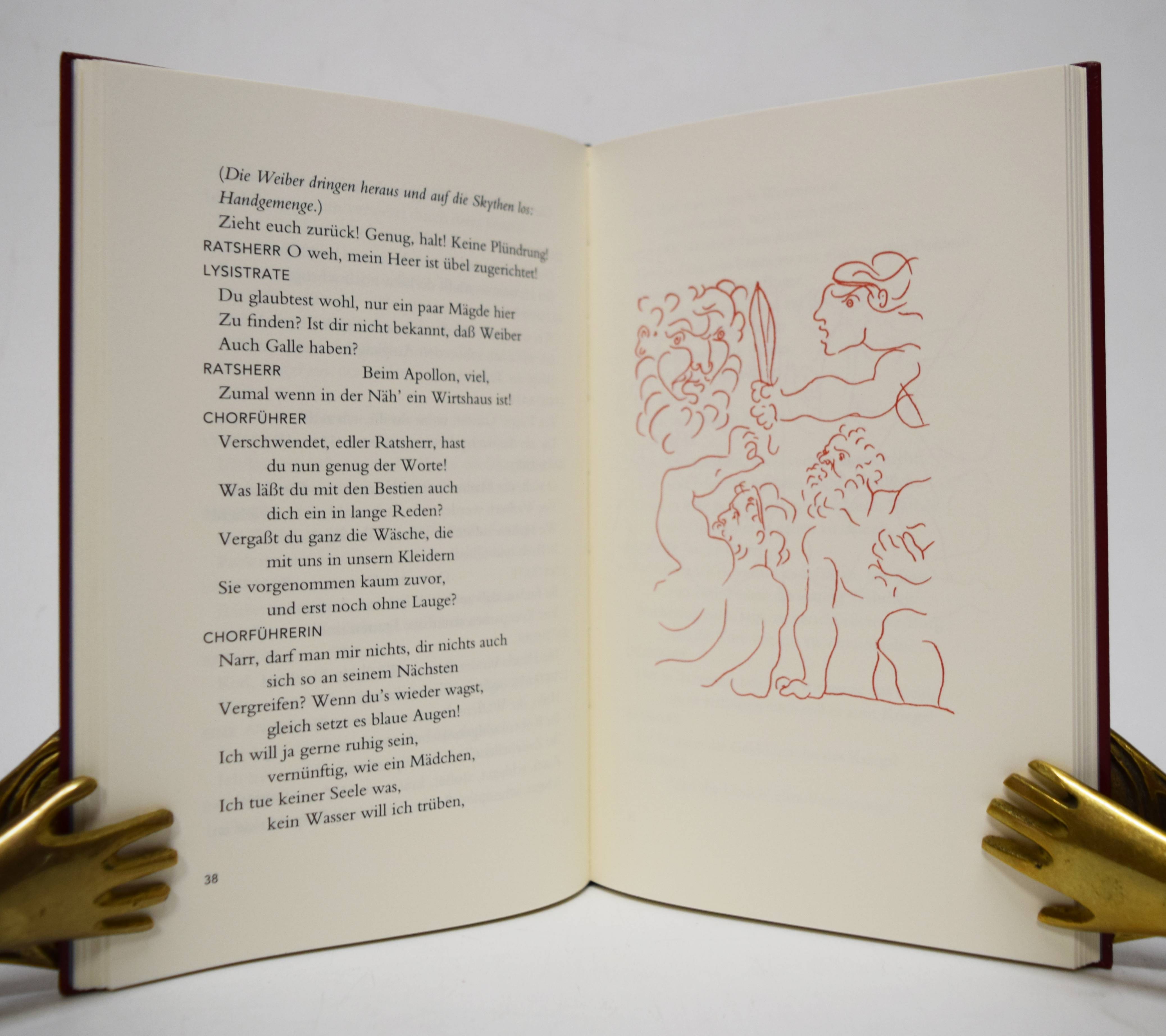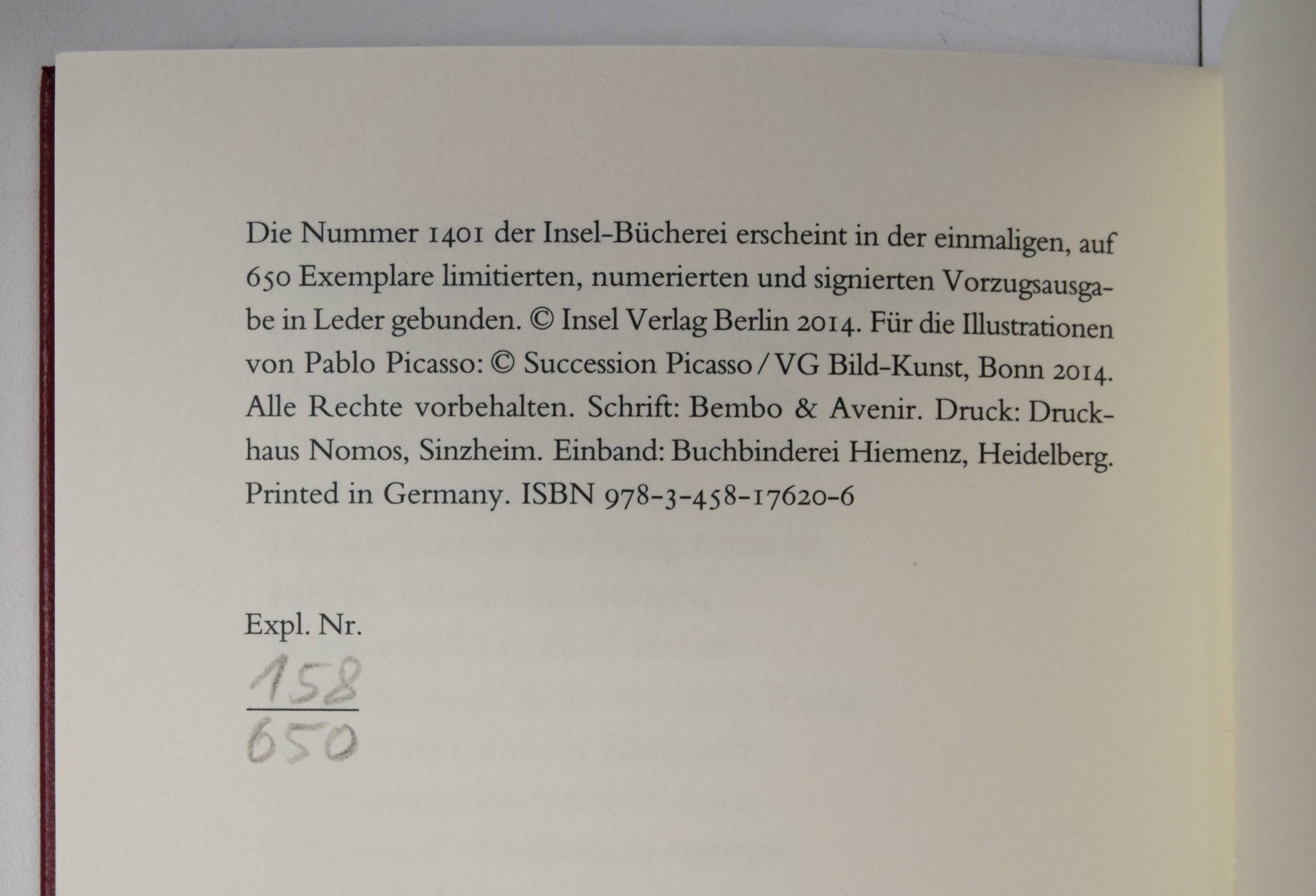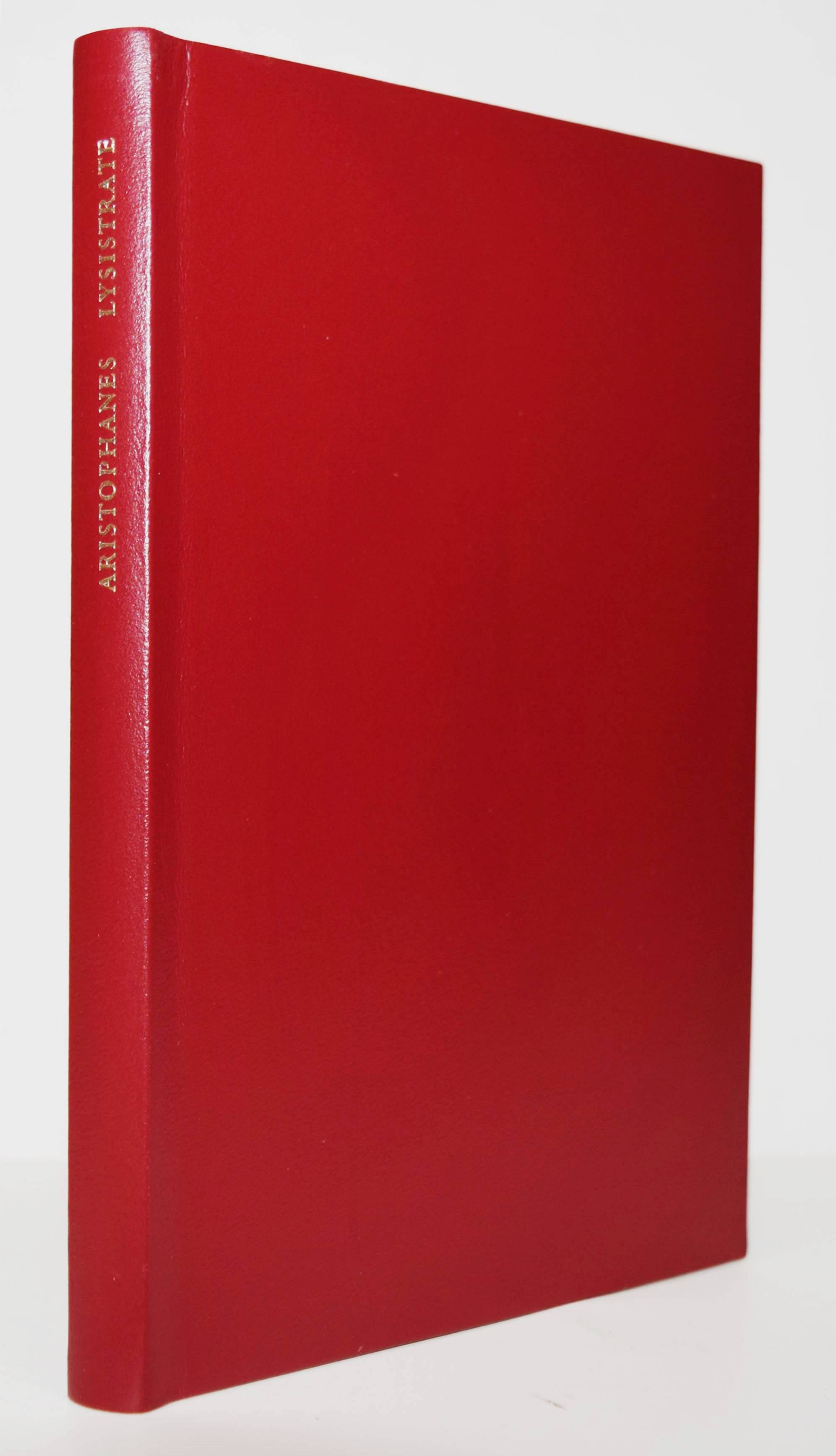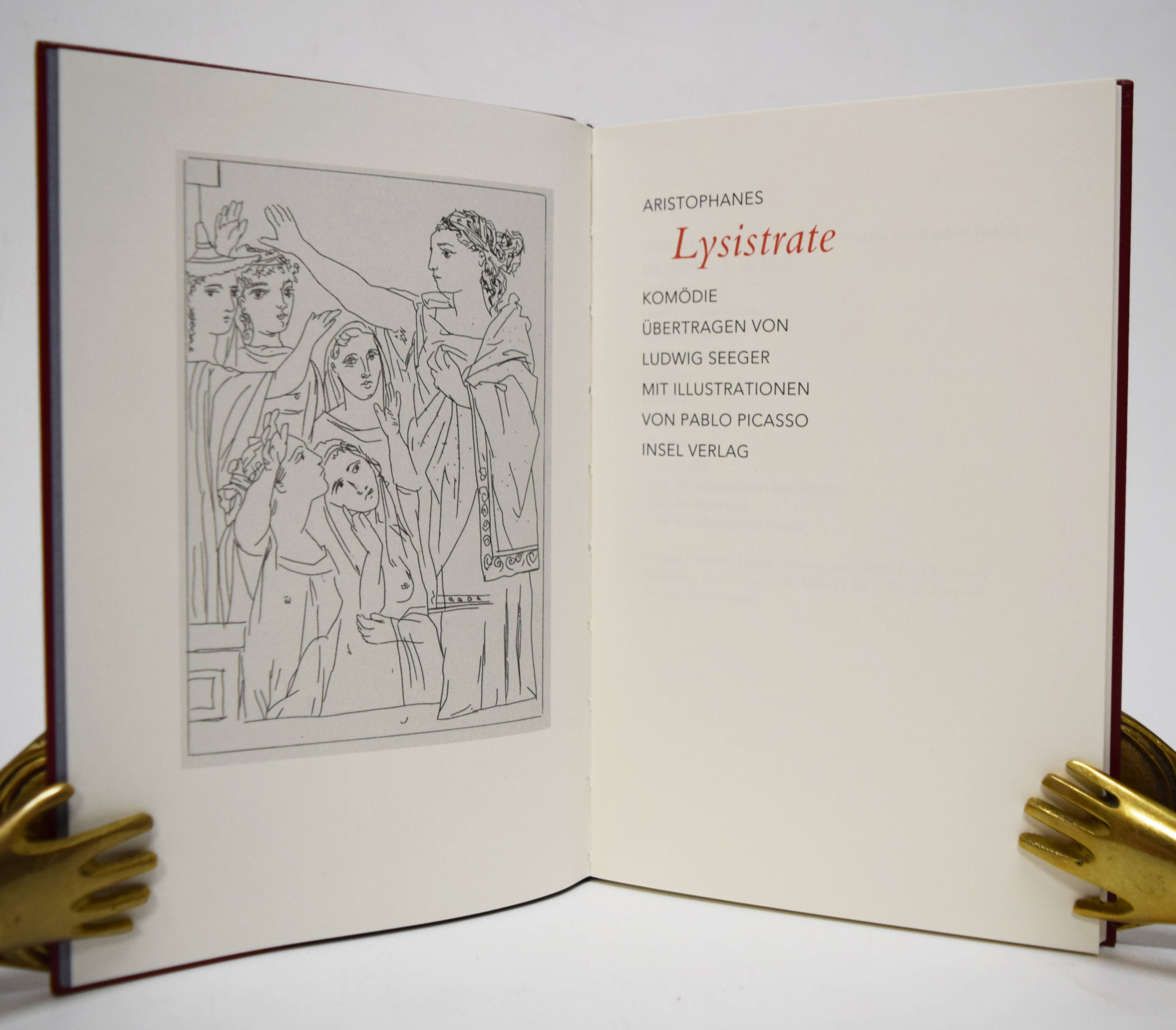 Aristophanes. Lysistrate. Komödie. Übertragen von Ludwig Seeger. Mit Illustrationen von Pablo Picasso. Frankfurt am Main, Insel-Verlag 2014. 8°. 106 S., [1] Bl. mit 22 ganzs. Illustrationen. Dunkelroter Orig.-Lederband mit goldgepr. Rückentitel (Herstellung: Buchbinderei Hiemenz, Heidelberg) und Pappschuber. (Insel-Bücherei, Band 1401). Eines von 650 Exemplaren der Vorzugsaugabe. – Sehr gutes Exemplar.