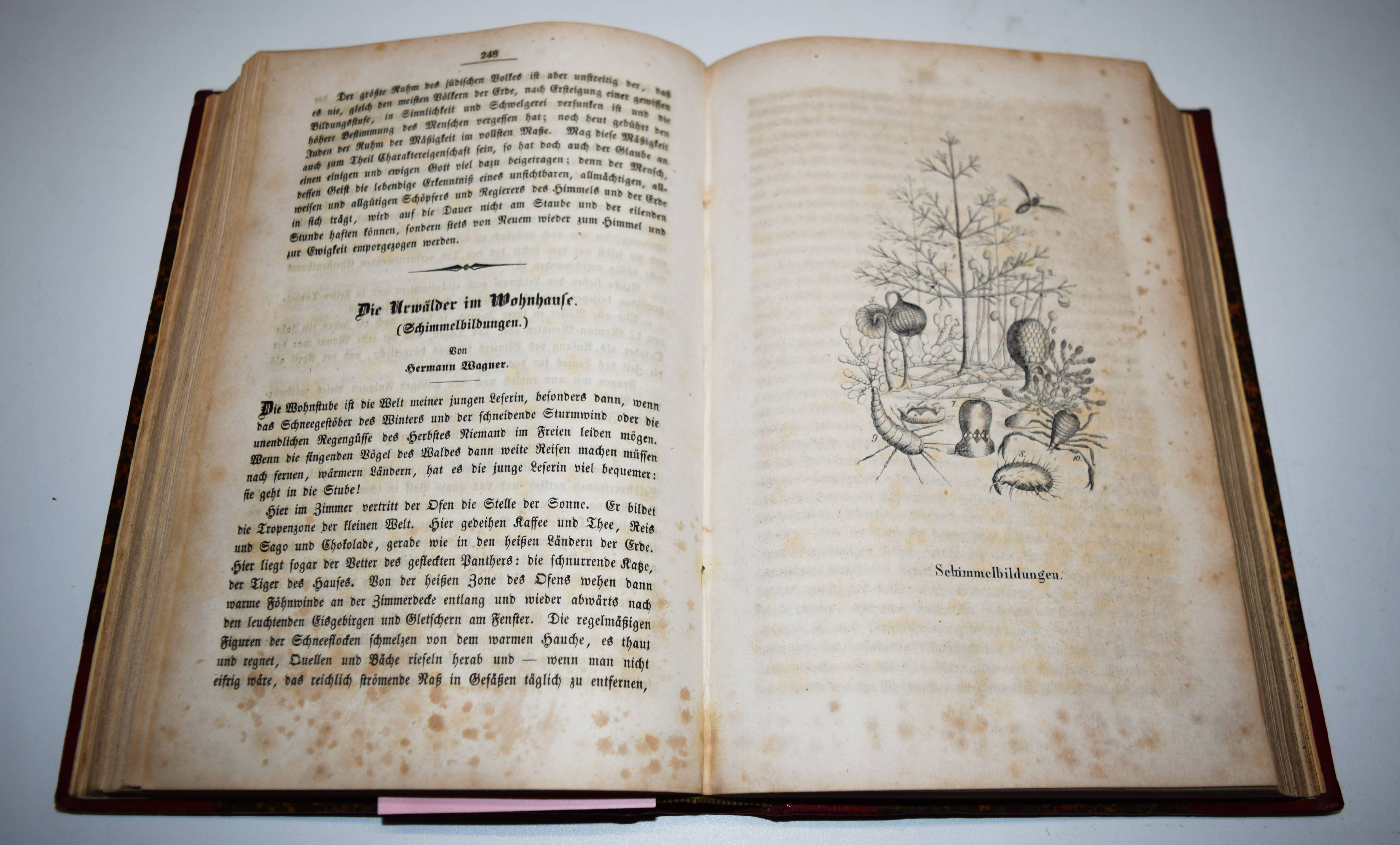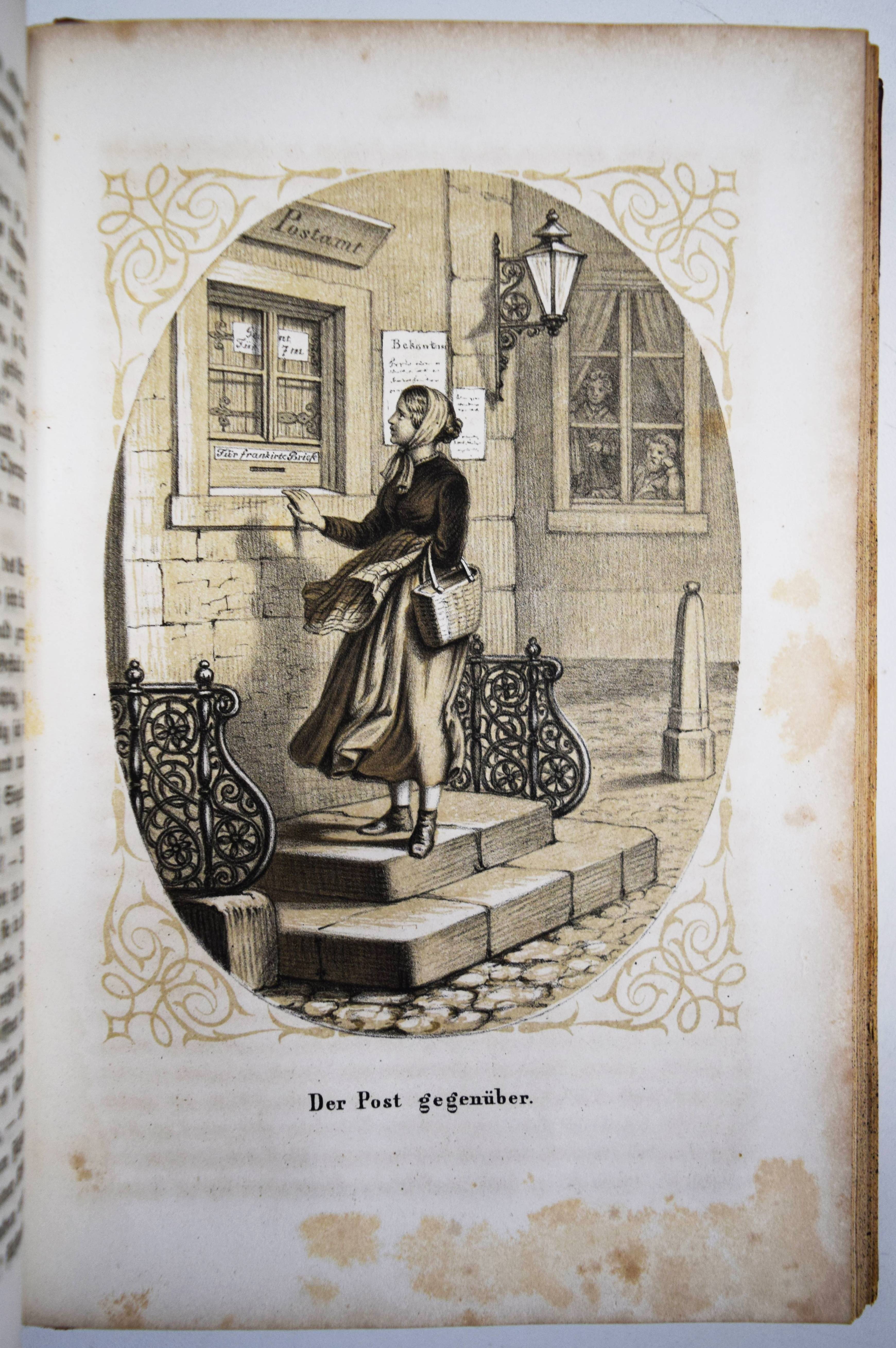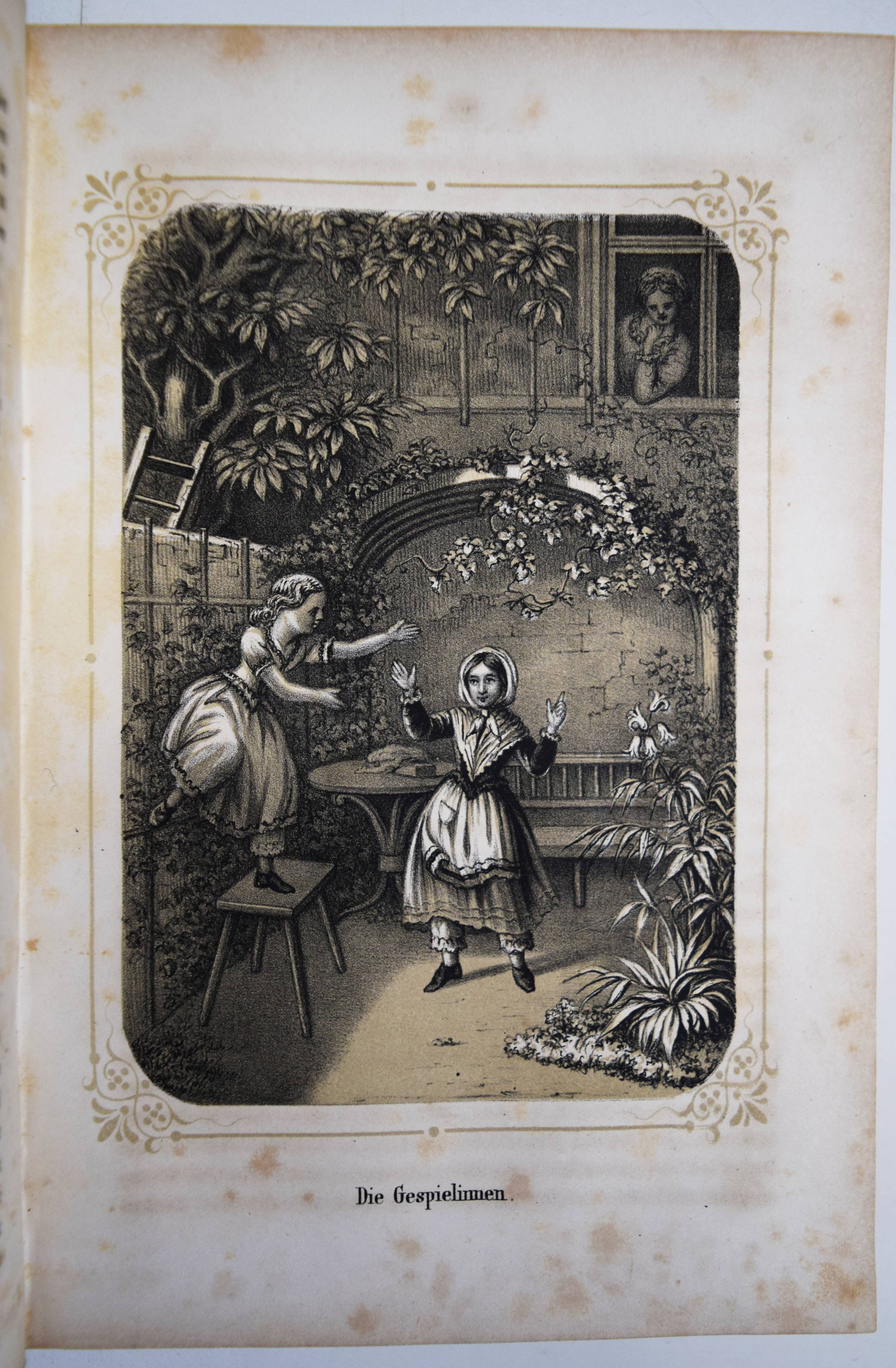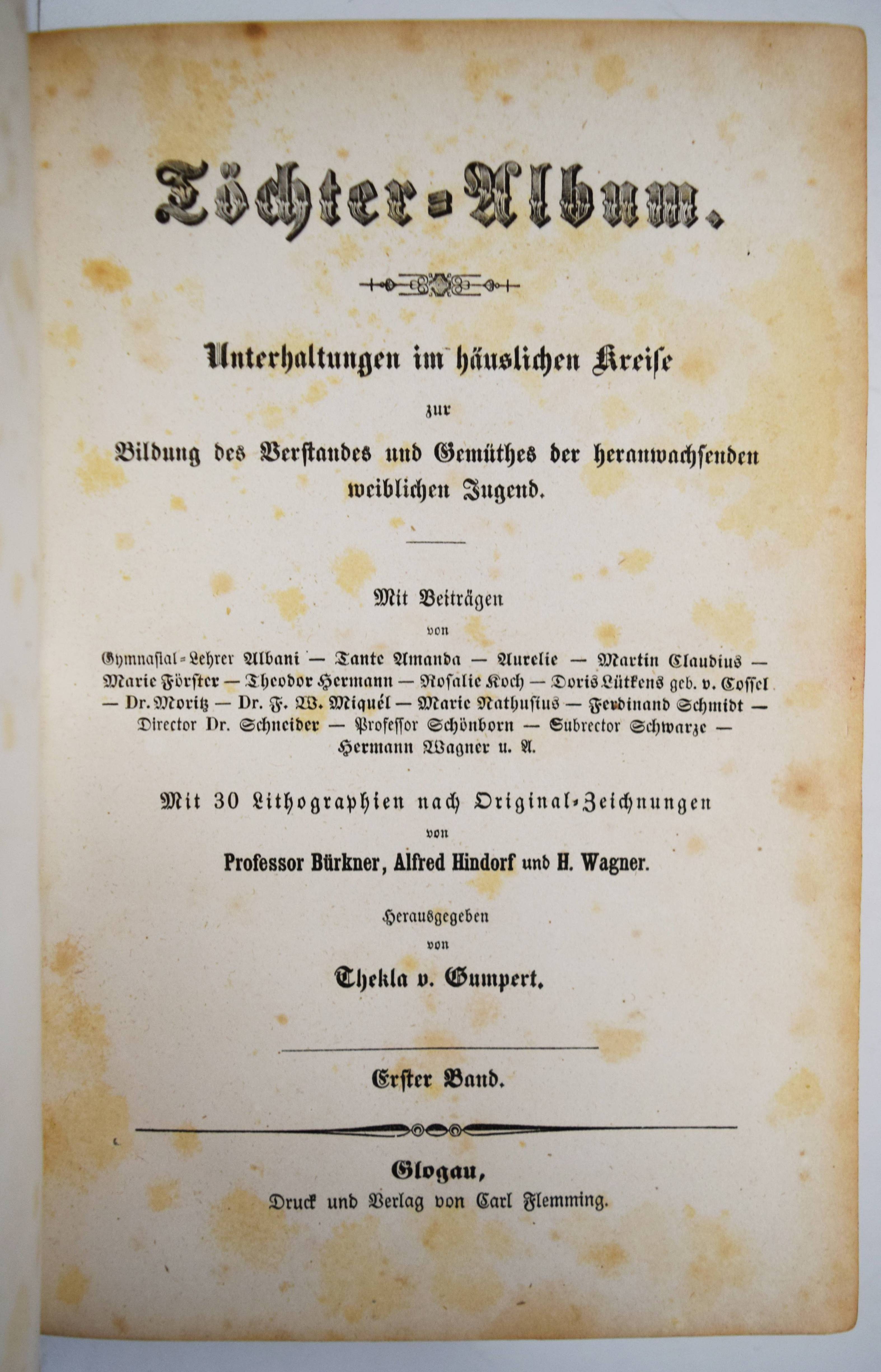 Gumpert, Thekla v. (d. i. Thekla von Schober, Hrsg.). Töchter-Album. Unterhaltungen im häuslichen Kreise zur Bildung des Verstandes und Gemüthes der heranwachsenden weiblichen Jugend. Erster Band. Glogau, Carl Flemming o. J. (1855). Gr.-8°. [3] Bl., 599, (1) S. mit 30 lithogr. Tafeln, davon 14 mit Tonplatte von (Hugo) Bürkner, Alfred Hindorf und H(ermann) Wagner. Weinroter Halblederband der Zeit mit goldgepr. Rückenschild und Rückenvergoldung (illustr. Orig.-Umschlag beigebunden). Bilderwelt 1289. Slg. Brüggemann I, 829. HKJL IV, 910. Hobrecker 129. LKJ I, 512 und III, 544 f. Seebaß II, 2053. Wegehaupt IV, 2737. – Seltener erster Jahrgang des, neben dem „Herzblättchen“ erfolgreichsten Mädchen-Jahrbuchs des 19. Jahrhunderts. – „Erster Band des – ursprünglich als Zeitschrift veröffentlichten Jahrbuchs, das bis 1930 regelmäßig erschien und danach unter dem Titel „Mädeljahr“ noch einige Jahre fortgeführt wurde. Zur Herausgeberin Thekla von Gumpert, zugleich Verfasserin vieler Beiträge, hauptsächlich Erzählungen, vgl. M. Dahrendorf in Lexikon KJL 1, S, 512 f., wo gegenüber ihrem Werk wegen seines Mangels an literarischer Qualität und seiner restaurativen Erziehungsintentionen (so Dahrendorf) ein kritischer Standpunkt eingenommen wird. Die seit Wolgast (1896) vorherrschenden z. T. kraß ablehnenden Stellungnahmen werden in einem weiteren Artikel im Lexikon KJL III, S. 544 f. ausführlicher referiert. Eine eingehende Würdigung dieses im Geschmack seiner Zeit anspruchsvoll ausgestatteten und beim Bürgertum der 2. Hälfte des 19. Jahrhunderts sehr beliebten Jahrbuchs unternimmt Roswitha Budeus-Budde in ihrer Untersuchung: Das „Töchter-Album“ von Thekla von Gumpert. Phil. Diss. Innsbruck 1984“ (T. Brüggemann). – Durchgehend etwas braunfleckig, gutes dekorativ gebundenes Exemplar.