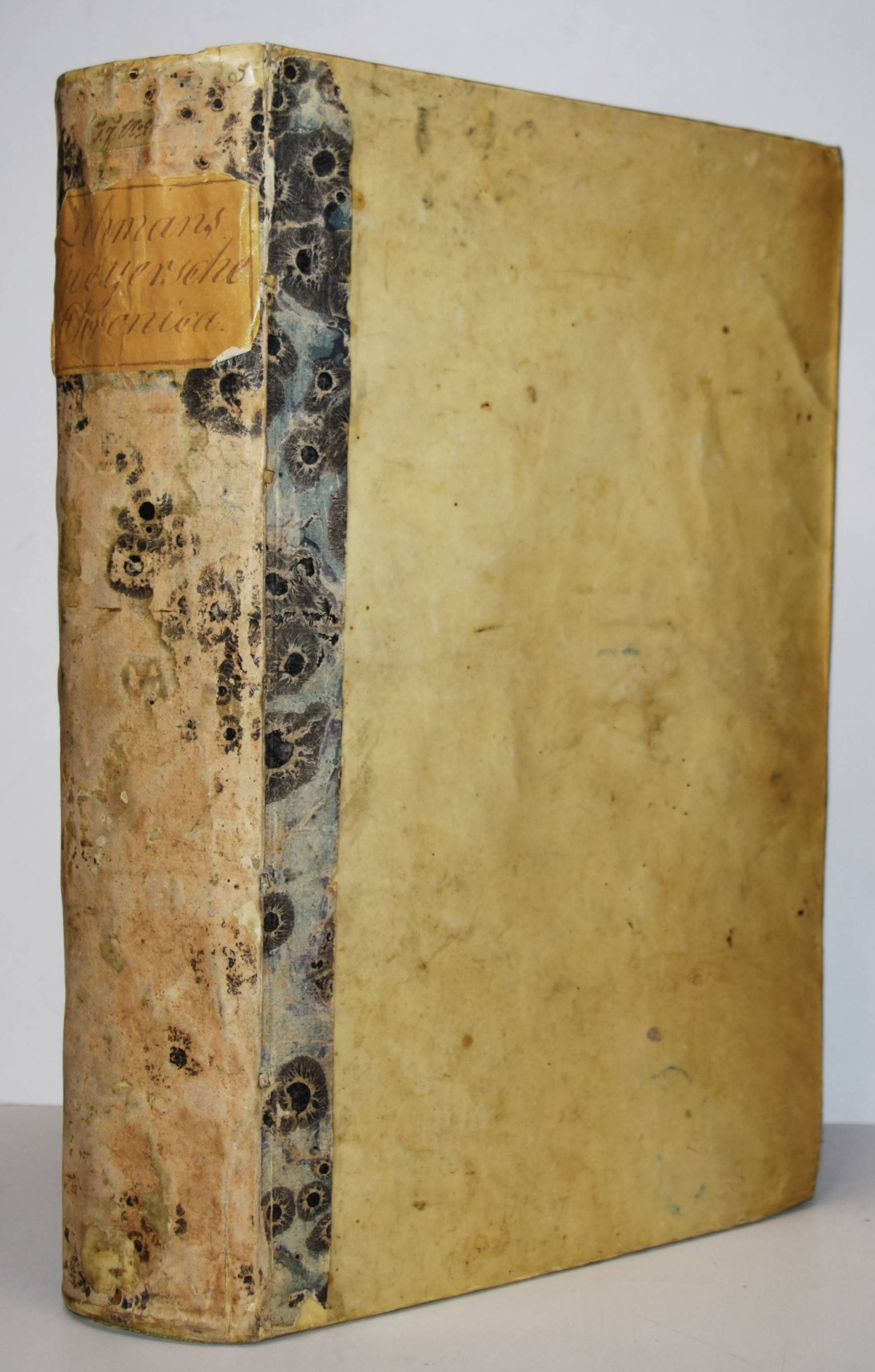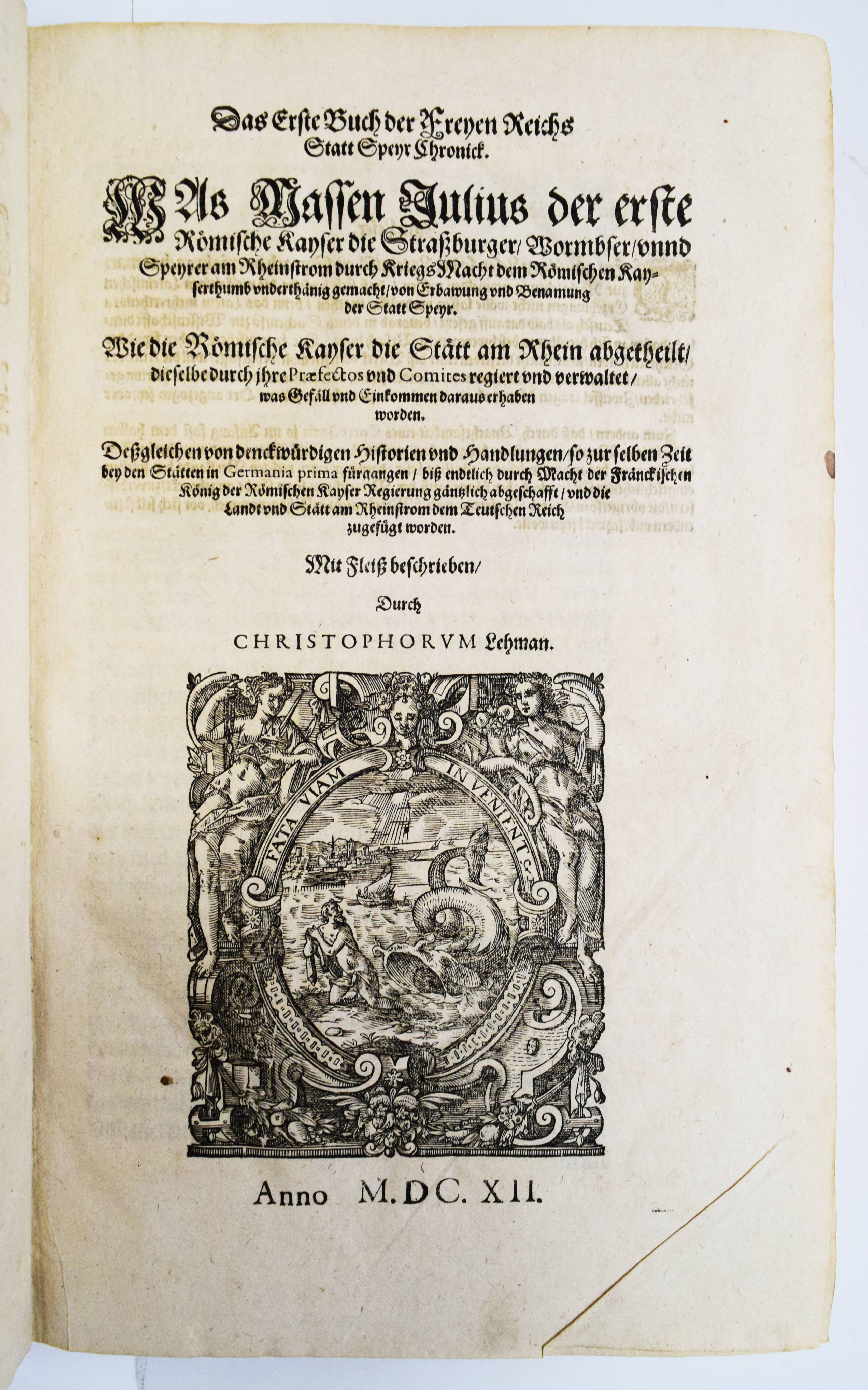 Speyer – Lehmann, Christoph. Chronica der freyen Reichs-Statt Speyr. Darinn von dreyerley fürnemblich gehandelt, Erstlich vom Ursprung, Uffnemen, Befreyung, Beschaffenheit deß Regiments, Freyheiten, Privilegien …, Zum andern, von Anfang unnd Uffrichtung deß Teutschen Reichs, desselben Regierung …, Zum dritten, von Anfang und Beschreibung der Bischoffen zu Speyr, unnd deß Speyrischen Bisthumbs. 7 Teile in 1 Band. Frankfurt am Main, N. Hoffmann für J. Rose 1612. Folio (35,5 x 24 cm.). [6] Bl., 1024 S., [49] Bl. mit Titelblatt in Rot und Schwarz und 8 wdh. großen Holzschnitt-Druckermarken. Pergamentband der Zeit, Rücken alt mit marmoriertem Papier überklebt und handschr. Rückenschild. ADB XVIII, 136. Dahlmann-Weitz 1556. Graesse IV, 151. VD17 23:231115A. – Erste Ausgabe des Hauptwerks des sächsischen Historikers C. Lehmann (1570-1638). Lehmann war seit 1594 Lehrer an der Gelehrten- und Rathsschule (schola senatoria) in Speyer und wurde 1595 zum Conrector befördert. Seit 1604 war er der erste Stadtschreiber. – Seinen litterarischen Ruf verdankt L. zwei Werken, der „Chronica der Freyen Reichs Stadt Speyr …“ und seiner Sprichwörtersammlung „Florilegium Politicum“. Ganz besonders aber ist es die erstere, zugleich sein frühestes Werk, durch welches er sich nicht nur in Speyer einen Namen begründet hatte, um dessen willen man ihn als den „berühmten L.“, ja den „deutschen Livius“ mit bereitwilligster Hingebung anerkannte, sondern das auch weit über Speyer hinaus (soll doch der Minister Colbert befohlen haben, eine französische Uebersetzung der Chronik anzufertigen) im Gebiete deutscher Städtegeschichte einen bewährten Ruf bis auf den heutigen Tag sich erhalten hat. Bei der Abfassung dieser seiner Chronik beobachtete er gewissenhaft das „nonum prematur in annum“, denn erst nach zehnjähriger Arbeit übergab er das Manuscript vorschriftsmäßig dem Rathe der Reichsstadt zur amtlichen Censur, worauf der Druck, auch äußerlich ein stattliches Opus, in Großfolio zu Frankfurt 1612 in Verlegung Jonas Rosen erschien. Die dreifache Aufgabe, die sich L. setzte und in extenso schon auf dem Titel präcisirte, führt er in sieben Büchern von den ältesten Zeiten bis auf den Regierungsantritt Kaiser Maximilians I. durch. … L. schrieb seine Chronik in deutscher Sprache und zwar ist sein Deutsch für jene Zeit, wo man bereits begonnen hatte, unsere Muttersprache mit allerlei ausländischen Lappen zu verunstalten, von anerkennenswerther Reinheit, seine Darstellung ist durchgängig frisch und nicht selten wird er wahrhaft beredt, bei aller Breite zeigen seine Erzählungen eine ergötzliche Natürlichkeit und sicher ist, daß er an Sprache und Darstellungsgabe seinem Fortseher und Erweiterer Melchior Fuchs, der fast hundert Jahre, sowie seinem Biographen Baur, der 150 Jahre später schrieb, weit voransteht. Einen bedeutenden Werth aber gewinnt sein Werk besonders dadurch, daß er überall die wesentlichen Belegstellen für seine Angaben ausführlich mittheilt und auf solche Weise den Leser in den Stand setzt, die Resultate, die er gewinnt oder gewonnen zu haben glaubt, mit den Quellen selbst zu vergleichen. L. hat, wie er selbst in einem Schreiben an Landgraf Moritz von Hessen sagt (Baur a. a. O., S. 177), vier Bibliotheken benützt und in der That eine Menge von Schriftstellern gelesen, um sich die Zustände und Einrichtungen des Deutschen Reiches in geschichtlichem Zusammenhange klar zu machen. Für die Speyerer Angelegenheiten stand ihm das damals (Vaur, S. 48) bereits von seinem Vorgänger im Stadtschreiberamte, Hermann Schießer trefflich geordnete reichsstädtische Archiv (die gegenwärtige schöne Ordnung dieses Archivs verdankt man dem sehr verdienten, am 18. August 1836 verstorbenen K. Kreisarchivar Peter Bernh. Geyer) zu Gebote, wie für allgemeinere Städteangelegenheiten das seiner Aufsicht anvertraute bereits erwähnte Archiv der Städte rheinischer Bank. Von den Urkunden, welche er benützte und seiner Chronik einverleibte, sind zunächst unstreitig die Kaiserurkunden die wichtigsten; übrigens hat er kaum die Hälfte dieser aus dem Zeitraum, welchen sein Werk behandelt, im Speyerer Archive vorhandenen Urkunden veröffentlicht, wie die Vergleichung mit den Geyer’schen Repertorien ergiebt. Außerdem enthält die Chronik noch einige päpstliche und mehrere bischöfliche Urkunden, sowie eine Menge Rathserlasse, Verträge mit benachbarten Fürsten und Städten, Vergleichshandlungen und, was zu dem Interessantesten des mitgetheilten urkundlichen Materials gehört, die alten Richterordnungen der Reichsstadt. Unter den letzteren hat er übrigens die sogen. Vierrichterordnung nicht nach dem ältesten Original von 1314, sondern in der etwas abgeänderten Redaction von 1328, enthalten im Cod. 6 (Geyer; bei Zeuß, Die freie Reichsstadt Speier, 1843, S. 2. Cod. C.) abdrucken lassen“ (J. Franck in ADB). – Rücken etwas berieben, Titelblatt mit zeitgenöss. Besitzvermerk, sehr gutes sauberes Exemplar.