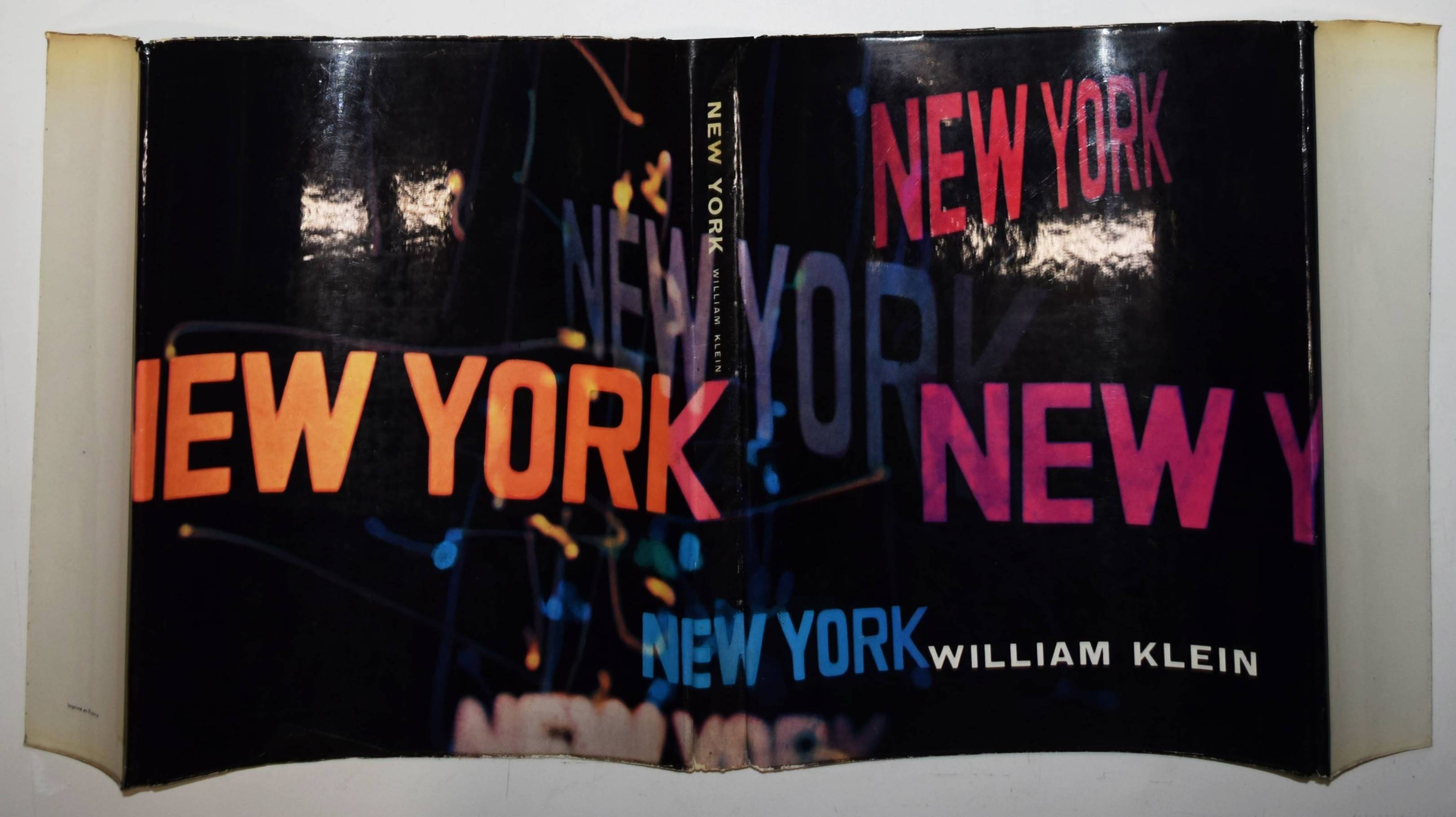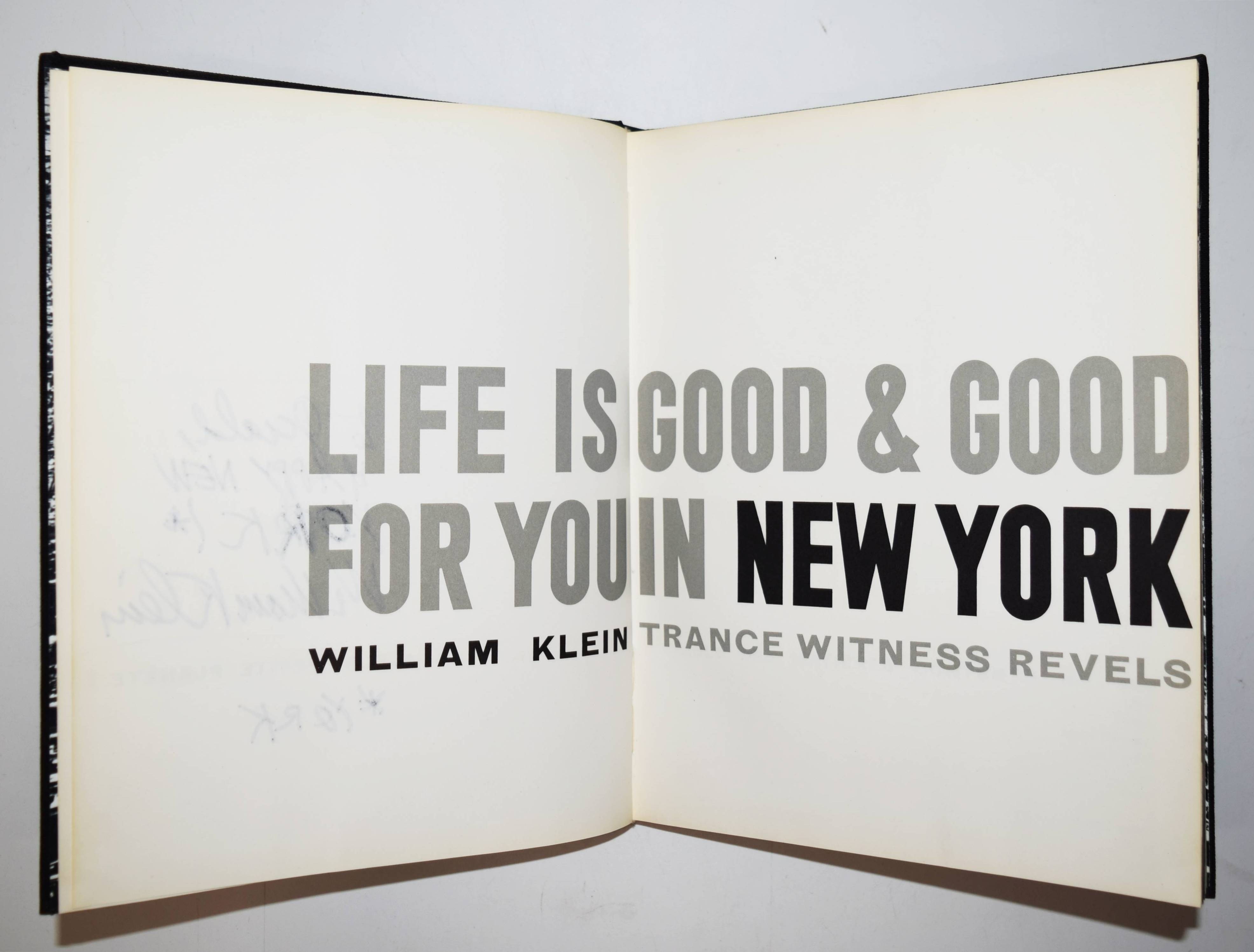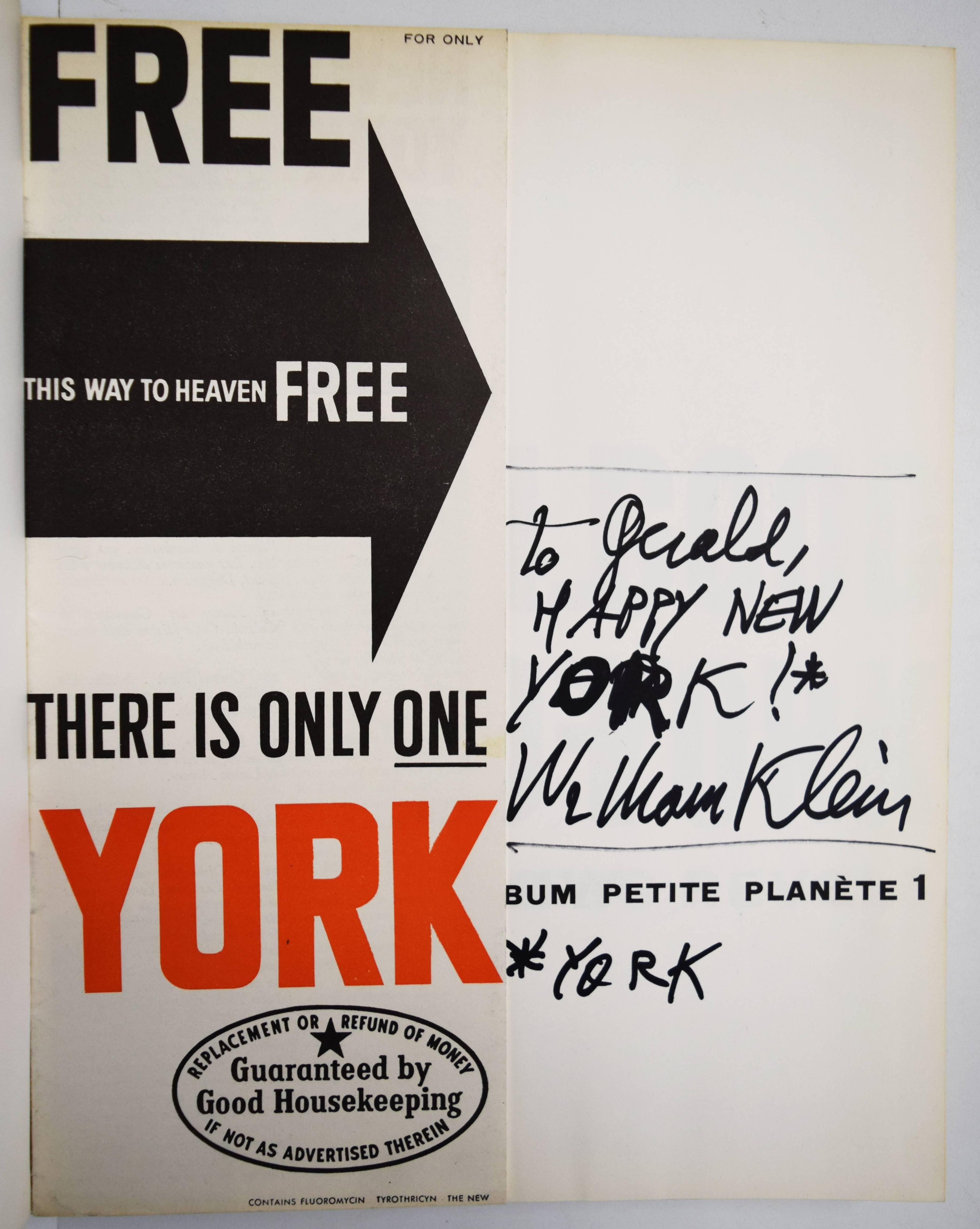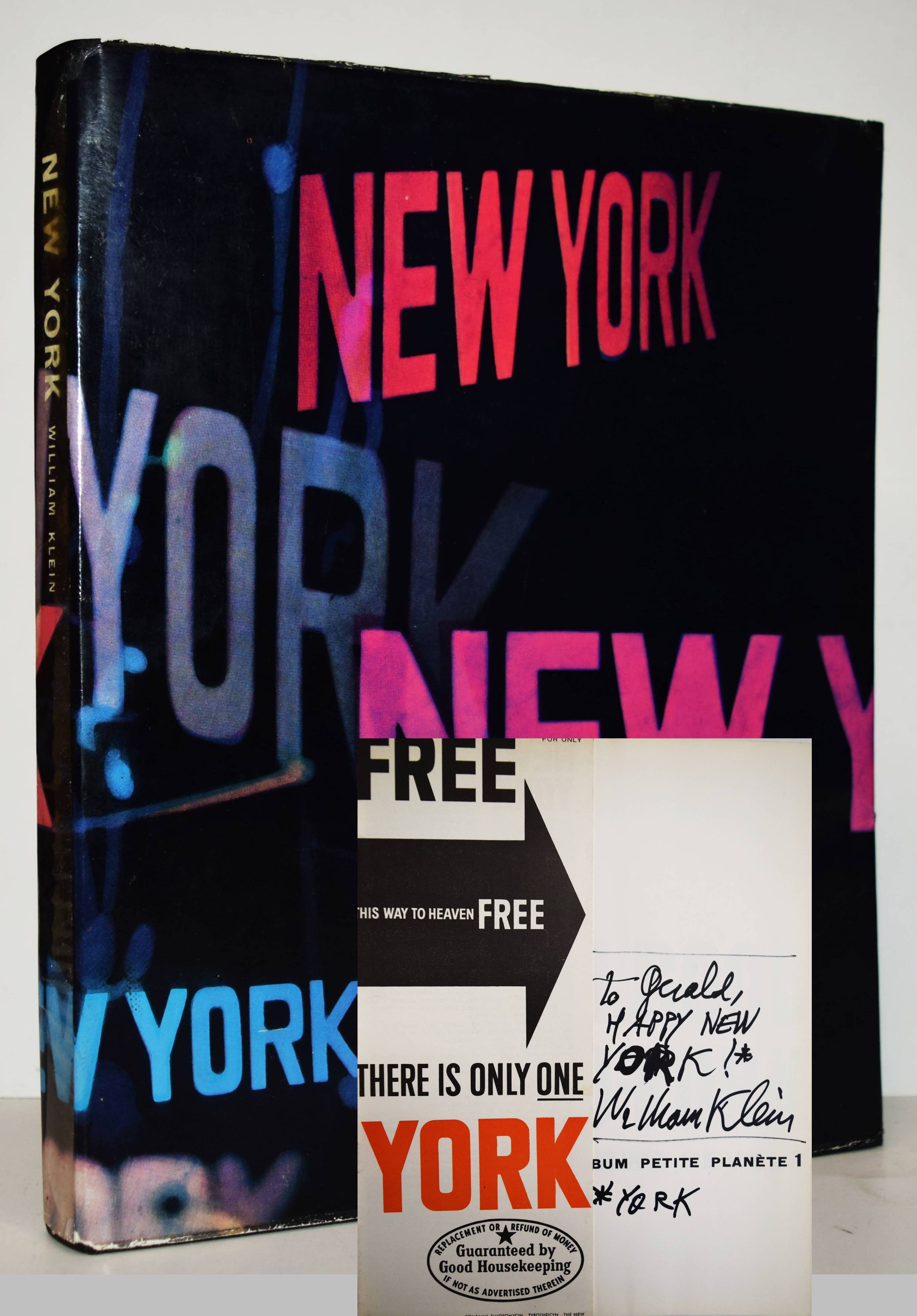 Klein, William New York. Life is good for you and good in New York Trance witness Reveals: Trance Witness Revels. Paris, Éditions du Seuil (1956). 4°. 192 p. with 188 Pictures on plates and Booklet (16 p., „Delay may be serious now free…“). Original cloth binding with color illustrated dust jacket. (Album Petite Planète, Vol. 1). Auer 365. The Open Book 165 f. Parr/Badger I, 243. Roth, The Book of 801 Books 140 ff. – First printing of the first edition. – Boldly dedicated and signed by W. Klein to Belgian photographer Gerald Dauphin „To Gerald, / HAPPY NEW / YORK!* / William Klein / *YORK″. – „By virtue of its preface, written by Jack Kerouac, Robert Frank’s The Americans is usually regarded as the epitome of the Beat photobook. But William Klein’s magnum opus, Life is good for you and good in New York Trance witness Reveals: Trance Witness Revels, a book with Beat mantra for a title, surely has the edge in this regard. This is partly because it was the earlier model, partly because it is less political and more exuberant, and impotantly, because its conception is so complete – photographs, layout, design, topography, ‚found‘ ephemera coalescing into what is in effect one of the first great ‚Pop‘ books. … Klein’s masterpiece reminds us that much great, serious art is often about play, archieved simply by experimenting with the possibilities of the material. Forget trance and witness – the revels are the thing“ (Parr/Badger). – „With no interest from American publishers, Klein went back to Paris and set to work on a graphic design that was as aggressive and idiosyncratic as its photos. „I saw the book as a tabloid gone berserk, gross, over-inked, brutal layout, bull-horn headlines,“ he wrote in its radically revised 1995 edition. „This is what New York deserved and would get.“ Published in France, Italy, and England, but not in America, Life is good for you and good in New York was a sensation“ (A. Roth). – Dust jacket with inconspicuous restored loss at the spine, very good copy.