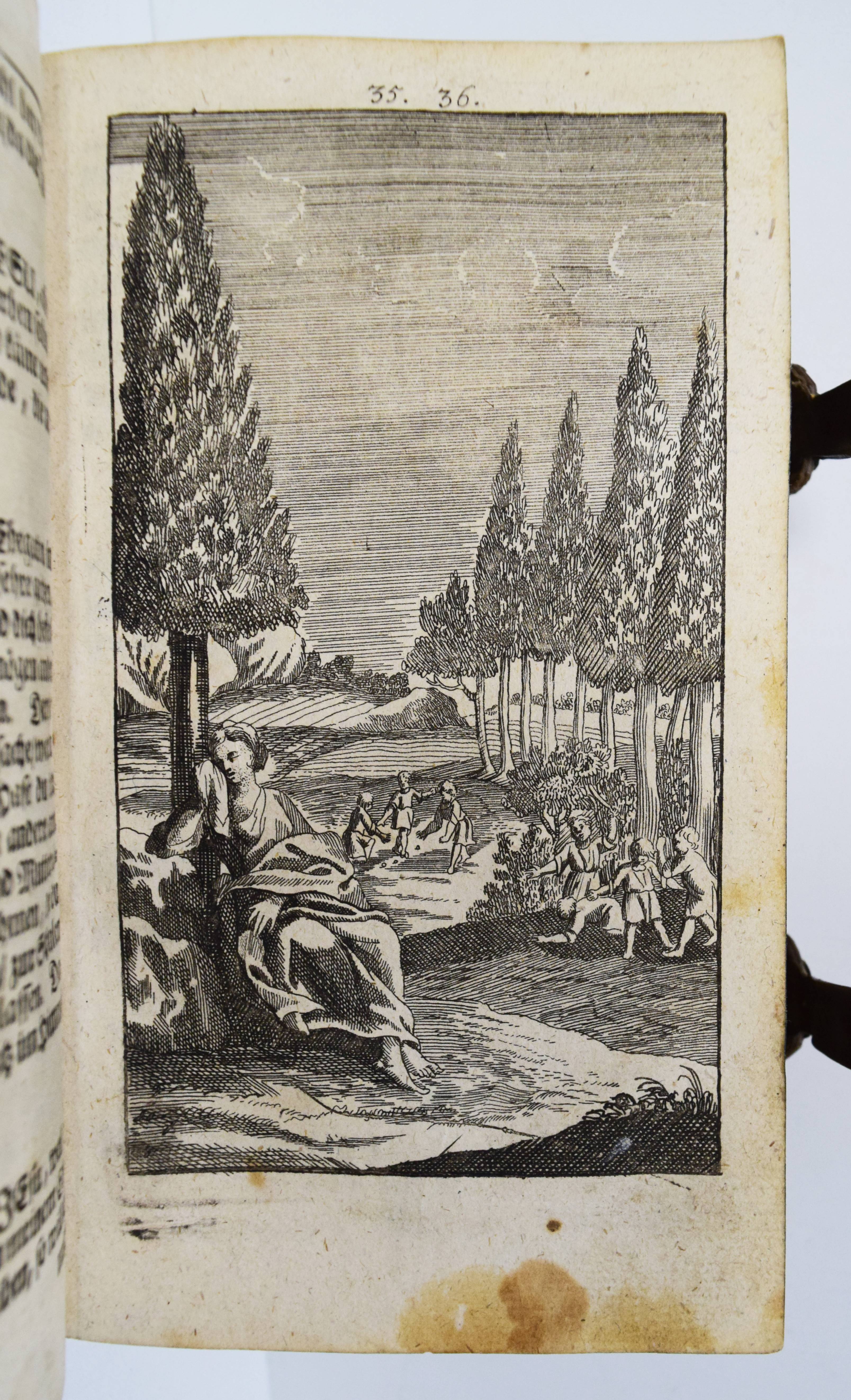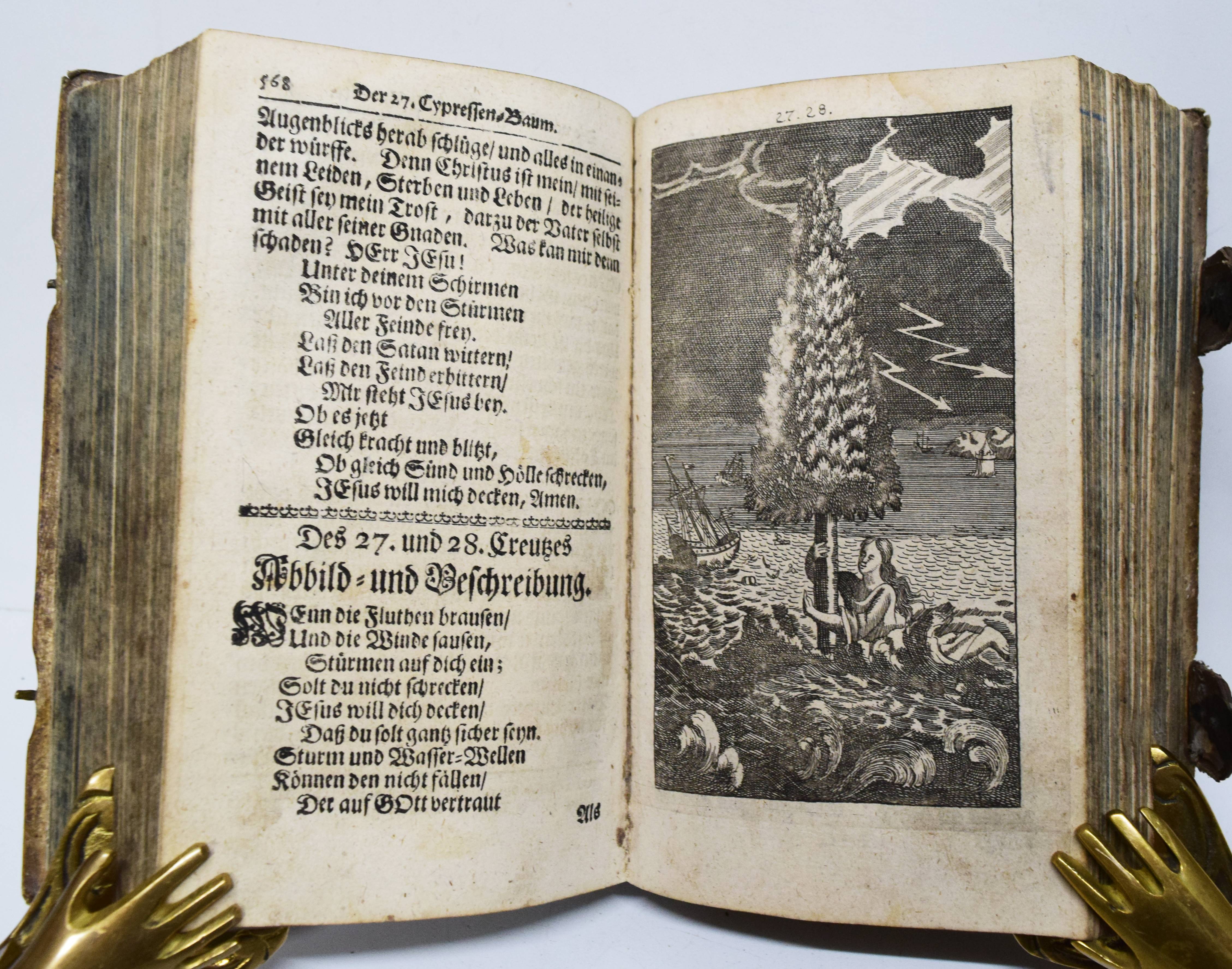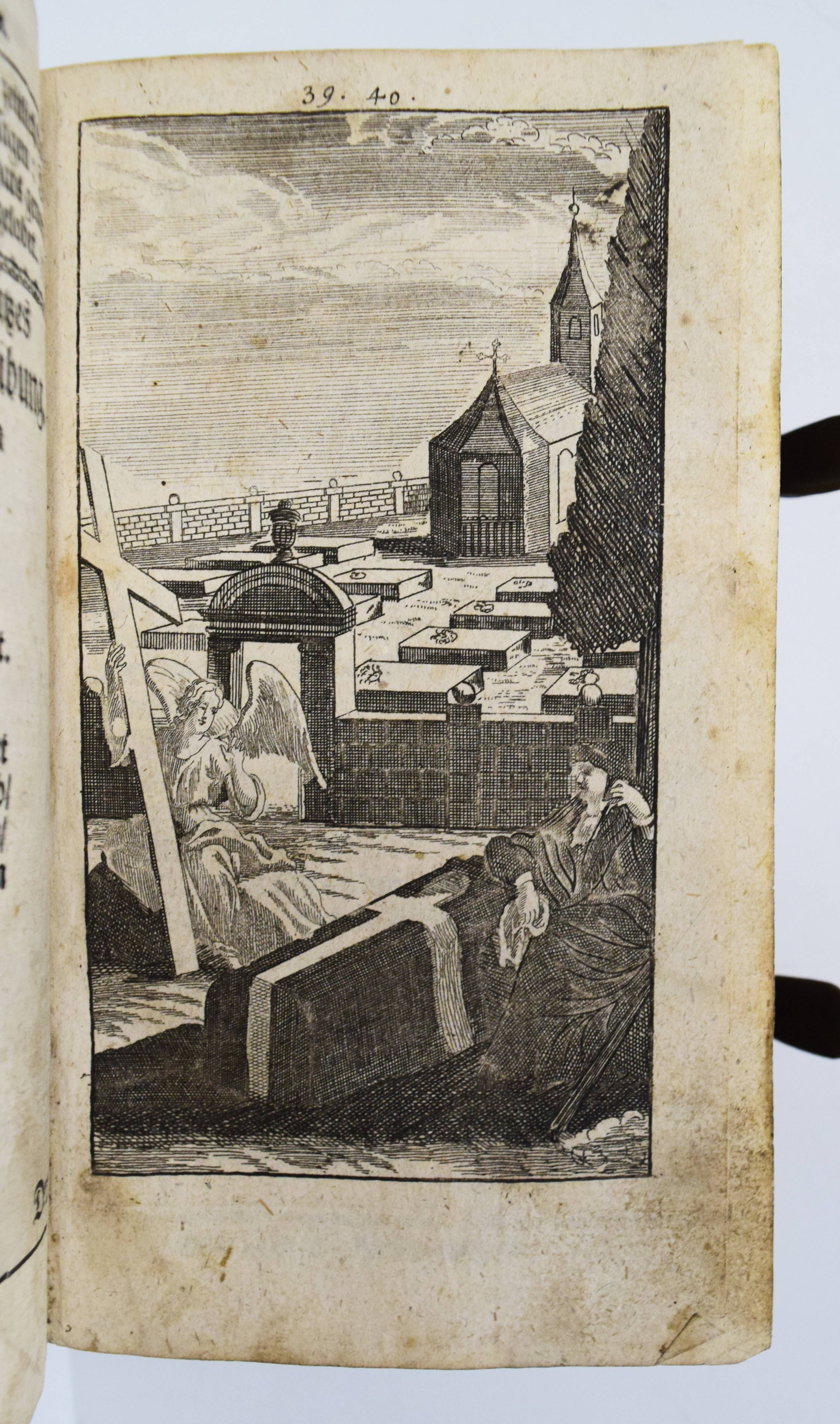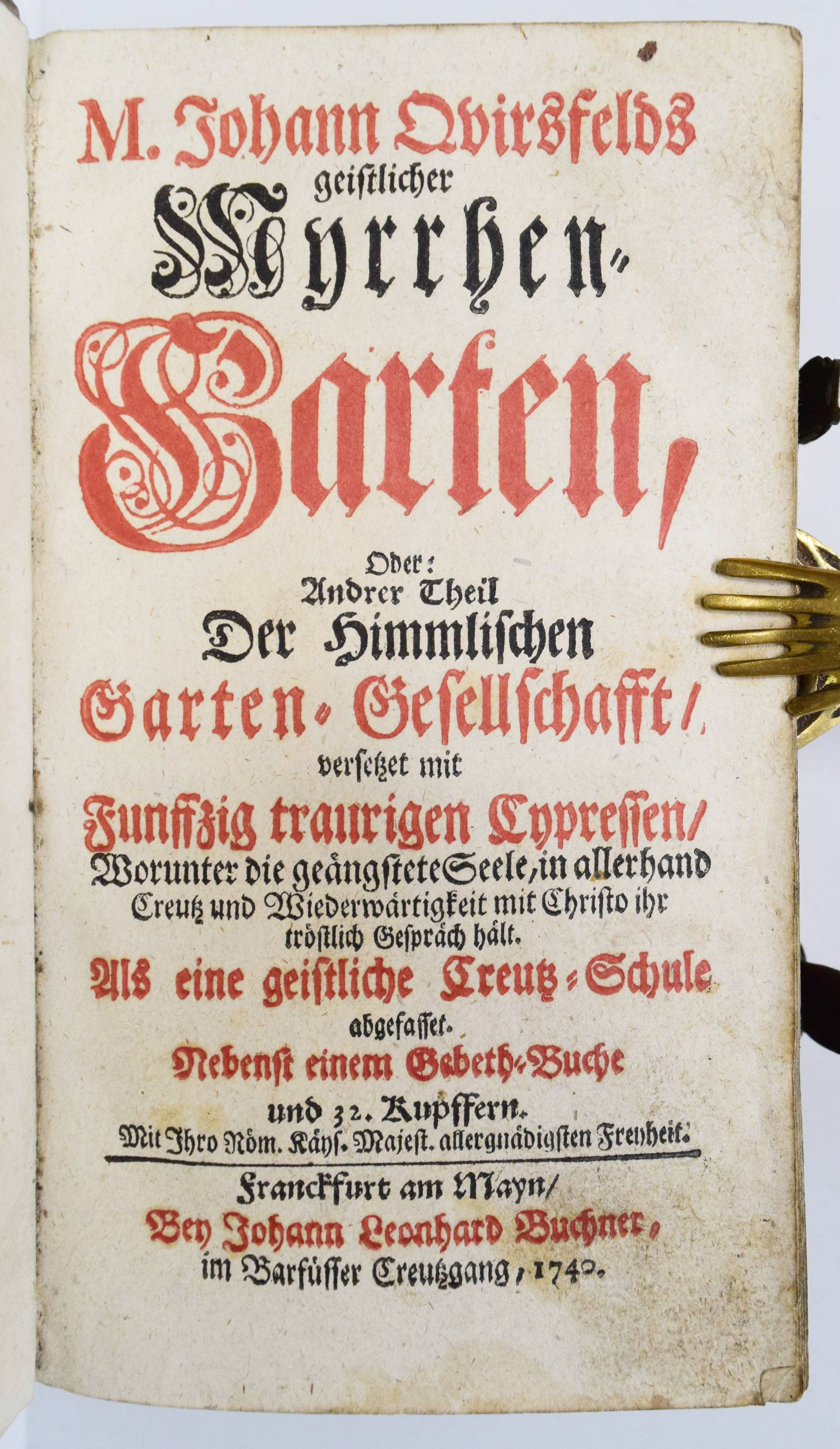Quirsfeld, Johann. Geistlicher Myrrhen-Garten. Andrer Theil der Himmlischen Garten-Gesellschafft, versetzet mit Funfftzig traurigen Cypressen, worunter die geängstete Seele in allerhand Creutz und Widerwärtigkeit mit Christo ihr tröstlich Gespräch hält. Nebenst einem kurtzen Gebet-Buche. 2 Teile in 1 Band. Frankfurt am Main, Johann Leonhard Buchner 1740 und 1739. 8°. [6] Bl., 974 S., [5] Bl.; 84 (recte 94) S., [1] Bl. mit Titelblatt in Rot und Schwarz, gestoch. Portrait, gestoch. Frontispiz und 31 Kupfertafeln. Blindgepr. Schweinslederband mit 2 Messing-Schließen. ADB XXVII, 48. VD18 14168553. Vgl. Goed. III, 188, 153, 3 (Ausgabe Leipzig 1696) und Seebaß/Edelmann II, 777 (Ausgabe Leipzig 1708). Nicht bei Praz (″obwohl die Kupfer emblematisch-allegorischen Charakters sind“ A. Seebaß). – Erfolgreiches reich illustriertes posthum erschienes Werk des Dresdner Theologen J. Quirsfeld (1642-1686). Letzte um einige Kupfertafeln vermehrte Ausgabe. – „Je eine Illustration bezieht sich auf je zwei (in einem Fall drei) Gespräche zwischen Christus und der Seele, die in der Art sich an Hugos Pia desidera und andere mystische Tradition anlehnen. Dabei betreffen sie durchaus praktische Probleme, wie „Die Seele beklagt ihre Amts-Beschwerliligkeit, Die von Feinden Belägerte, Die Seele beweinet den ungerathenen Ehegatten, Die Seele klaget über allzuviel Kinder, Die gefährliche (=gefährdete) Schwangere, Das beschwerliche Alterthum“ (= Alter) usw. Viele schöne, kirchenliedartige Gedichte des Verfassers sind beigegeben, es finden sich aber auch ältere Choräle von Luther, Paulus Gerhard u. a. – Quirsfeld, … machte sich als Kirchenlieddichter einen Namen und gab einige, originelle Erbauungsbücher heraus. Das vorliegende ist eine ganz selbständige und separat erschienene Art Fortsetzung zu seiner „Himmlischen Gartengesellschaft“ (vgl. Maltzahn II, 1043)“ (A. Seebaß). – Einband berieben, Bezug am vorderen Gelenk etwas angeplatzt, Innengelenke etwas angeplatzt, drei Kupfertafeln mit Blaustift-Kritzeleien, durchgehend im Blattrand etwas fingerfleckig, sonst gut erhalten.
