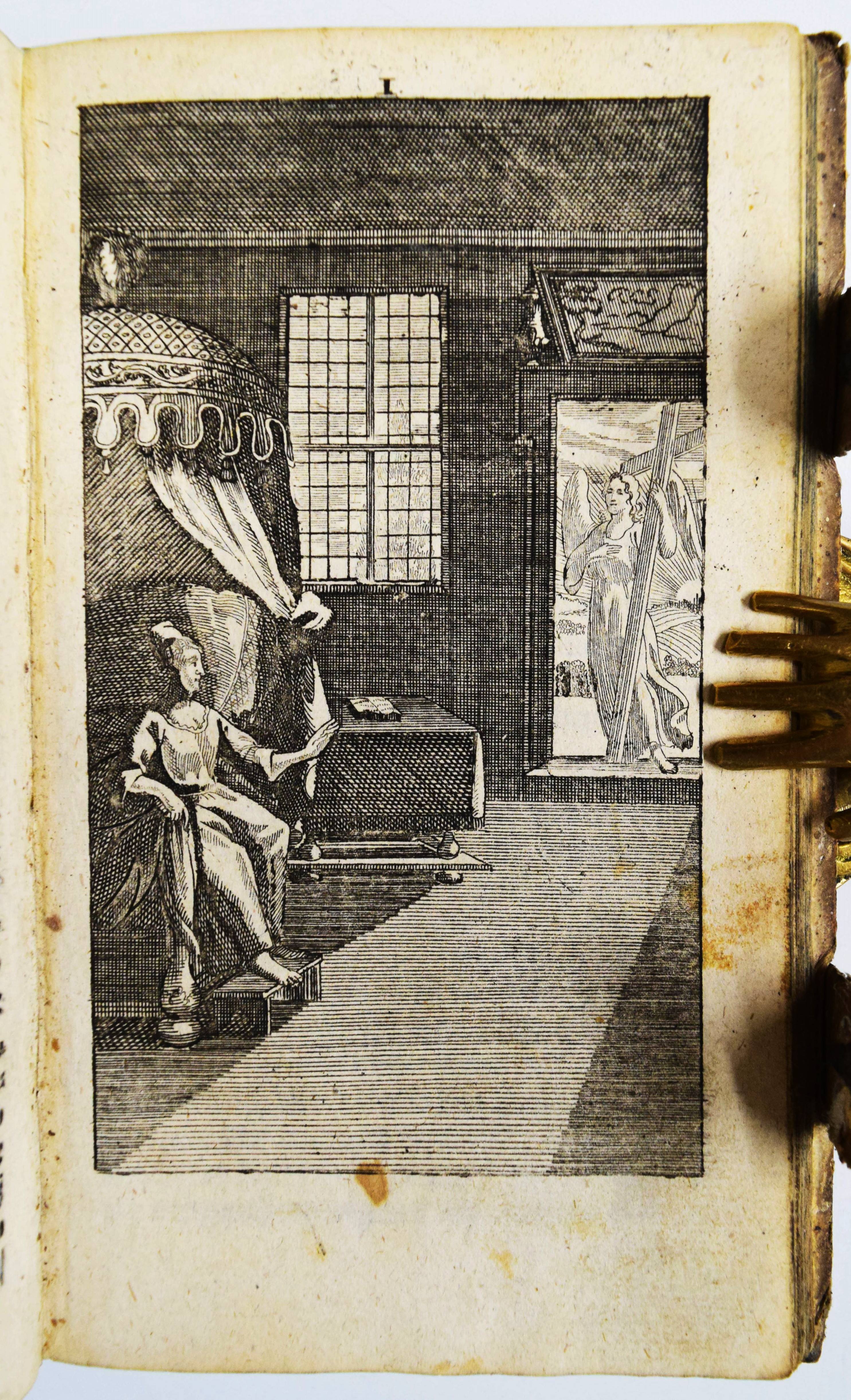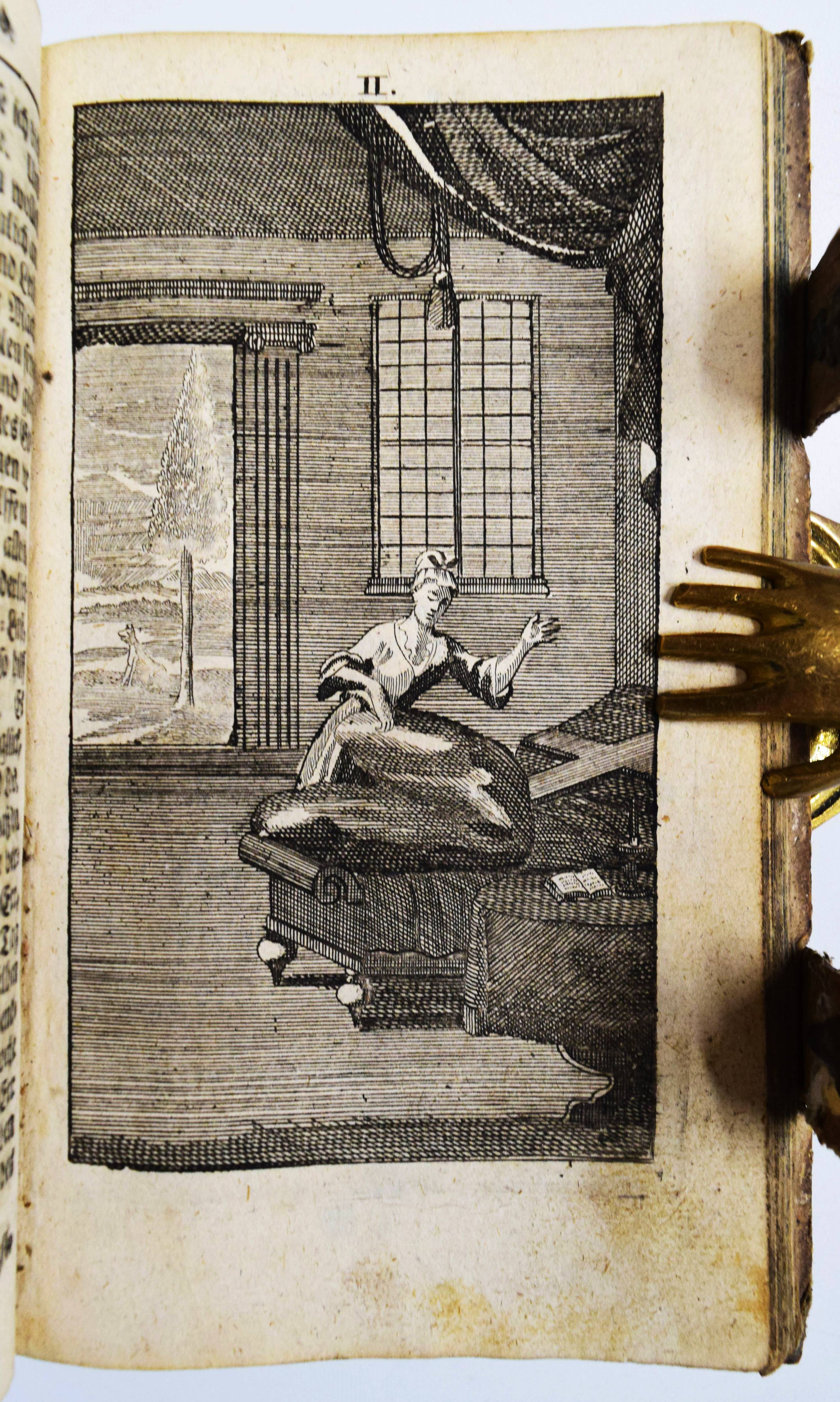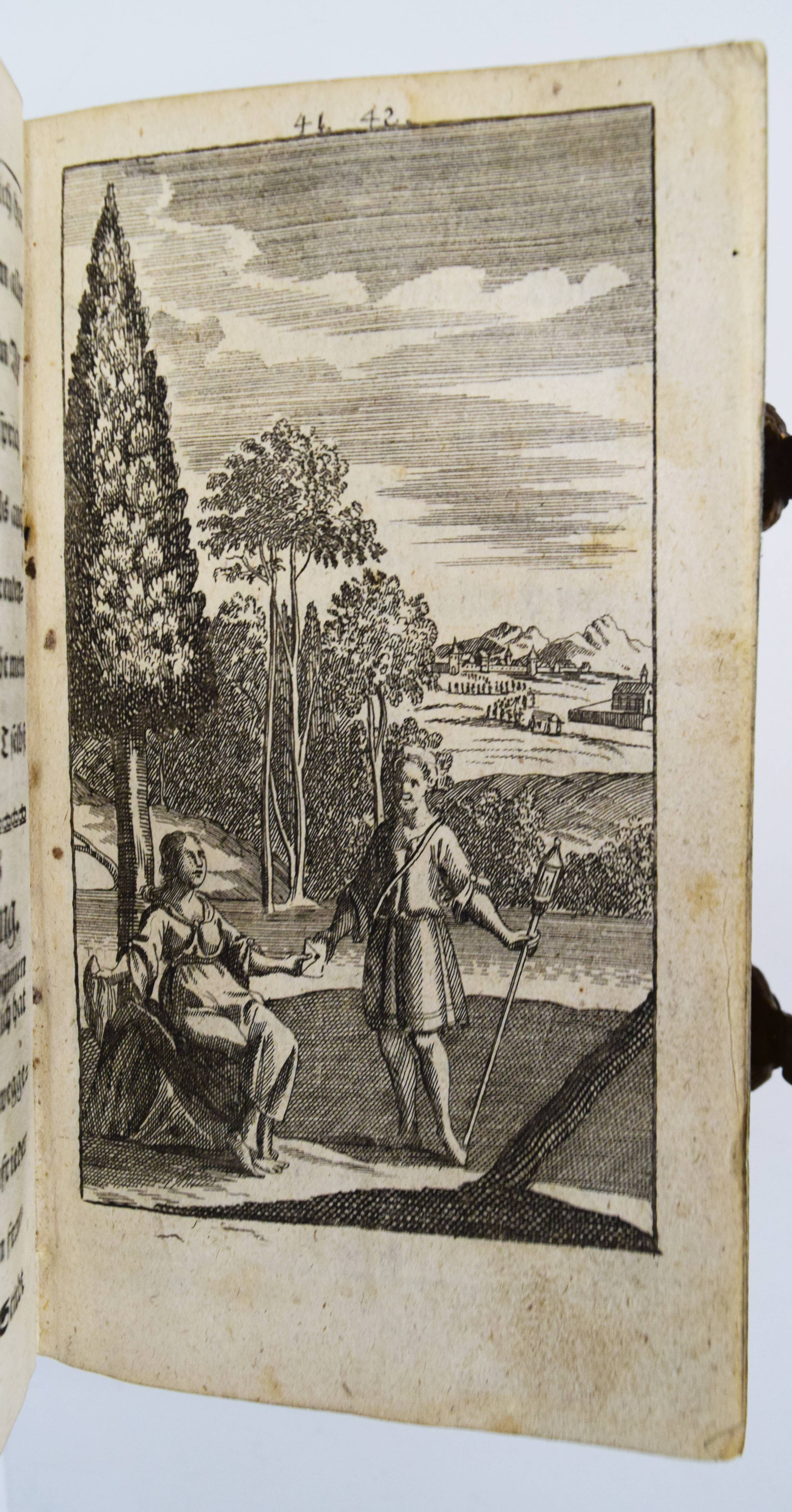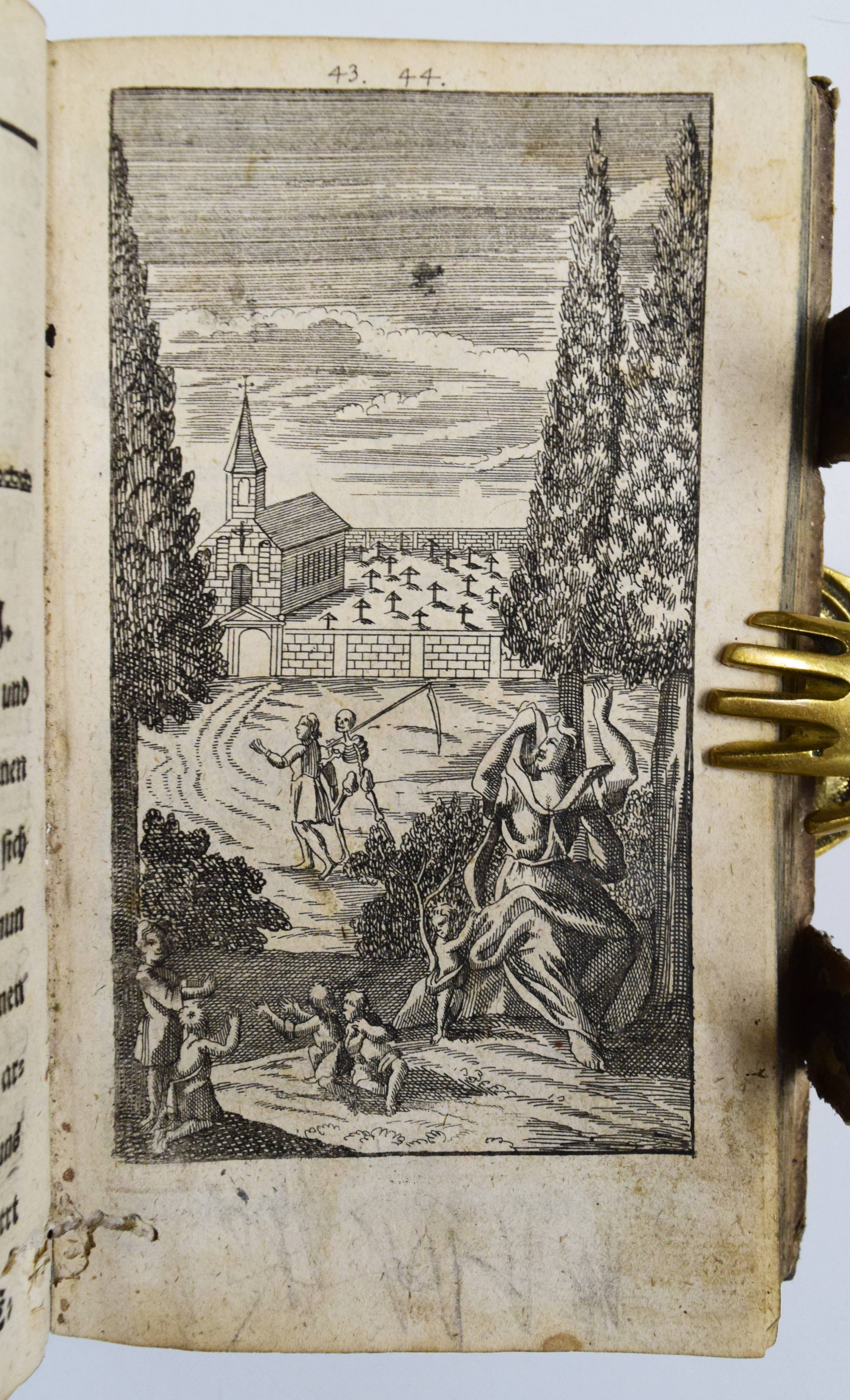 Quirsfeld, Johann. Geistlicher Myrrhen-Garten. Andrer Theil der Himmlischen Garten-Gesellschafft, versetzet mit Funfftzig traurigen Cypressen, worunter die geängstete Seele in allerhand Creutz und Widerwärtigkeit mit Christo ihr tröstlich Gespräch hält. Nebenst einem kurtzen Gebet-Buche. 2 Teile in 1 Band. Frankfurt am Main, Johann Leonhard Buchner 1740 und 1739. 8°. [6] Bl., 974 S., [5] Bl.; 84 (recte 94) S., [1] Bl. mit Titelblatt in Rot und Schwarz, gestoch. Portrait, gestoch. Frontispiz und 31 Kupfertafeln. Blindgepr. Schweinslederband mit 2 Messing-Schließen. ADB XXVII, 48. VD18 14168553. Vgl. Goed. III, 188, 153, 3 (Ausgabe Leipzig 1696) und Seebaß/Edelmann II, 777 (Ausgabe Leipzig 1708). Nicht bei Praz (″obwohl die Kupfer emblematisch-allegorischen Charakters sind“ A. Seebaß). – Erfolgreiches reich illustriertes posthum erschienes Werk des Dresdner Theologen J. Quirsfeld (1642-1686). Letzte um einige Kupfertafeln vermehrte Ausgabe. – „Je eine Illustration bezieht sich auf je zwei (in einem Fall drei) Gespräche zwischen Christus und der Seele, die in der Art sich an Hugos Pia desidera und andere mystische Tradition anlehnen. Dabei betreffen sie durchaus praktische Probleme, wie „Die Seele beklagt ihre Amts-Beschwerliligkeit, Die von Feinden Belägerte, Die Seele beweinet den ungerathenen Ehegatten, Die Seele klaget über allzuviel Kinder, Die gefährliche (=gefährdete) Schwangere, Das beschwerliche Alterthum“ (= Alter) usw. Viele schöne, kirchenliedartige Gedichte des Verfassers sind beigegeben, es finden sich aber auch ältere Choräle von Luther, Paulus Gerhard u. a. – Quirsfeld, … machte sich als Kirchenlieddichter einen Namen und gab einige, originelle Erbauungsbücher heraus. Das vorliegende ist eine ganz selbständige und separat erschienene Art Fortsetzung zu seiner „Himmlischen Gartengesellschaft“ (vgl. Maltzahn II, 1043)“ (A. Seebaß). – Einband berieben, Bezug am vorderen Gelenk etwas angeplatzt, Innengelenke etwas angeplatzt, drei Kupfertafeln mit Blaustift-Kritzeleien, durchgehend im Blattrand etwas fingerfleckig, sonst gut erhalten.