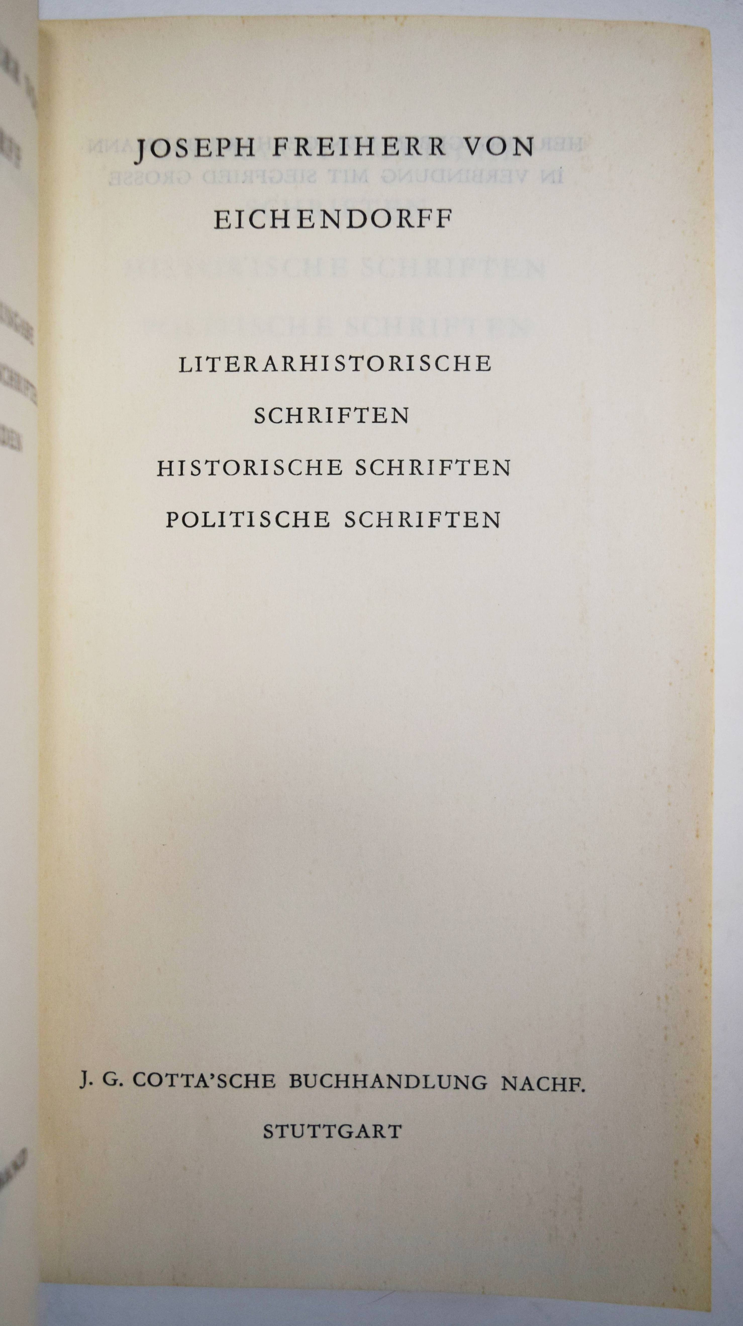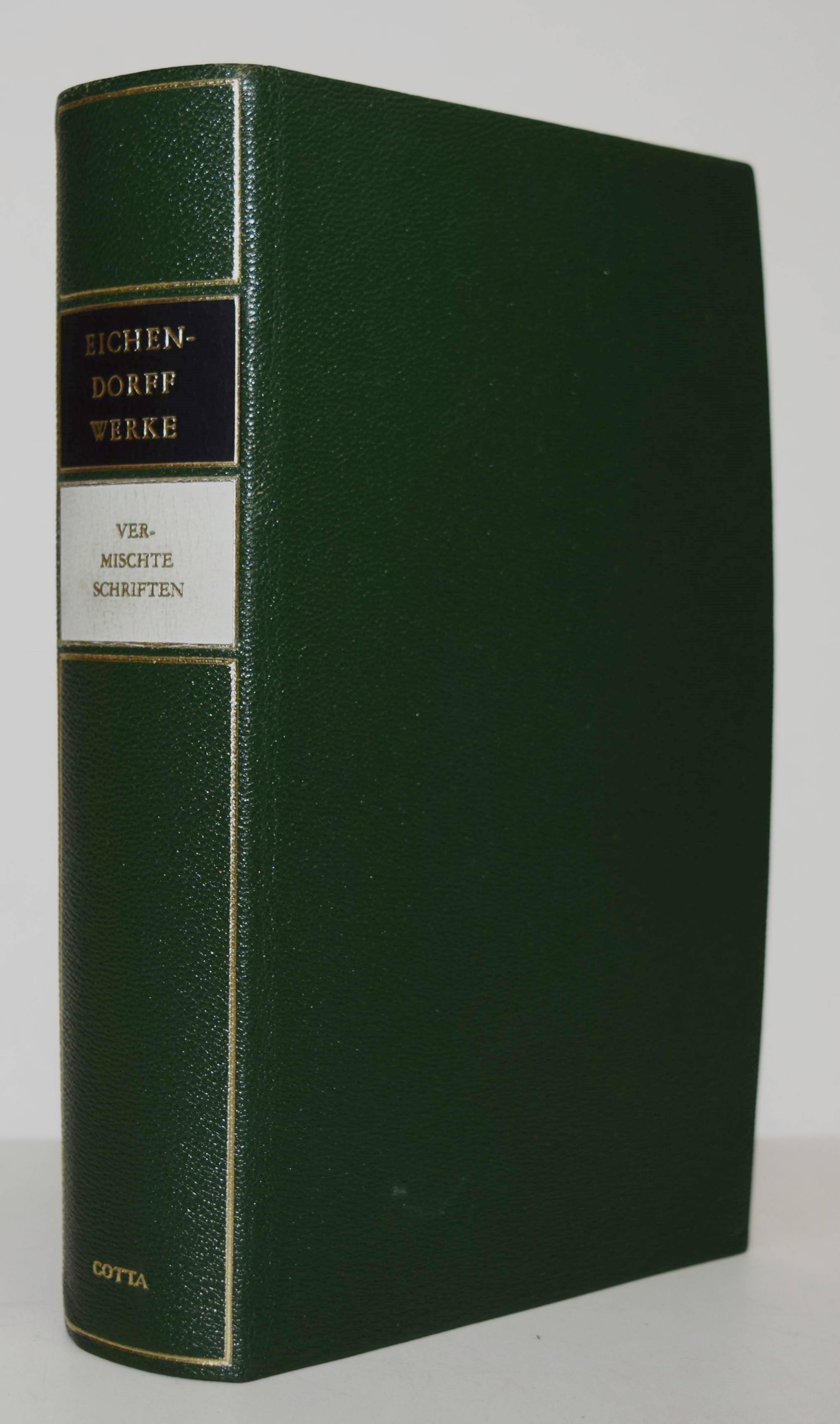 Eichendorff, Joseph v. Neue Gesamtausgabe der Werke und Schriften. (Herausgegeben von Gerhart Baumann in Verbindung mit Siegfried Grosse). – Band 4 (von 4): Literarhistorische Schriften. Historische Schriften. Politische Schriften. 1.-5. Tsd. Stuttgart, J. G. Cotta (1958). 8°. 1541, (2) S. Dunkelgrüner Orig.-Lederband mit 2 goldgepr. Rückenschildern, Linienvergoldung und Kopfgoldschnitt. Sehr gutes Exemplar der schönen Ganzlederausgabe.