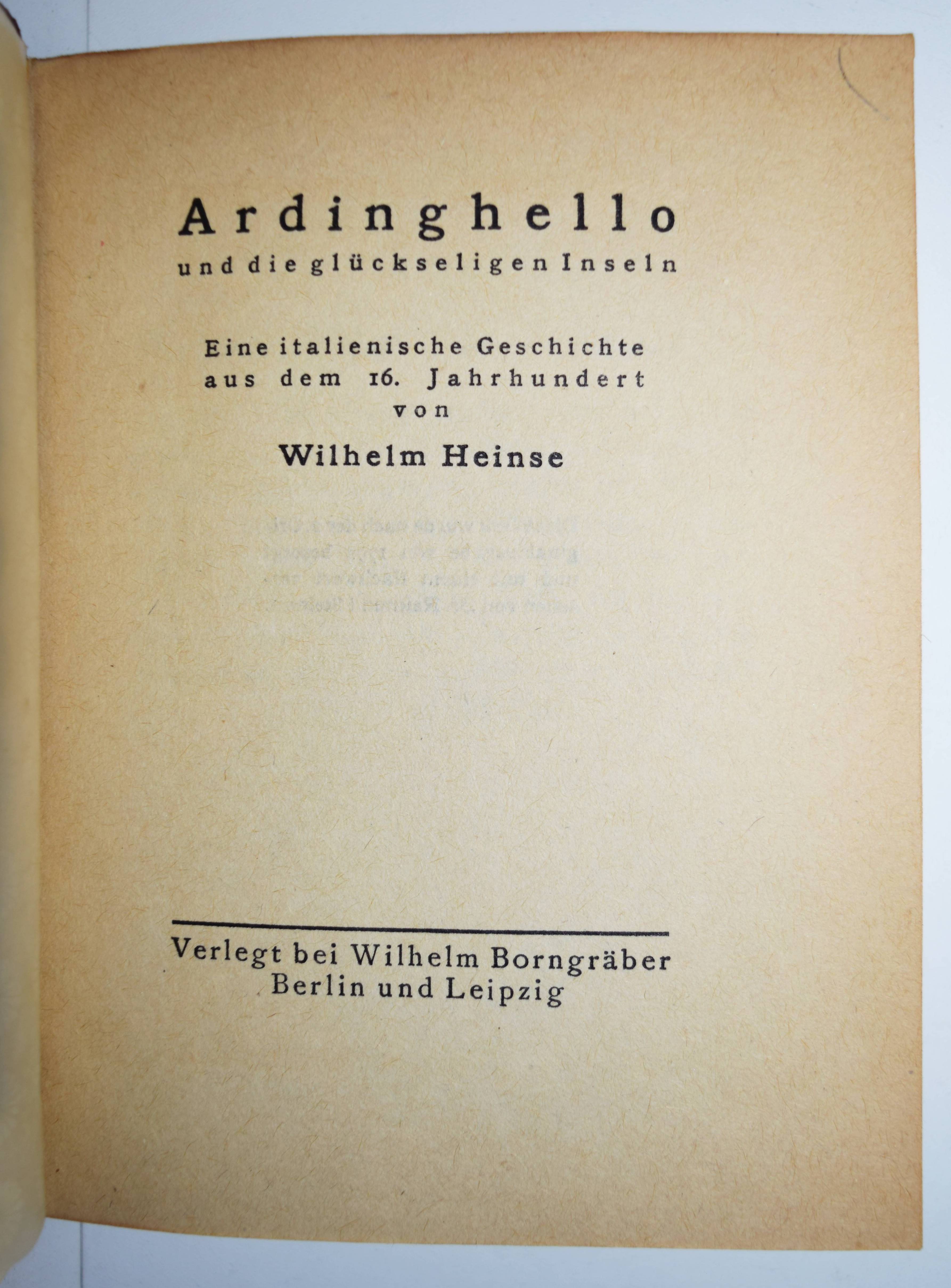 Heinse, (Johann Jakob) Wilhelm. Ardinghello und die glückseligen Inseln. Eine italiänische Geschichte aus dem 16. Jahrhundert. Berlin und Leipzig, Wilhelm Borngräber o. J. (1914). 8°. 422 S., [1] Bl. mit Frontispiz. Weinroter Halblederband der Zeit mit goldgepr. Rückentitel und 5 unechten Bünden. Vgl. Goedeke IV/1, 887, 18. Hayn-Gotendorf III, 128. – „Dies Werk wurde nach der 2. Originalausgabe von 1794 besorgt und mit einem Nachwort versehen von Reimund Steinert“. – Der „Vorbote des deutschen Renaissanceromans“ (Hayn-Gotendorf) erschien zuerst 1787 in Lemgo. – Schönes dekorativ gebundenes Exemplar.