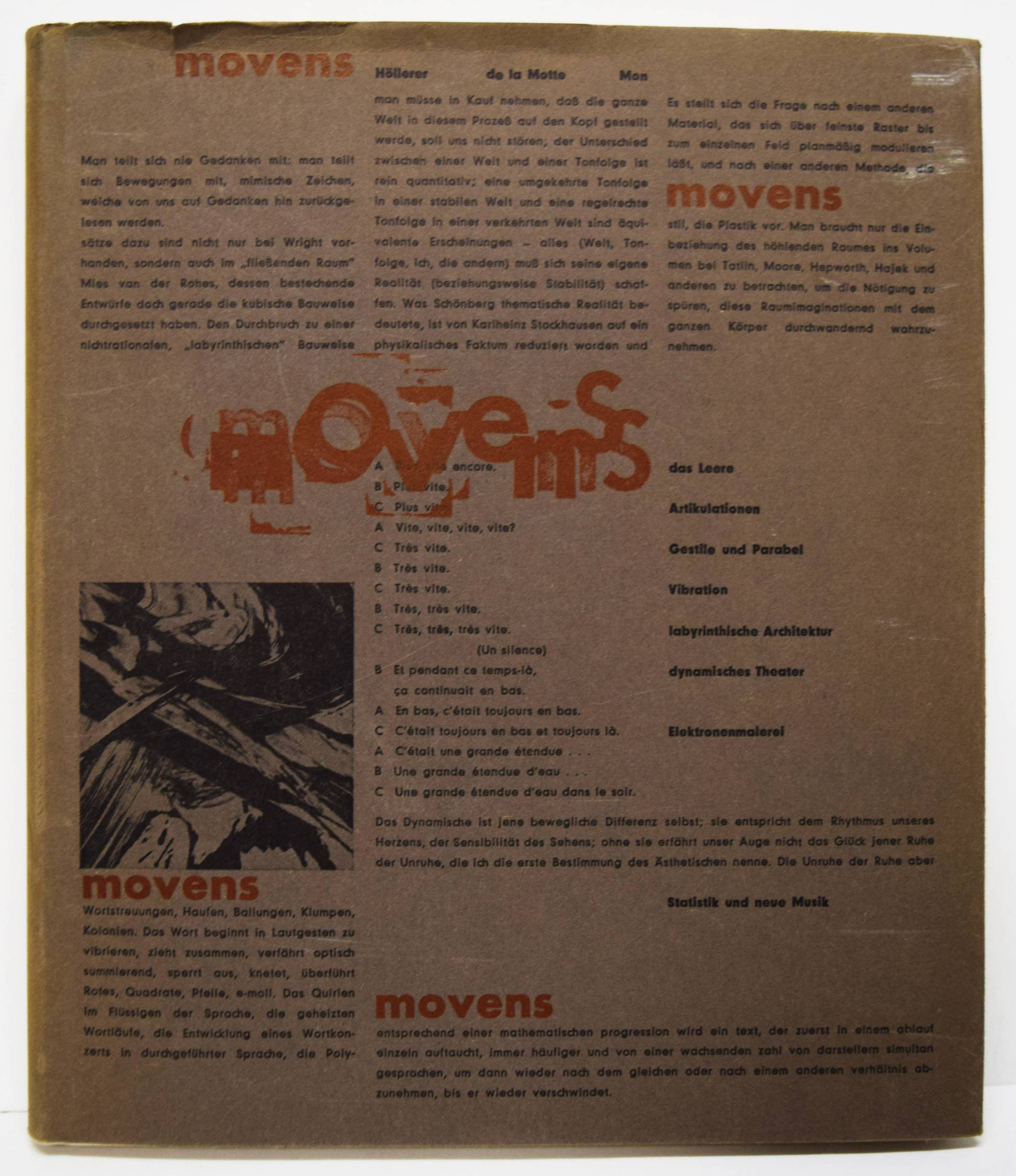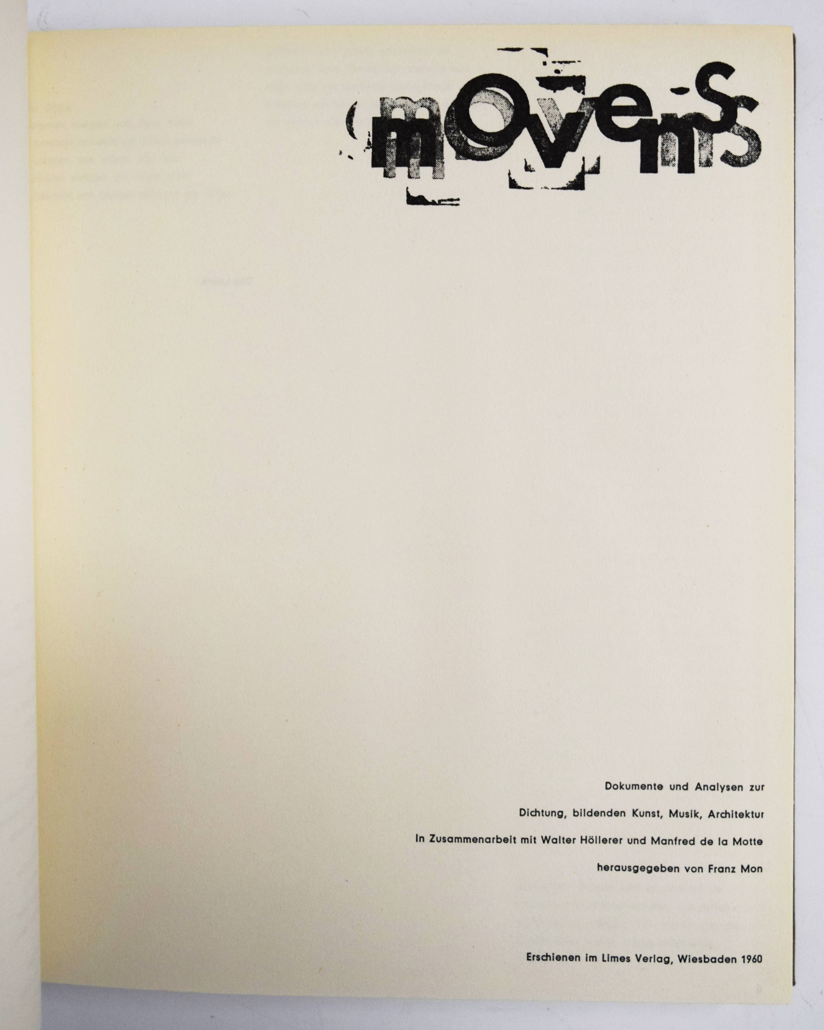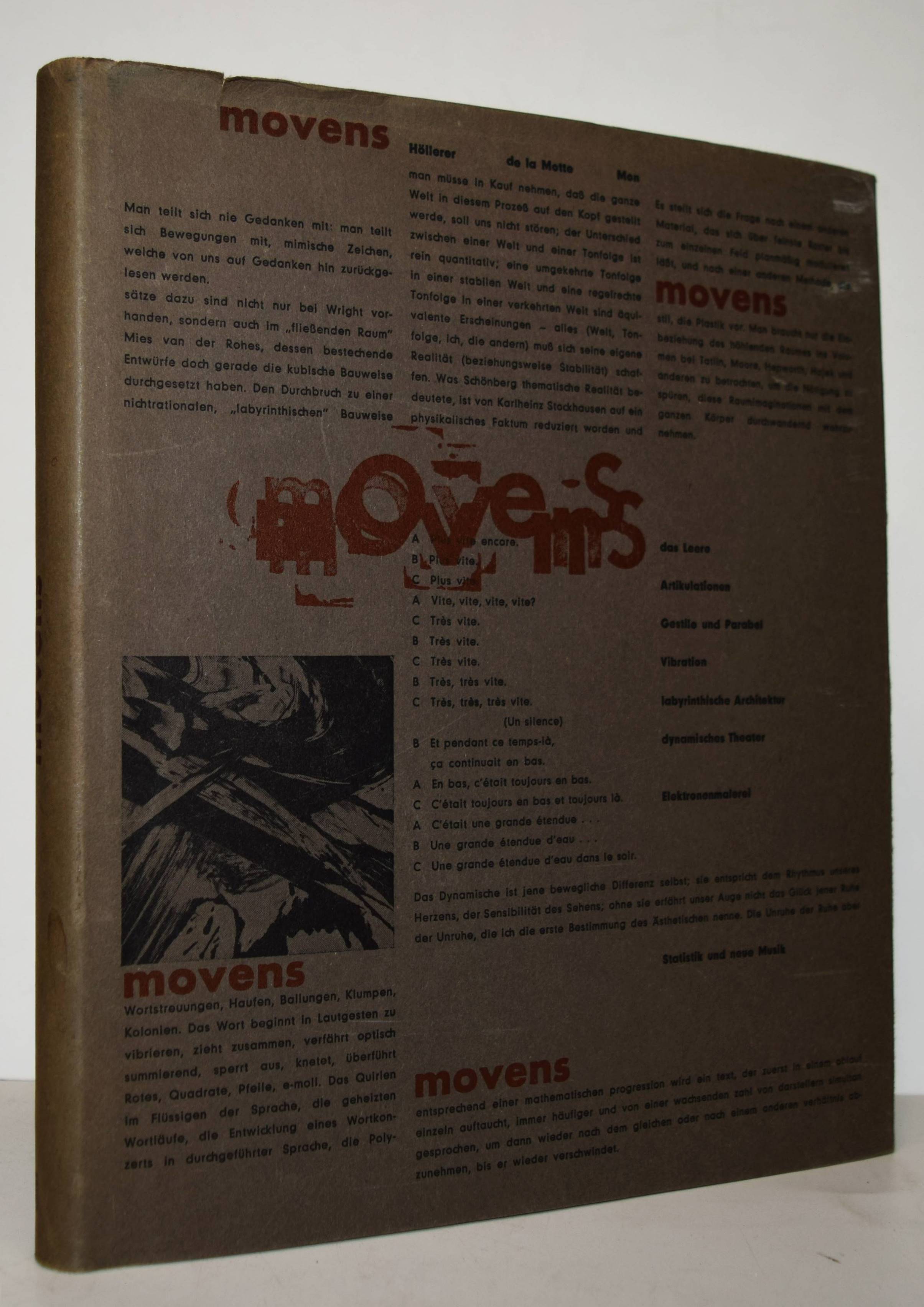 Mon, Franz (Hrsg.). Movens. Dokumente und Analysen zur Dichtung, bildenden Kunst, Musik, Architektur. In Zusammenarbeit mit Walter Höllerer und Manfred de la Motte herausgegeben. Wiesbaden, Limes Verlag 1960. 4°. 200 S. mit zahlr. Abbildungen. Orig.-Leinenband mit illustr. Schutzumschlag. Erste Ausgabe. – Sehr gutes Exemplar.