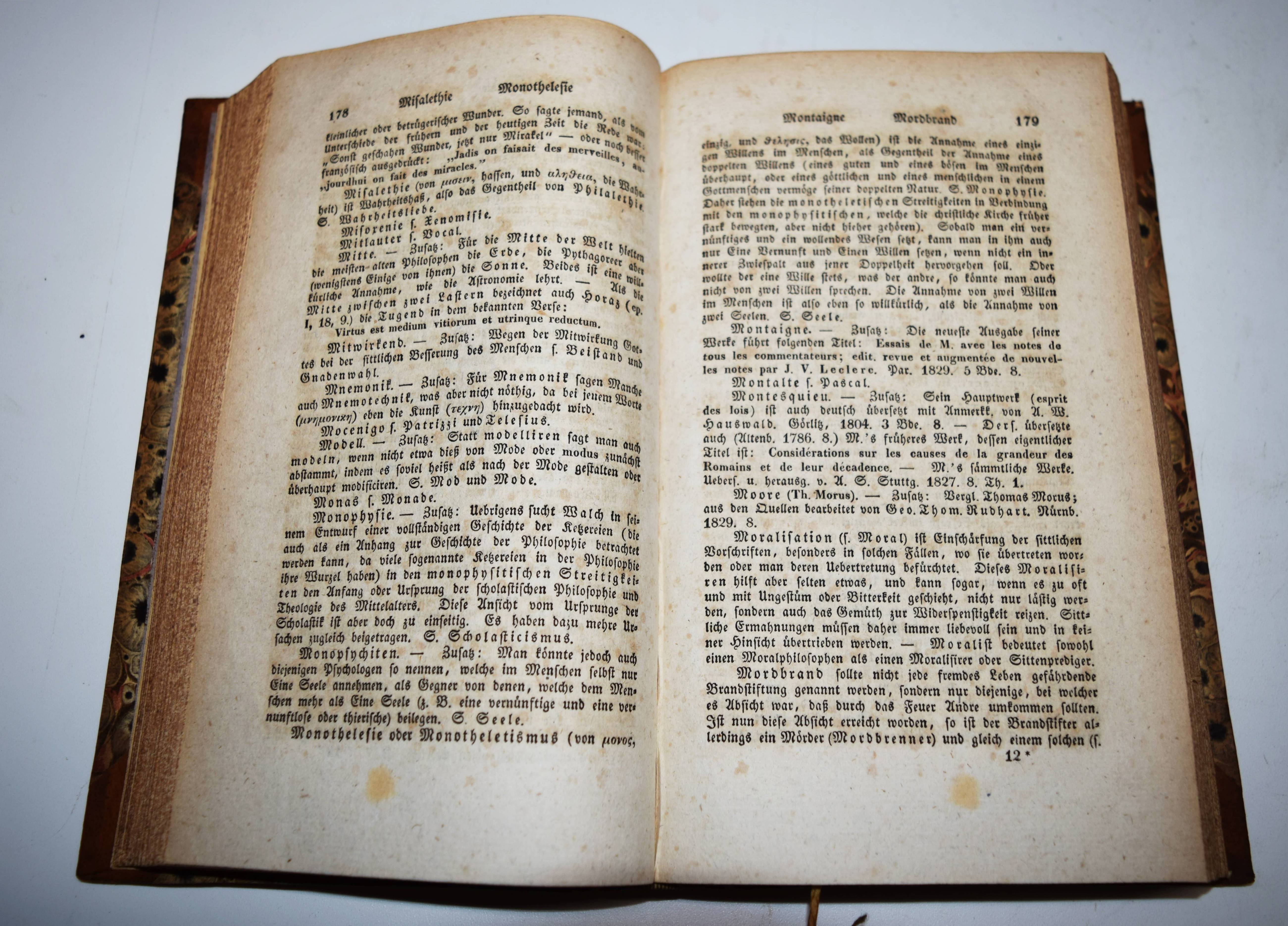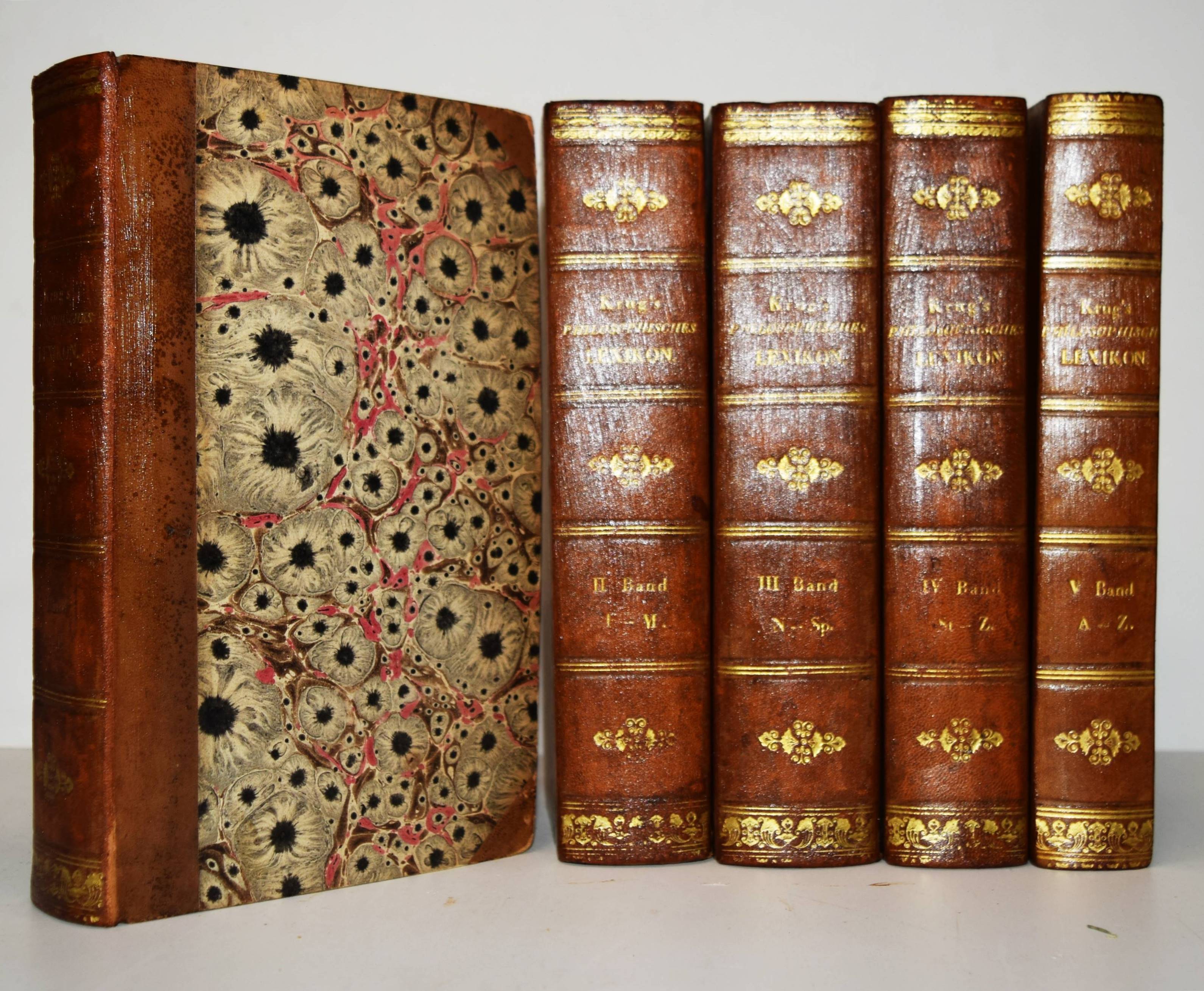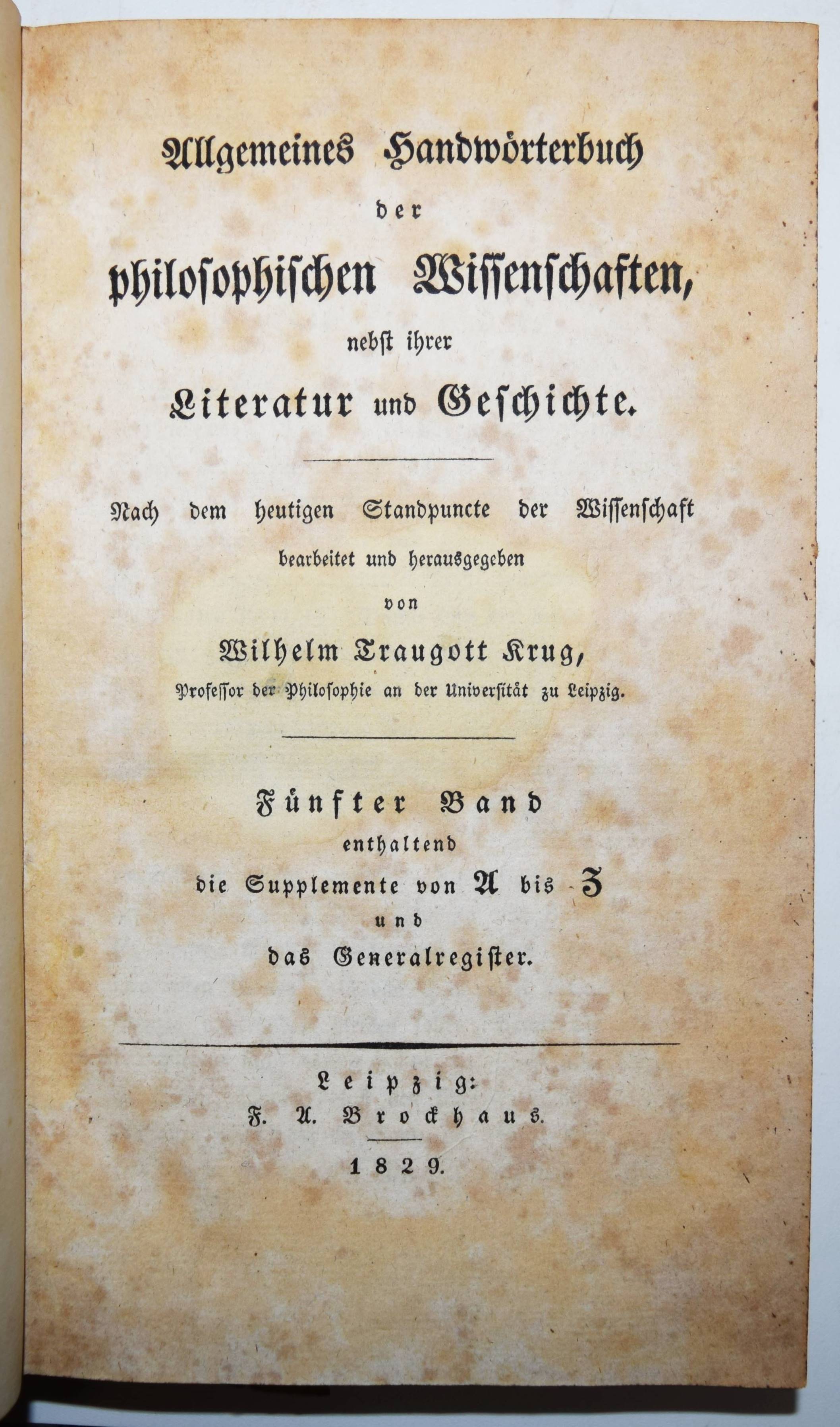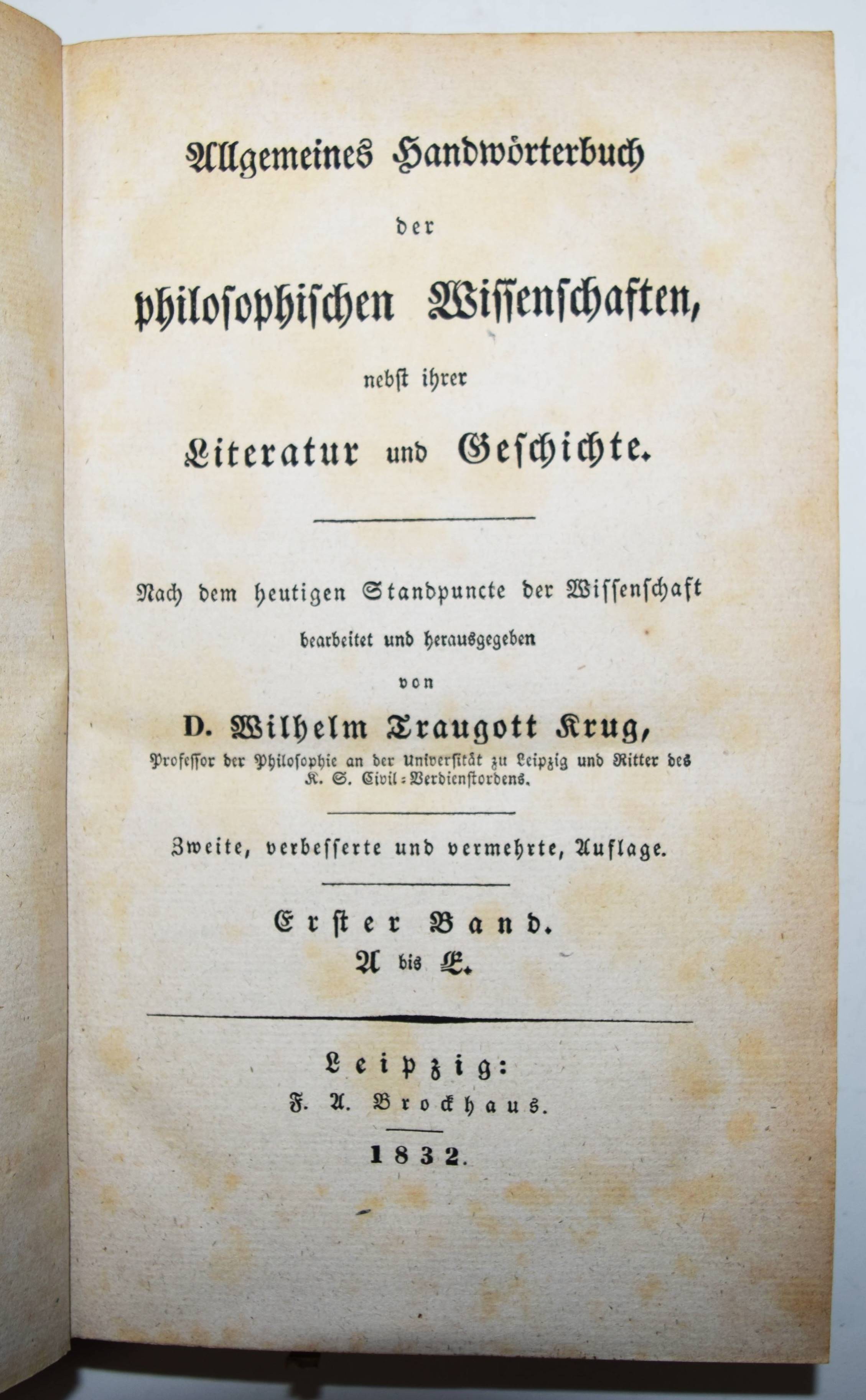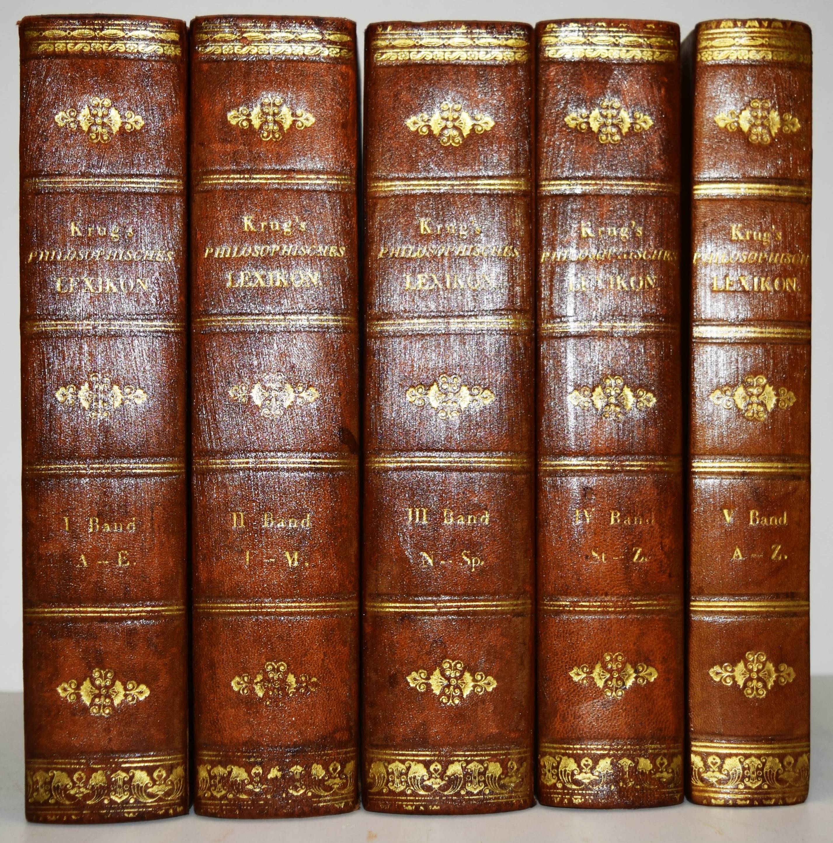 Krug, Wilhelm Traugott. Allgemeines Handwörterbuch der philosophischen Wissenschaften, nebst ihrer Literatur und Geschichte. Nach dem heutigen Standpunkte der Wissenschaft bearbeitet und herausgegeben. 2., verbesserte und vermehrte, Auflage (und 1. Auflage, Band V). 5 Bände. Leipzig, F. A. Brockhaus 1829-1832. 8°. Halblederbände der Zeit mit goldgepr. Rückentiteln und dezenter Rückenvergoldung Kosch, Ergänzungsband V, 550. NDB XIII, 114 f. Ziegenfuss I, 691. Zischka S. 40. – Maßgebliche Ausgabe. – „Die Bedeutung K.s liegt weniger in seiner Philosophie als vielmehr darin, daß er es dank einer verständlichen Sprache verstand, in der breiten Öffentlichkeit das Interesse für die Philosophie zu wecken und liberales Denken in Staat und Kirche zu fördern. Er war der Meinung, die Philosophie bedürfe keiner eigenen Terminologie, da die Priorität dem Denken und nicht der Sprache zukomme (Über das Verhältnis der Philosophie zum gesunden Menschenverstände, 1837)“ (F. Holz in NDB). – W. T. Krug (1770-1842), „Anhänger der Kantischen Philosophie. K. selbst vertrat einen „transzendalen Synthetismus“: es findet in unserem Bewußtsein eine ursprüngliche transzendentale Synthesis zwischen Idealem und Realem, Wissen und Sein, Subjektivem und Objektiven statt; weder kann das Denken aus dem Sein, noch das Sein aus dem Denken abgeleitet werden. Diese in unserem Bewußtsein in die Erscheinung tretende Synthesis ist die Grundlage aller Philosophie. Sie kann nicht weiter erklärt werden, da jede Erklärung beim Denken oder beim Sein anfangen müßte und dadurch gerade die Synthesis, welche erst eine Erkenntnis möglich macht, zerstören würde. Die allgemeinste Tatsache des Bewußtseins ist in der Erkenntnis, daß ich tätig bin, bezeichnet, das oberste Formalprinzip in dem Streben nach absoluter Harmonie in aller meiner Tätigkeit“ (Werner Ziegenfuss). – Rücken etwas berieben, stellenweise leicht braunfleckig, gutes dekorativ gebundenes Exemplar.