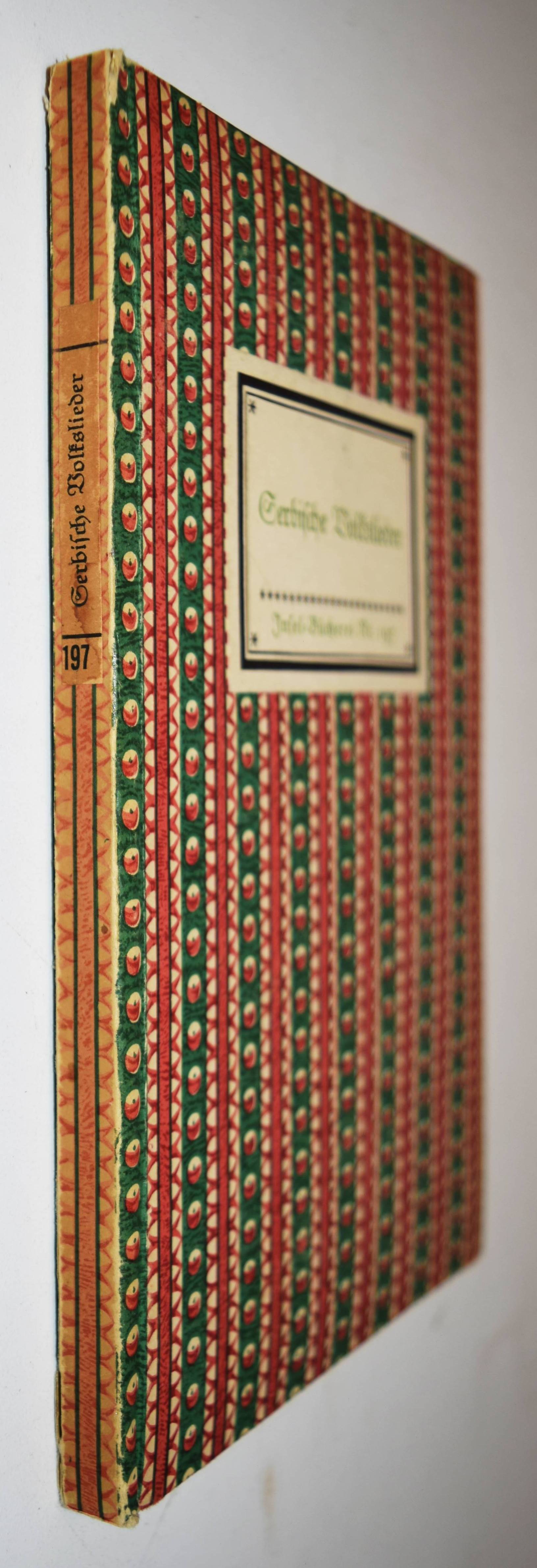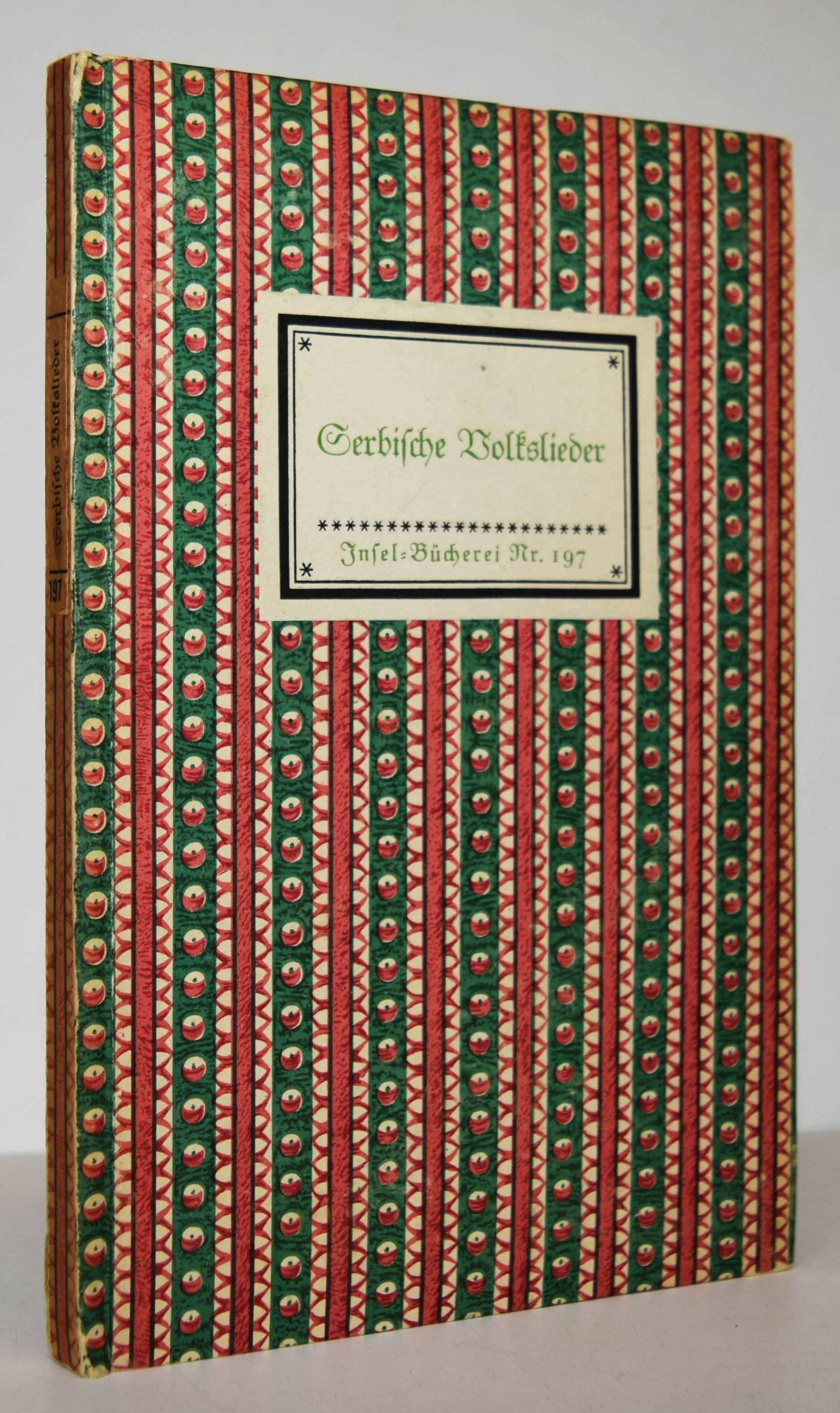 (Curcin, Milan, Hrsg.). Serbische Volkslieder. 16. und 17. Tausend. Leipzig, Insel-Verlag o. J. (1939). 8°. 108 S., [2] Bl. Orig.-Pappband mit Rücken- und Deckelschild. (Insel-Bücherei, Nr. 197, [2]). Jenne 197 [2] und 372 (Abb.). – Sehr seltene Einbandvariante: das Bezugspapier (Nr. 55) hier verkehrt herum verwendet mit dem roten Halbmond nach oben offen, nicht nach unten wie bei Jenne abgebildet. So nicht bei Jenne. – Rücken etwas aufgehellt, Exlibris-Stempel, sehr gutes Exemplar.