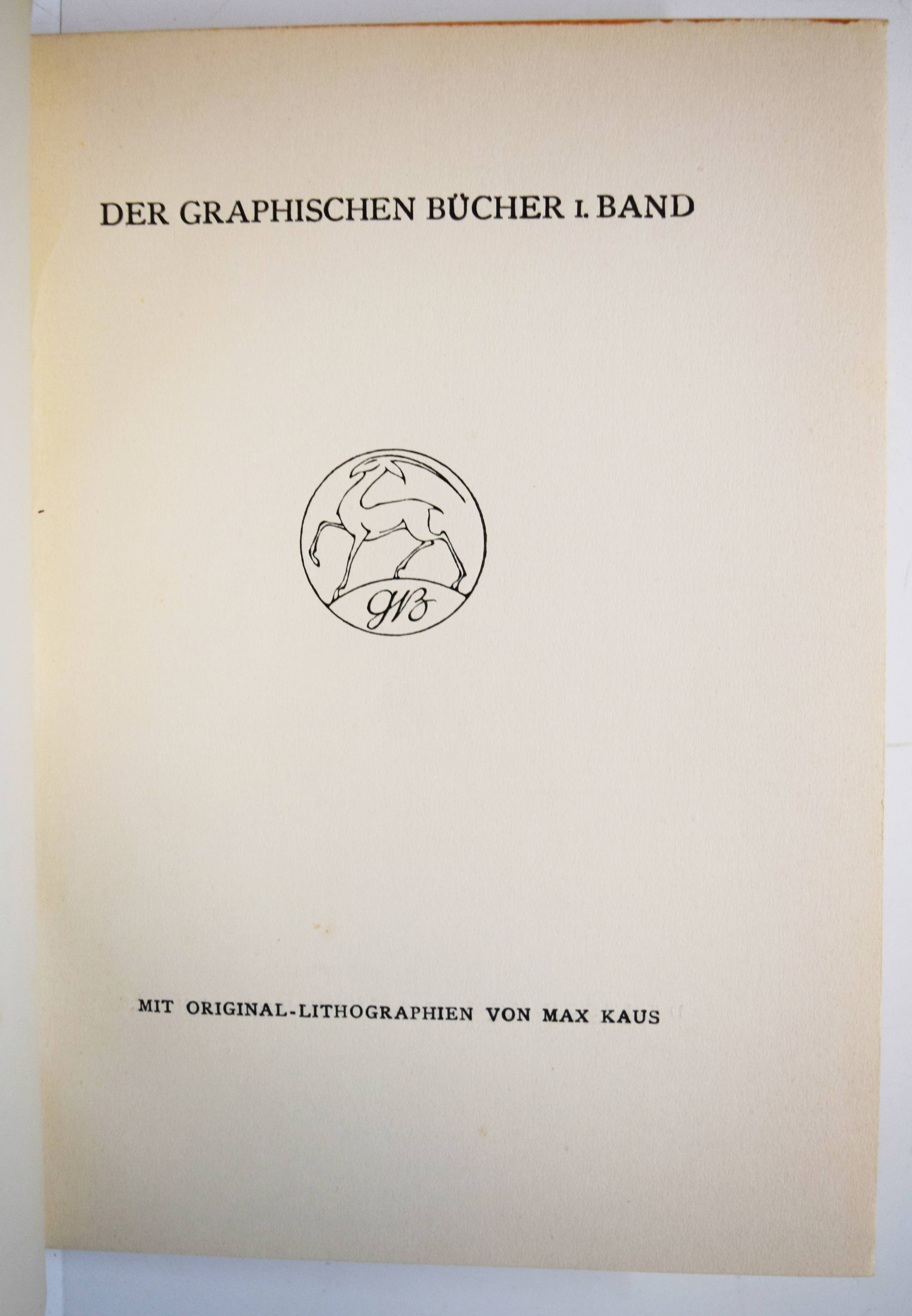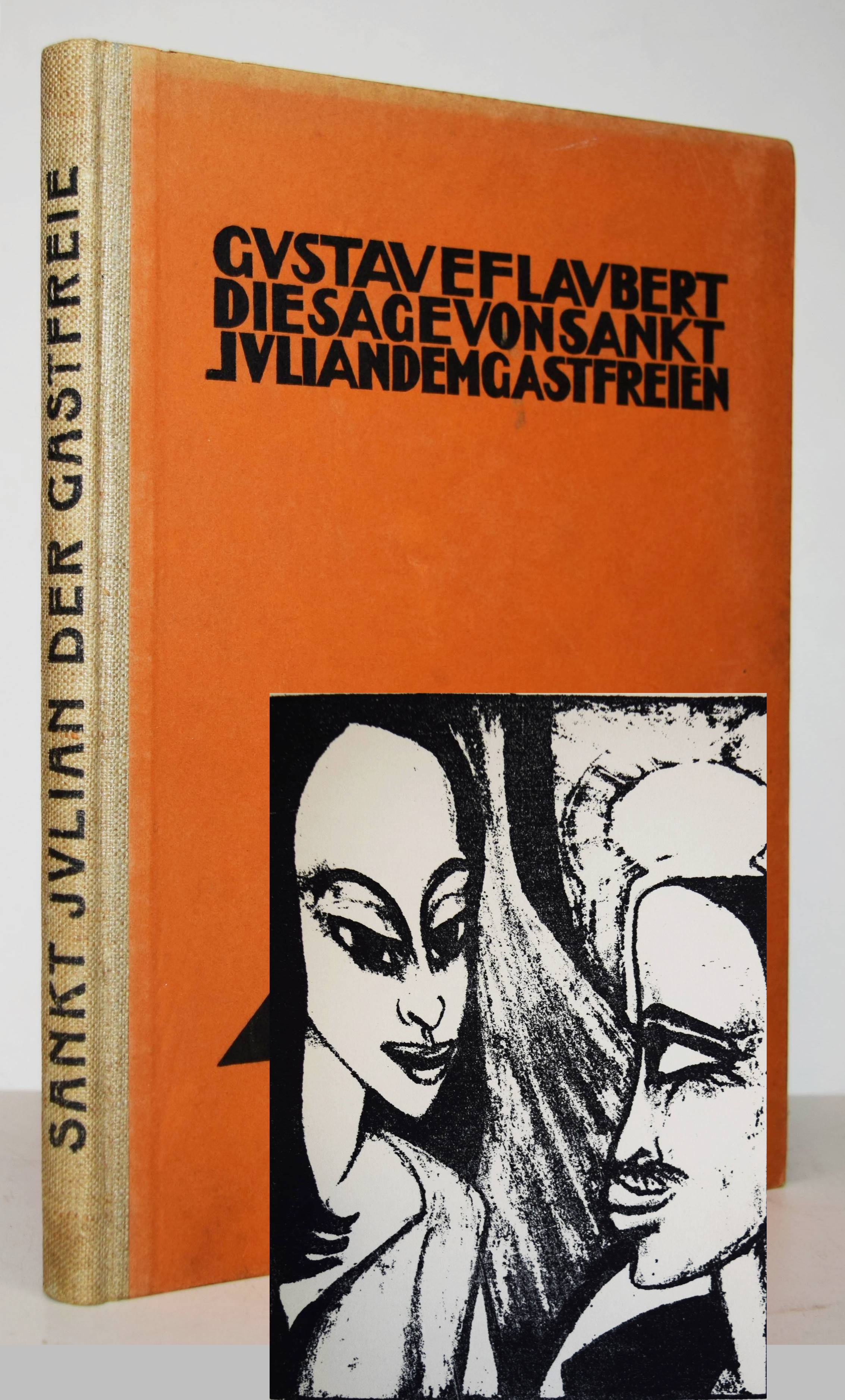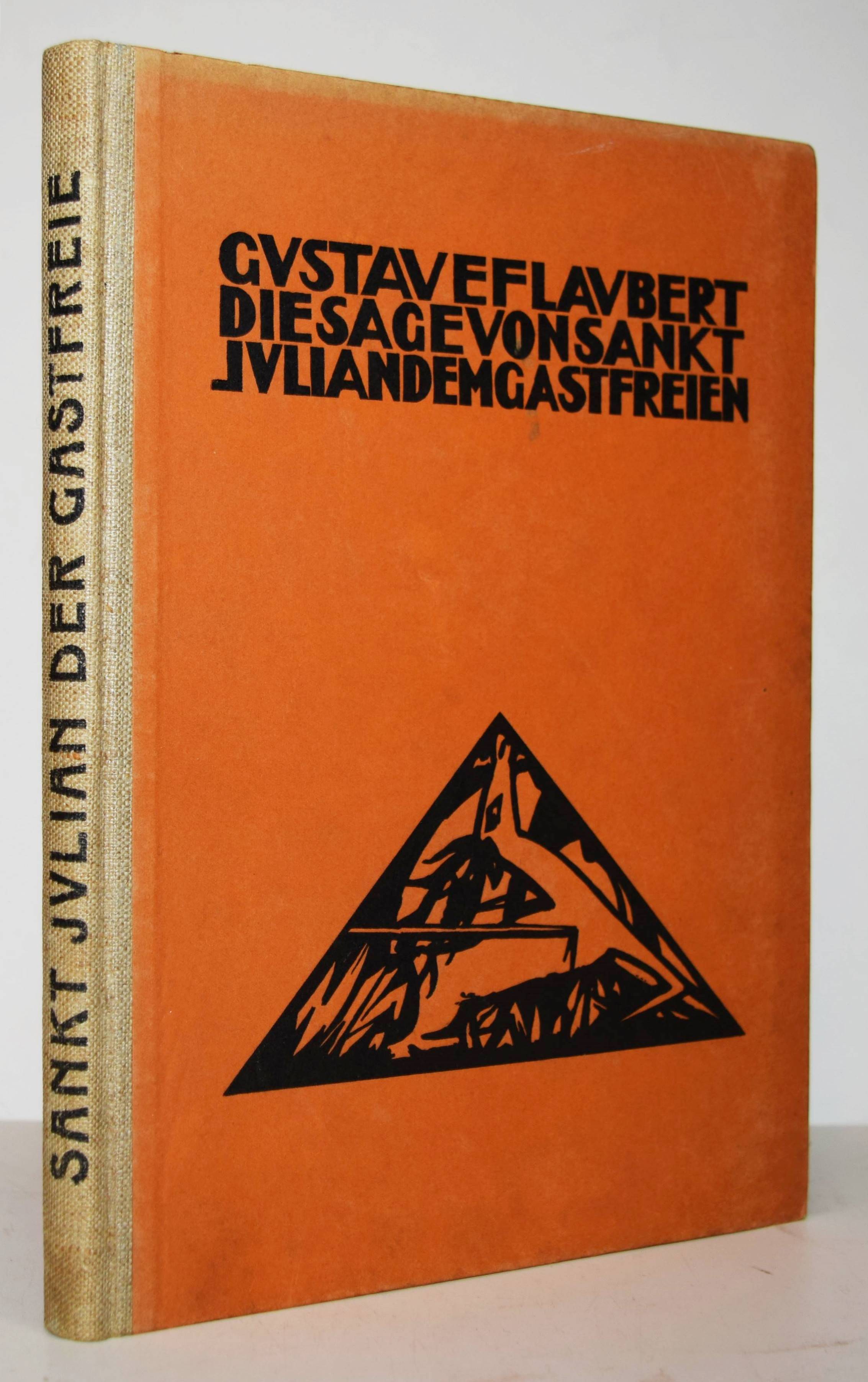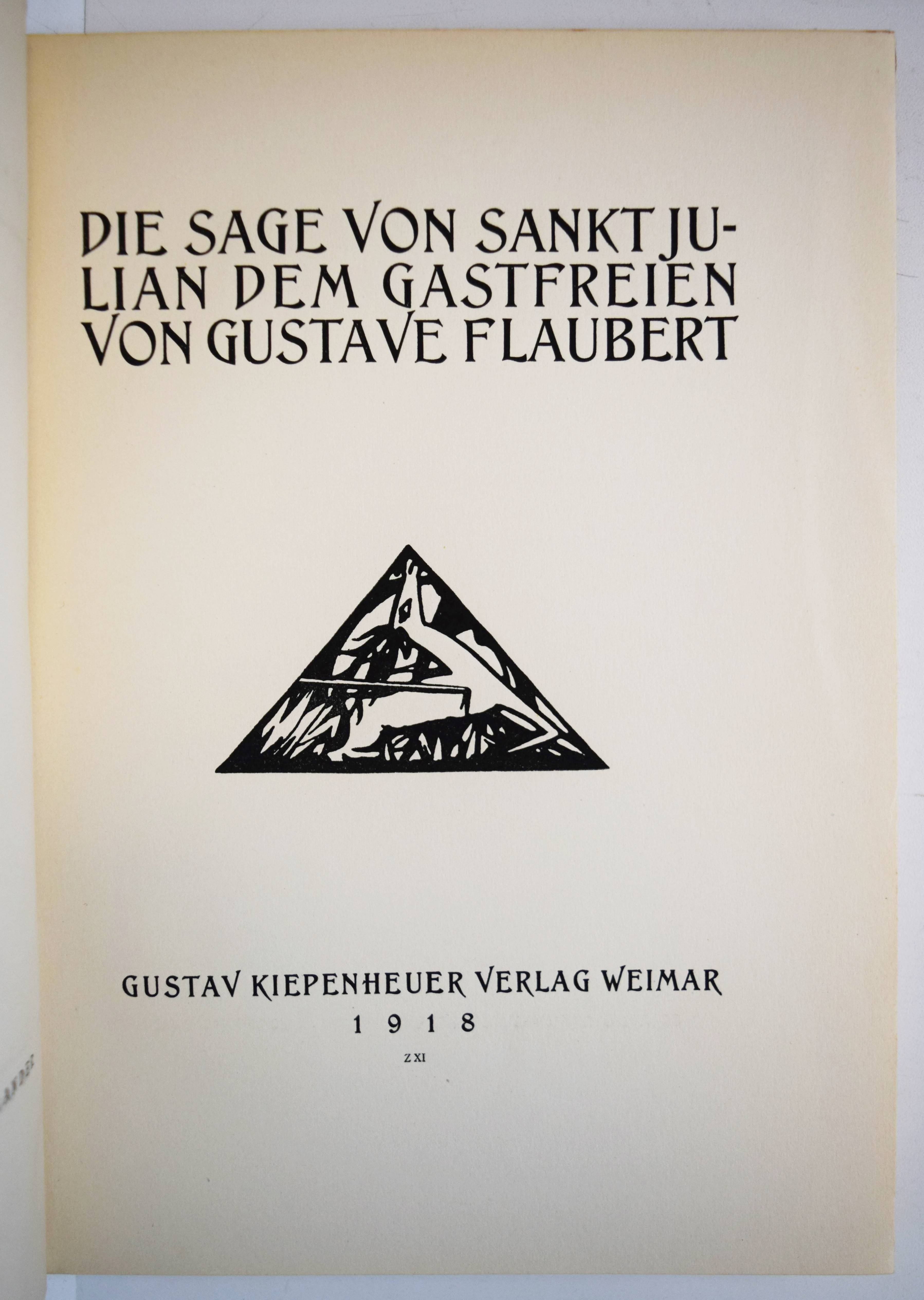 Flaubert, Gustave. Die Sage von Sankt Julian dem Gastfreien. (Deutsch von Else v. Hollander). Weimar, Gustav Kiepenheuer 1918. Gr.-8°. 46 S. mit Titelvignette und 12 ganzs. Orig.-Lithographien von Max Kaus. Illustr. Orig.-Halbleinenband. (Graphische Bücher, I. Band). Jentsch 49. Lang, Express. Buchillustration 165. Fromm III, 9315. – Erste Ausgabe. – Max Kaus (1891-1977) studierte u.a. bei Heckel und Kirchner und war Mitglied der Berliner Sezession und den Münchner Expressionistischen Werkstätten. – Deckelränder etwas angestaubt, sonst gutes sauberes Exemplar.