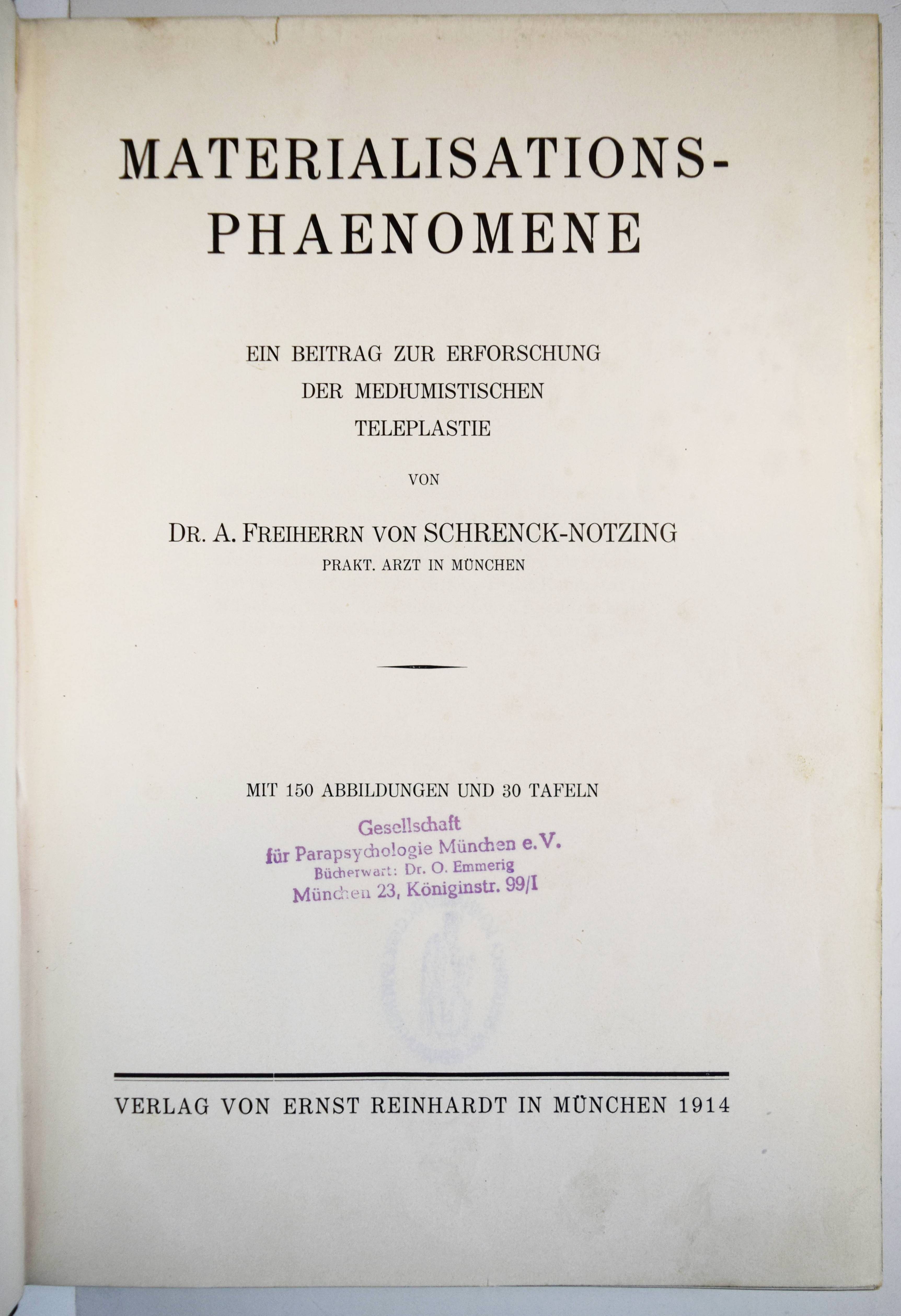 Schrenck-Notzing, Albert v. Materialisations-Phaenomene. Ein Beitrag zur Erforschung der mediumistischen Teleplastie. München, Ernst Reinhardt 1914. Gr.-8°. XI, (1), 523, (1) S. mit 150 Abbildungen auf 30 Tafeln. Orig.-Leinenband. Erste Ausgabe. – Stempel auf dem Titel, gutes Exemplar des interessanten Werkes.