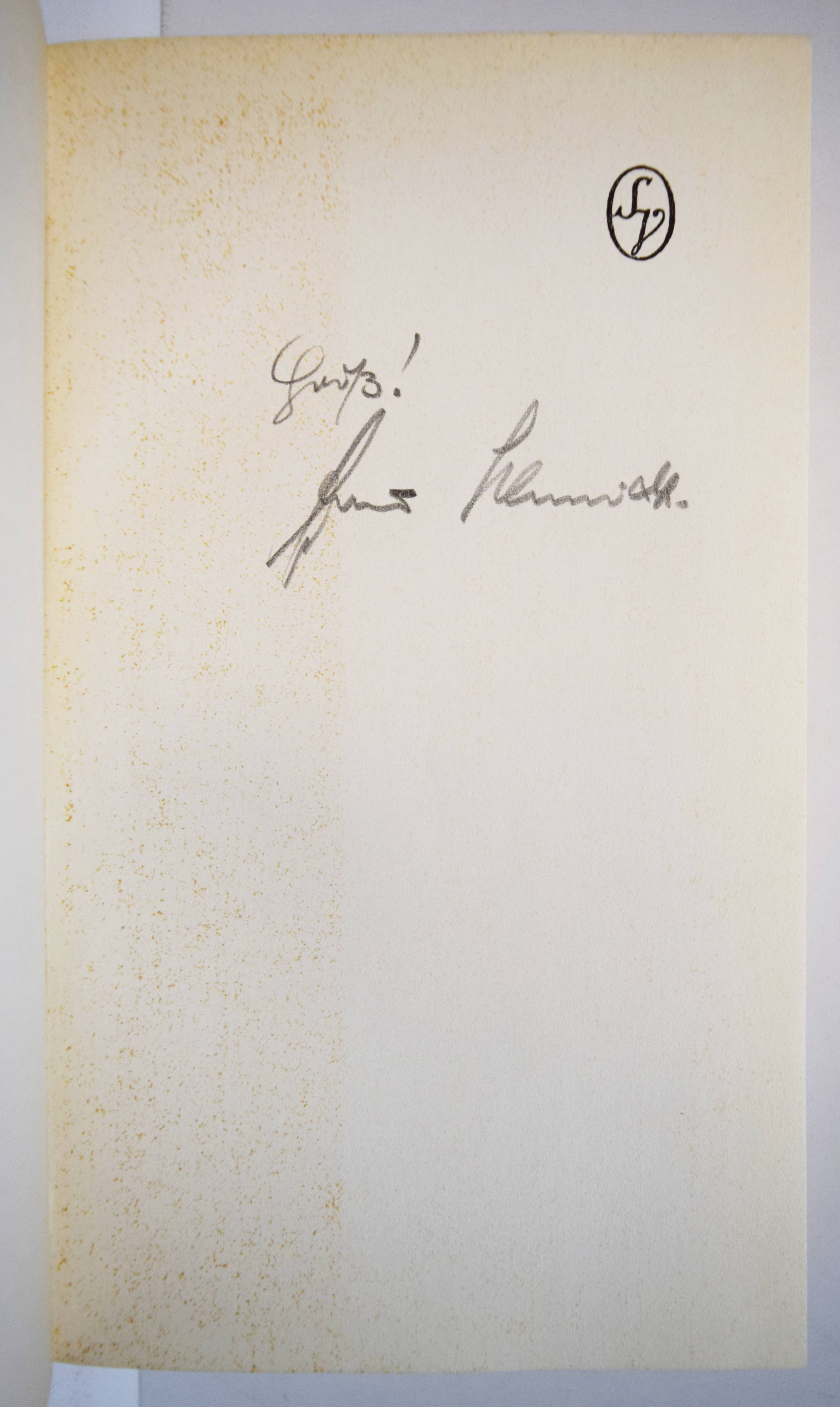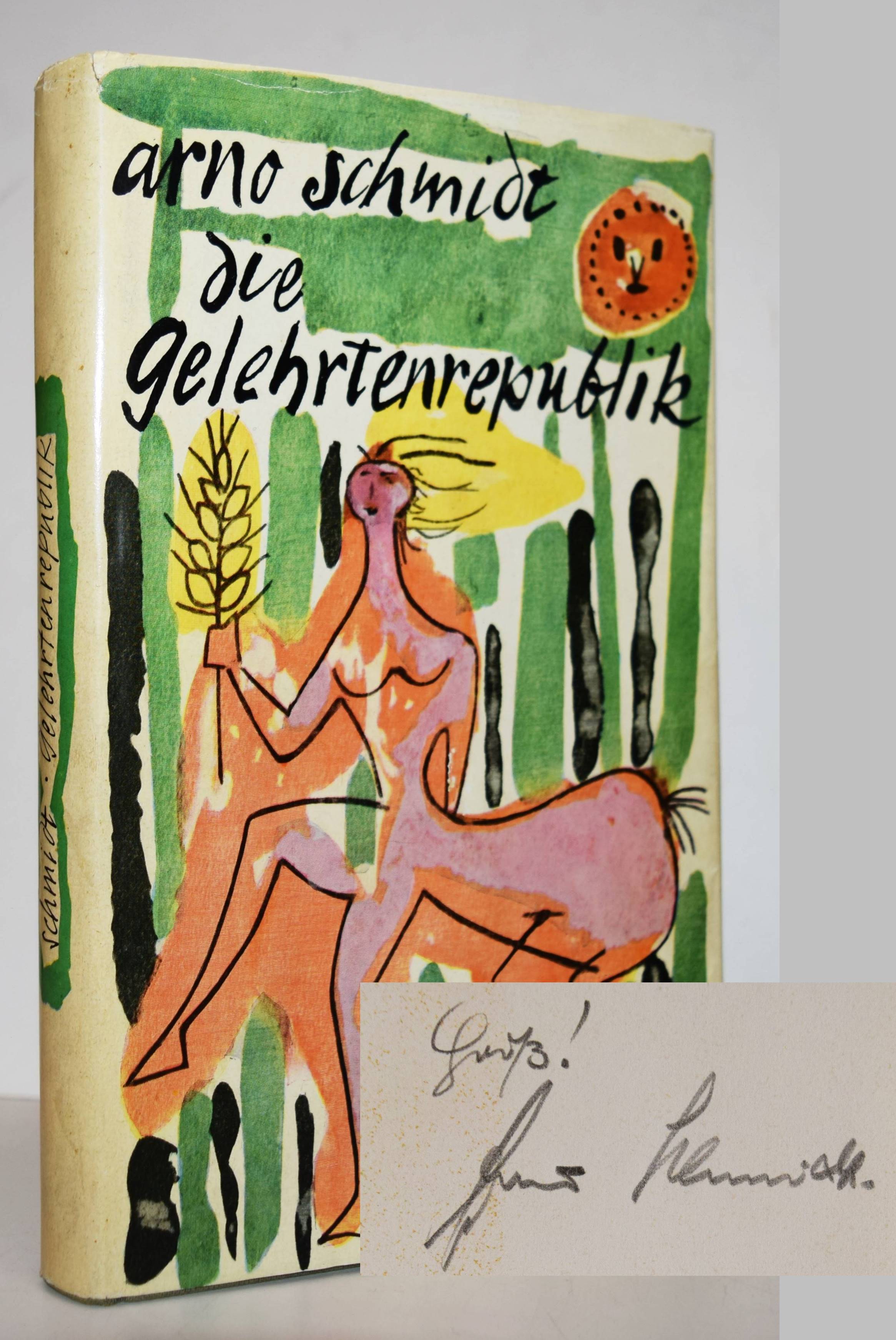 Schmidt, Arno. Die Gelehrtenrepublik. Kurzroman aus den Rossbreiten. Karlsruhe, Stahlberg Verlag (1957). 8°. 225 S., [1] Bl. Orig.-Leinenband mit farbig illustr. Schutzumschlag (Entwurf: Imre Reimer). Bock 1.1.7. W.-G.² 12. – Erste Ausgabe. Mit eigenhändiger Widmung von Arno Schmidt „Gruß! Arno Schmidt“. – „Der von Witz und grotesken Situationen strotzende Roman enthält viele Anspielungen auf die Darmstädter Künstlerkolonie, die Schmidt in den Jahren 1955-1958 kennenlernte.“ (KLL 3832). – Sehr gutes Exemplar.