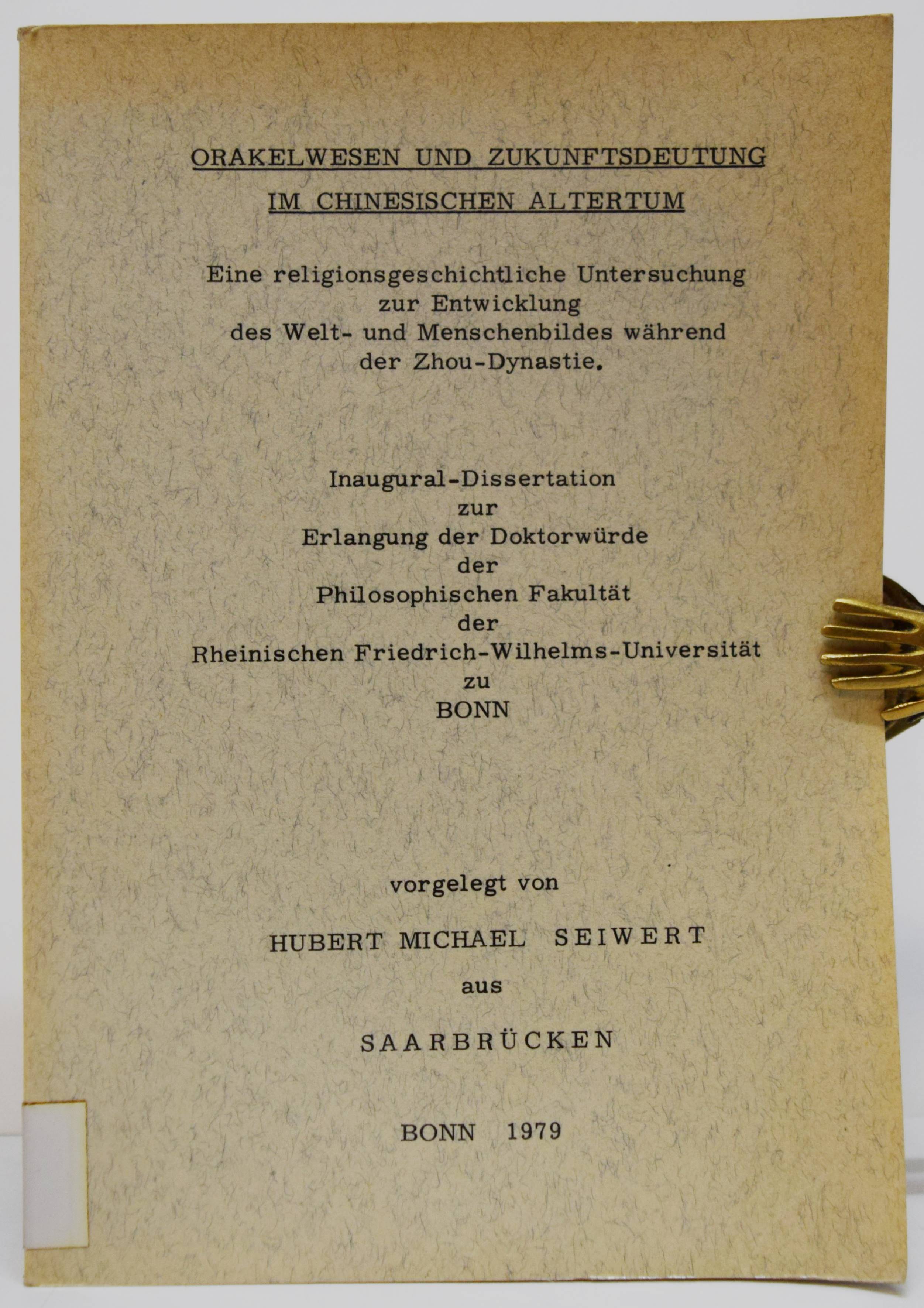 Seiwert, Hubert Michael. Orakelwesen und Zukunftsdeutung im chinesischen Altertum. Eine religionsgeschichtliche Untersuchung zur Entwicklung des Welt- und Menschenbildes während der Zhou-Dynastie. Inaugural-Dissertation… der Rheinischen Friedrich-Wilhelms-Universität zu Bonn. Bonn 1979. 8°. 352 S. Orig.-Kartonumschlag. Seltene Dissertation des saarländischen Religionswissenschaftlers H. M. Seiwert (geb. 1949). – Umschlag mit Klebefolie kaschiert und Bibliotheks-Signatur am Fuß, gutes Exemplar.