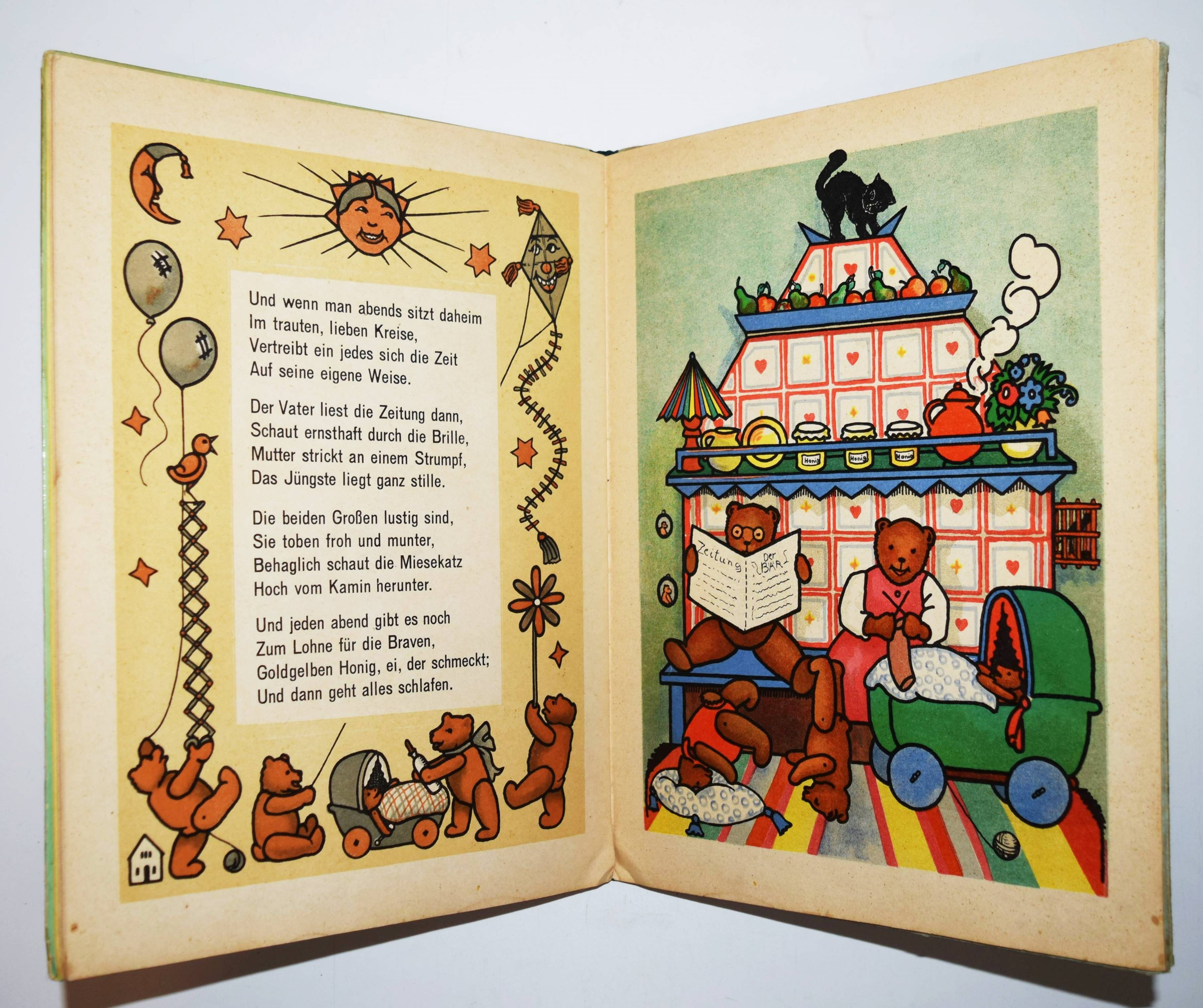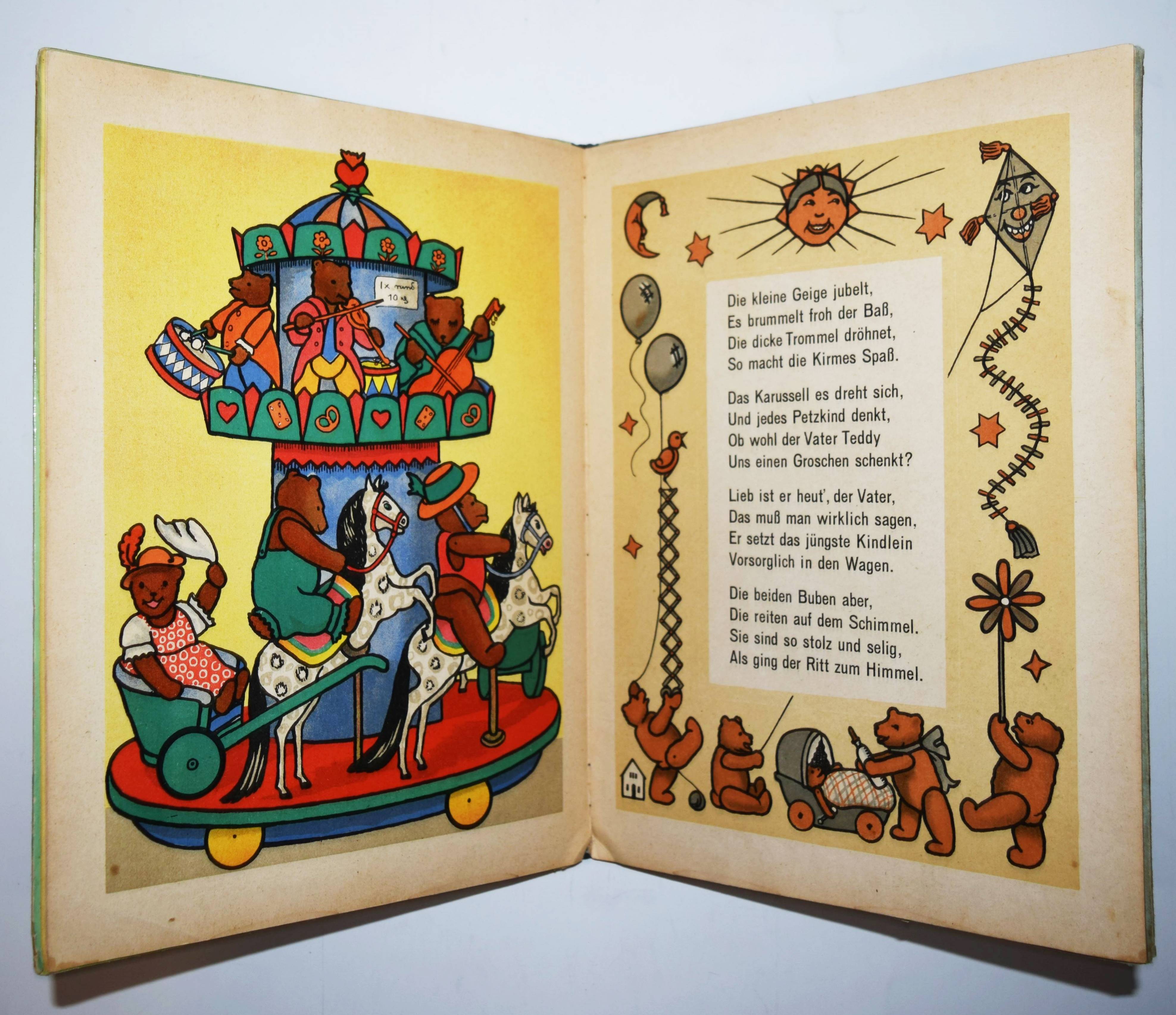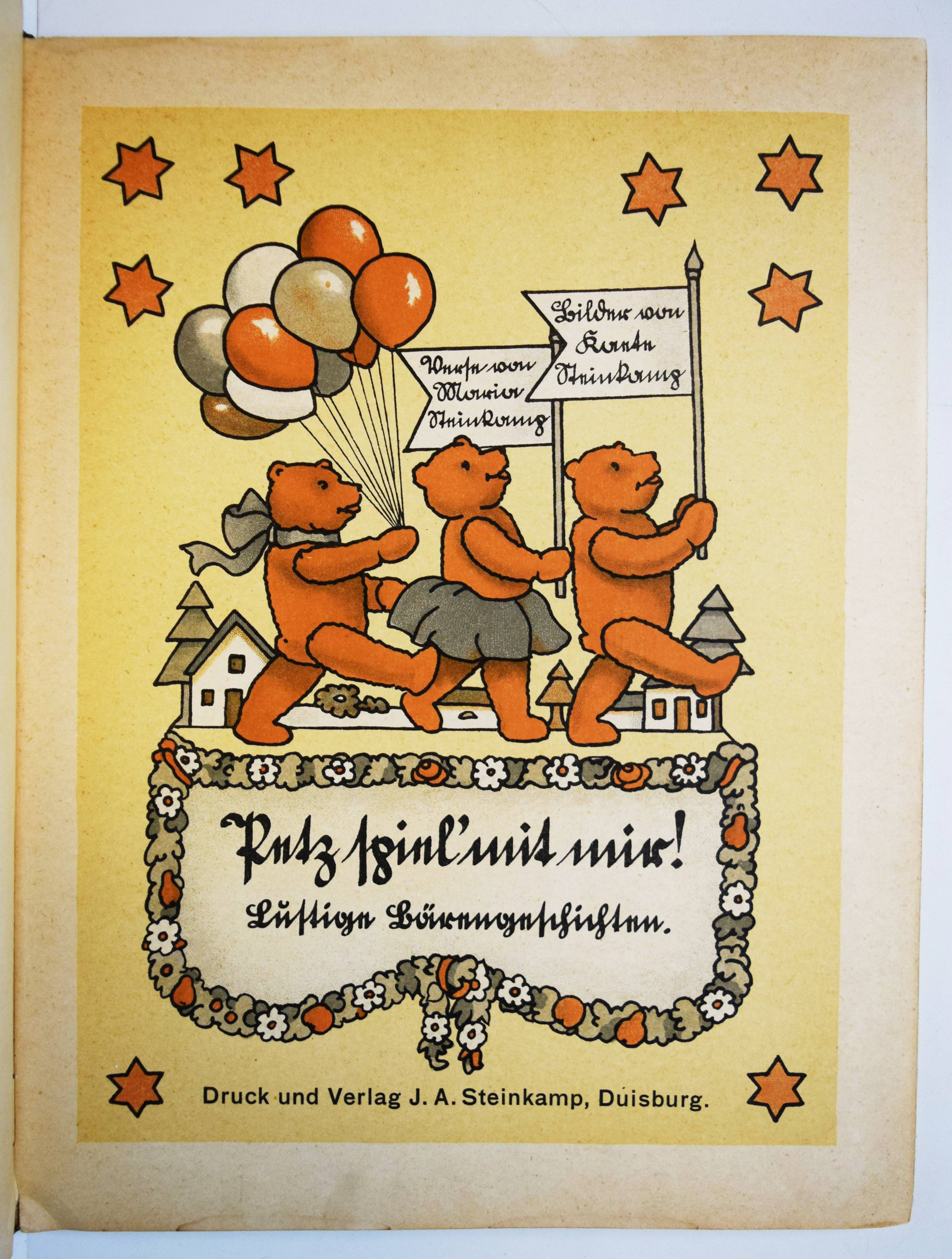 Steinkamp, Maria. Petz spiel mit mir! Lustige Bärengeschichten. Bilder von Kaete Steinkamp. Duisburg, Steinkamp o. J. (um 1920). 4°. [9] Bl. mit illustr. Titel, 8 ganzs. farblithogr. Illustrationen, illustr. Textbordüren und Schlußvignette. Farbig illustr. Orig.-Halbleinenband. (Verlags-Nr. 734). Bunk, Steinkamp-Verlag S. 67 (mit Abb.). – Seltenes Bilderbuch mit farbenfrohen Spielzeugdarstellungen. Titelblatt in Sütterlin-Schrift. Im Buch „Petz, spiel mit mir! Lustige Barengeschichten” wird laut Verlagswerbung „des Kindes Lieblingsspielzeug, der Teddybär in lustigen, farbenfrohen Bildern von Kaete Steinkamp dargestellt. Unerschöpfliche Freude gibt gerade dieses Buch den 2-4 jährigen, die in allem, was sie hier sehen, ihre Spielsachen und ihre eigene Umgebung erkennen. Maria Steinkamps Verse, umrahmt von munteren Zeichnungen, sowie farbige Vorsatzblatter ergänzen die Bilder in fröhlicher, den Kindern so leicht verständlicher Weise“.“ (Dieter Bunk). – Kaete Steinkamp, die 1895 geborene Tochter von Otto Steinkamp, hat nach Studien an den Kunstgewerbeschulen in Düsseldorf und München bei Emil Orlik in Berlin studiert. – „Nach den Arbeiten im väterlichen Verlag hat sie Wettbewerbe für Kunst am Bau gewonnen und besonders gerne Aquarelle, Monotypien und Collagen erstellt. Zwei Jahre nach ihrem Tod organisierte das Duisburger Lehmbruck Museum 1974 eine Gedächtnisausstellung mit über 40 Collagen, Aquarellen und Scherenschnitten“ (H.-D. Bunk in „Zur Geschichte des Steinkamp Verlags“, anlässlich der Ausstellung zur Ruhr Antiquaria 2010). – Deckel im Rand etwas fleckig, Innengelenke stellenweise angeplatzt, sonst gut erhalten.