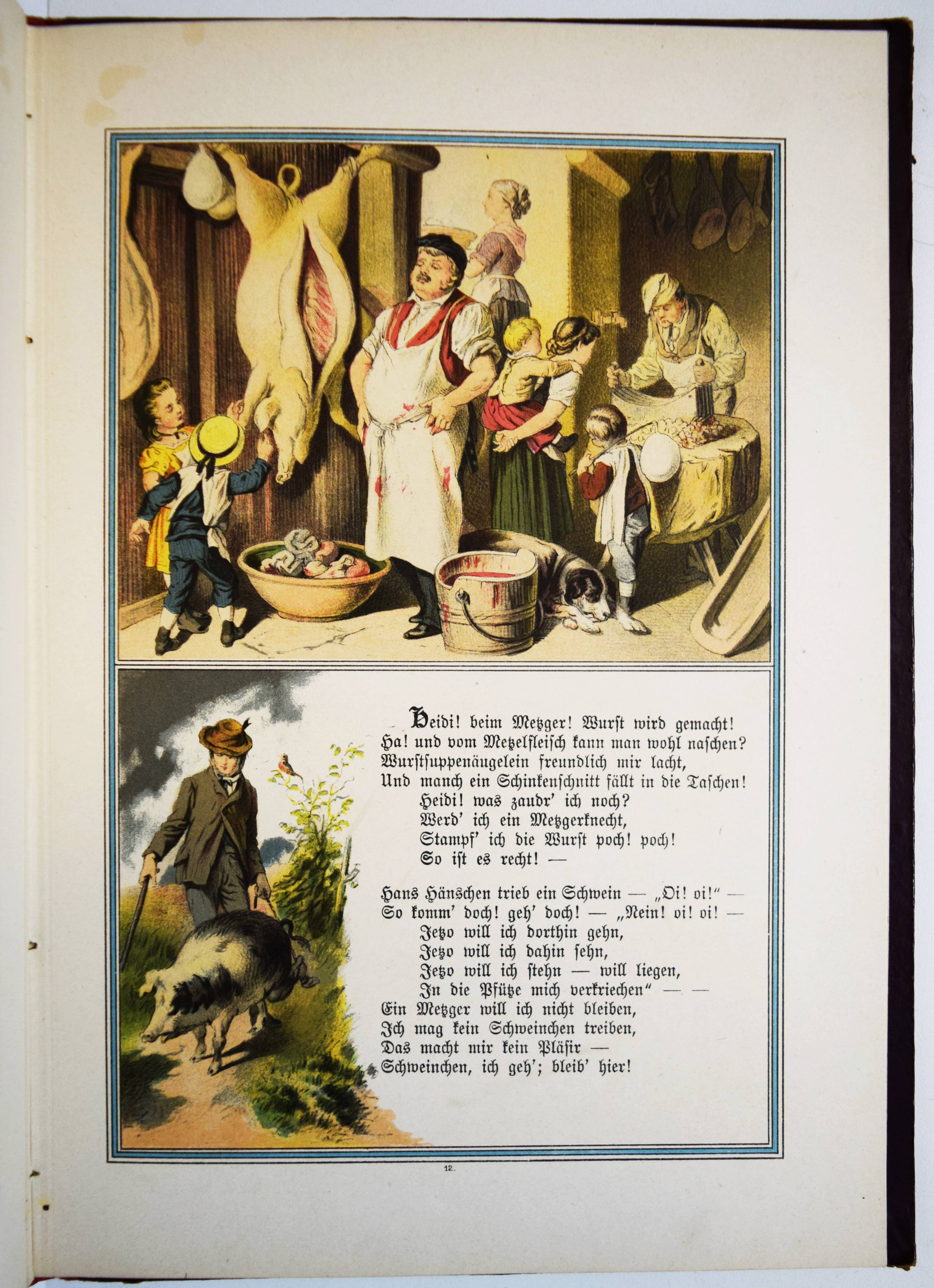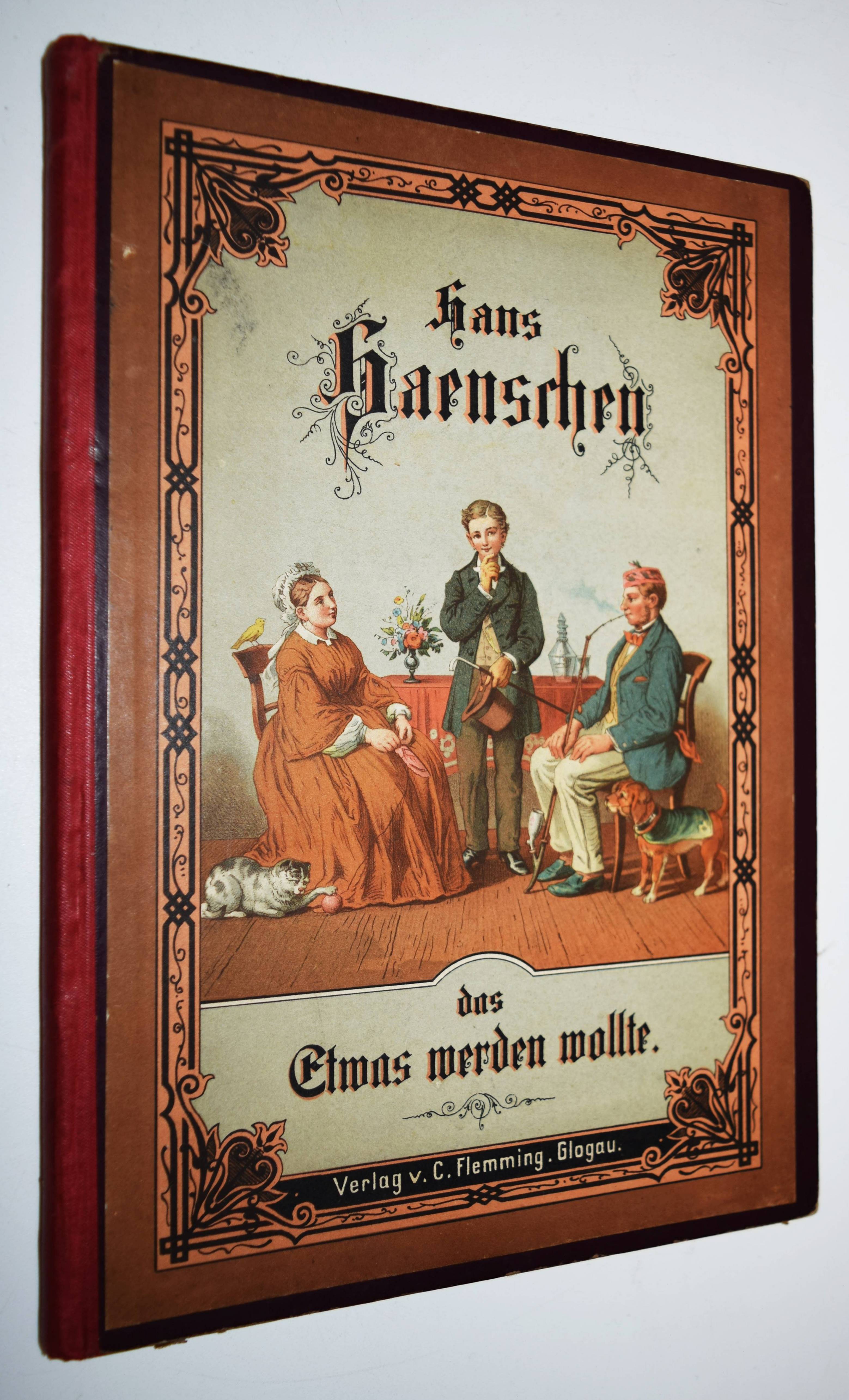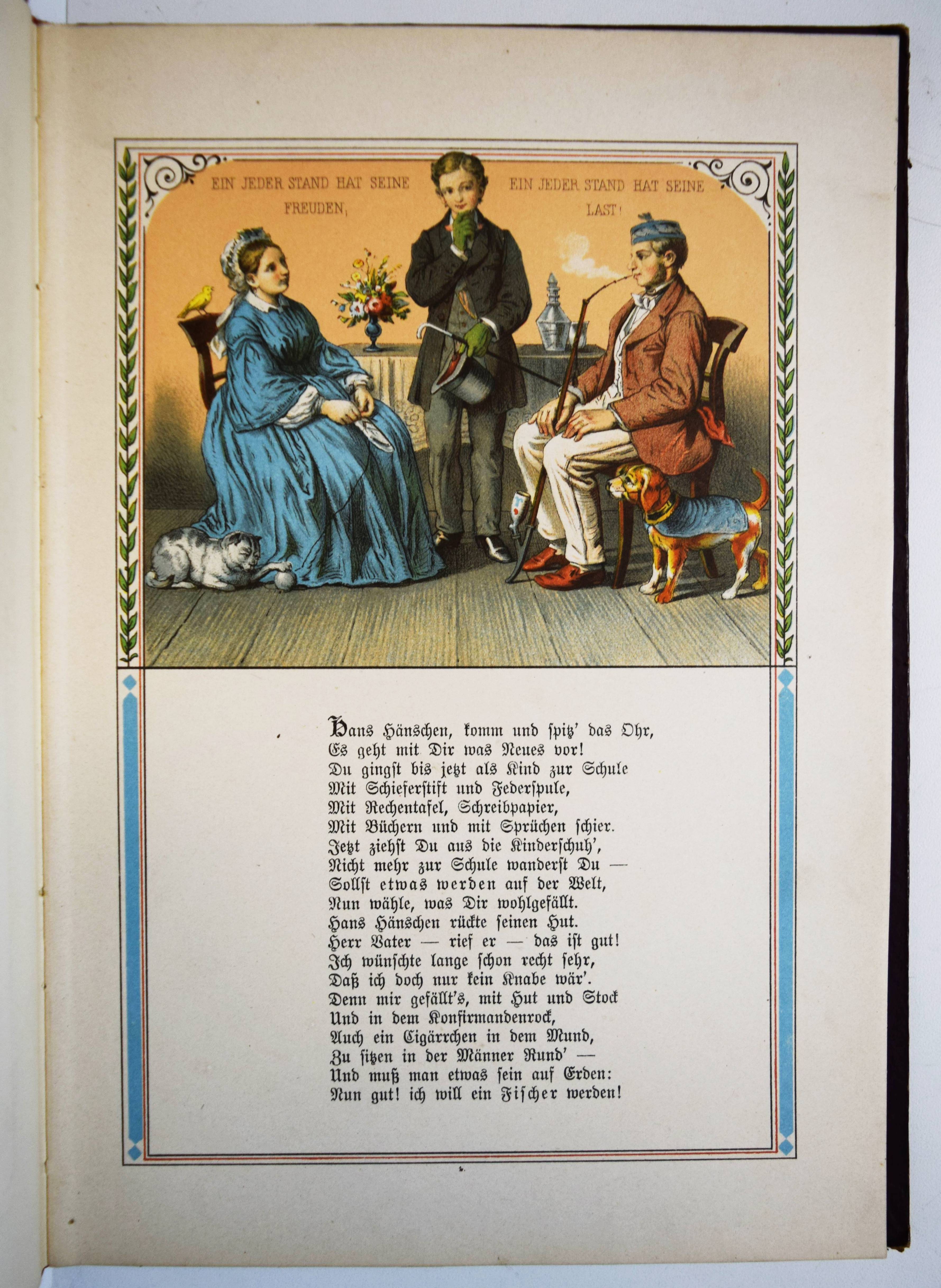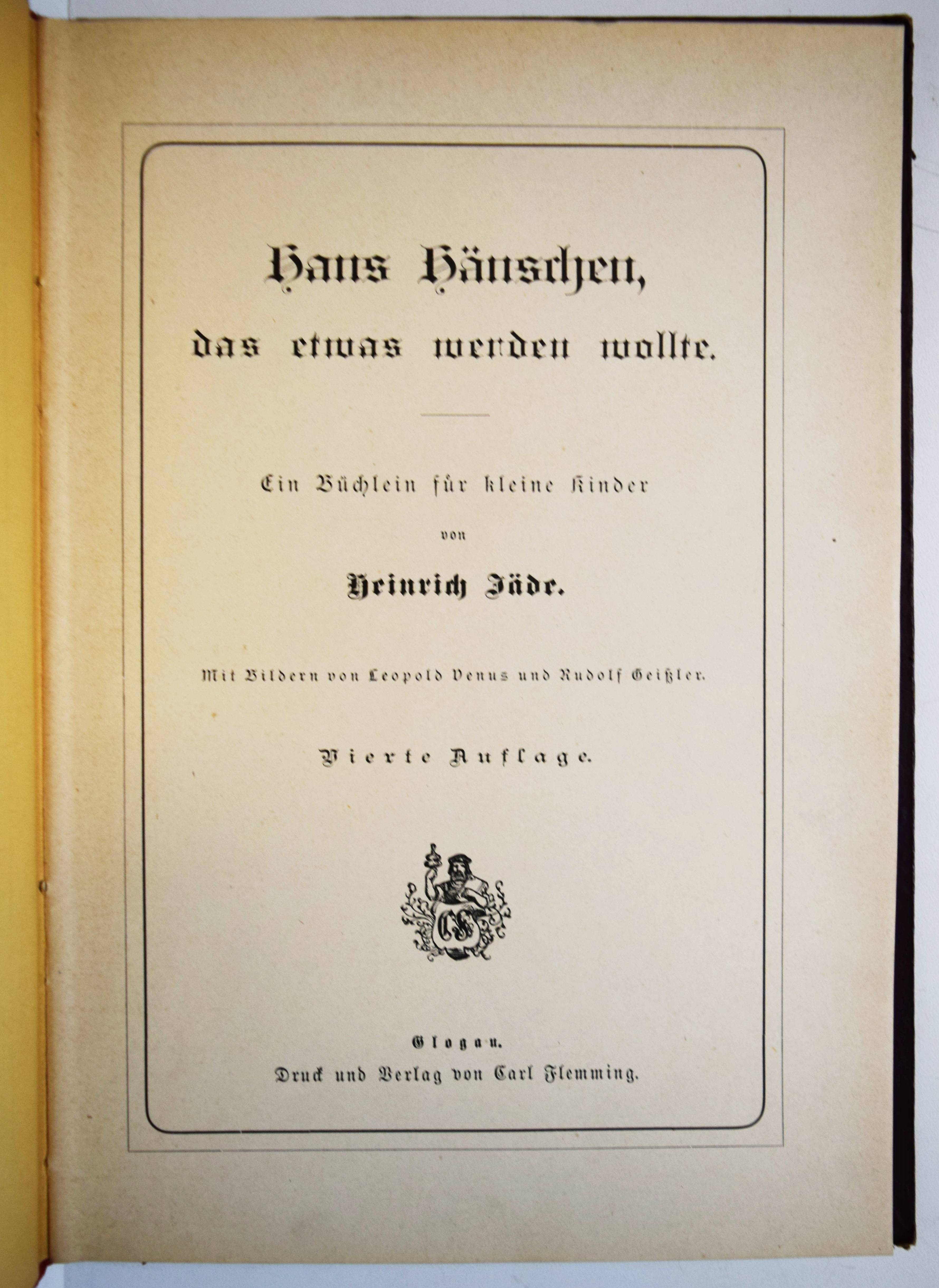Jäde, Heinrich. Hans Hänschen, das etwas werden wollte. Ein Büchlein für kleine Kinder. Mit Bildern von Leopold Venus und Rudolf Geißler. 4. Auflage. Glogau, Carl Flemming o. J. (1886). Gr.-8° (25 x 17,5 cm.). Titelblatt, 20 chromolithogr. Tafeln mit eingedruckten Versen, [2] Bl. Orig.-Halbleinenband mit farb. Deckelbild. Ries 940, 14. Wegehaupt II, 1697 (3. Auflage von 1880) . – Zuerst 1853 erschienenes Bilderbuch mit dekorativen Berufs-Darstellungen (Fischer, Hufschmied, Schmied, Müller, Bergmann, Bauer, Bäcker, Metzger, Zimmermann, Schneider, Soldat etc.). – Sehr gutes sauberes Exemplar.