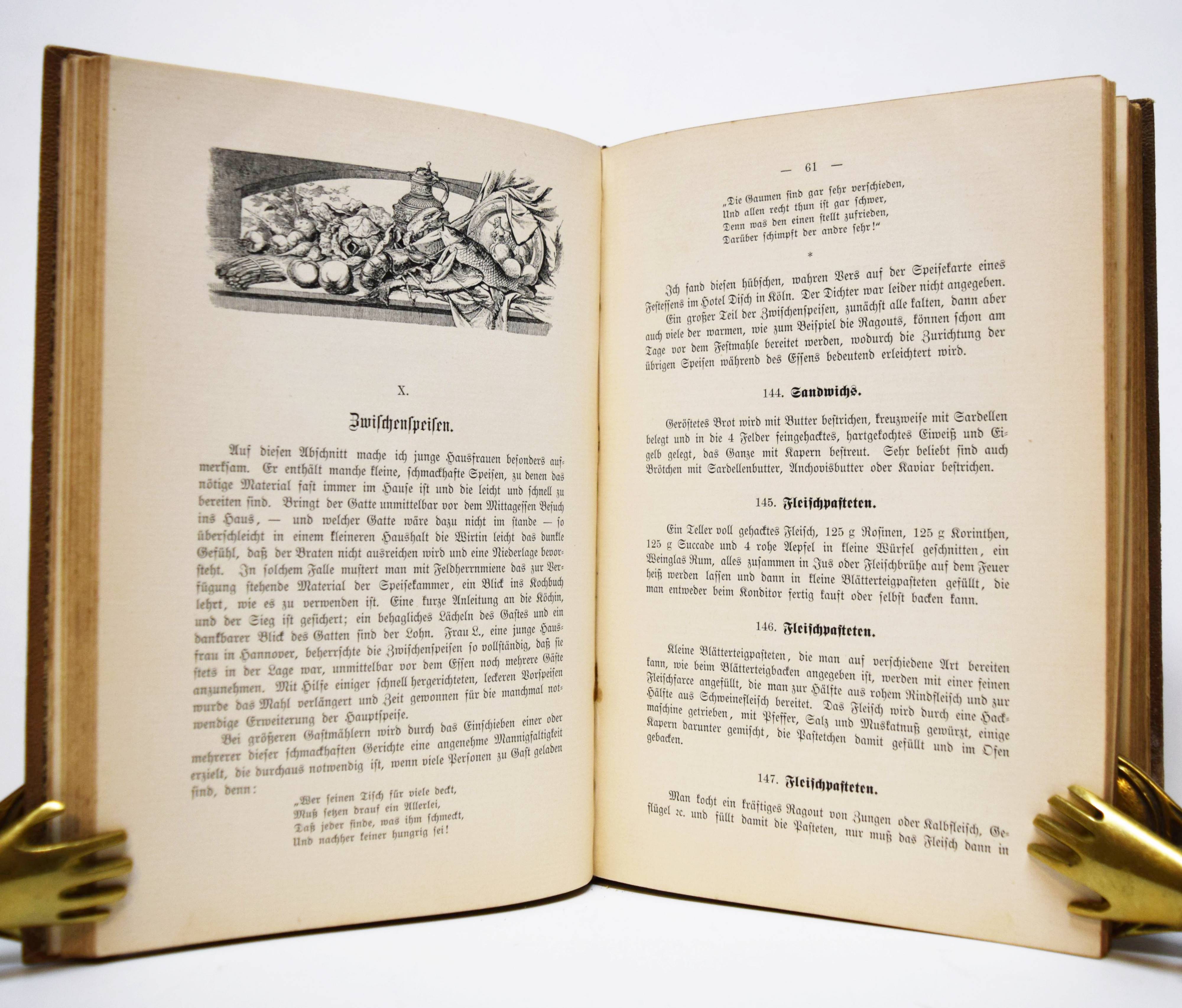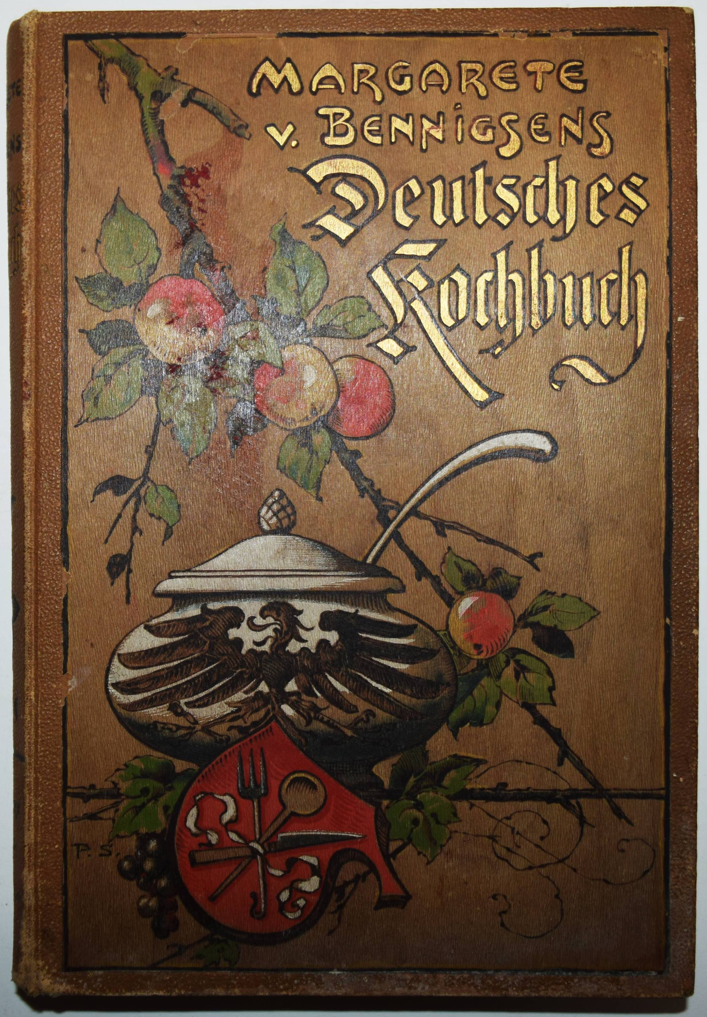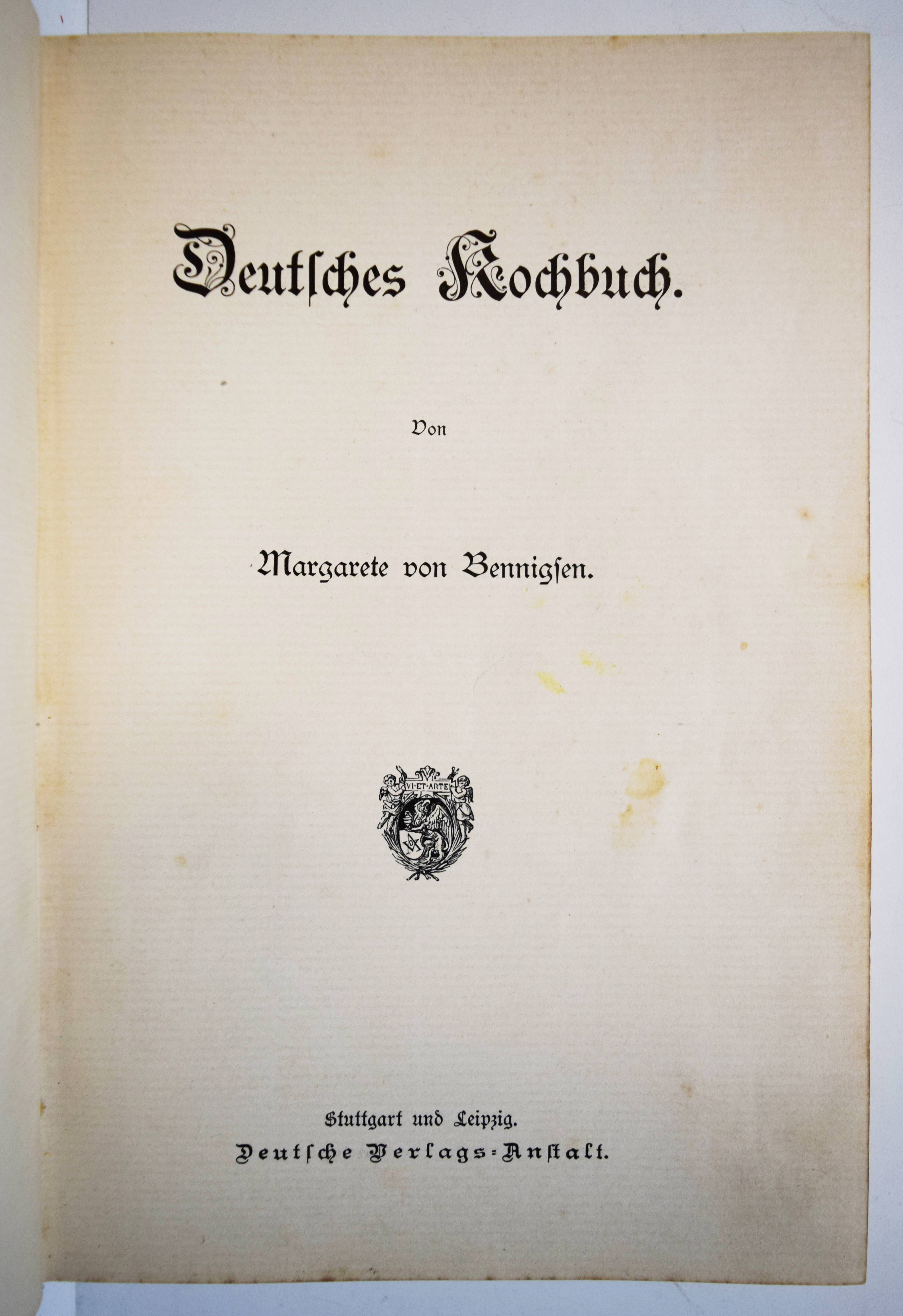 Bennigsen, Margarete v. Deutsches Kochbuch. Stuttgart/Leipzig, Dteutsche Verlags-Anstalt o. J. (1897). Gr.-8° (23,5 x 16 cm.). XXIV, 383, (8) S. mit einigen Vignetten. Farbig illustr. Orig.-Leinenband. Weiss 299. – Erste und einzige Ausgabe, selten. Mit 1328 Rezepten. – Einband etwas berieben und stellenweise fleckig, gutes sauberes Exemplar.