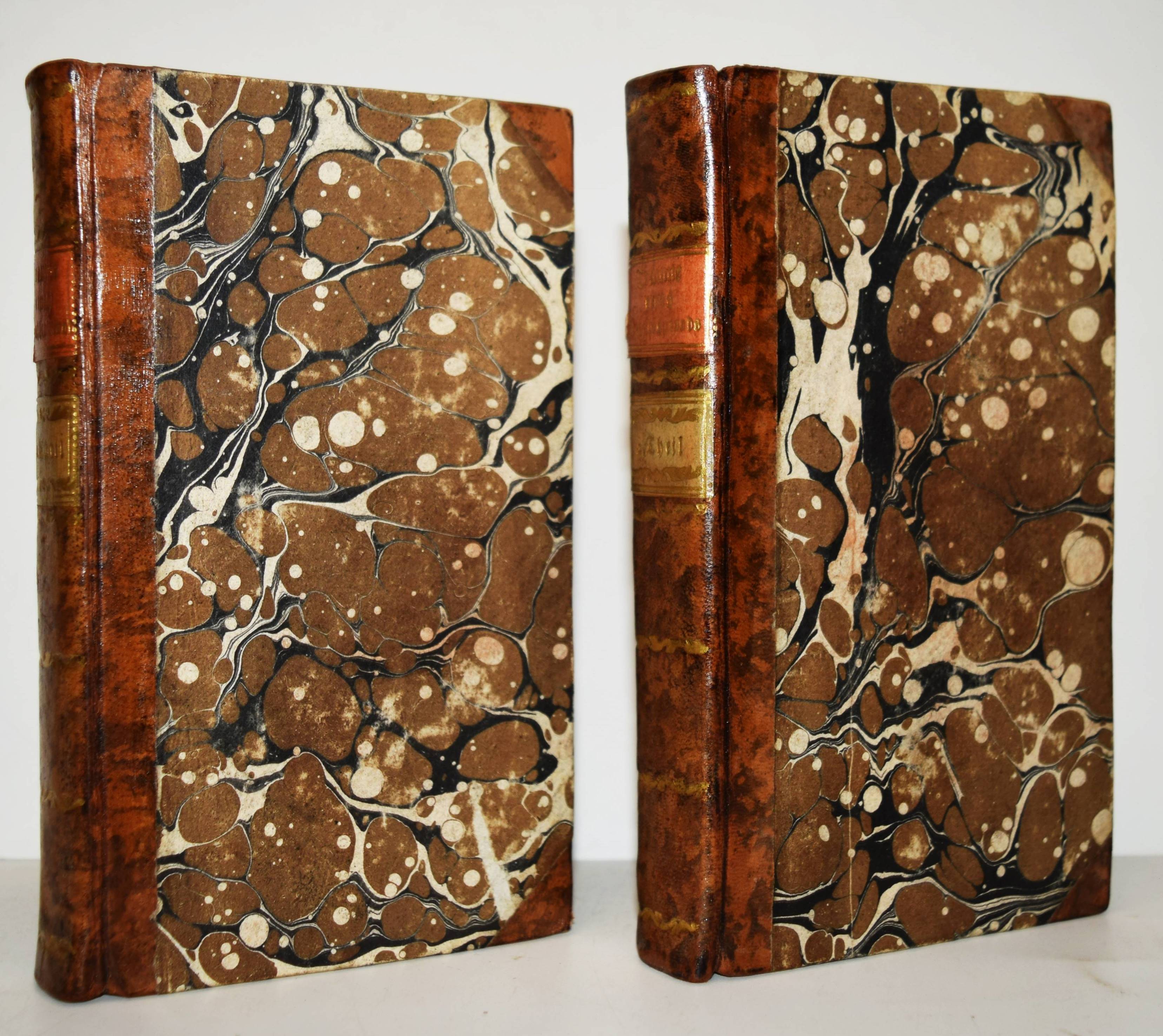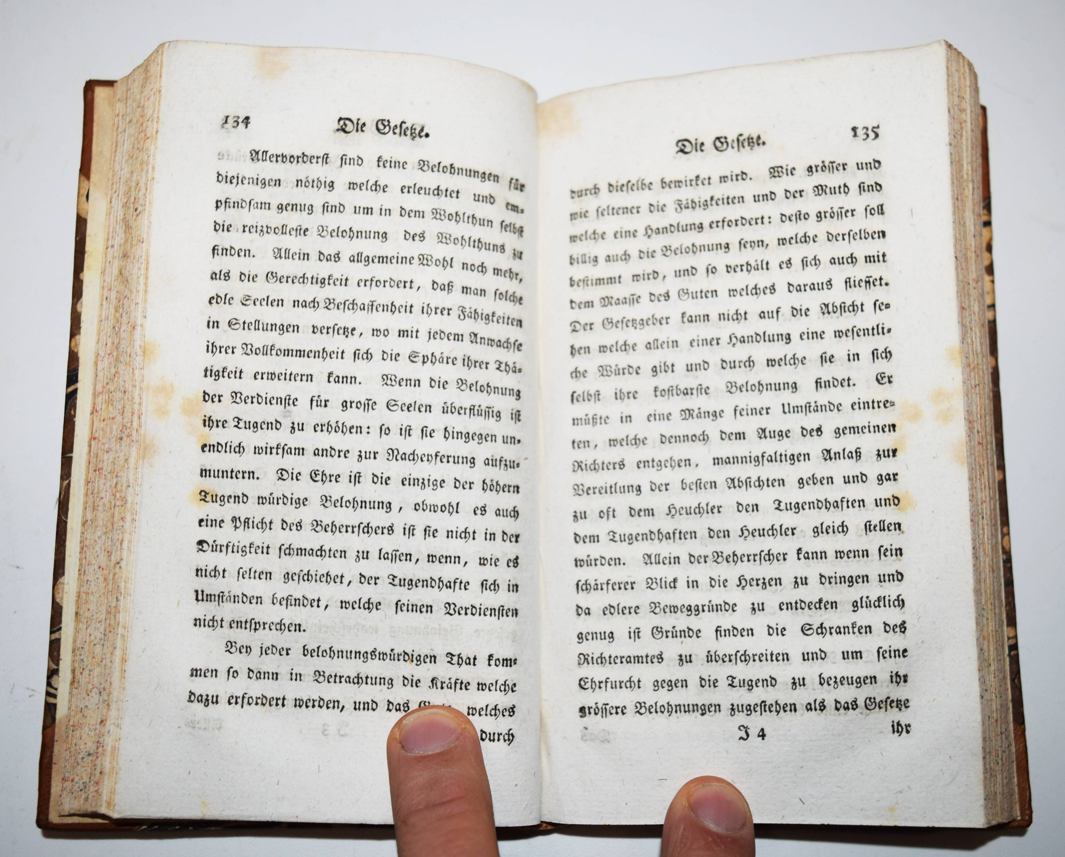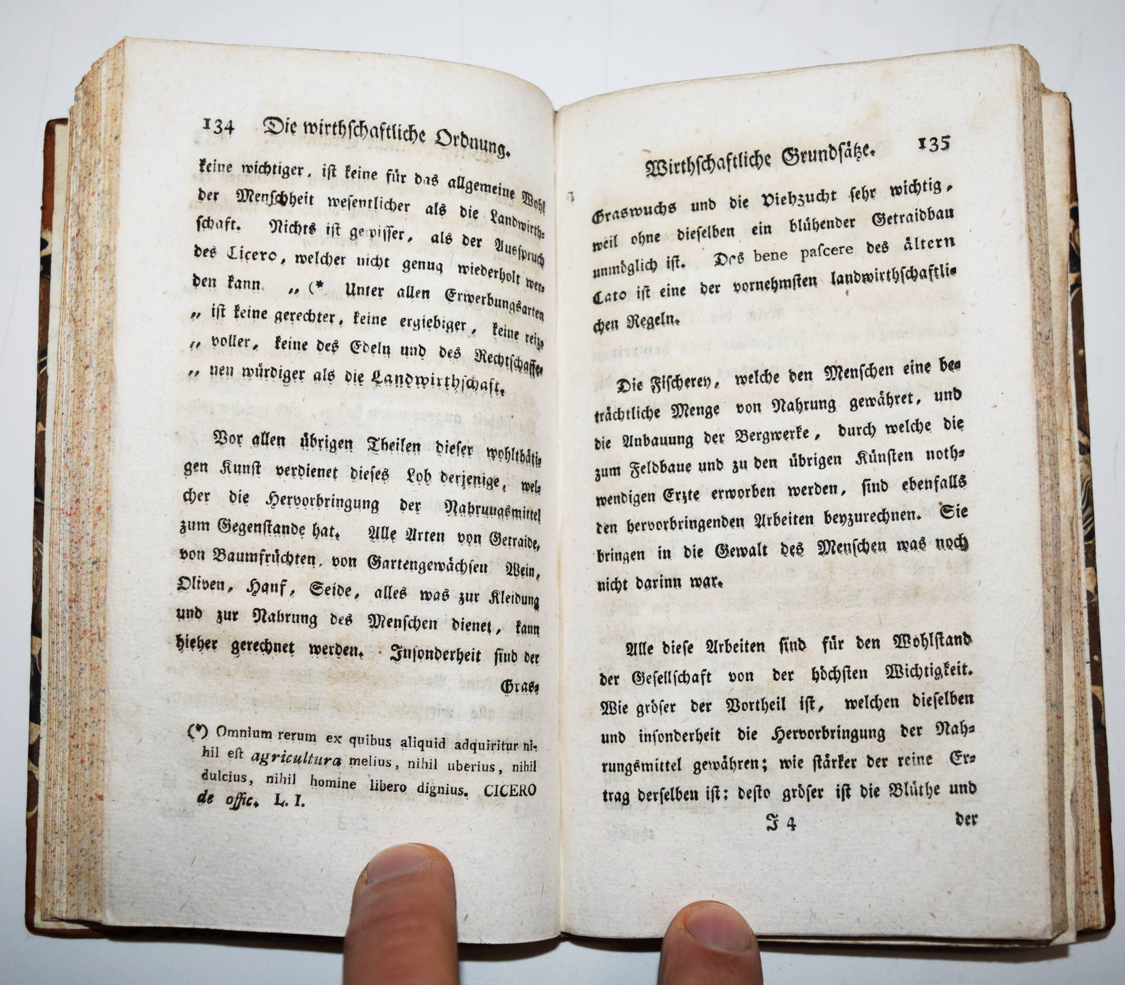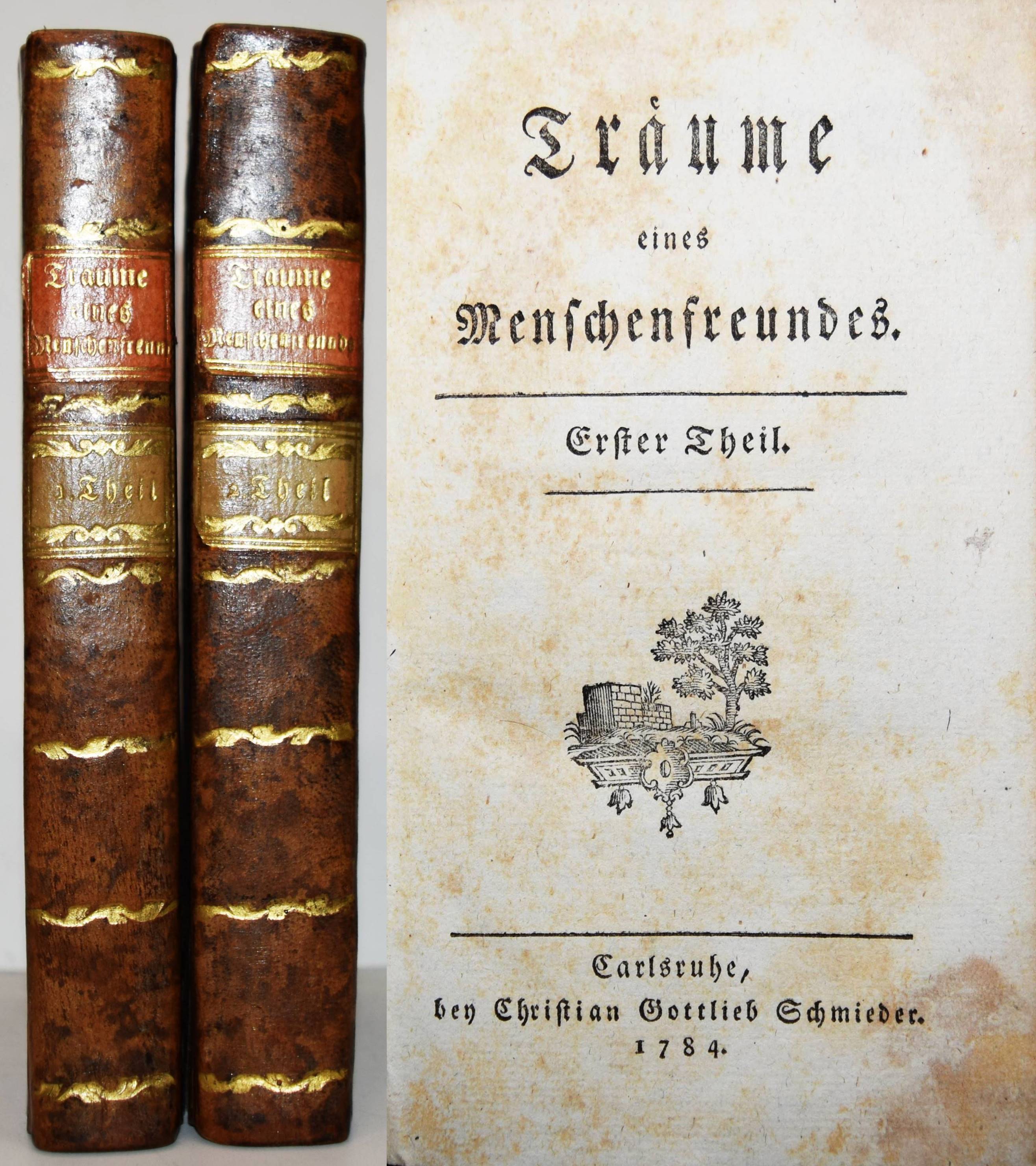 (Iselin, Isaak). Träume eines Menschenfreundes. Erster (und) zweyter Theil 2 Bände. Karlsruhe, Christian Gottlieb Schmieder 1784. 8°. XVI, 288 S.; [2] Bl., 369 S. mit 1 gefalt. Tabelle in Band I. Halblederbände der Zeit mit jeweils 2 goldgepr. Rückenschildern und Rückenvergoldung. (Sammlung der besten deutschen prosaischen Schriftsteller und Dichter, 140. und 141. Theil). Goed. IV, 1, 478, 14. Goldsmith 11382. Humpert 12691. NDB X, 188 f. Palgrave II, 459. VD18 80203159 und 80203167. – Zweite Ausgabe der zuerst 1776 unter diesem Titel erschienenen neuen Ausgabe des 1772 veröffentlichten Werks „Versuch über die gesellige Ordnung“, einer „sozialphilosophisch-ökonomischen Untersuchung über die alles entscheidende Frage des Menschen: die nach seiner Glückseligkeit.“ – Der Schweizer Geschichtsphilosoph und sozialpolitischer Publizist Isaak Iselin (1728-1782) „gehört zu den ersten Theoretikern der Ethnologie – wird die Geschichte als fortschreitende Entwicklung des Menschen zur Humanität dargestellt. Mit Voltaire (1765) und Ferguson (1766) begründet I. damit die geschichtsphilosophische Sicht der späteren Aufklärung. Er galt von nun an als einer der führenden Publizisten im deutschen Sprachbereich. … Zu Beginn der 70er Jahre hatte er im Agroliberalismus der franz. Physiokraten die Bestätigung eigener ökonomischer Überzeugungen gewonnen. Er hoffte, mit dem „Versuch über die gesellige Ordnung“ (1772) diese Lehre im deutschen Sprachraum bekannt machen zu können. Darum zog er auch J. A. Schlettwein 1776/77 nach Basel. Mit Dupont und Le Trosne stand er in persönlicher Verbindung. Um die physiokratischen Ideen und weitere pädagogische, religiöse und sozialpolitische Reformen in ein breiteres Publikum zu tragen, gab er in Anlehnung an das Modell der physiokratischen „Ephémérides du citoyen“ die „Ephemeriden der Menschheit“ (1776-78, 1780-82, weitergef. v. W. G. Becker bis 1786) heraus, welche bald zu den führenden deuschsprachigen Zeitschriften gehörten. Eine Zusammenfassung und Neubearbeitung seiner wichtigsten Publikationen bilden die „Träume eines Menschenfreundes“ (1776, ²1784). Auch wenn I. noch das Scheitern der physiokratischen und der philanthropinischen Bewegungen miterleben mußte, blieben doch seine freiheitlichen Konzeptionen nicht ohne Wirkung auf die vorrevolutionäre Epoche“ (U. Im Hof in NDB). – Stellenweise etwas braunfleckig, schönes dekorativ gebundenes Exemplar.