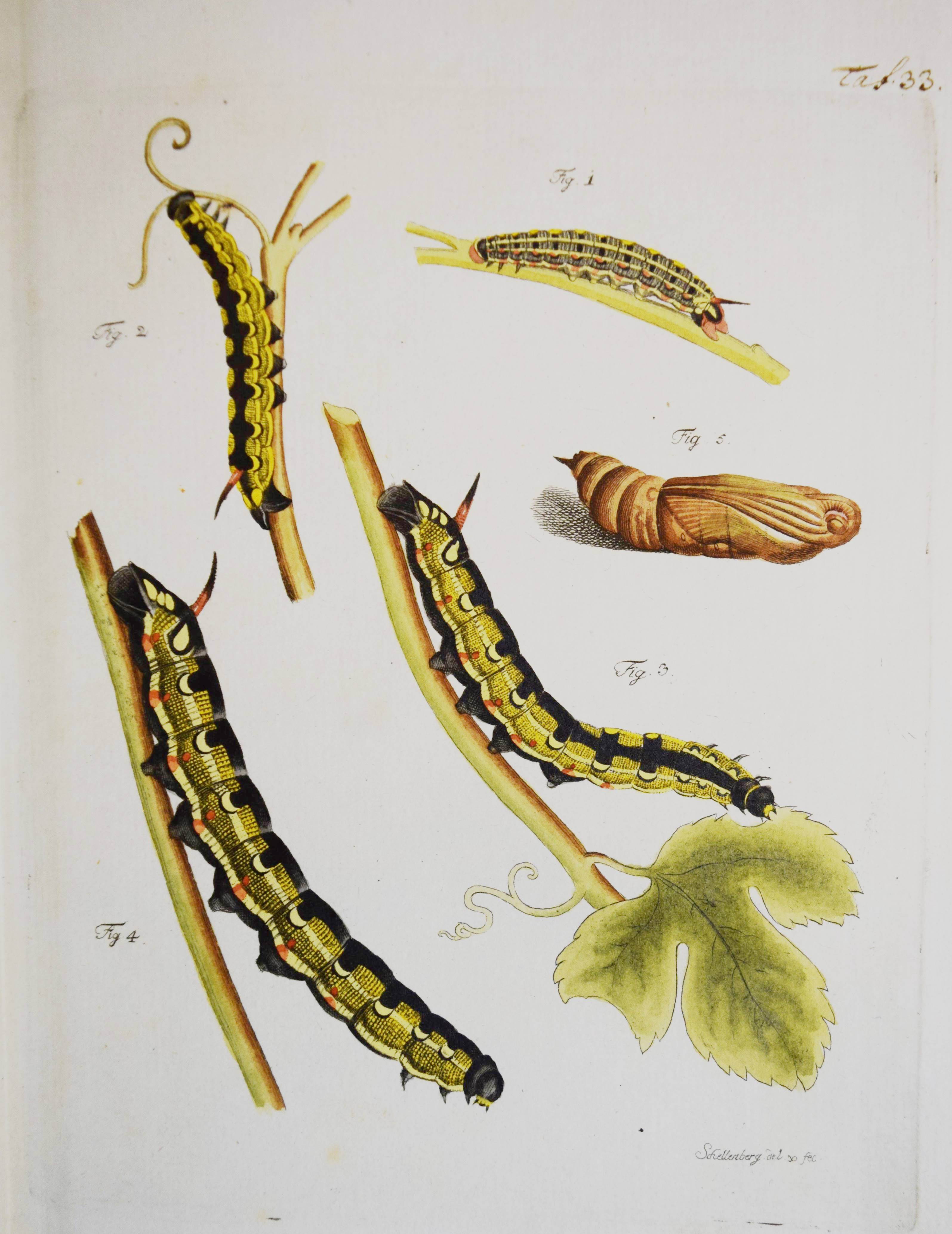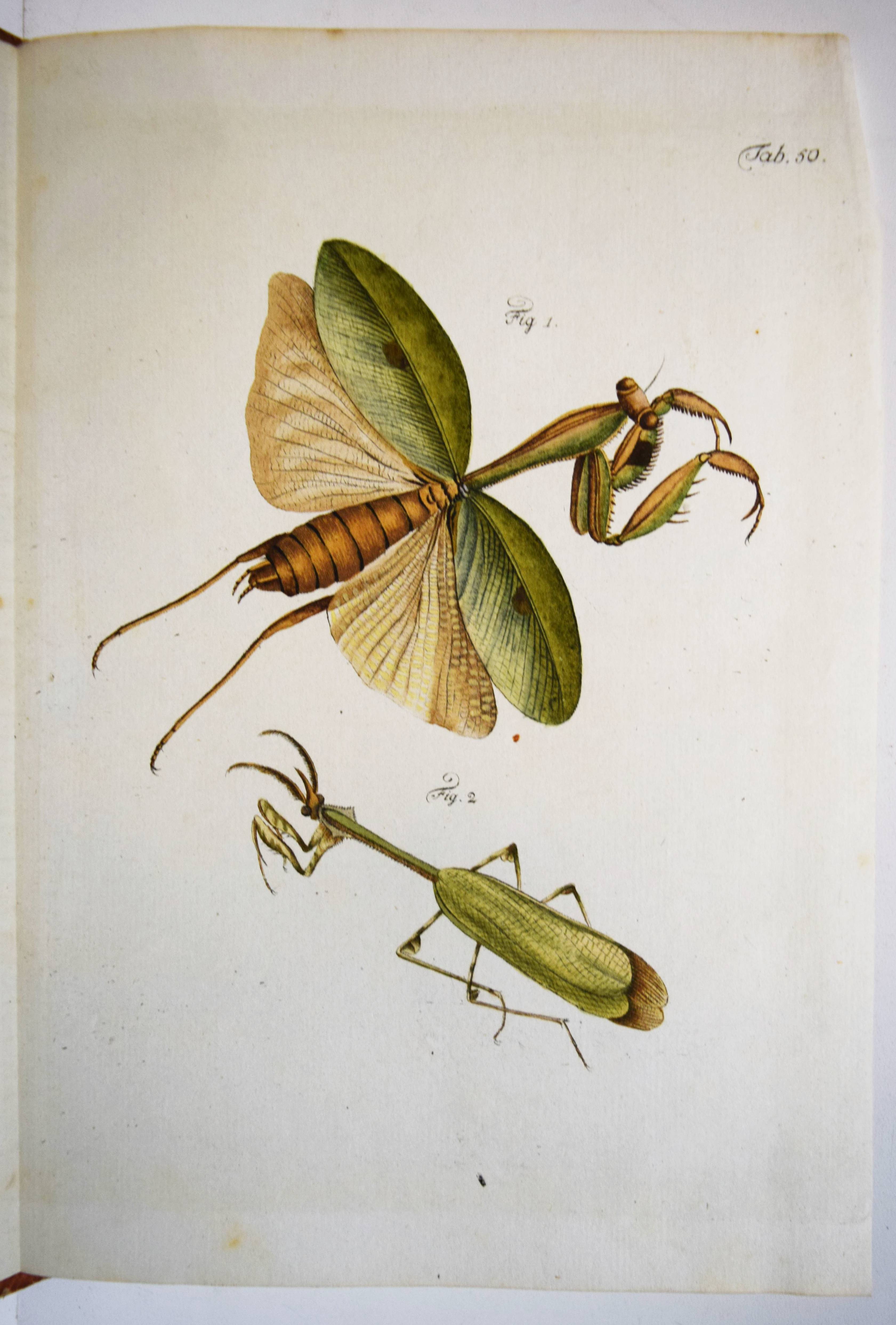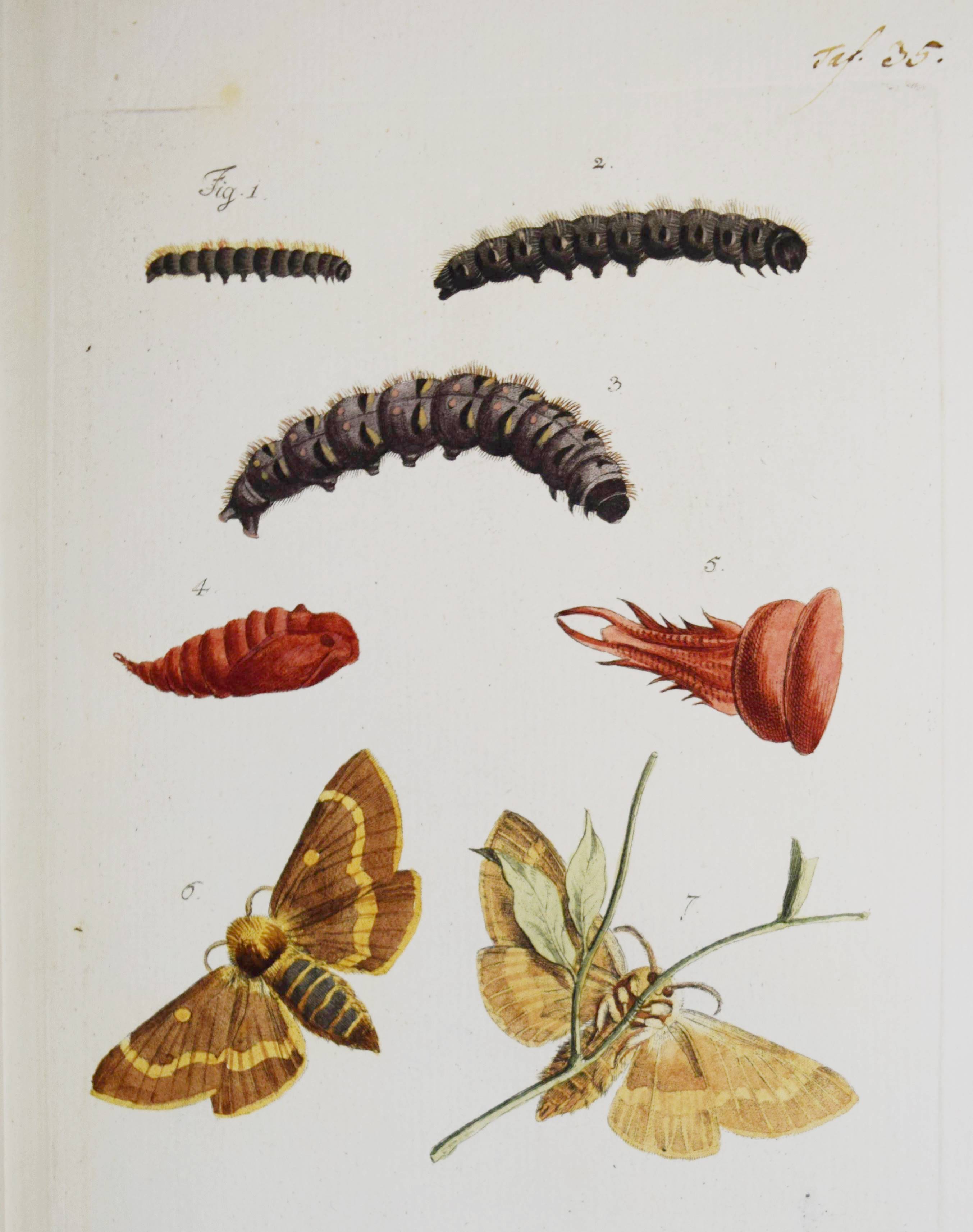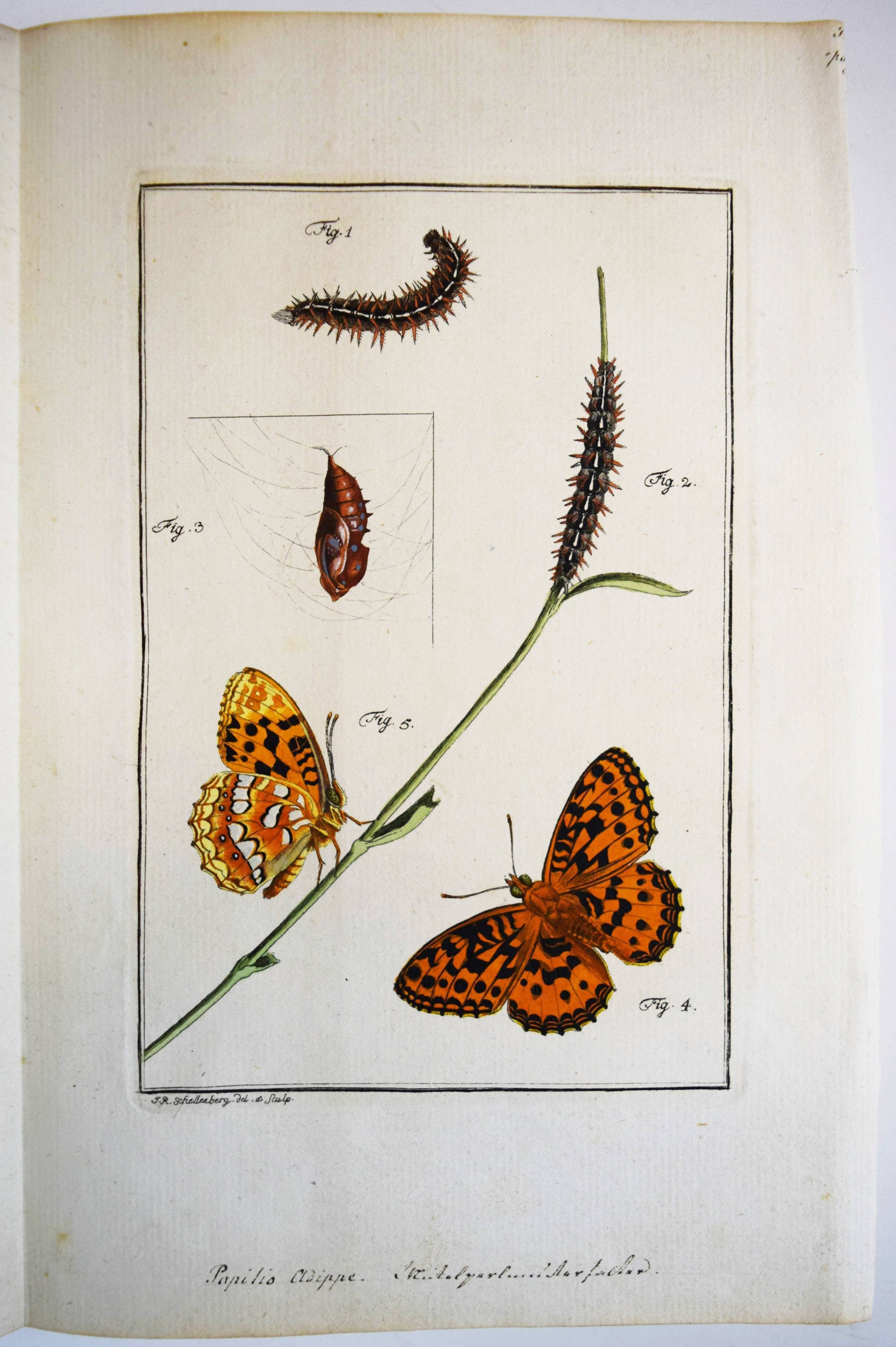 Füßly, (Fuessli), Johann Caspar. (Archiv der Insectengeschichte). Heft 1-8 (mehr nicht erschienen) in 1 Band. (Zürich, Winterthur, 1781-1786). Gr.-8° (24 x 19,5 cm.). 6, 6, 4, 3, 2, 8, 2, 8, 3, 2, 3, 4, 14, 2, 4, 4, 2, 4, 2, 2, 196, 31 S. und 50 (statt 51, 45 handkolorierte) Kupfertafeln von Johann Rudolf Schellenberg. Pappband der Zeit mit 2 goldgepr. Rückenschildern. Hagen I, 257, 10 (nur 50 Tafeln). Horn-Schenkling 7210 (Koll. etwas abweichend; irrtüml. 52 Taf., obwohl einzeln 51 angegeben). Nissen, ZBI 1455. – Erste Ausgabe des schönen, seltenen Werkes. – Neben dem Herausgeber J. C. Fuessly (1743-1786, Entomologe und Buchhändler in Zürich) wurden namhafte Entomologen der Zeit für die Mitarbeit gewonnen, darunter J. F. W. Herbst, Hübner, Dahl, Franz von Paula Schrank und O. F. Müller. Herbsts Beschreibung seiner großen Insektensammlung bildet einen Schwerpunkt der Veröffentlichung, die nach dem Tode des Herausgebers nicht fortgesetzt wurde. – J. R. Schellenberg (1740-1806) „fertigte schon 1753 zahlreiche Insektenabbildungen für den Naturforscher Johannes Gessner an. Abgesehen von einem Aufenthalt in Basel 1763-64, lebte er bis 1801 in Winterthur, von wo aus er Reisen durch die Schweiz unternahm. Der gesuchte Illustrator, dessen Darstellungen sich durch Natürlichkeit auszeichnen, arbeitete u.a. für Johann Heinrich Sulzer, Johann Bernhard Basedow, Johann Kaspar Lavater und Johann Kaspar Füssli. Ab 1795 betätigte er sich wieder vermehrt als Aquarellist und Insektenmaler. Die Winterthurer Stadtbibliothek besitzt ca. 4’000 seiner Insektenaquarelle“ (Karin Marti-Weissenbach in HLS-Online). – Die Tafeln Nr. 37 bis 42 sind nicht erschienen; im vorliegenden Exemplar fehlt die Tafel Nr. 5 (Silbermönch, Phalaena argentea). – Rücken restauriert, Textteil teils etwas braunfleckig, gutes Exemplar.