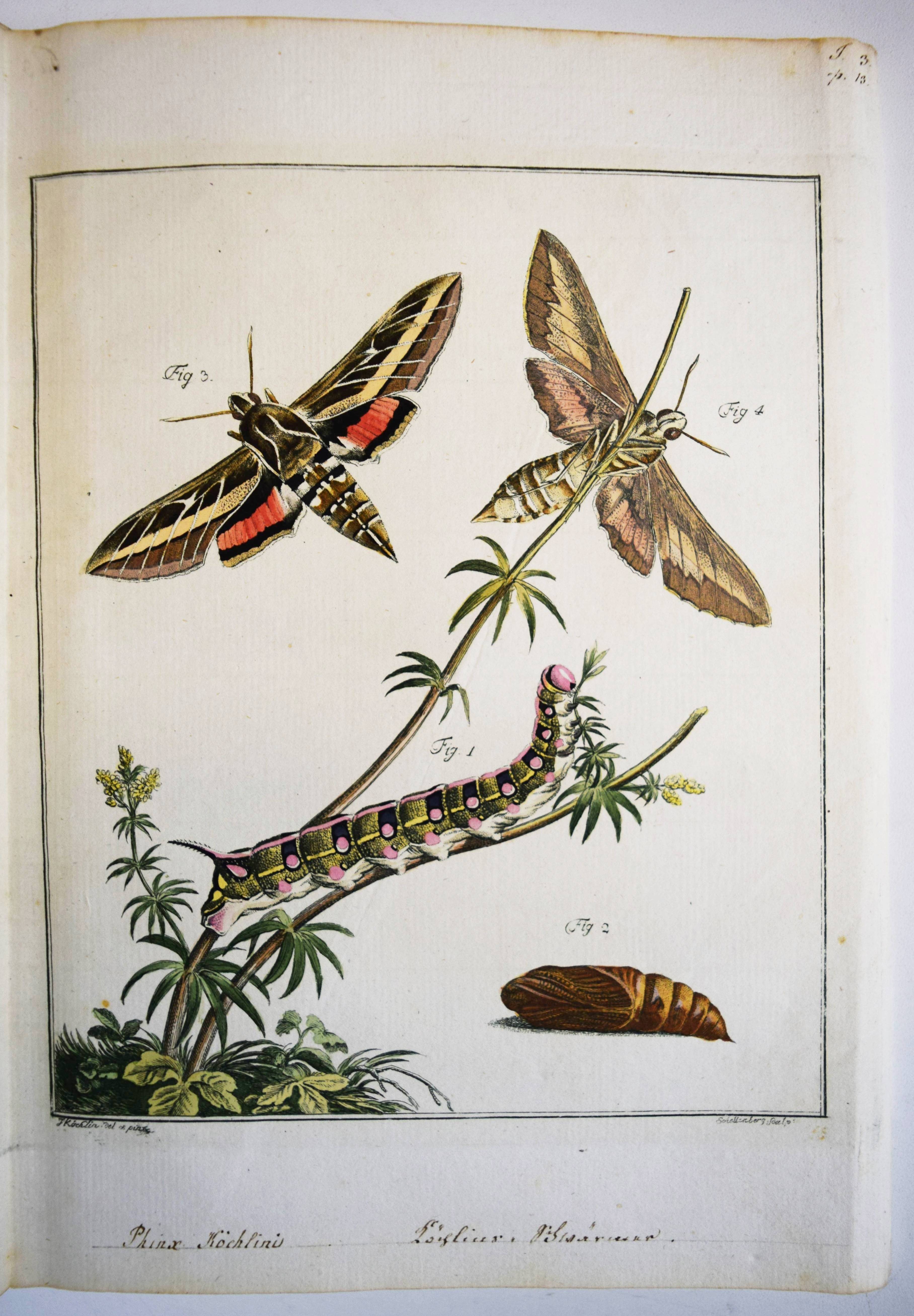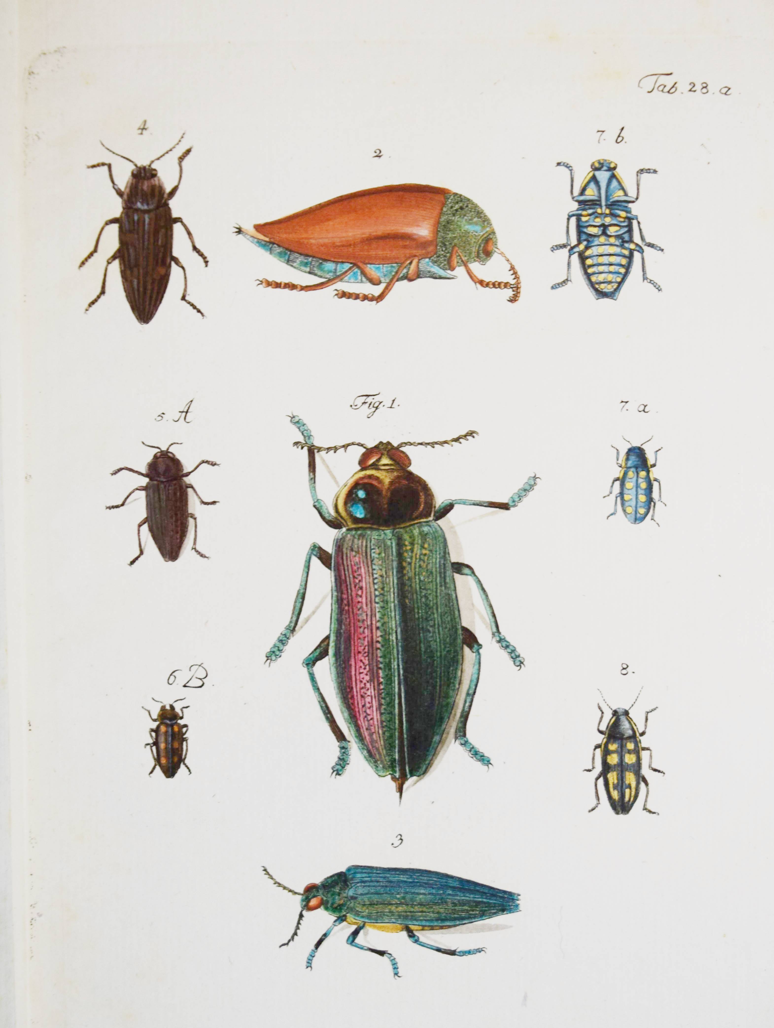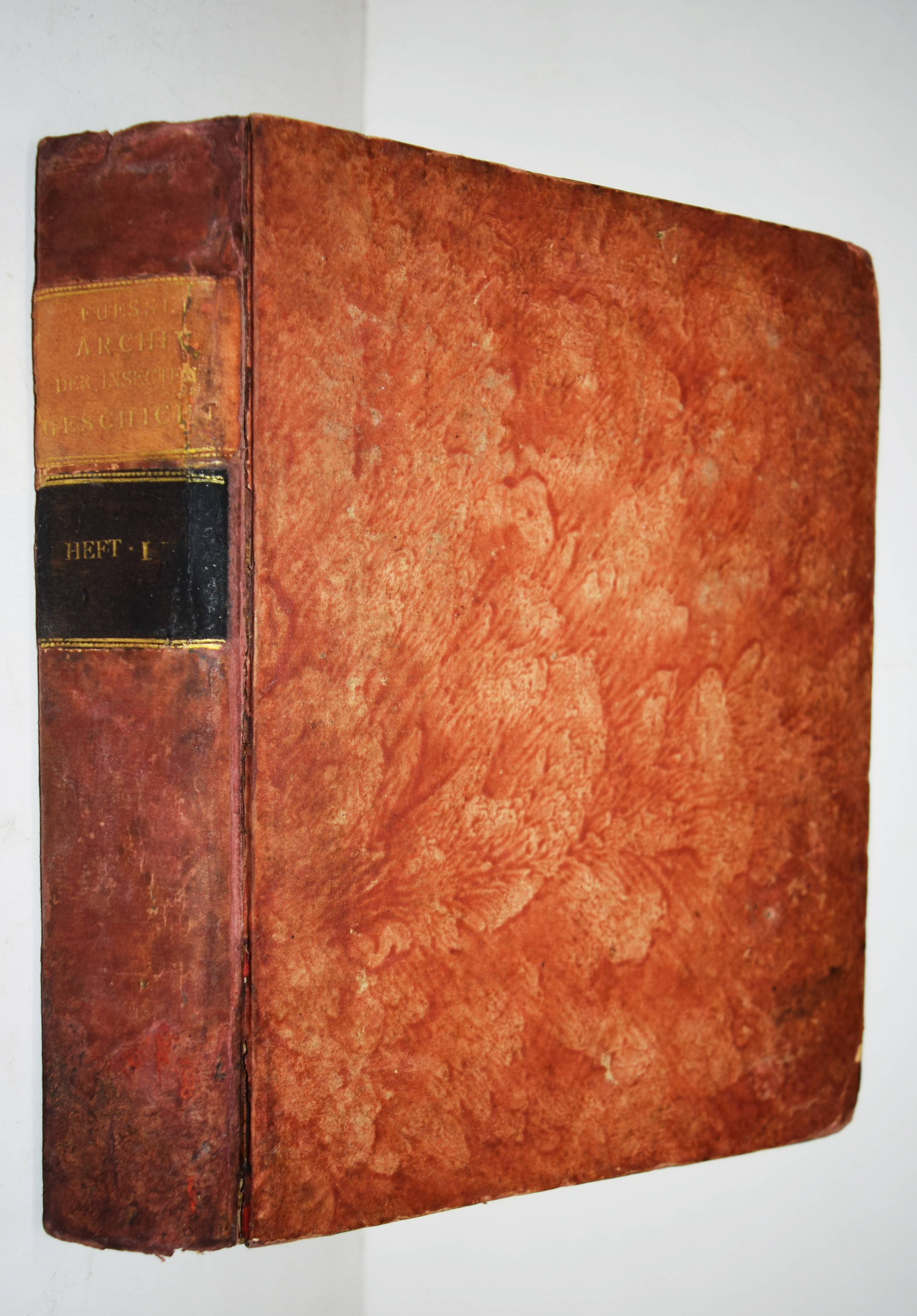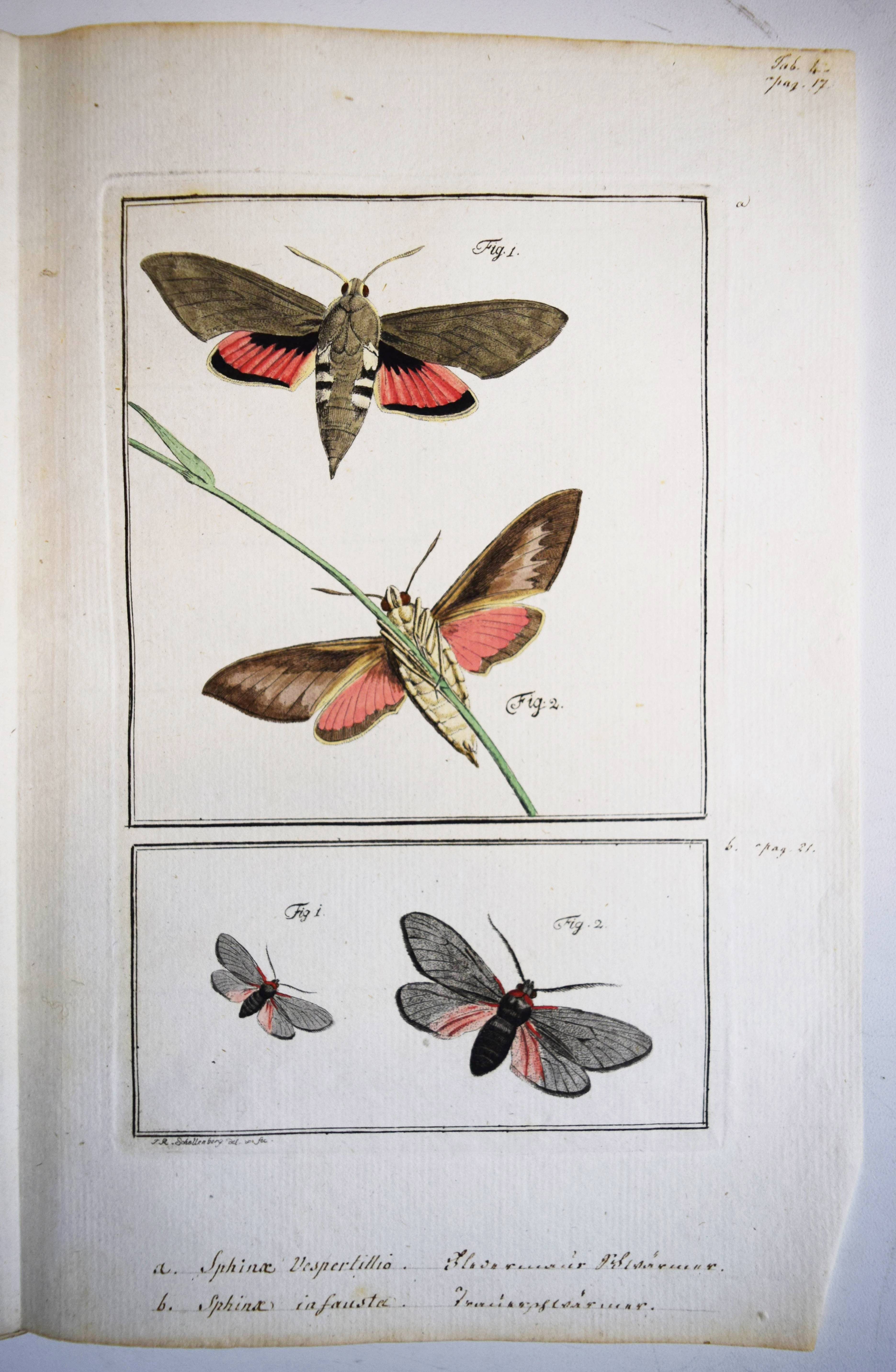Füßly, (Fuessli), Johann Caspar. (Archiv der Insectengeschichte). Heft 1-8 (mehr nicht erschienen) in 1 Band. (Zürich, Winterthur, 1781-1786). Gr.-8° (24 x 19,5 cm.). 6, 6, 4, 3, 2, 8, 2, 8, 3, 2, 3, 4, 14, 2, 4, 4, 2, 4, 2, 2, 196, 31 S. und 50 (statt 51, 45 handkolorierte) Kupfertafeln von Johann Rudolf Schellenberg. Pappband der Zeit mit 2 goldgepr. Rückenschildern. Hagen I, 257, 10 (nur 50 Tafeln). Horn-Schenkling 7210 (Koll. etwas abweichend; irrtüml. 52 Taf., obwohl einzeln 51 angegeben). Nissen, ZBI 1455. – Erste Ausgabe des schönen, seltenen Werkes. – Neben dem Herausgeber J. C. Fuessly (1743-1786, Entomologe und Buchhändler in Zürich) wurden namhafte Entomologen der Zeit für die Mitarbeit gewonnen, darunter J. F. W. Herbst, Hübner, Dahl, Franz von Paula Schrank und O. F. Müller. Herbsts Beschreibung seiner großen Insektensammlung bildet einen Schwerpunkt der Veröffentlichung, die nach dem Tode des Herausgebers nicht fortgesetzt wurde. – J. R. Schellenberg (1740-1806) „fertigte schon 1753 zahlreiche Insektenabbildungen für den Naturforscher Johannes Gessner an. Abgesehen von einem Aufenthalt in Basel 1763-64, lebte er bis 1801 in Winterthur, von wo aus er Reisen durch die Schweiz unternahm. Der gesuchte Illustrator, dessen Darstellungen sich durch Natürlichkeit auszeichnen, arbeitete u.a. für Johann Heinrich Sulzer, Johann Bernhard Basedow, Johann Kaspar Lavater und Johann Kaspar Füssli. Ab 1795 betätigte er sich wieder vermehrt als Aquarellist und Insektenmaler. Die Winterthurer Stadtbibliothek besitzt ca. 4’000 seiner Insektenaquarelle“ (Karin Marti-Weissenbach in HLS-Online). – Die Tafeln Nr. 37 bis 42 sind nicht erschienen; im vorliegenden Exemplar fehlt die Tafel Nr. 5 (Silbermönch, Phalaena argentea). – Rücken restauriert, Textteil teils etwas braunfleckig, gutes Exemplar.
